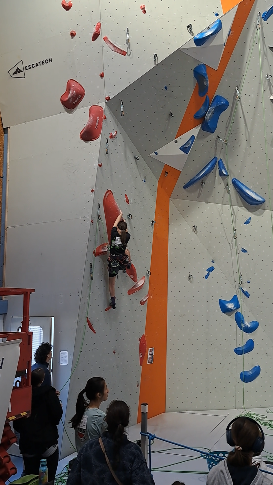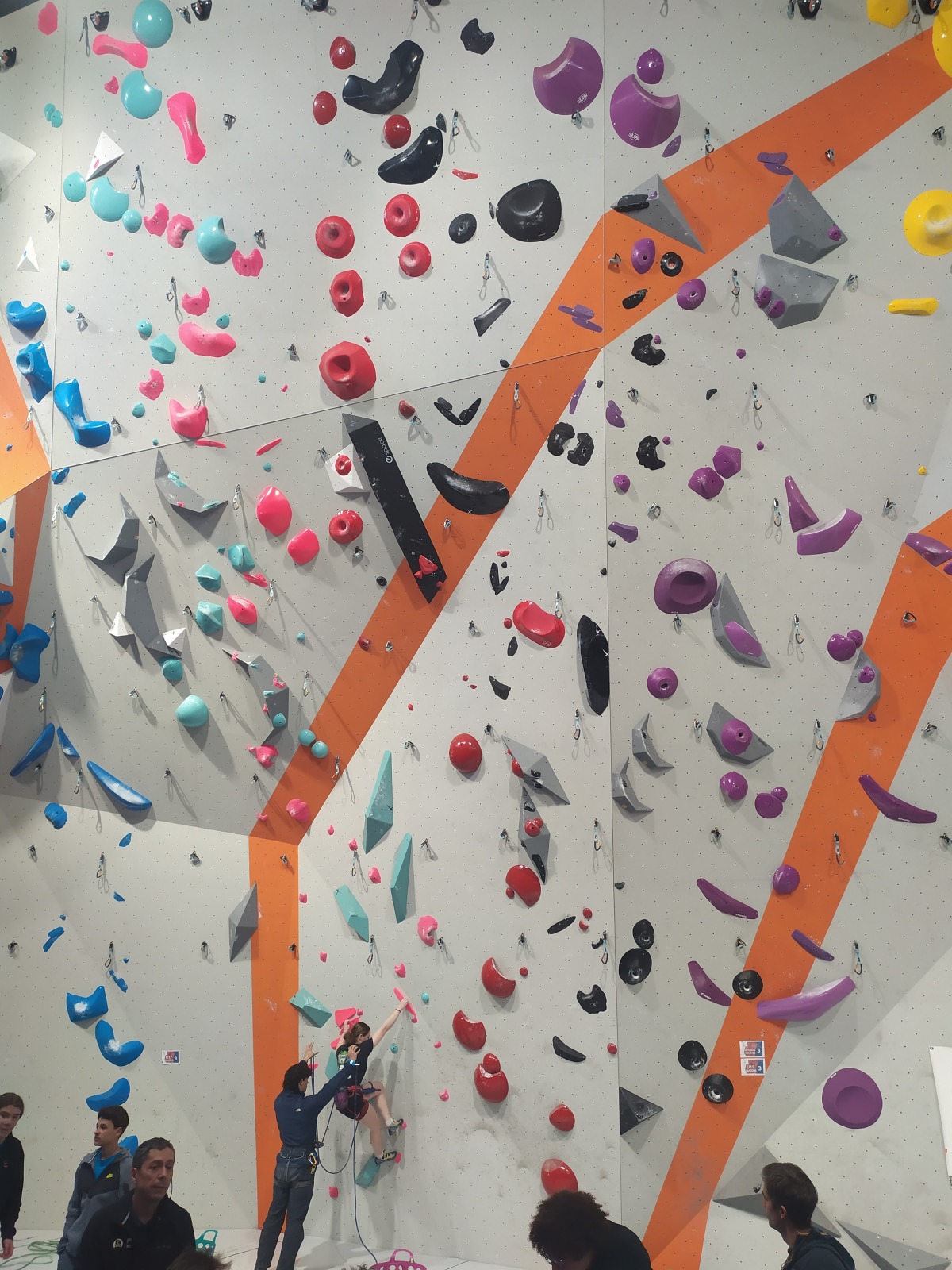 Chez les U17, Lia, à peu près remise de ses douleurs au dos qui ont bien entamé sa préparation, déroule une très belle grimpe. Les deux premières voies ne lui posent aucun problème, et elle tombe à peu près au même endroit que pas mal d’autres concurrentes dans les suivantes. Les mouvements dynamiques ne sont toujours pas son fort, mais elle aura tenté. Et la validation d’une prise stratégique dans la dernière voie lui permet d’accrocher une seconde place bien méritée de ces qualifs.