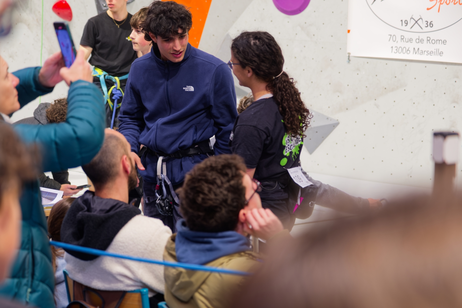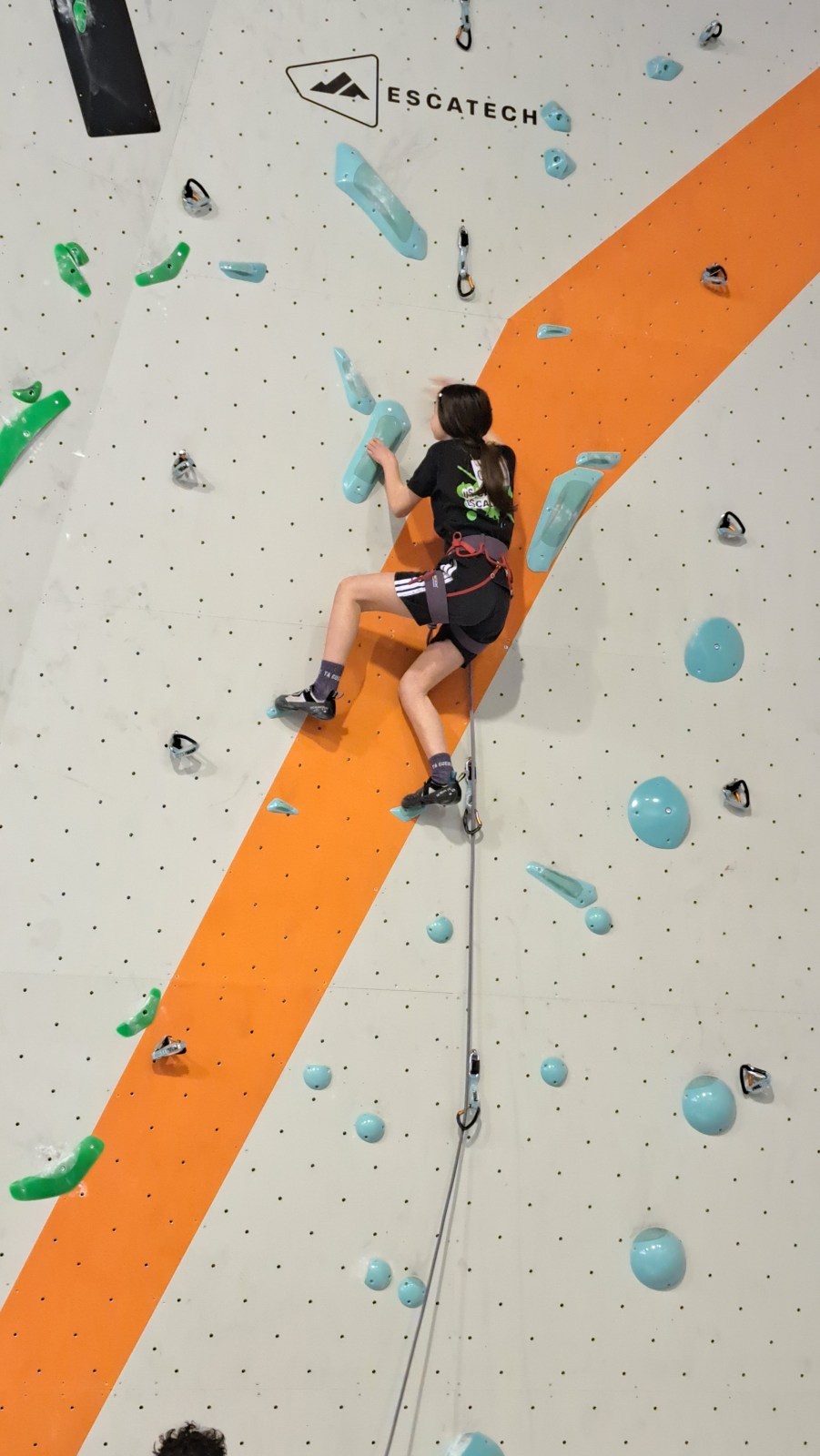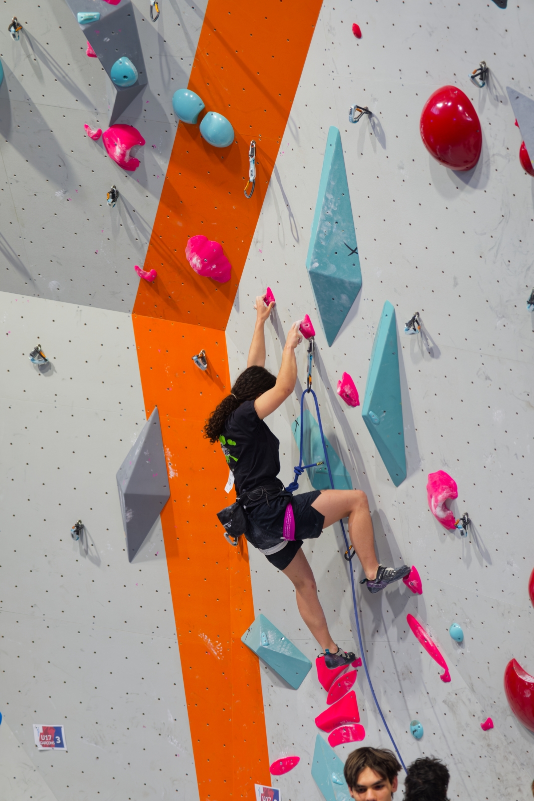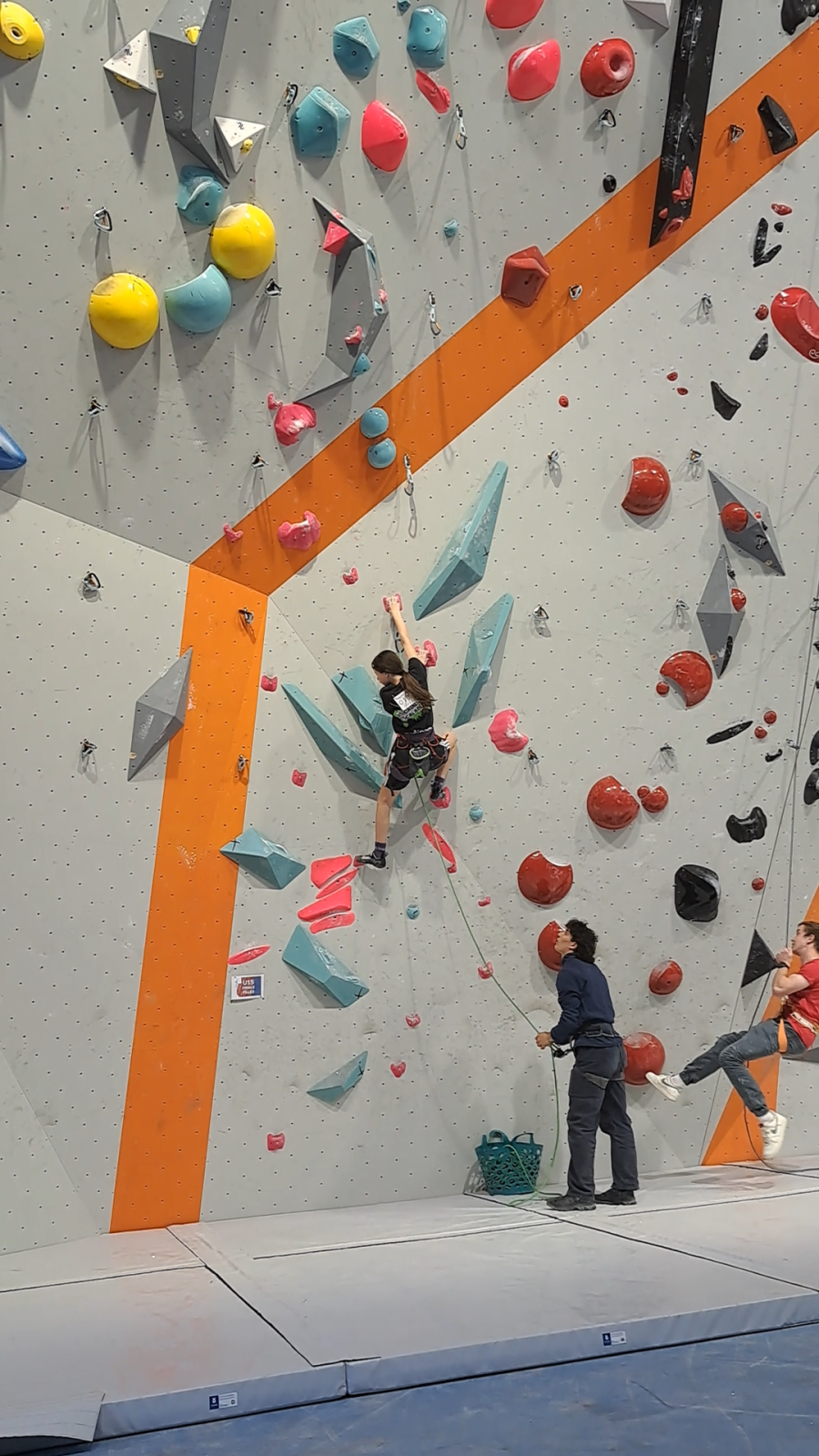 Place aux U15 donc l’après-midi, sur un format contest de 8 voies, comme les plus jeunes la veille. Les deux copines Mélia et Rose s’encouragent et s’échangent les méthodes, tandis que Nathan bénéficie de son assureur et coach personnel Milan.