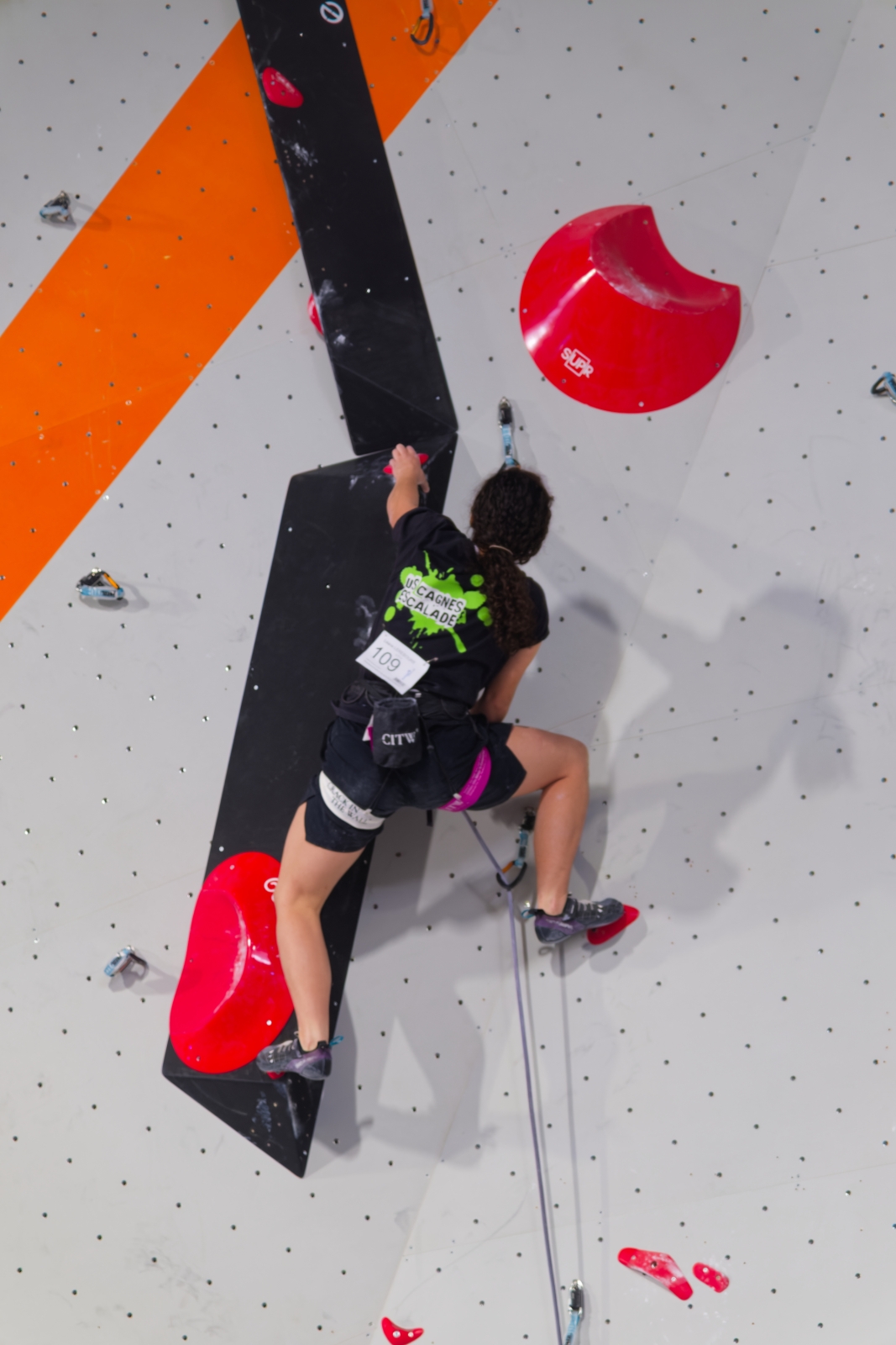 Pour Léane, l’objectif est un peu différent, elle veut avant tout gagner, et sortir toutes les voies. Contrat rempli sur les 4 premières, et elle parvient à négocier le mouvement sur lequel ont buté toutes les autres dans la dernières voie. Elle se fait malheureusement arrêter pour non respect du règlement (dégaine obligatoire à cliper avant un mouvement engagé) alors qu’elle réussit le jeté qui a renvoyé dans la corde plusieurs séniors la veille. Frustration, frustration, elle ne peut affronter la fin de la voie, mais ce n’est pas comme si elle découvrait le règlement, elle ne peut s’en prendre qu’à elle-même…