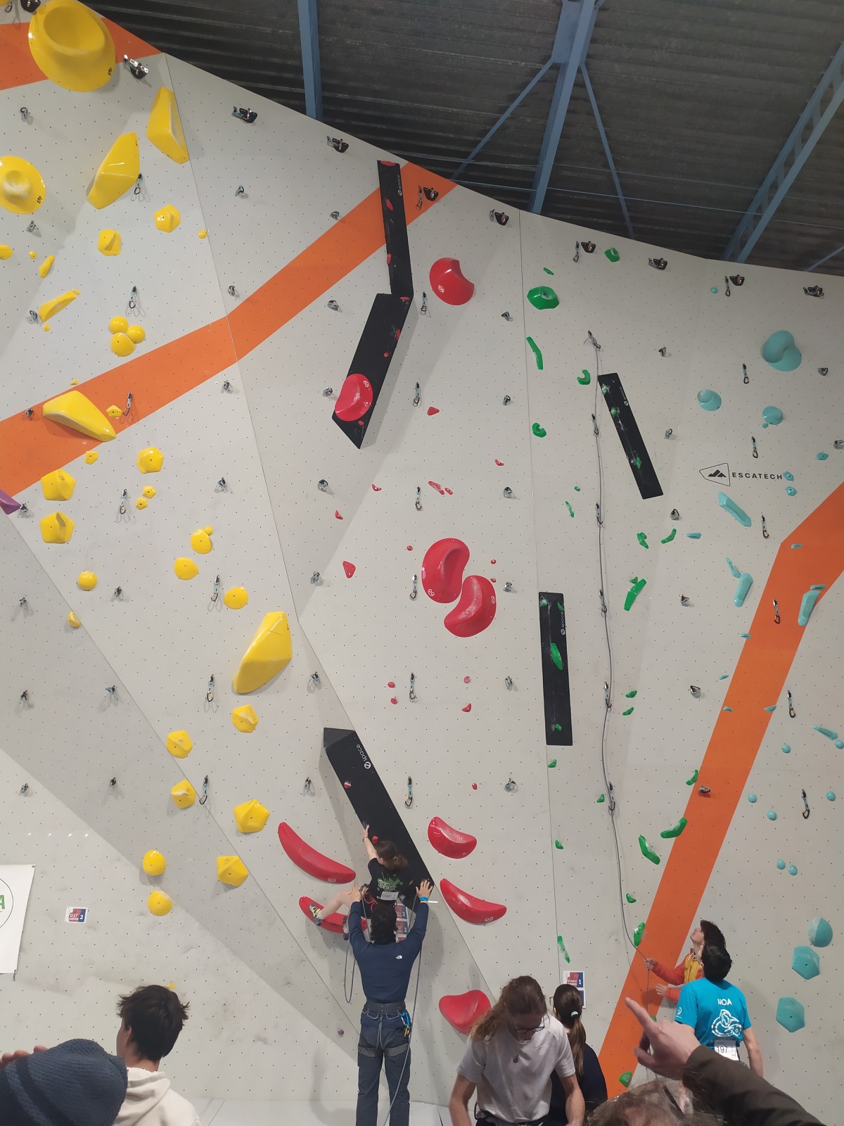 Question organisation et déroulement, c’est une manche de difficulté (voies à cordes). Les U9, U11 et U13 grimperont 4 voies en moulinette, tandis que les autres catégories grimperont 3 voies en tête.