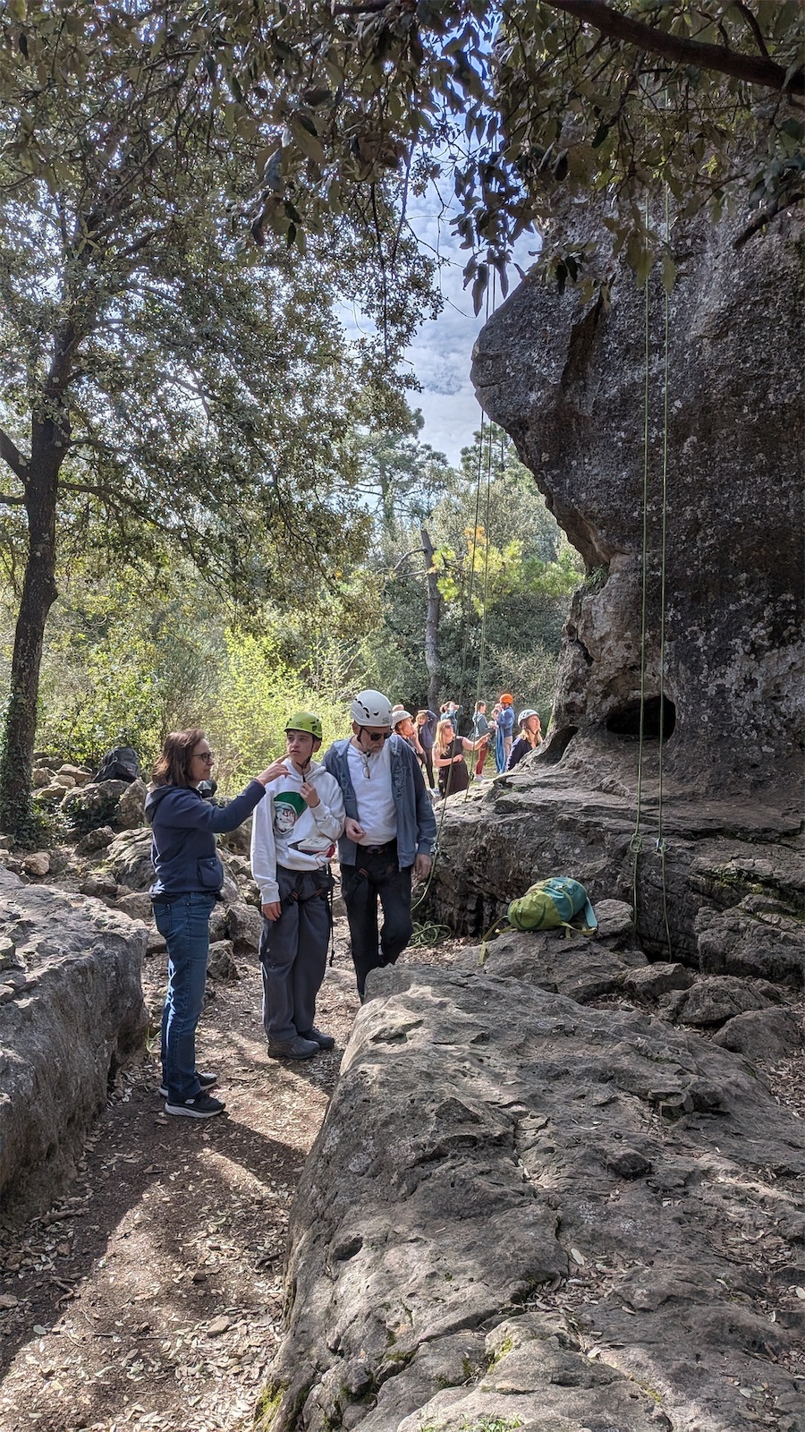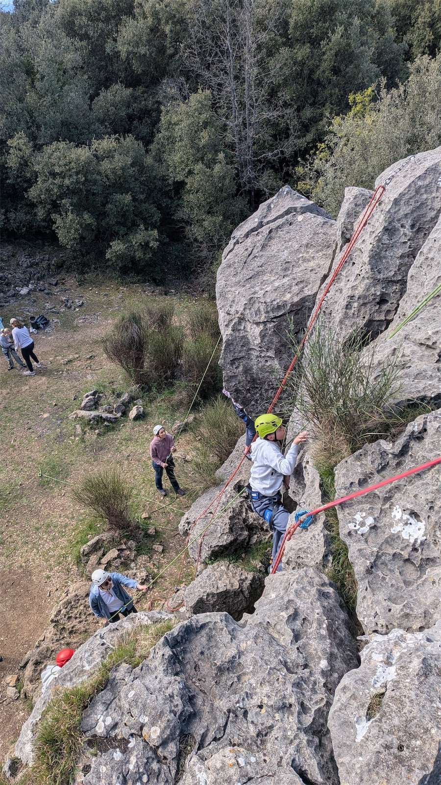 Le rocher St Barthélémy, c’est le lieu idéal pour nous accueillir avec ses voies proches, plutôt faciles, et surtout tout un système de terrasses qui nous permet à nous, encadrants (Bérenger et moi), de nous déplacer facilement entre les cordées et les relais. Cela demande juste un peu d’anticipation et de plannification et une distribution de cordées bien réglée.
