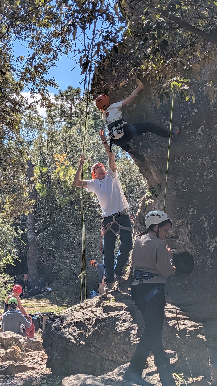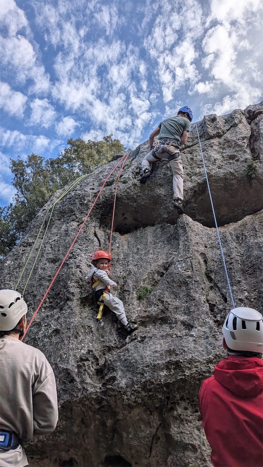 L’après-midi, les plus petits qui en ont déjà plein les bras et le ventre, désertent peu à peu le secteur et ce sont les plus vieux qui tentent tour à tour les voies les plus difficiles, avec plus ou moins de succès, mais toujours dans la bonne humeur, jusqu’à ce que les bras et les doigts fassent mal !