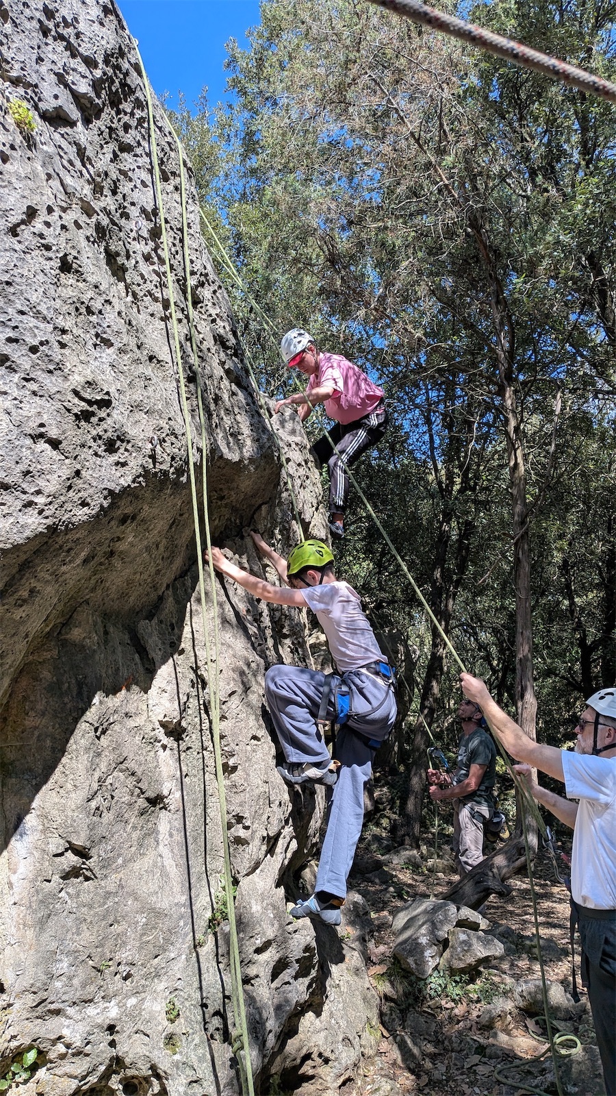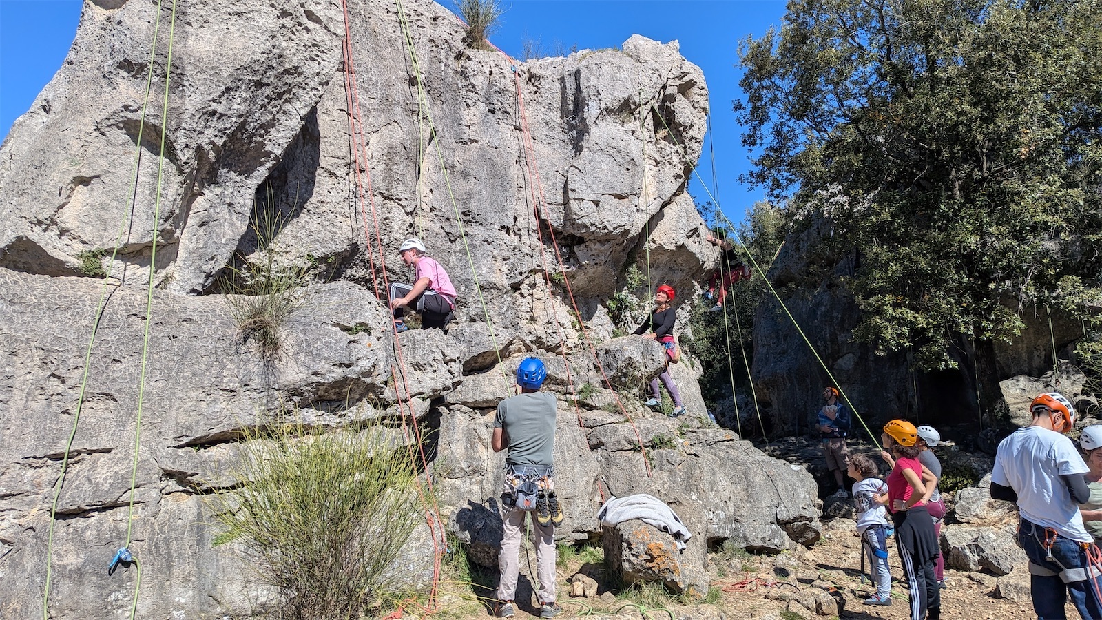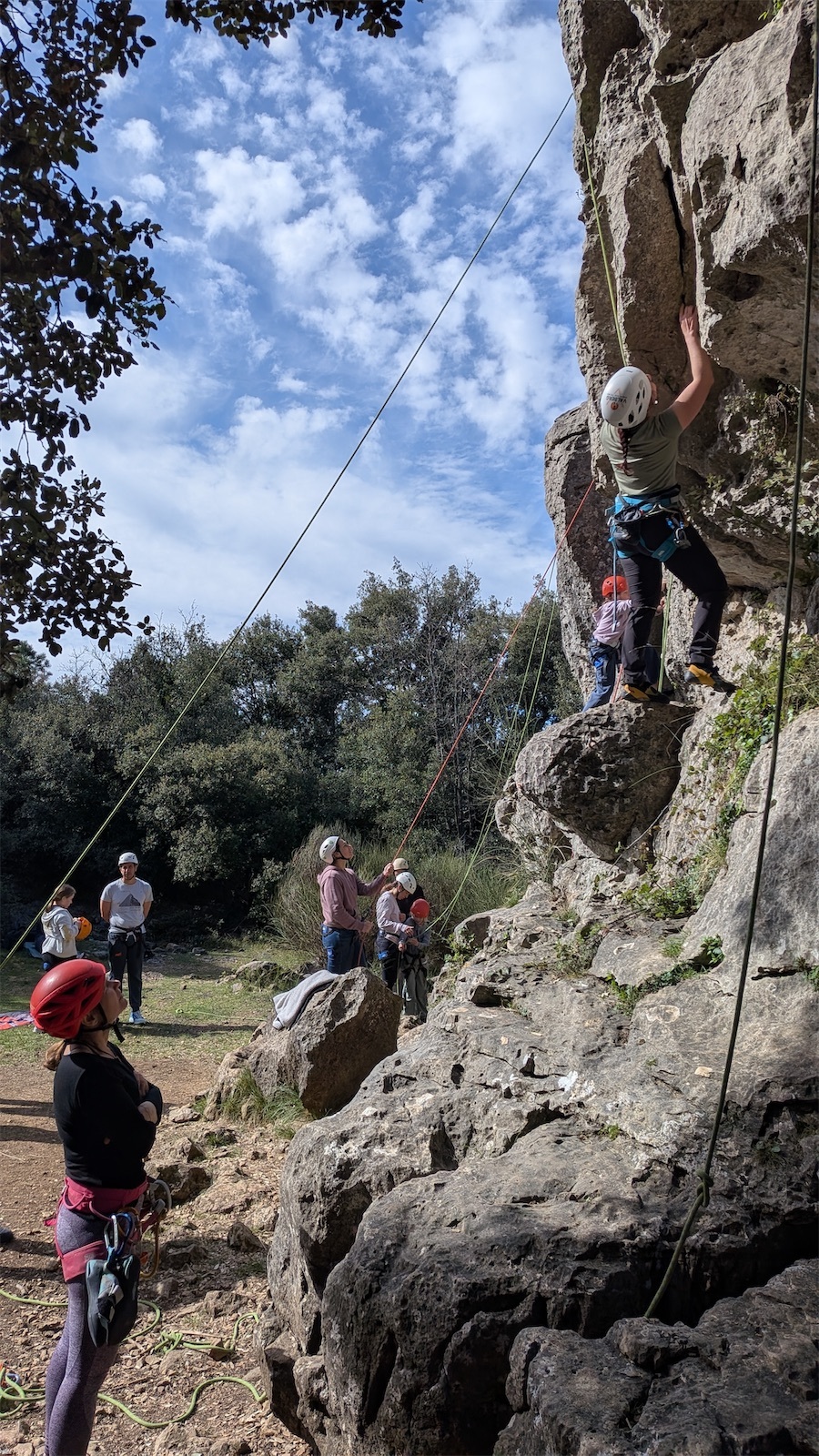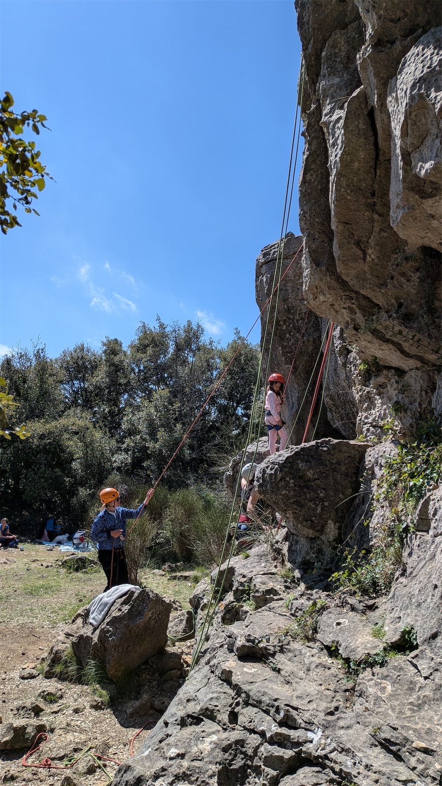 L’approche (trop) raide terminée l’on passera la matinée à faire du volume de voies pour se familiariser avec les voies du secteurs. Du 4b au 6a il y en a pour tous les goûts et dans tous les styles. Certains font le choix du plaisir en profitant des diverses moulinettes installées pendant que les autres se régalent en tête sur du caillou bien (trop) équipé. Ainsi chaque jeune aura réaliser minimum 3 voies avant un pique nique bien mérité.