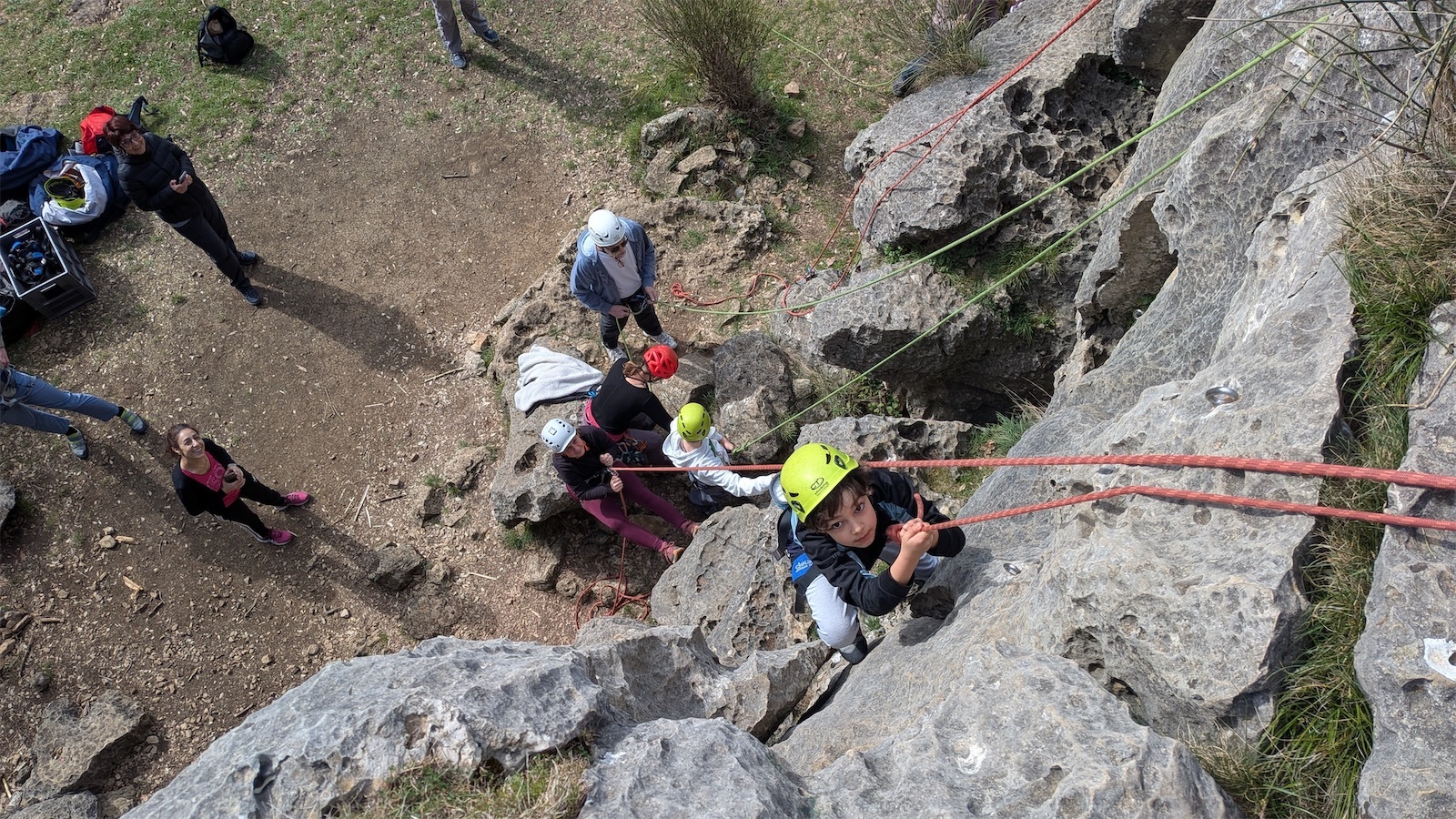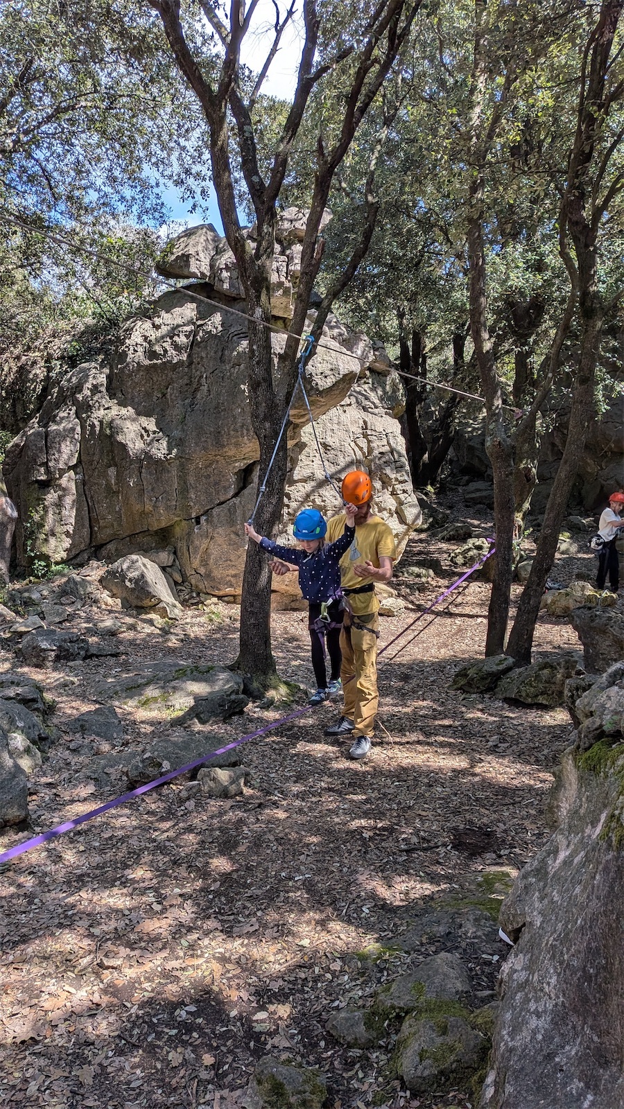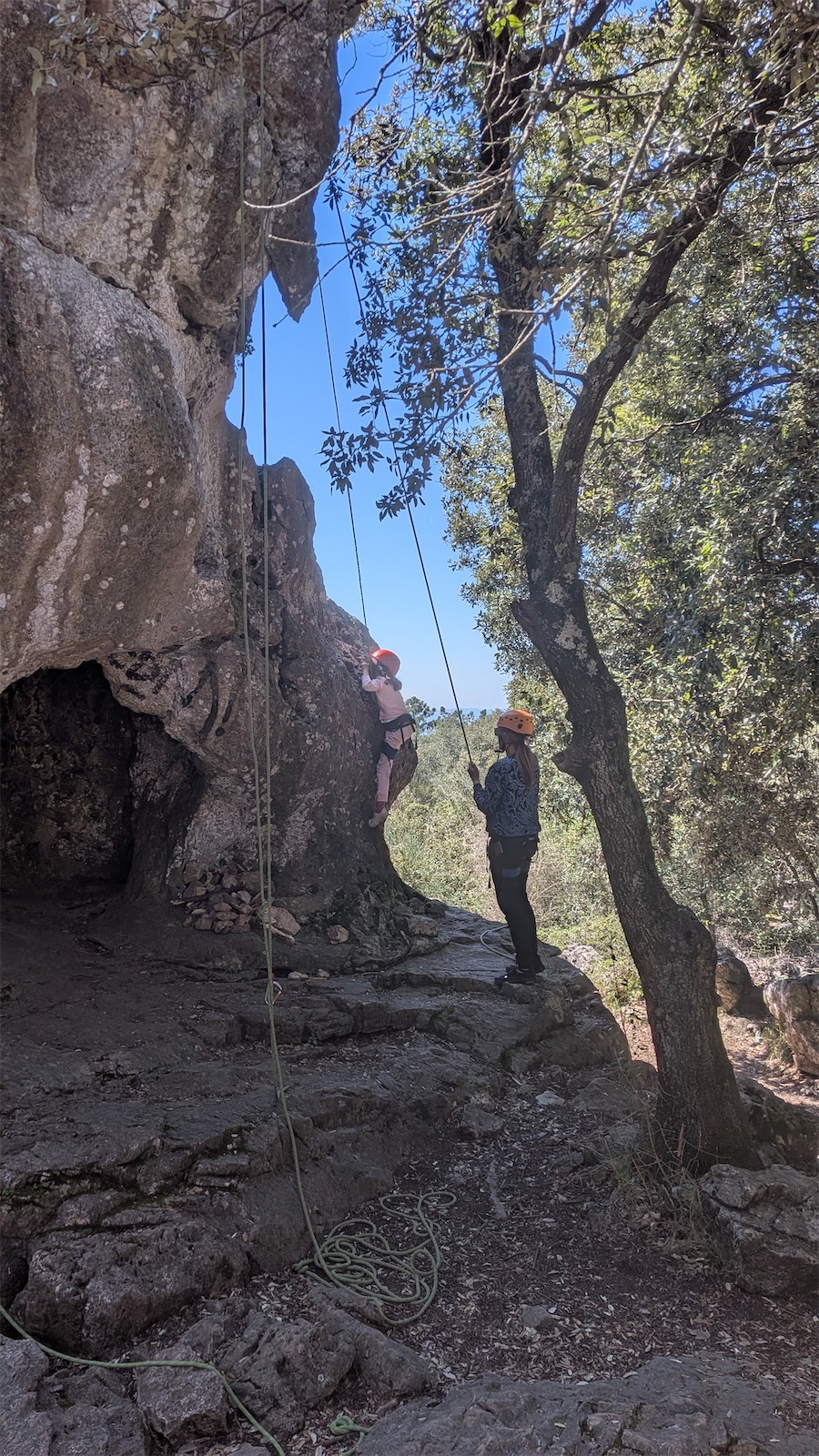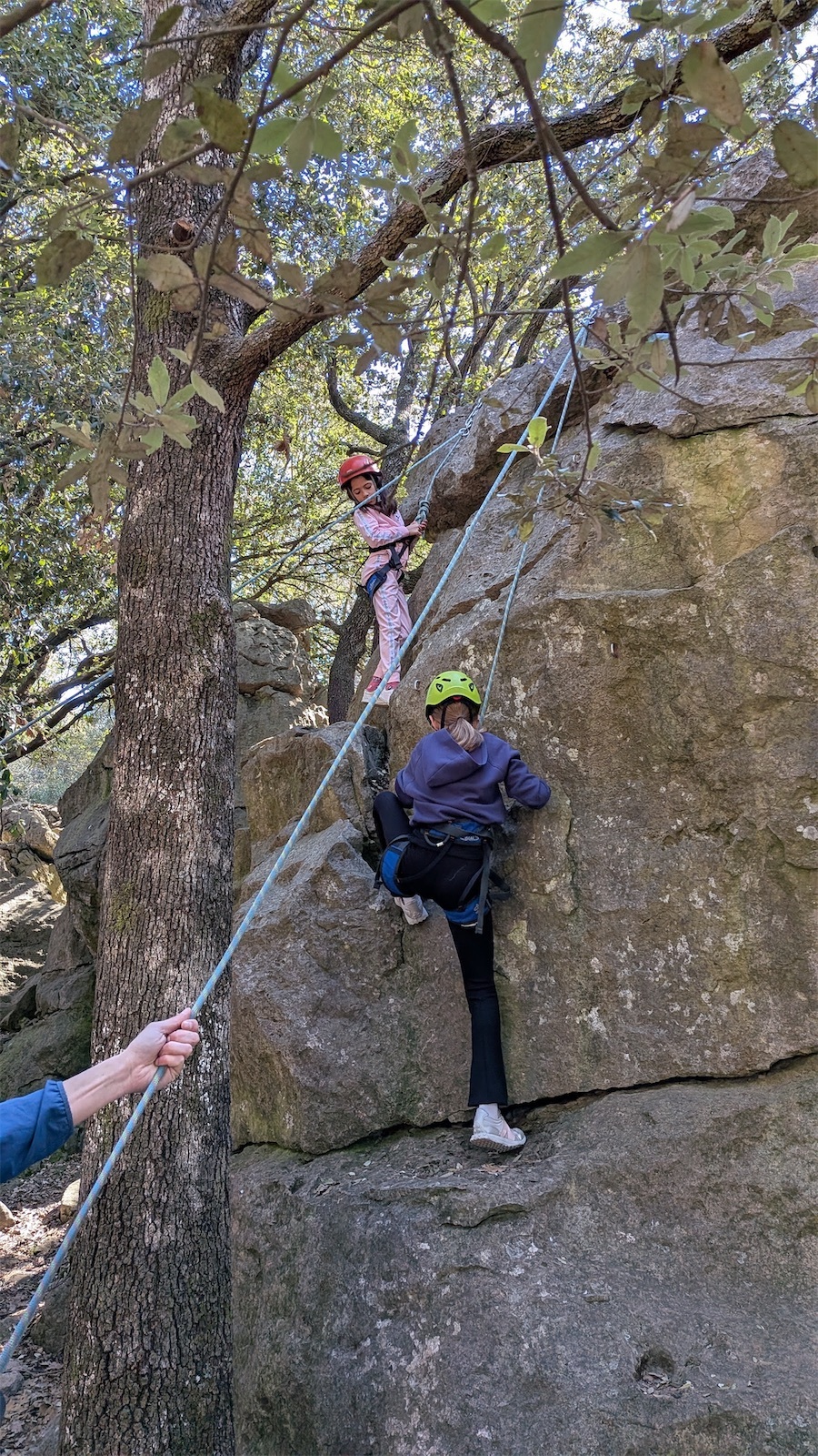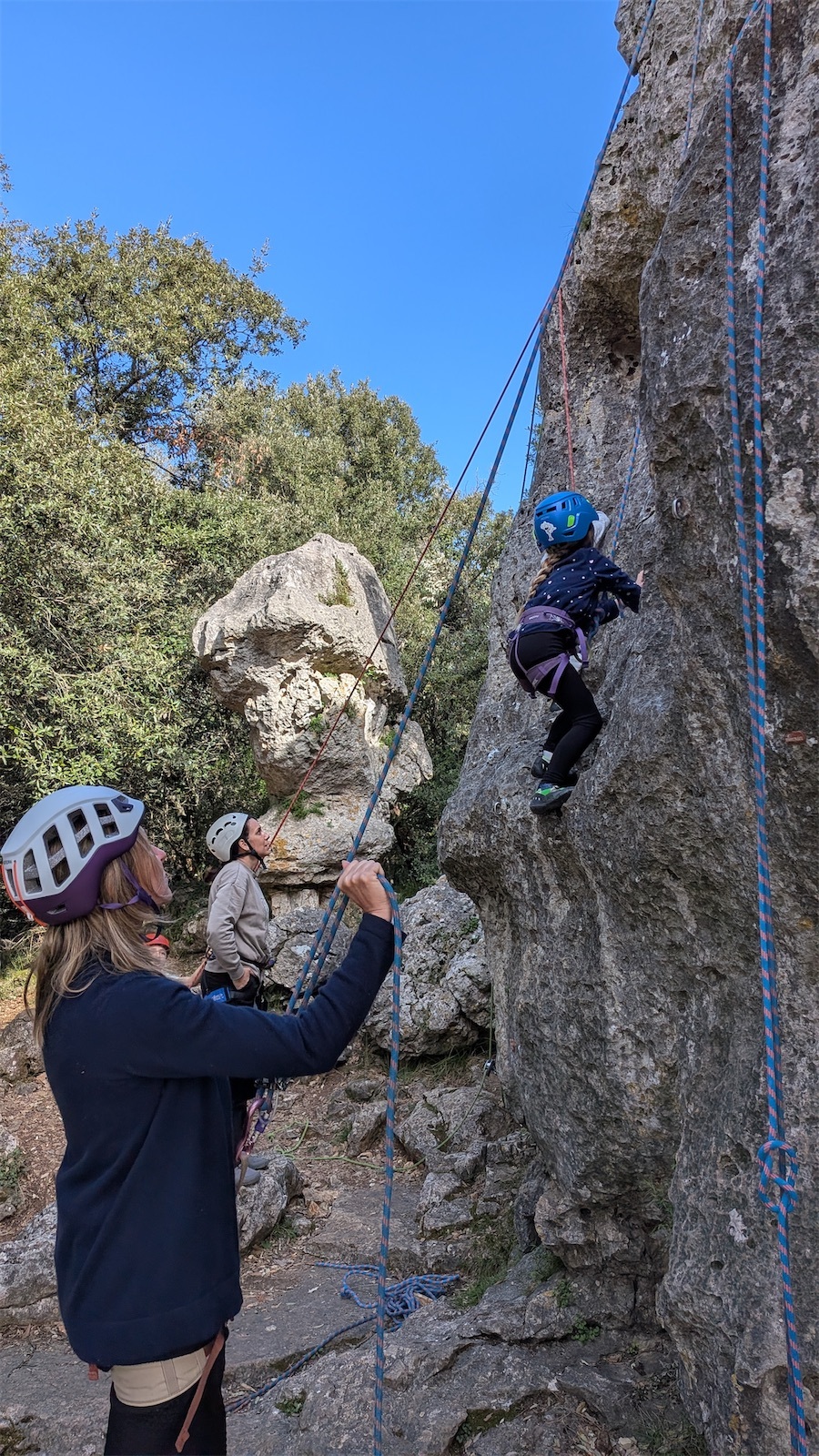 L’approche (trop) raide terminée l’on passera la matinée à faire du volume de voies pour se familiariser avec les voies du secteurs. Du 4b au 6a il y en a pour tous les goûts et dans tous les styles. Certains font le choix du plaisir en profitant des diverses moulinettes installées pendant que les autres se régalent en tête sur du caillou bien (trop) équipé. Ainsi chaque jeune aura réaliser minimum 3 voies avant un pique nique bien mérité.