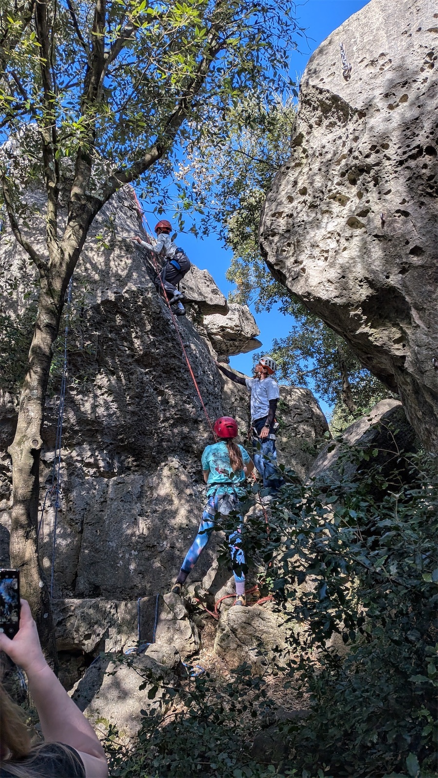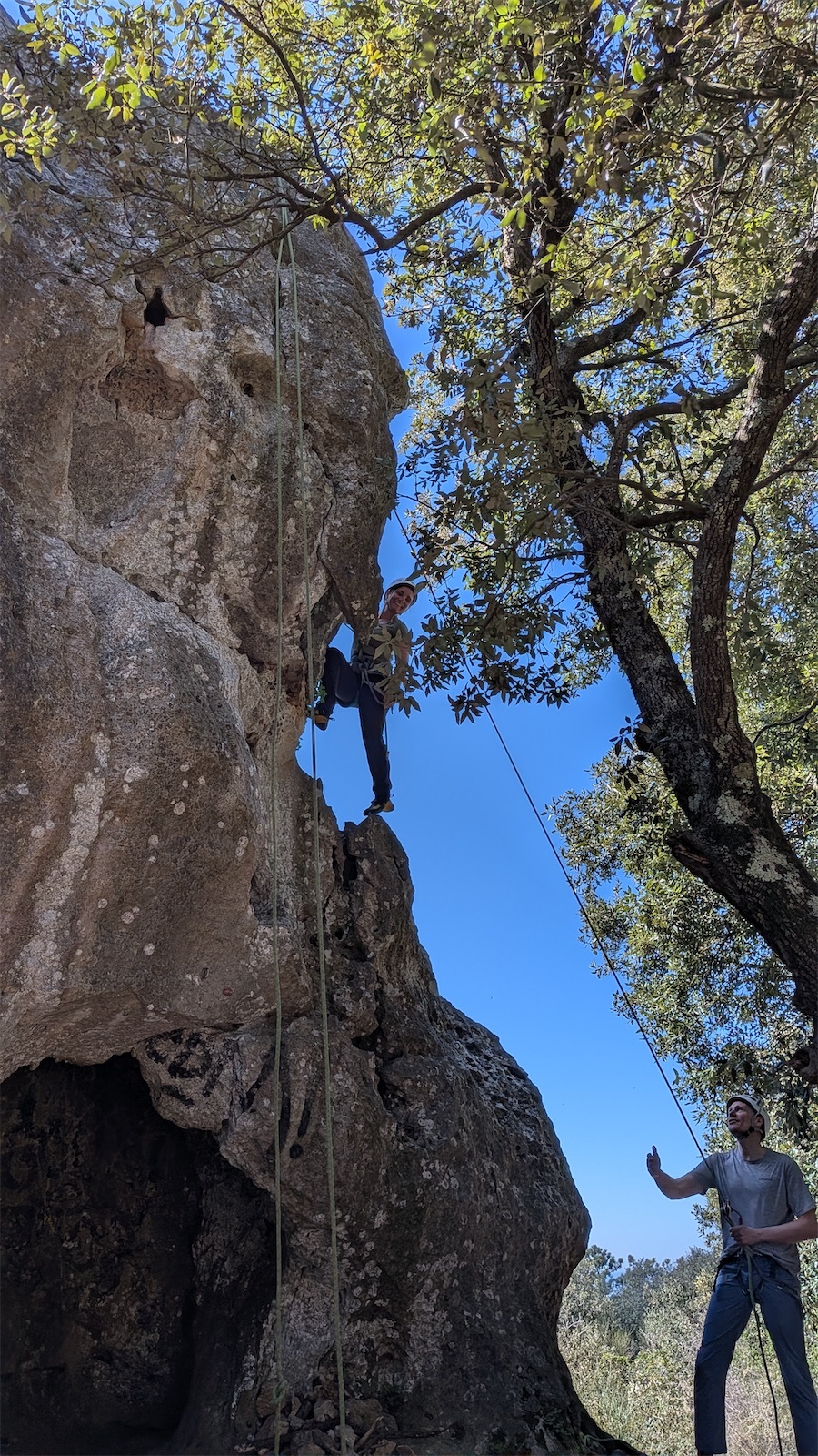 L’après midi ce n’est pas la même mayonnaise et le programme est le suivant : voies longues et grande cotation pour tout le monde. Ainsi Kim et Esteban s’essayent avec brio dans Swiss machine baby (6a+) pendant qu’Anthon et Alaric affronte Calimero climbing (5b+++++) et son creux sommital. Pendant ce temps Amélie, Julie, Julie pas la même et Lilia se prélassent dans All I Want is You (5c+) et le 6c pour les nuls (5b+).