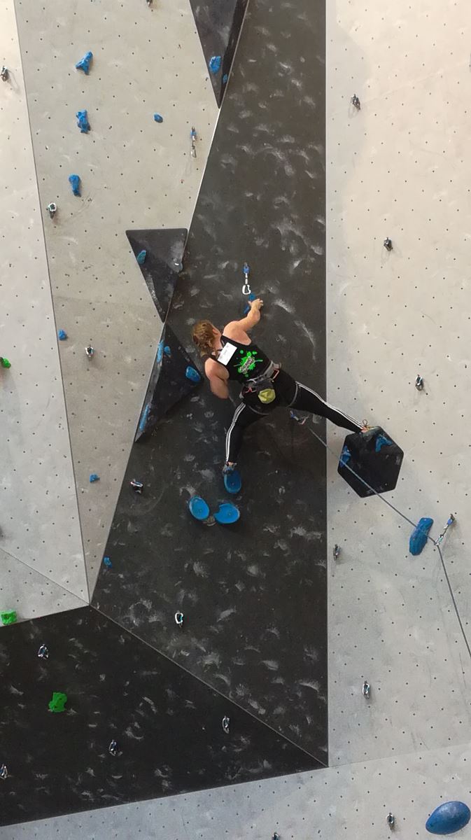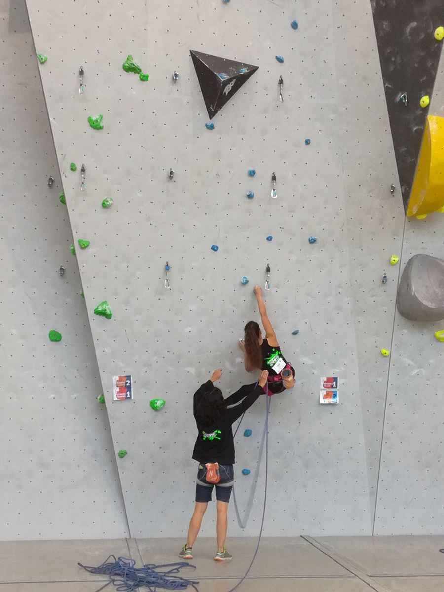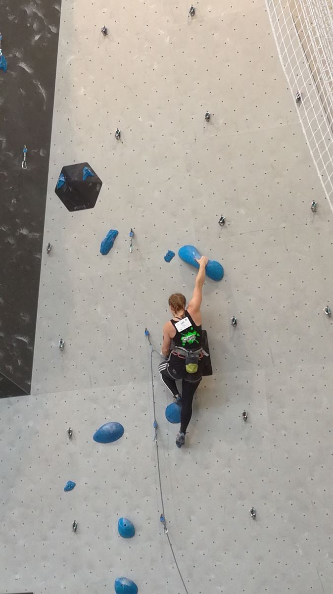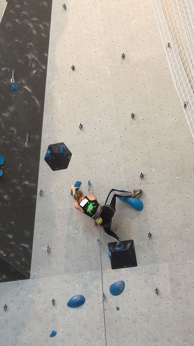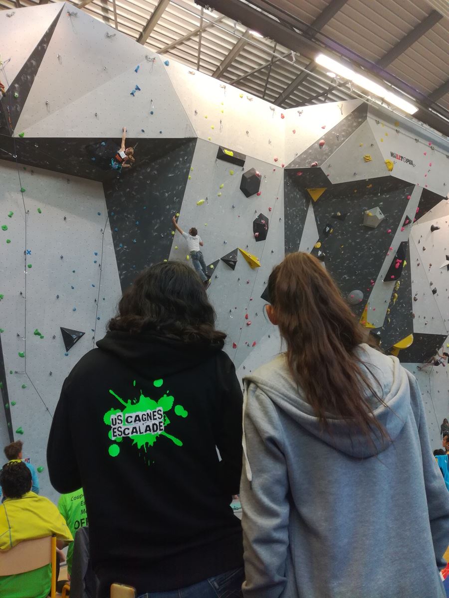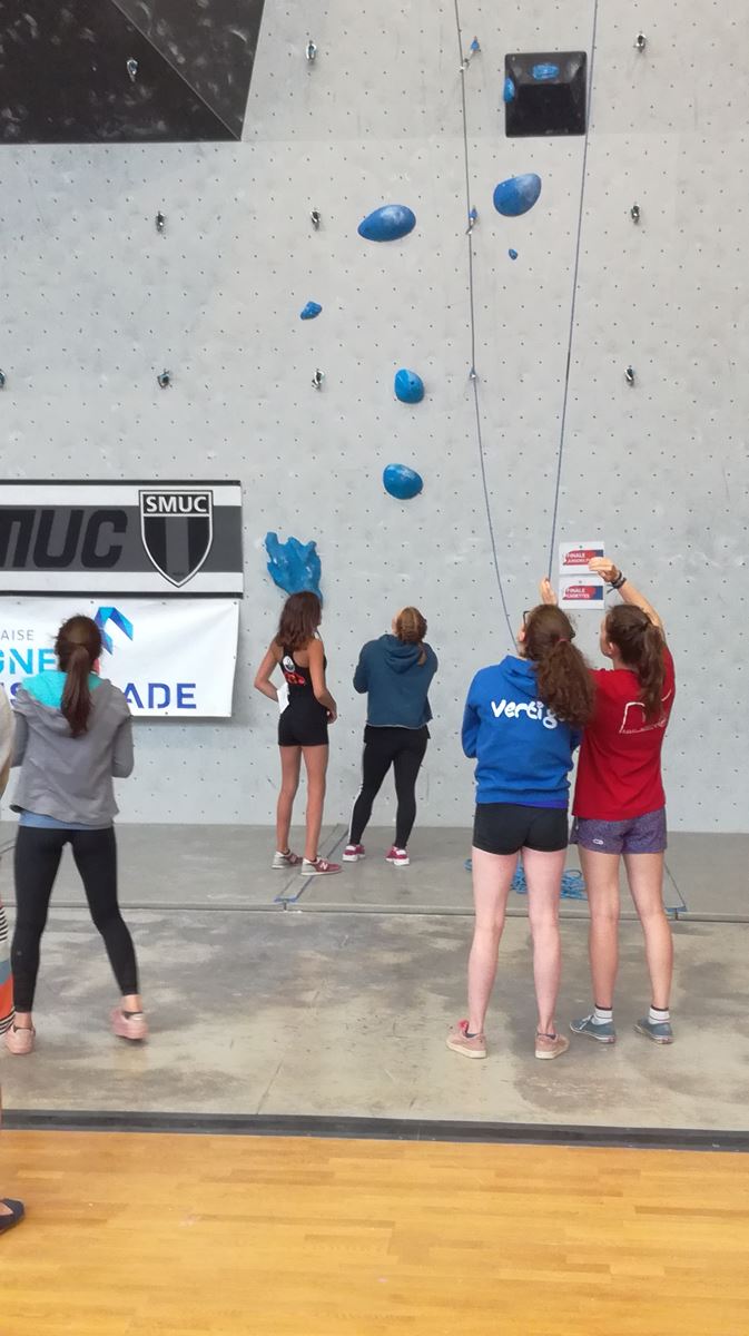 Chez les benjamins et les vétérans, le format est un peu différent avec 3 voies de qualif pour un accès direct aux finales. Juliette et Isane sont venues se frotter aux meilleures concurrentes françaises, et on peut dire que ça pousse fort chez les jeunes ! Juliette termine 19° et Isane 28°. Il y a encore du travail à faire au niveau de la concentration et de la lecture, et sans doute aussi au niveau de la rési car elles n’ont pas l’habitude de grimper sur un mur aussi haut.