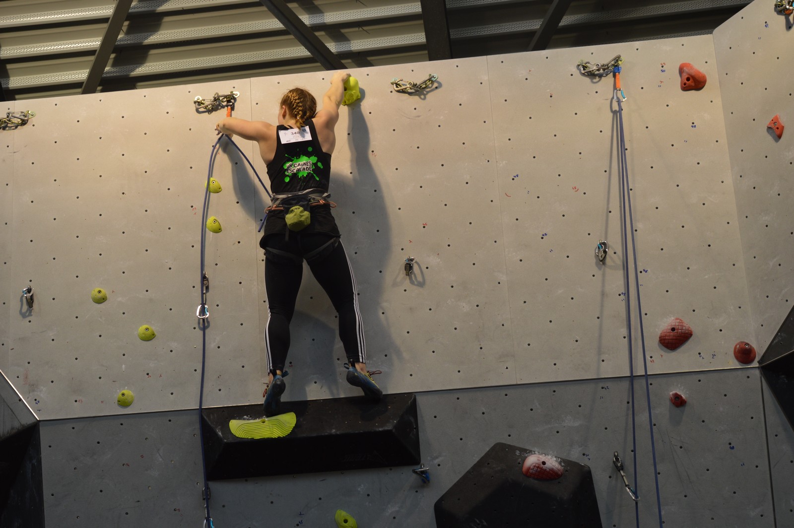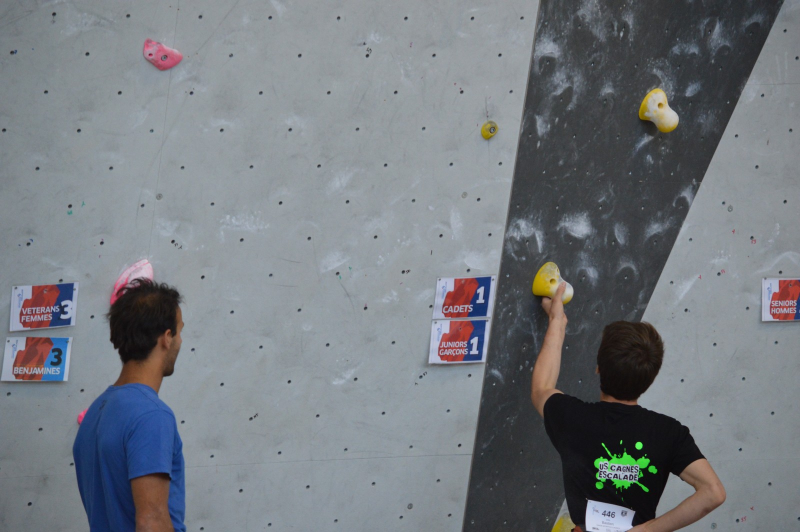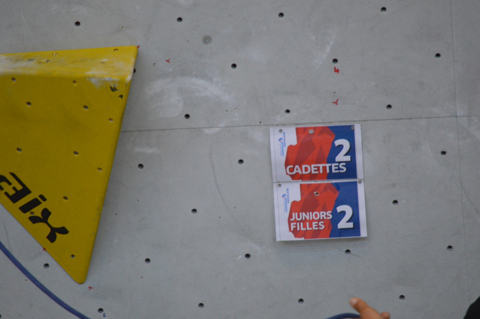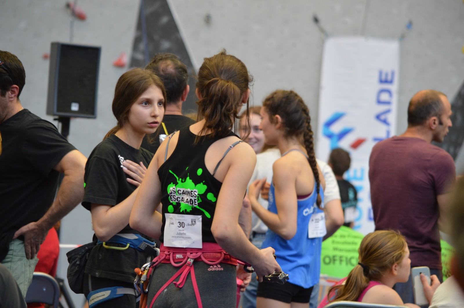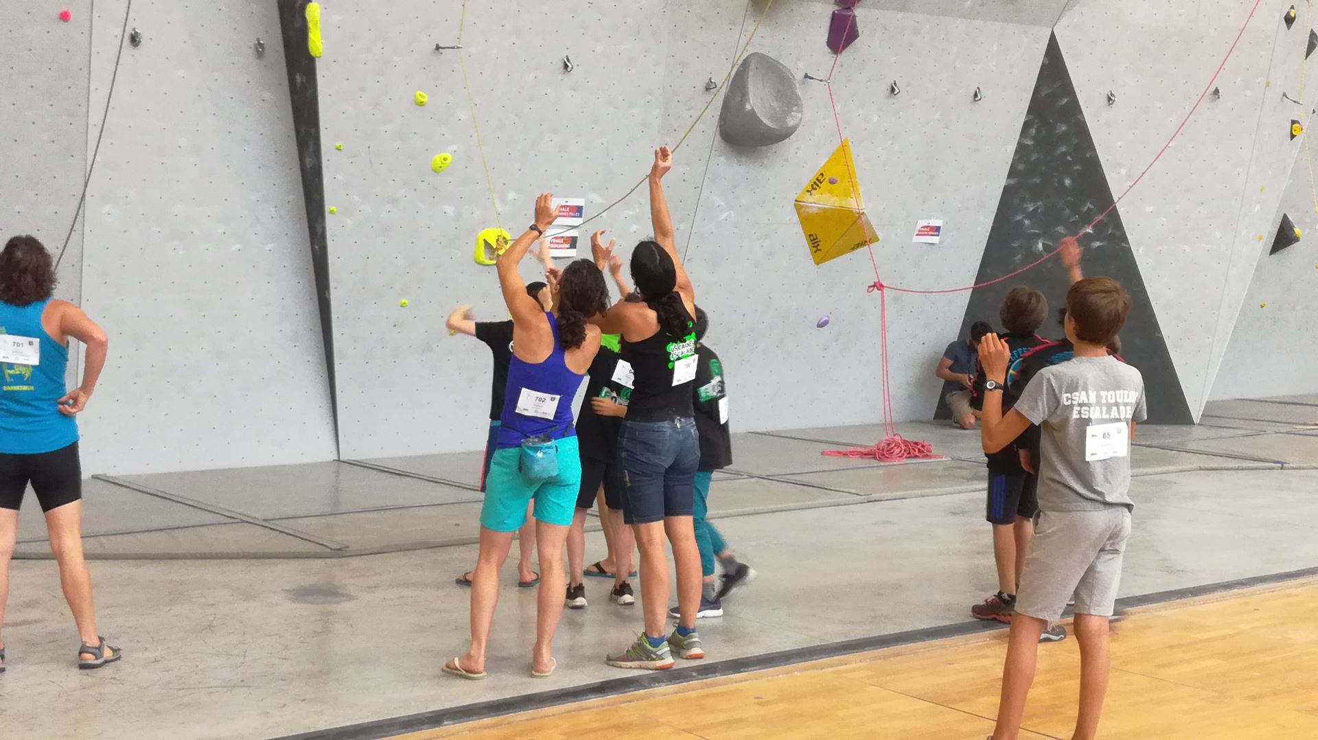 Chez les benjamins et les vétérans, le format est un peu différent avec 3 voies de qualif pour un accès direct aux finales. Juliette et Isane sont venues se frotter aux meilleures concurrentes françaises, et on peut dire que ça pousse fort chez les jeunes ! Juliette termine 19° et Isane 28°. Il y a encore du travail à faire au niveau de la concentration et de la lecture, et sans doute aussi au niveau de la rési car elles n’ont pas l’habitude de grimper sur un mur aussi haut.