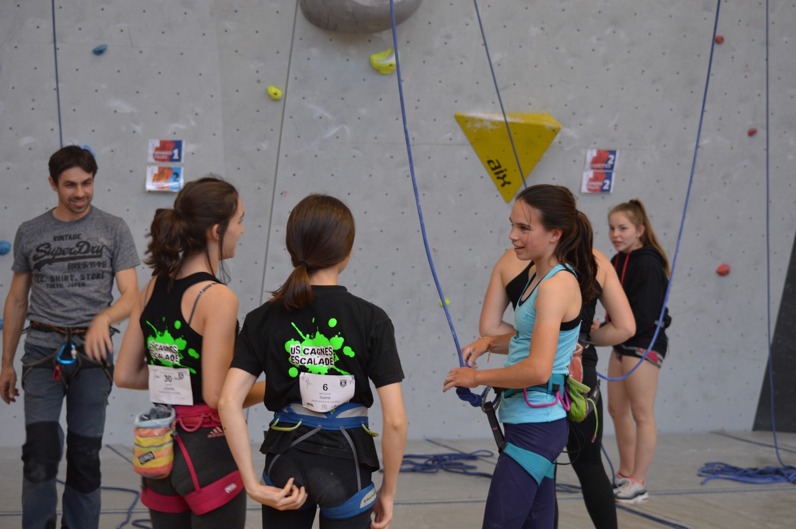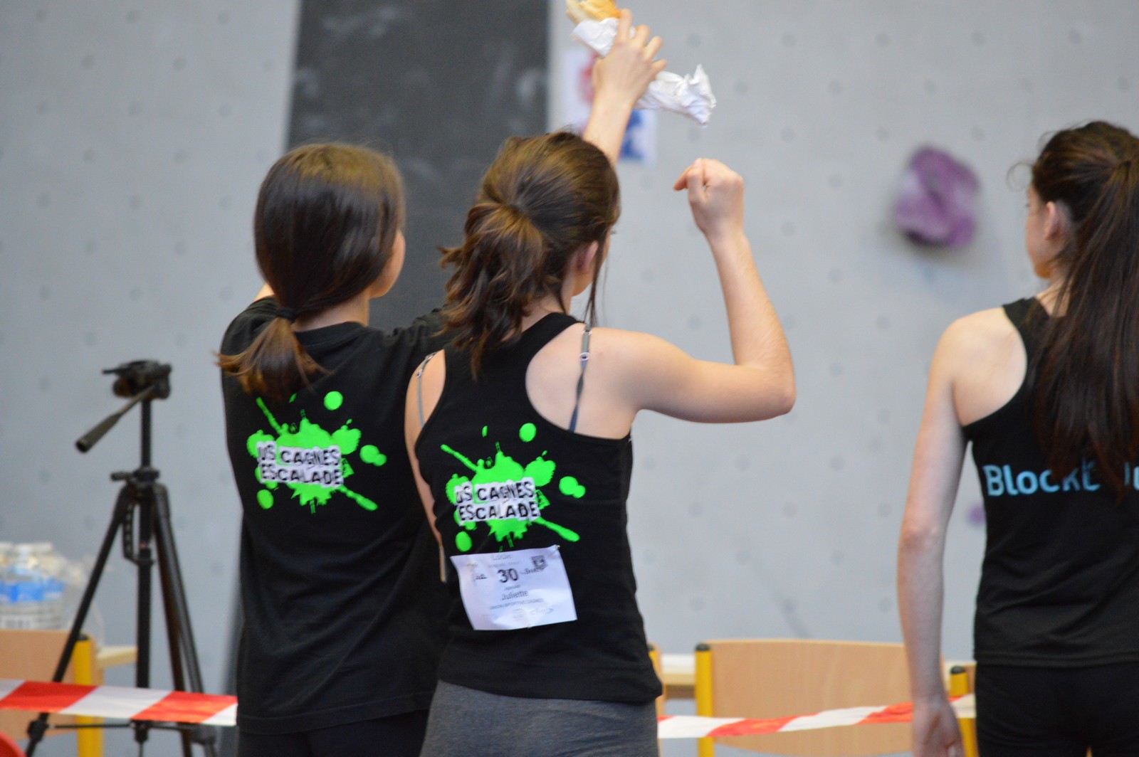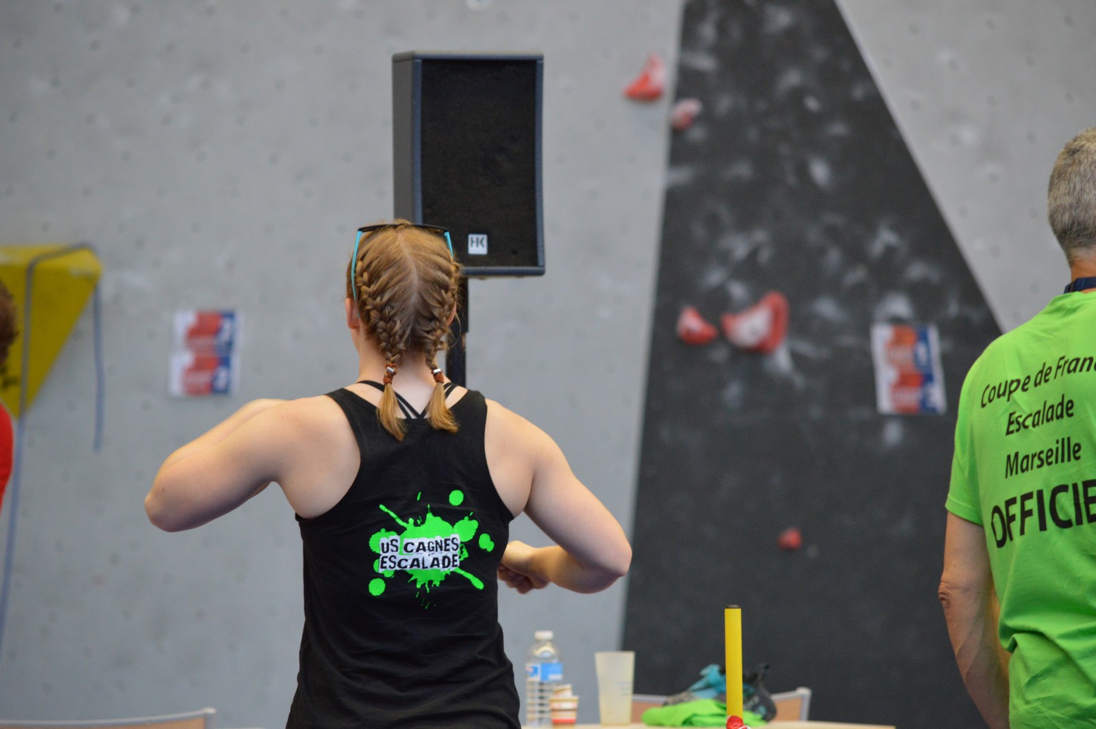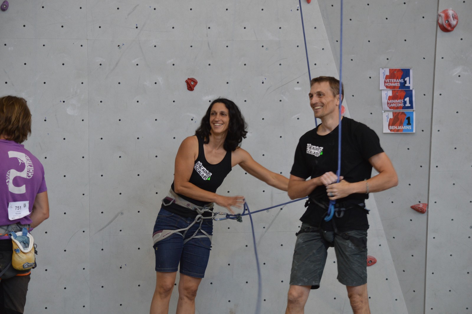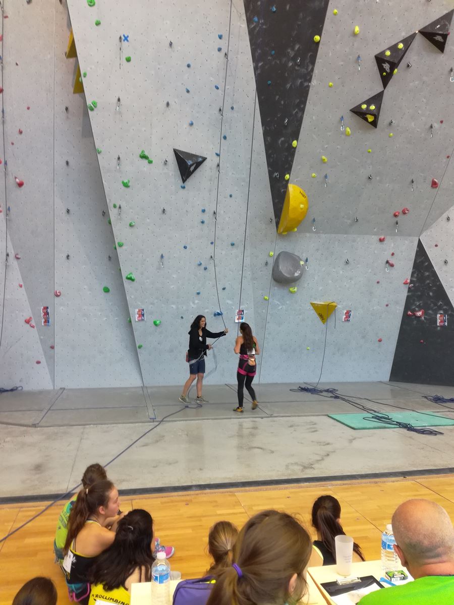 Chez les benjamins et les vétérans, le format est un peu différent avec 3 voies de qualif pour un accès direct aux finales. Juliette et Isane sont venues se frotter aux meilleures concurrentes françaises, et on peut dire que ça pousse fort chez les jeunes ! Juliette termine 19° et Isane 28°. Il y a encore du travail à faire au niveau de la concentration et de la lecture, et sans doute aussi au niveau de la rési car elles n’ont pas l’habitude de grimper sur un mur aussi haut.