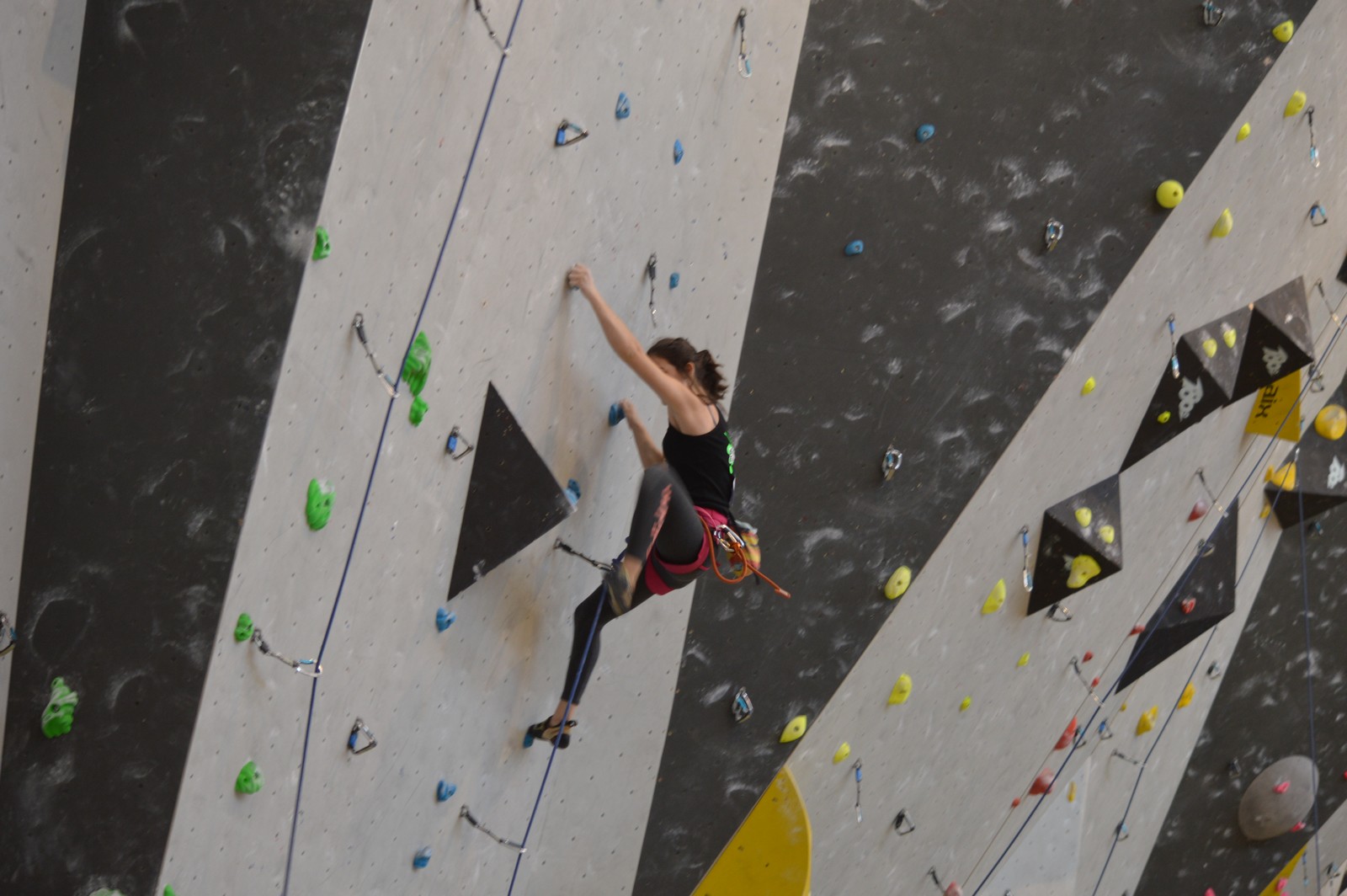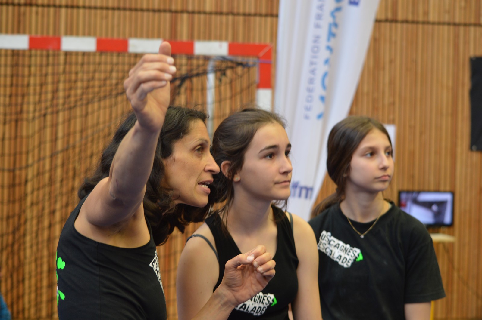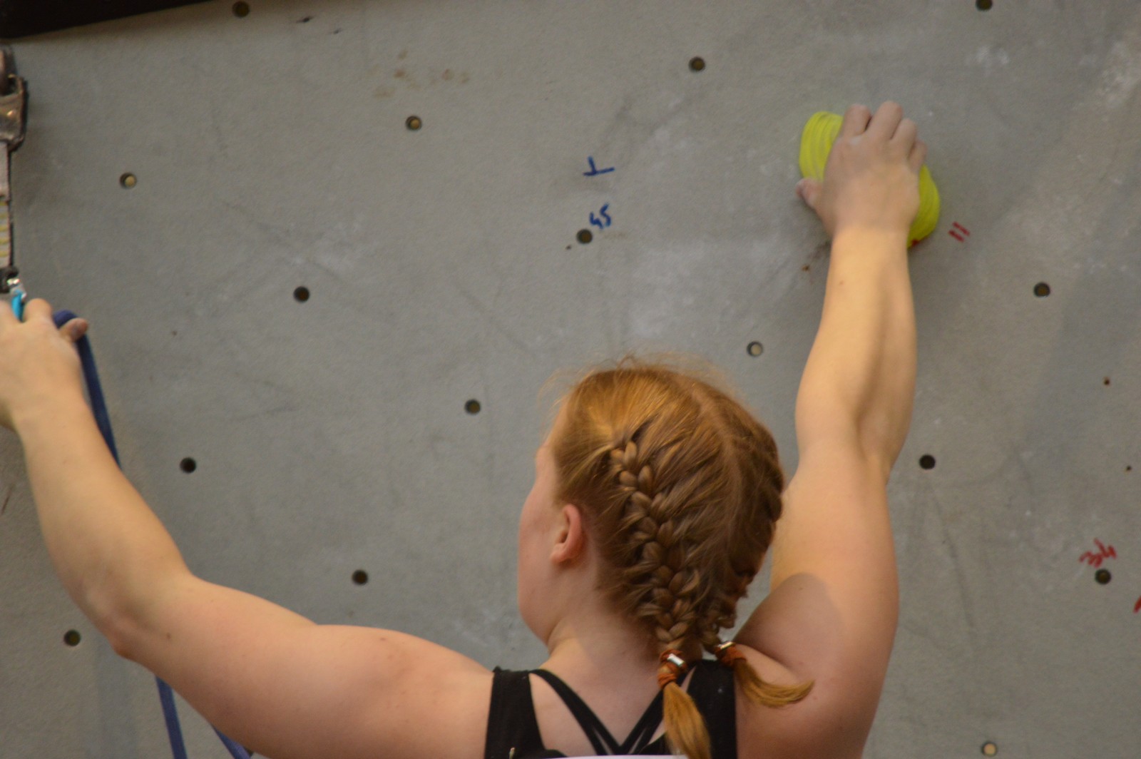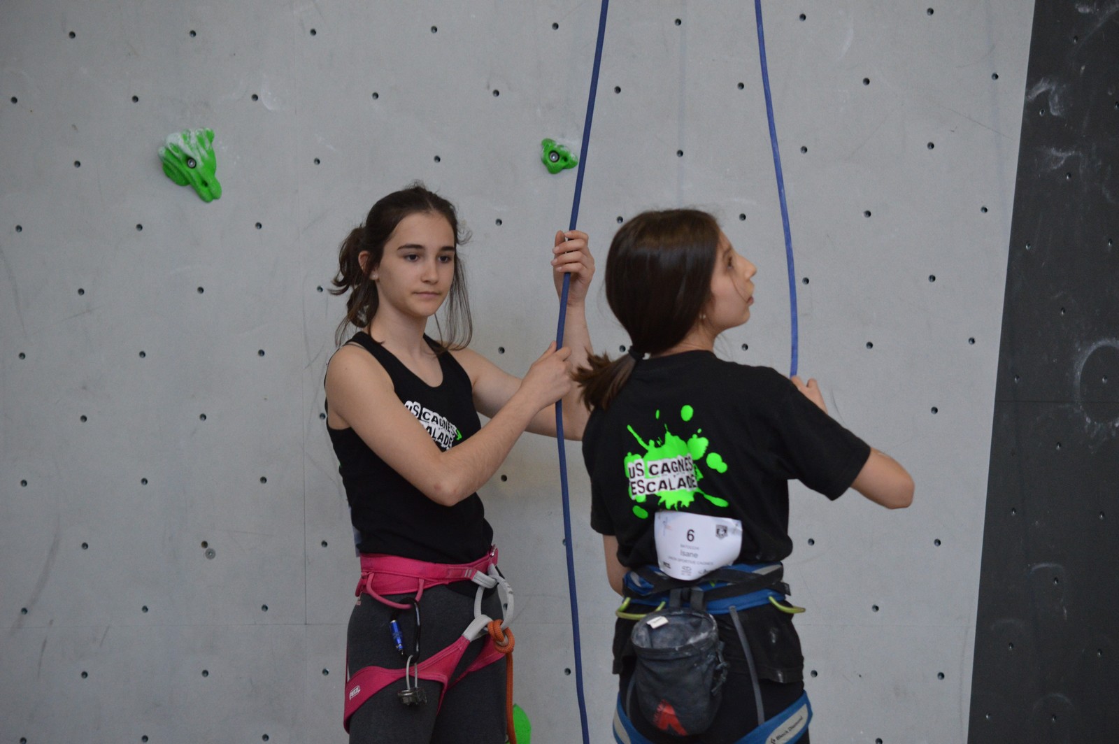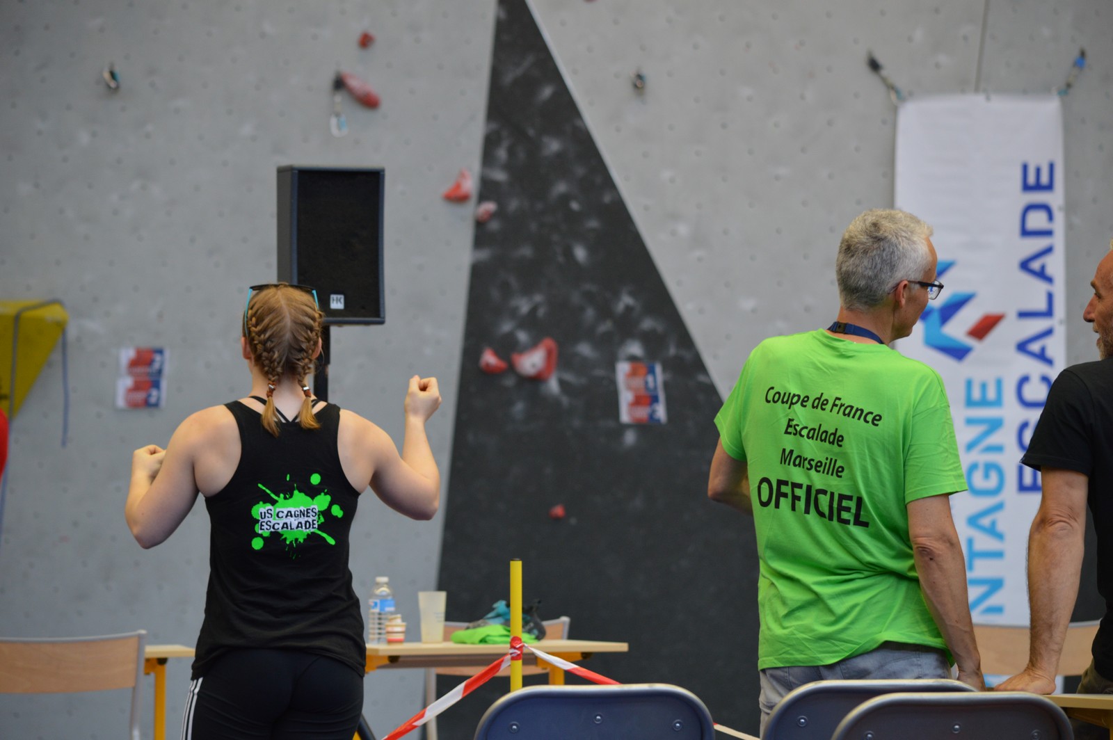 Chez les benjamins et les vétérans, le format est un peu différent avec 3 voies de qualif pour un accès direct aux finales. Juliette et Isane sont venues se frotter aux meilleures concurrentes françaises, et on peut dire que ça pousse fort chez les jeunes ! Juliette termine 19° et Isane 28°. Il y a encore du travail à faire au niveau de la concentration et de la lecture, et sans doute aussi au niveau de la rési car elles n’ont pas l’habitude de grimper sur un mur aussi haut.