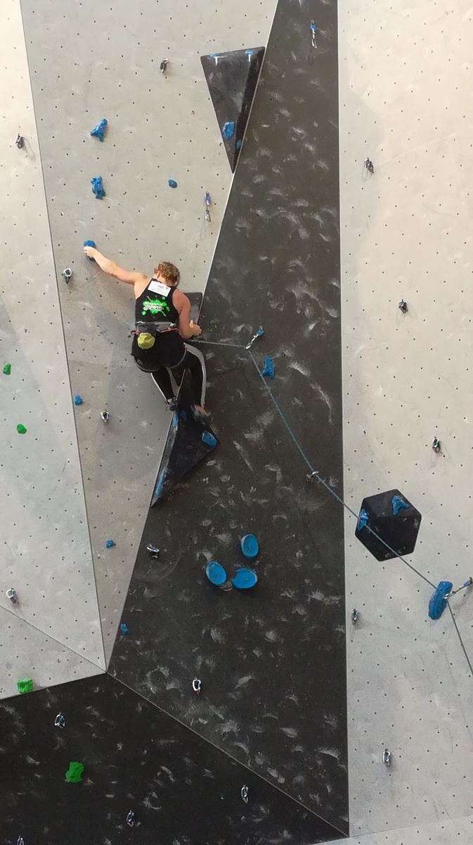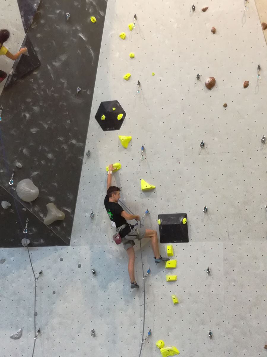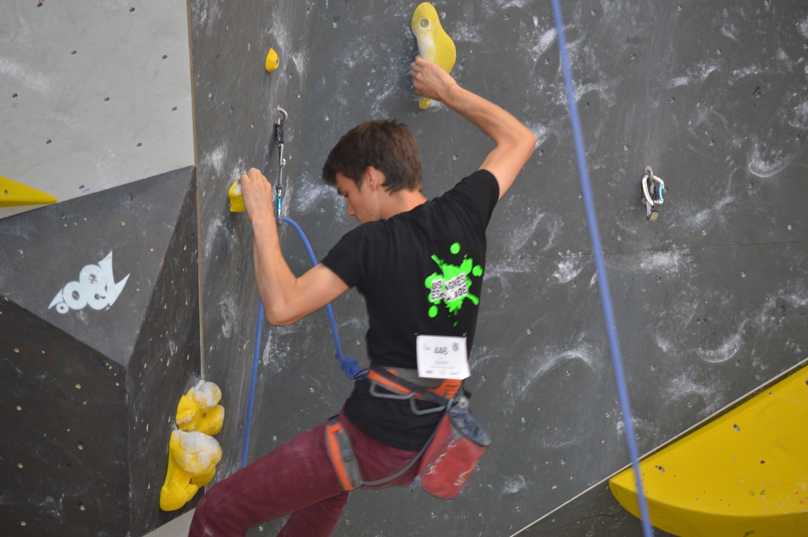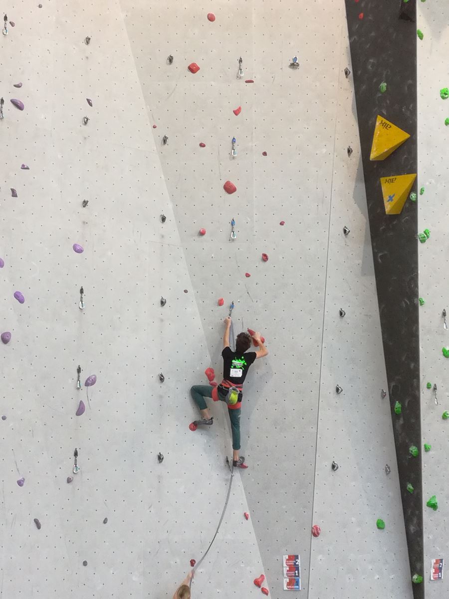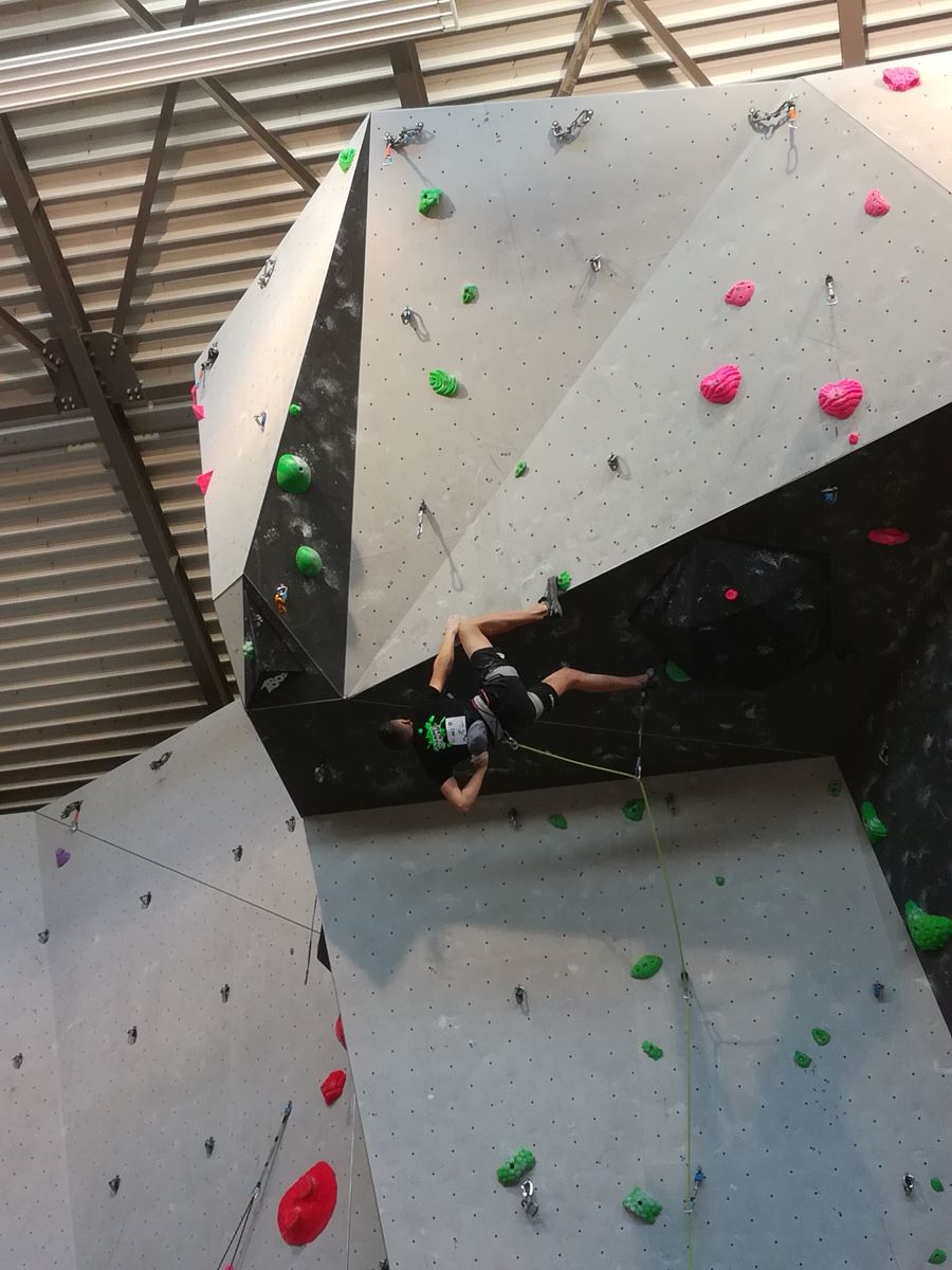 Dimanche matin, place aux demi-finales dès l’aurore (ou presque). Bastien est le premier de nos jeunes à s’élancer, et parvient à bien avancer dans la voie, il chute comme pas mal d’autres sur un mouvement qui le laissera aux portes de la finale, et avec le rétro classement des qualifs, il finit à une belle 15° place. La compétition s’arrête là également pour Nicolas H. qui termine 23° chez les juniors, et pour Lenny, qui rate de très très peu la qualif en finale et finit 9°. Ca passe en revanche pour Nicolas I., Prune et Jules qui tope tranquille sa voie de demi.
