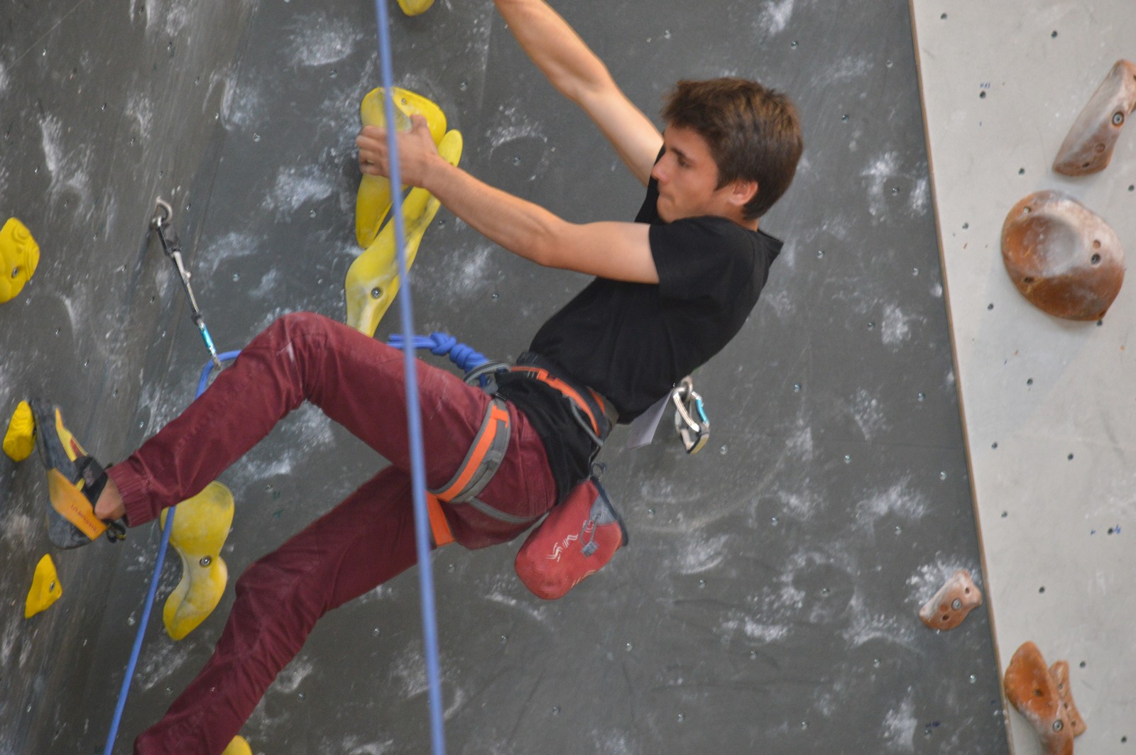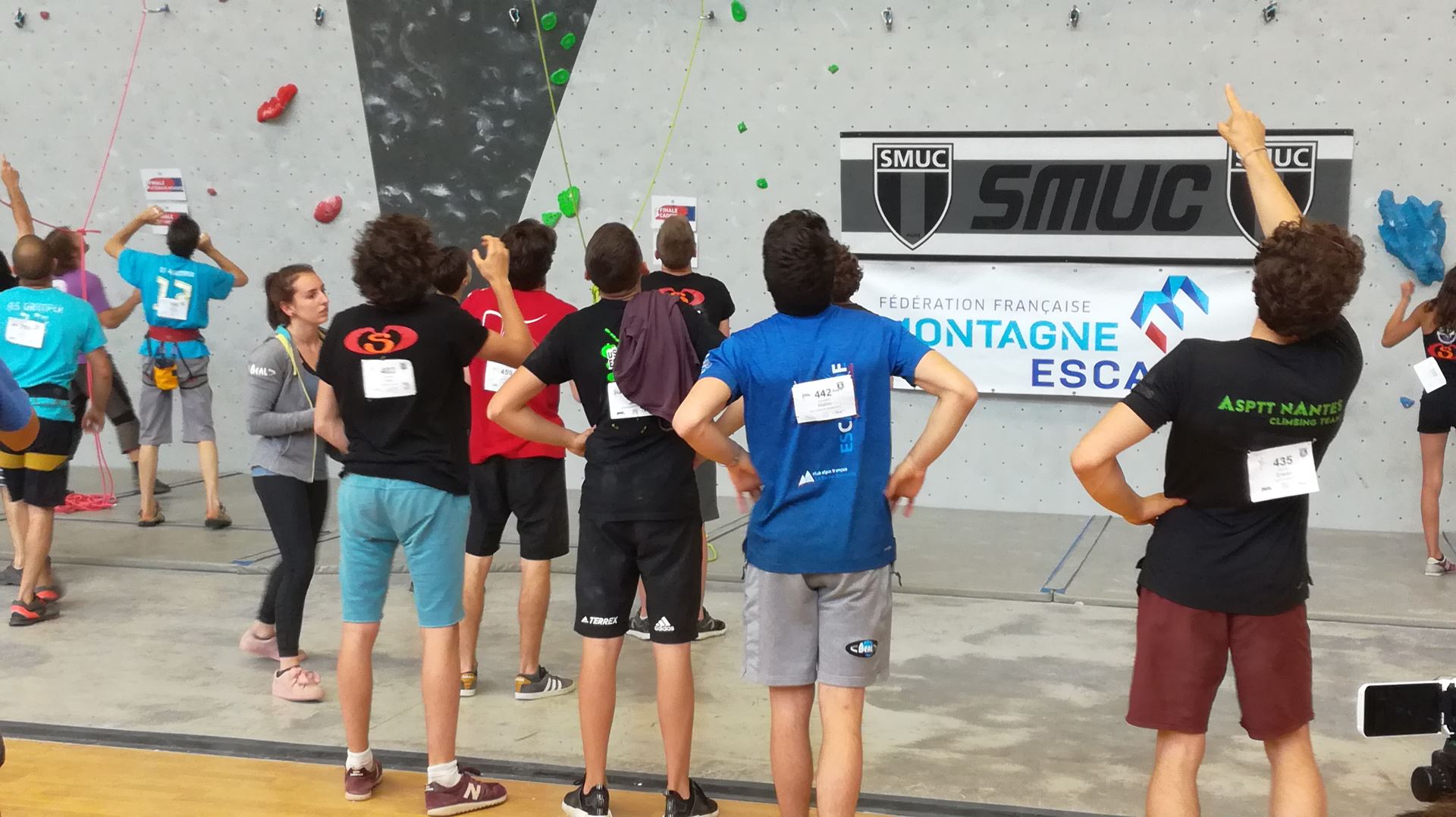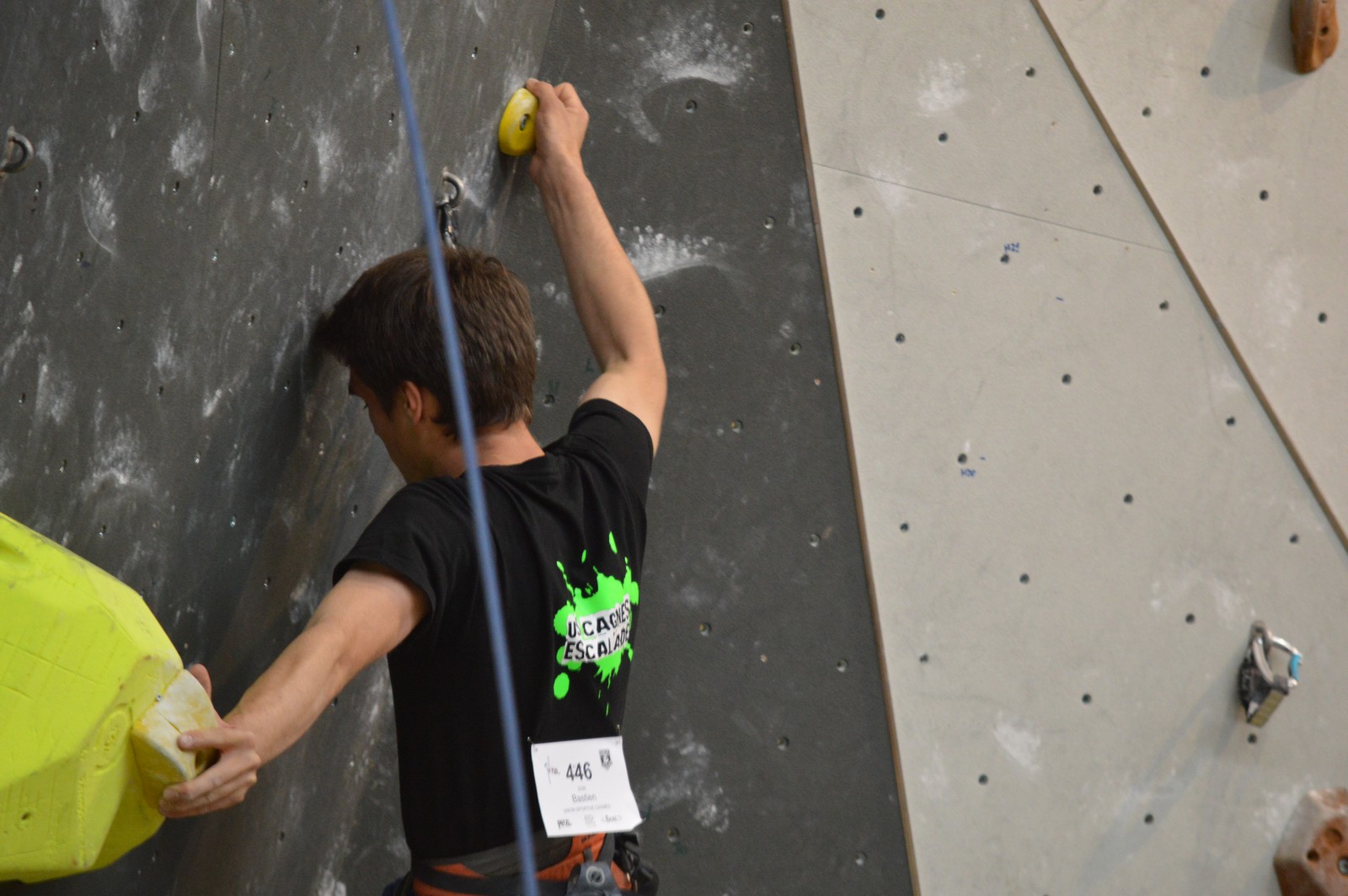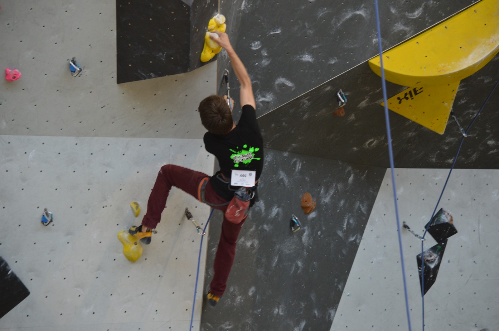 Dimanche matin, place aux demi-finales dès l’aurore (ou presque). Bastien est le premier de nos jeunes à s’élancer, et parvient à bien avancer dans la voie, il chute comme pas mal d’autres sur un mouvement qui le laissera aux portes de la finale, et avec le rétro classement des qualifs, il finit à une belle 15° place. La compétition s’arrête là également pour Nicolas H. qui termine 23° chez les juniors, et pour Lenny, qui rate de très très peu la qualif en finale et finit 9°. Ca passe en revanche pour Nicolas I., Prune et Jules qui tope tranquille sa voie de demi.