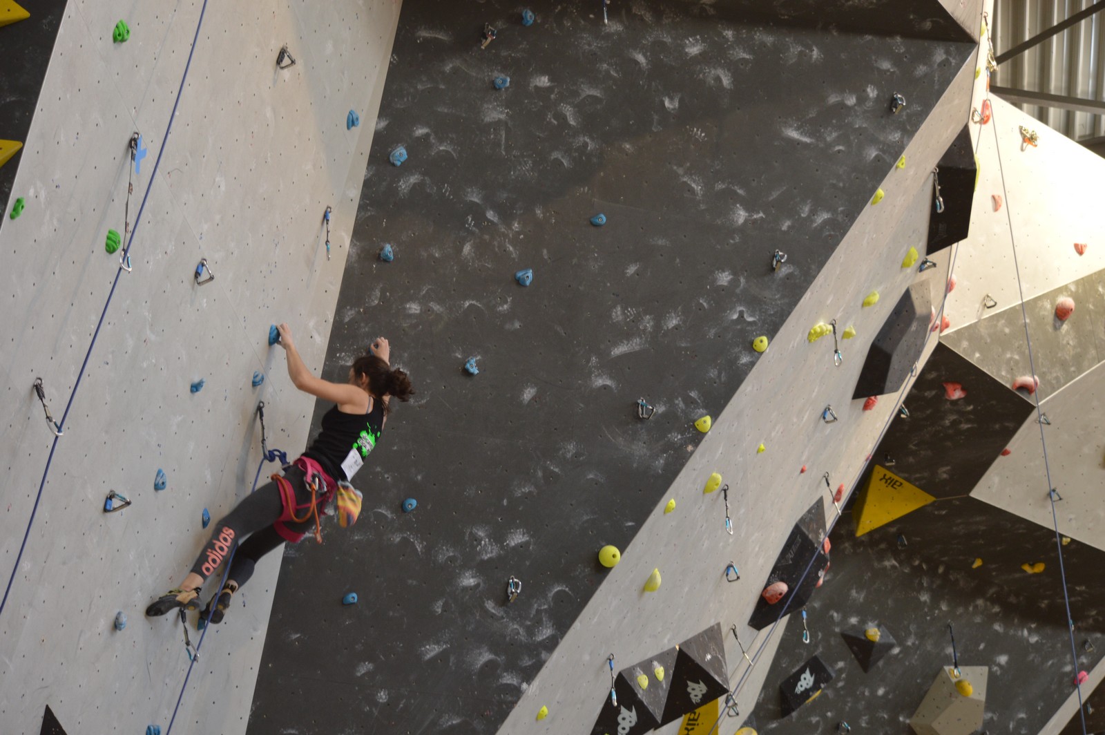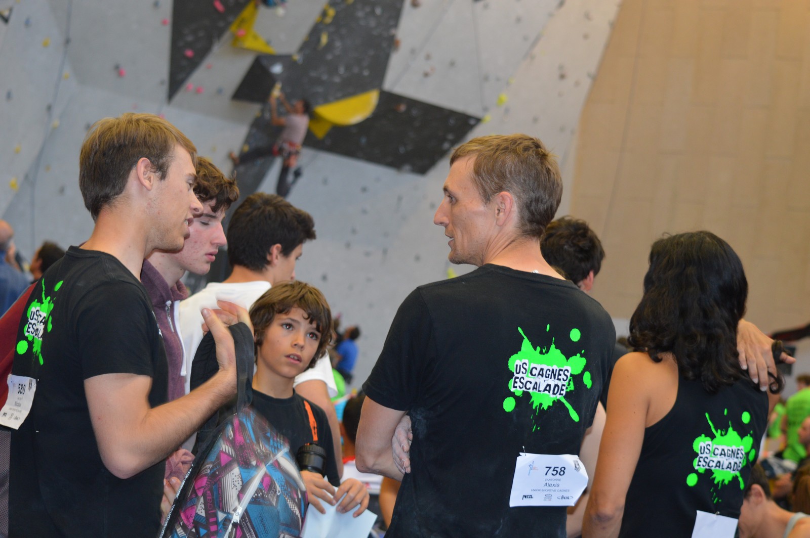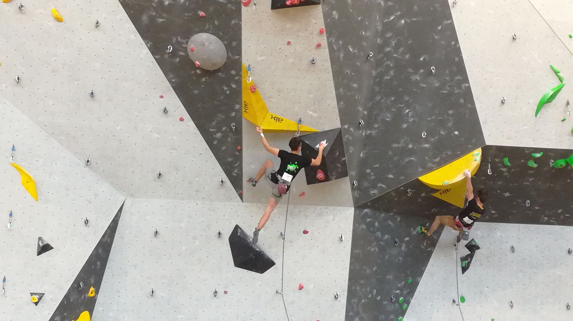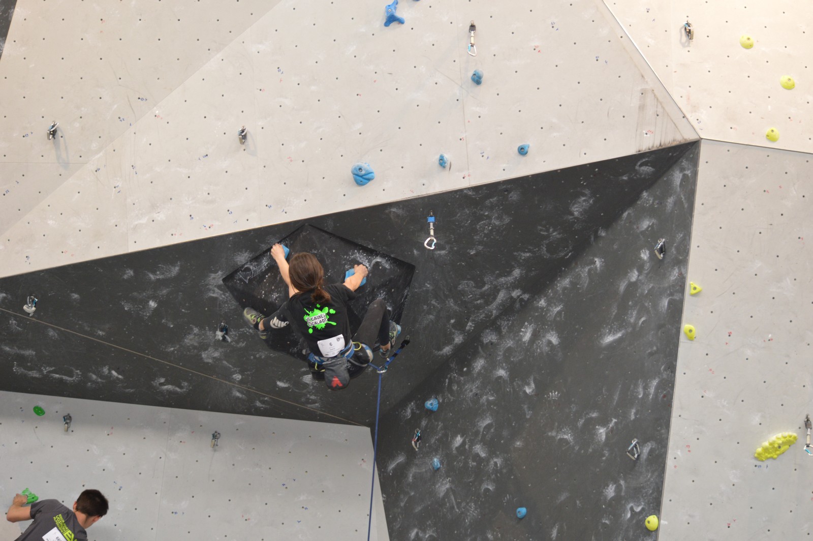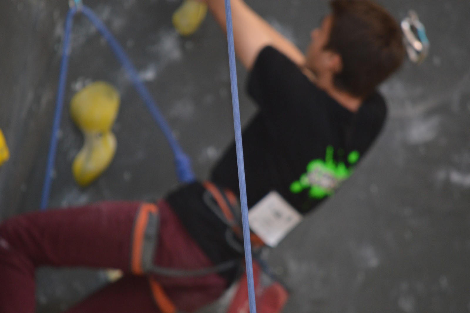 Dimanche matin, place aux demi-finales dès l’aurore (ou presque). Bastien est le premier de nos jeunes à s’élancer, et parvient à bien avancer dans la voie, il chute comme pas mal d’autres sur un mouvement qui le laissera aux portes de la finale, et avec le rétro classement des qualifs, il finit à une belle 15° place. La compétition s’arrête là également pour Nicolas H. qui termine 23° chez les juniors, et pour Lenny, qui rate de très très peu la qualif en finale et finit 9°. Ca passe en revanche pour Nicolas I., Prune et Jules qui tope tranquille sa voie de demi.