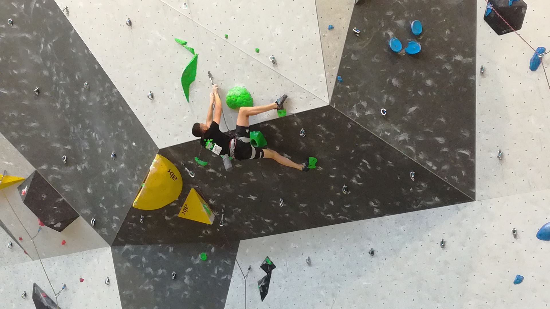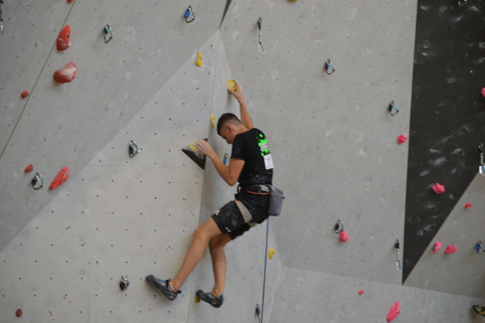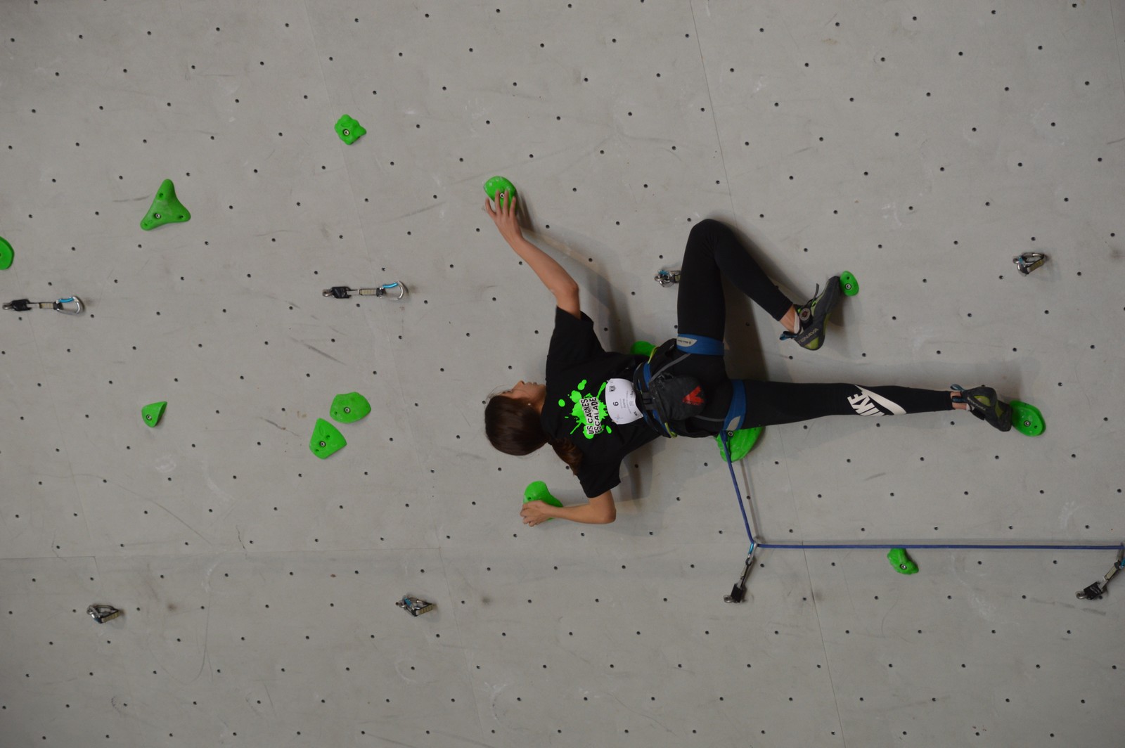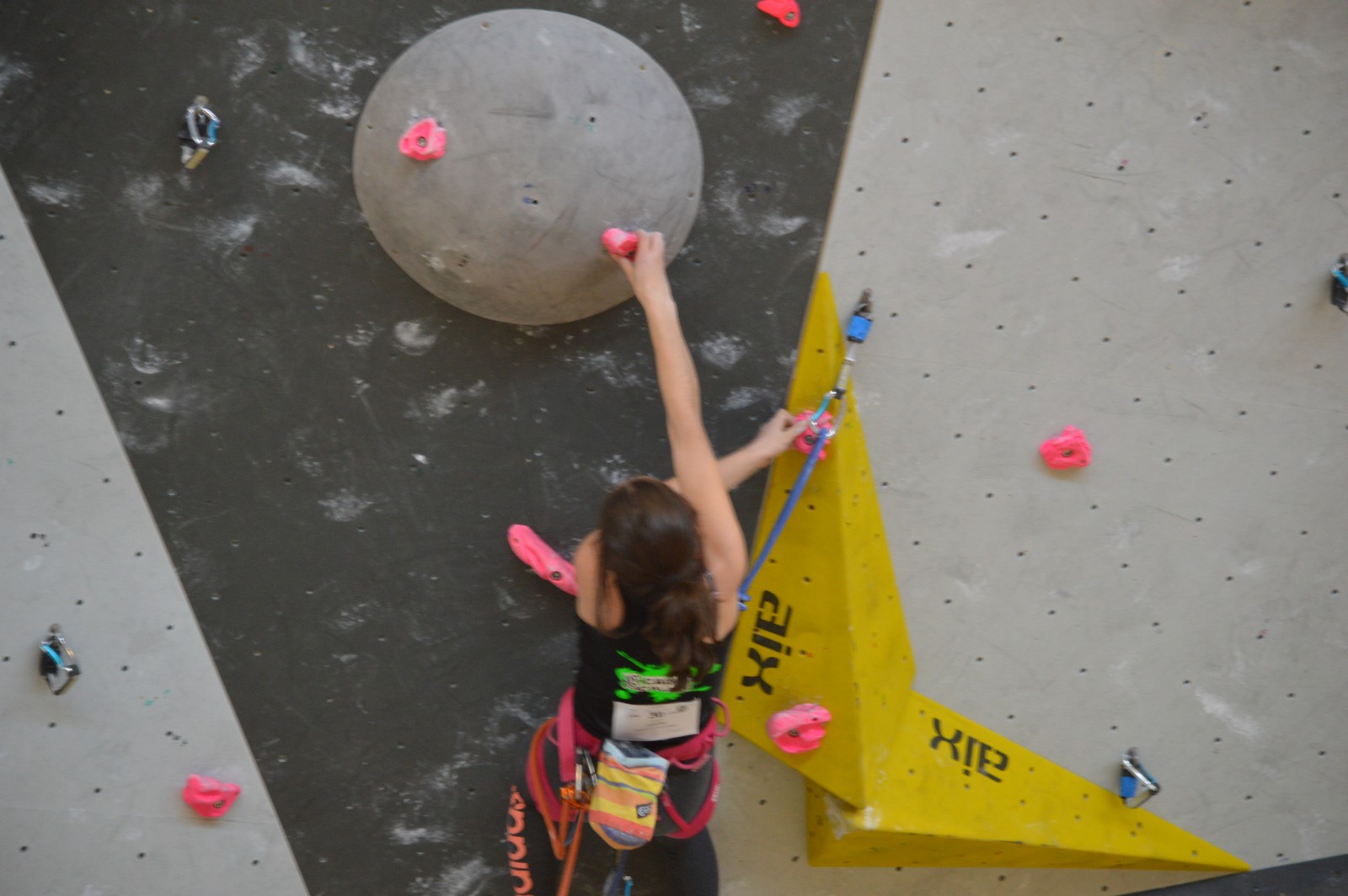 Dimanche matin, place aux demi-finales dès l’aurore (ou presque). Bastien est le premier de nos jeunes à s’élancer, et parvient à bien avancer dans la voie, il chute comme pas mal d’autres sur un mouvement qui le laissera aux portes de la finale, et avec le rétro classement des qualifs, il finit à une belle 15° place. La compétition s’arrête là également pour Nicolas H. qui termine 23° chez les juniors, et pour Lenny, qui rate de très très peu la qualif en finale et finit 9°. Ca passe en revanche pour Nicolas I., Prune et Jules qui tope tranquille sa voie de demi.