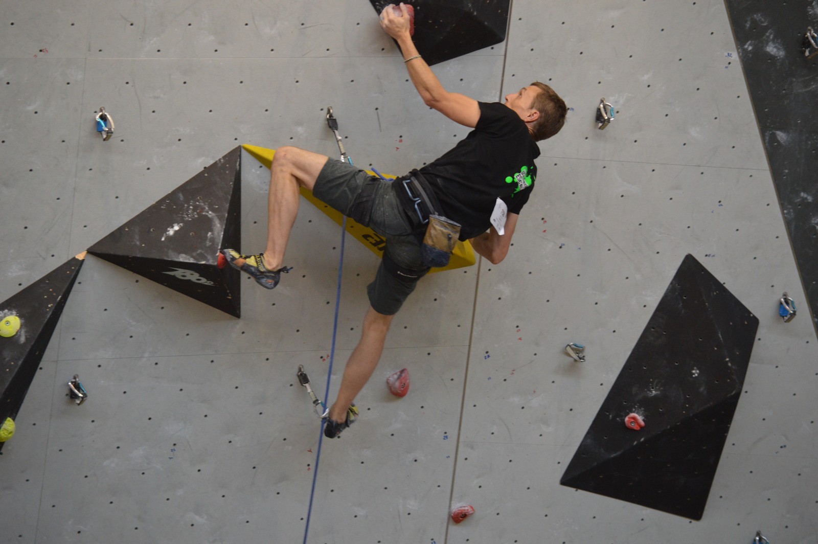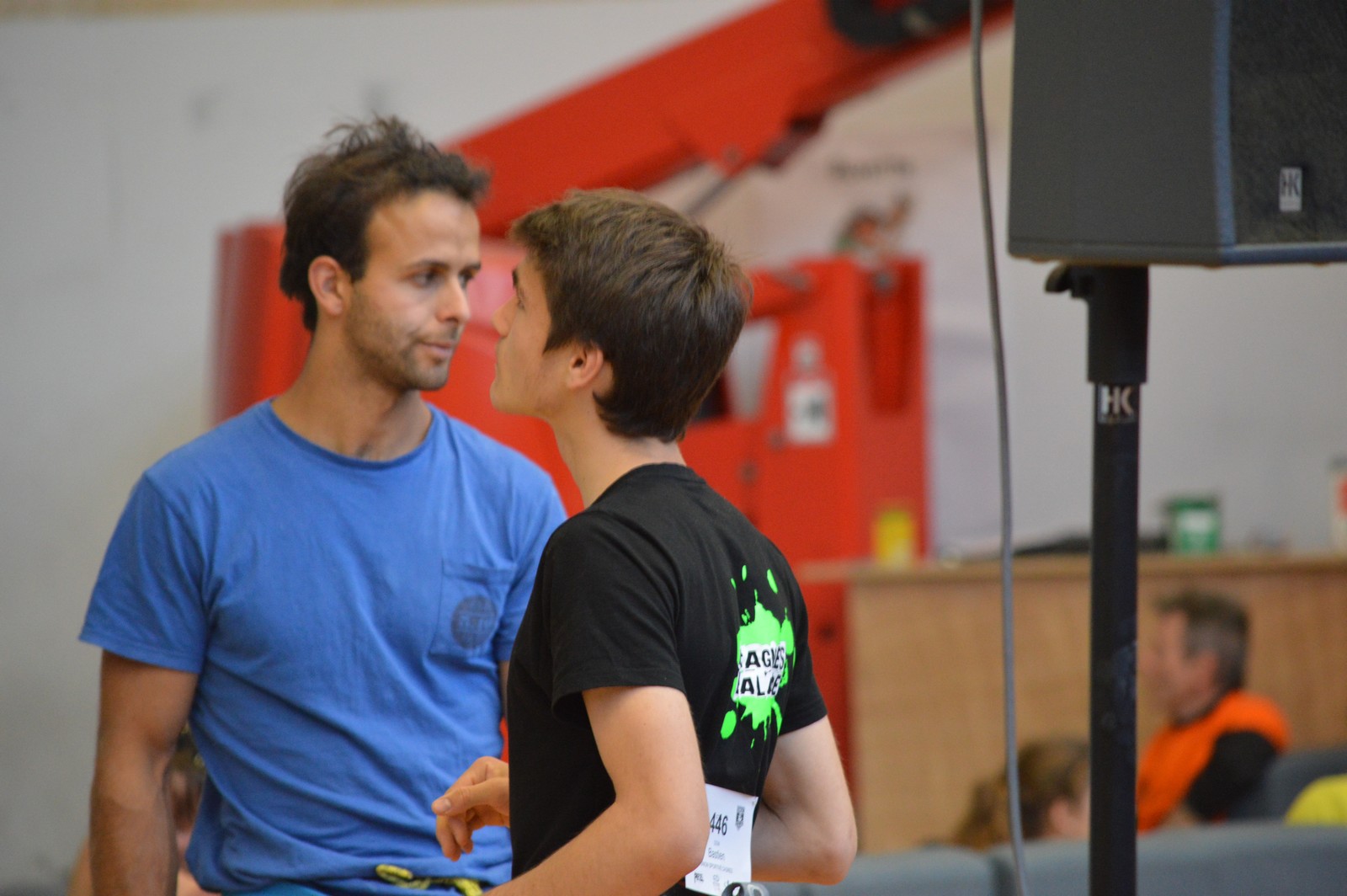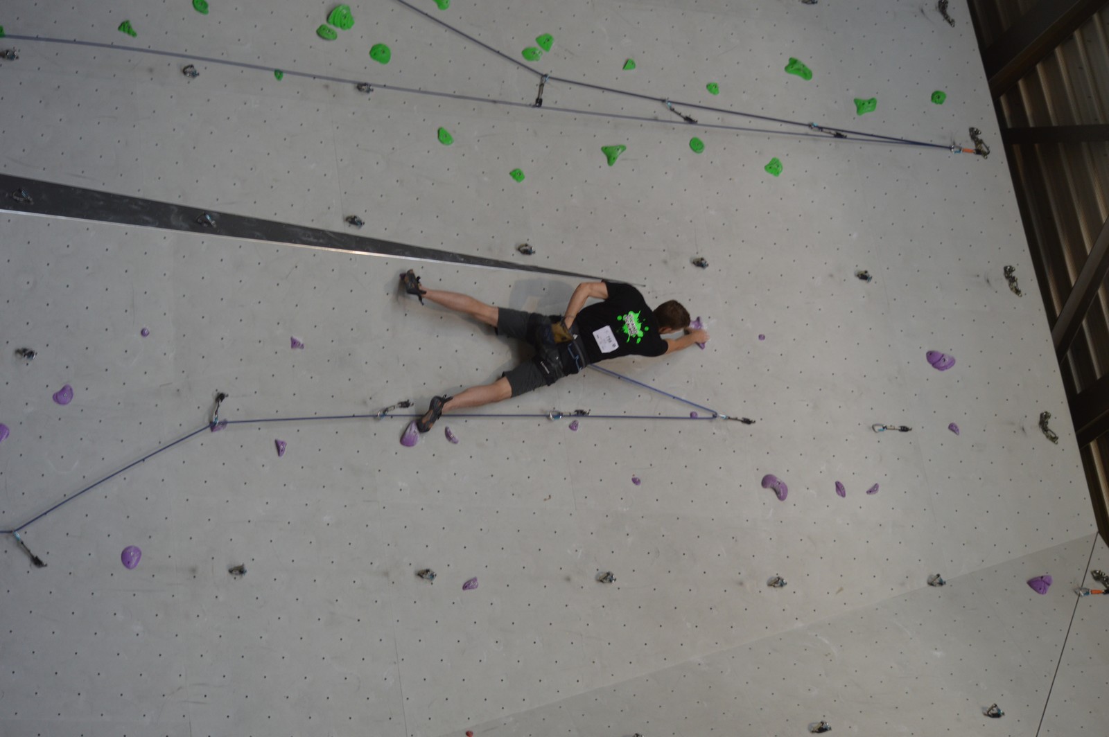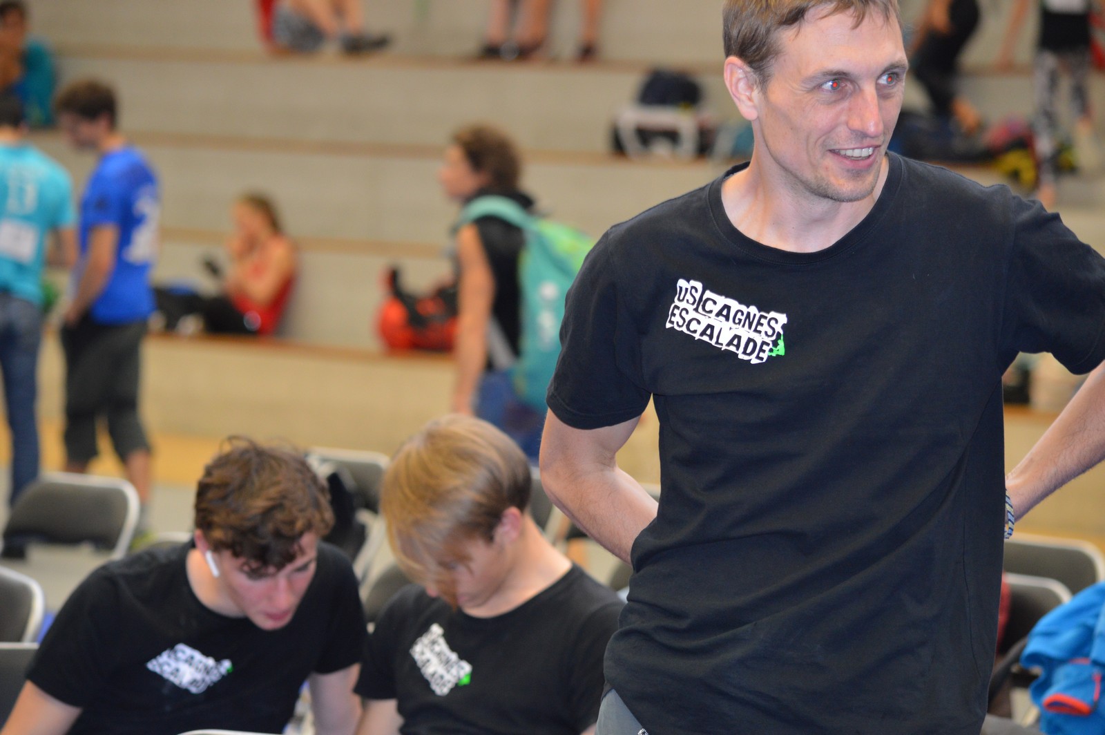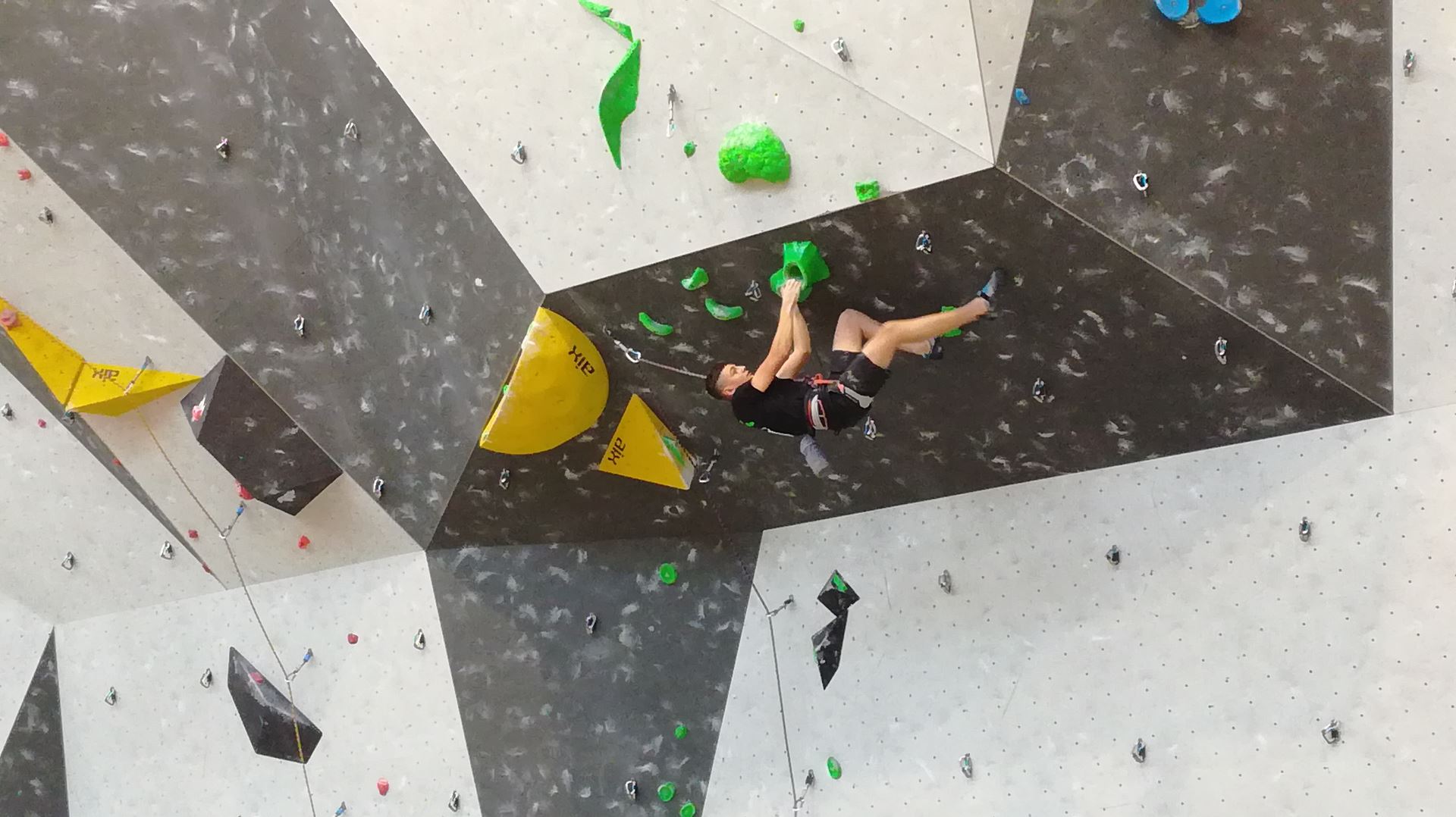 Dimanche matin, place aux demi-finales dès l’aurore (ou presque). Bastien est le premier de nos jeunes à s’élancer, et parvient à bien avancer dans la voie, il chute comme pas mal d’autres sur un mouvement qui le laissera aux portes de la finale, et avec le rétro classement des qualifs, il finit à une belle 15° place. La compétition s’arrête là également pour Nicolas H. qui termine 23° chez les juniors, et pour Lenny, qui rate de très très peu la qualif en finale et finit 9°. Ca passe en revanche pour Nicolas I., Prune et Jules qui tope tranquille sa voie de demi.
