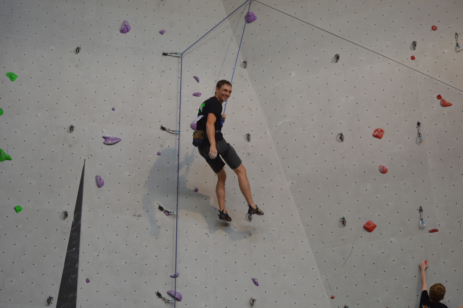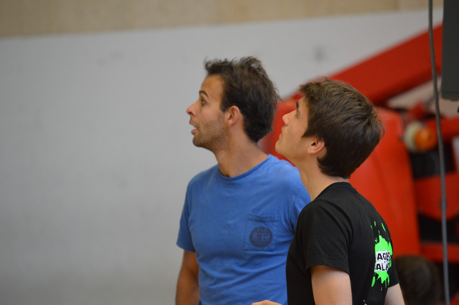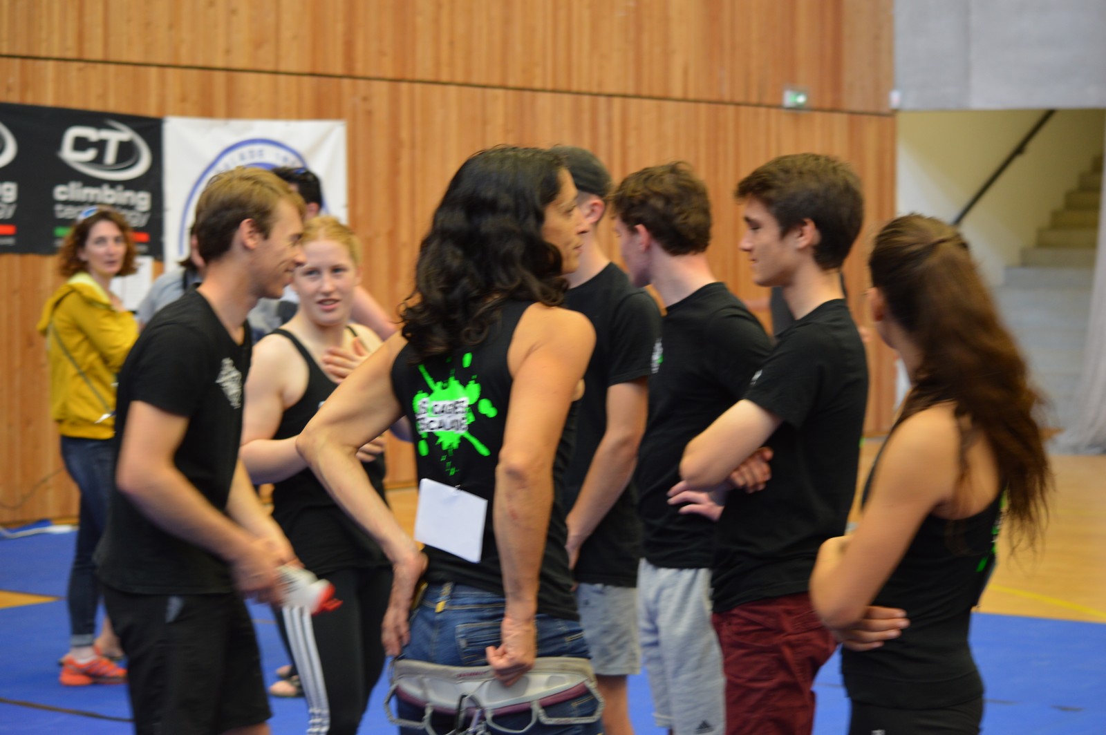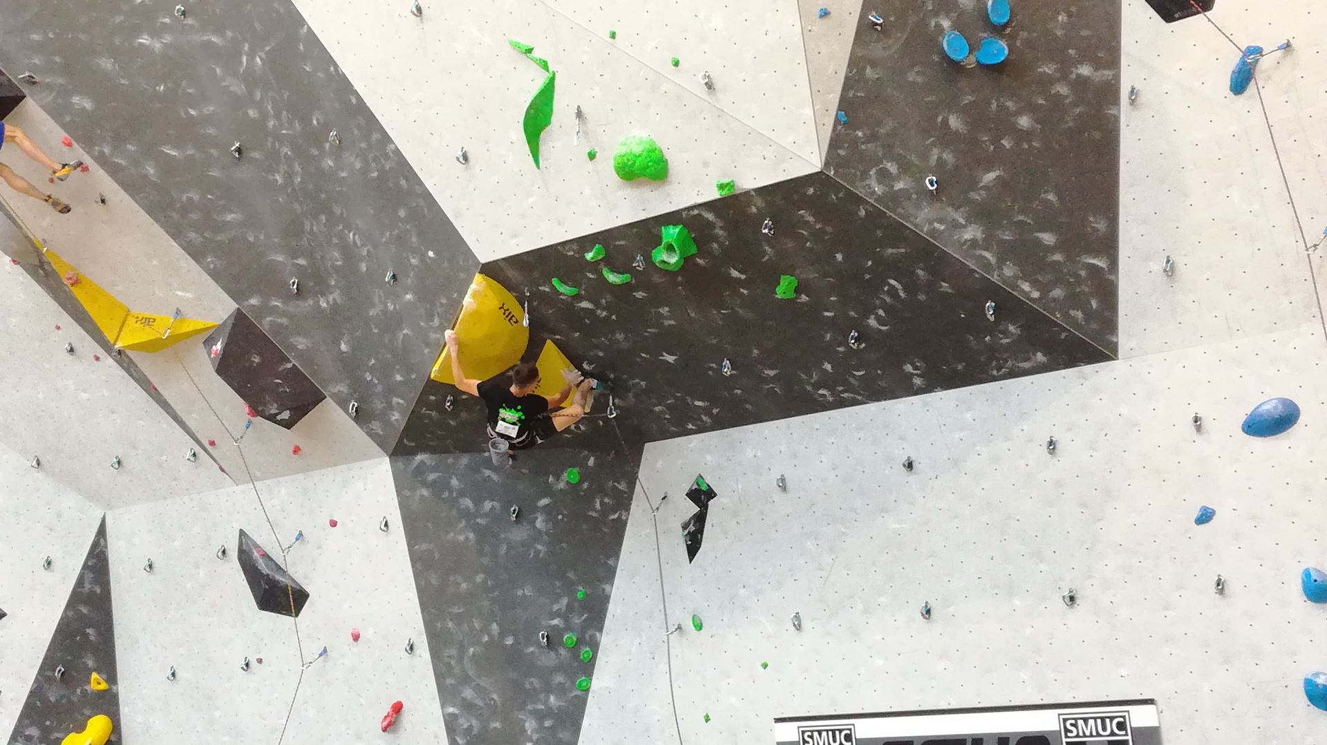 Dimanche matin, place aux demi-finales dès l’aurore (ou presque). Bastien est le premier de nos jeunes à s’élancer, et parvient à bien avancer dans la voie, il chute comme pas mal d’autres sur un mouvement qui le laissera aux portes de la finale, et avec le rétro classement des qualifs, il finit à une belle 15° place. La compétition s’arrête là également pour Nicolas H. qui termine 23° chez les juniors, et pour Lenny, qui rate de très très peu la qualif en finale et finit 9°. Ca passe en revanche pour Nicolas I., Prune et Jules qui tope tranquille sa voie de demi.