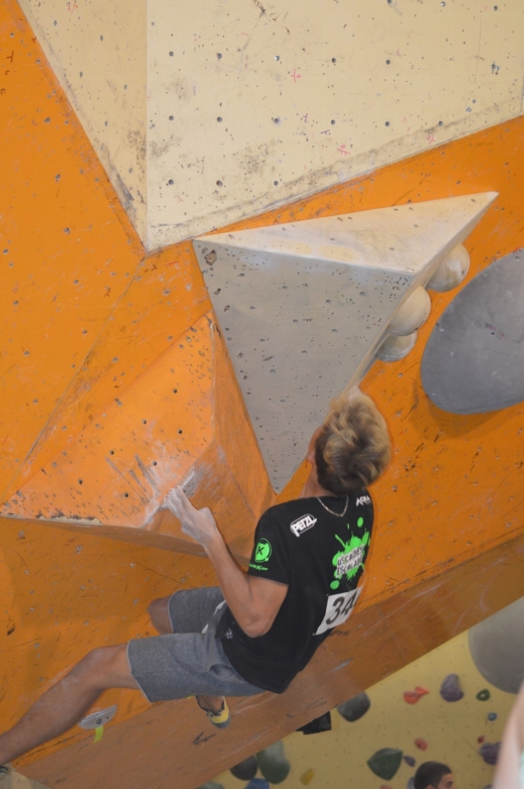 Il a plus de mal dans le deuxième bloc avec un jeté sur une prise sans