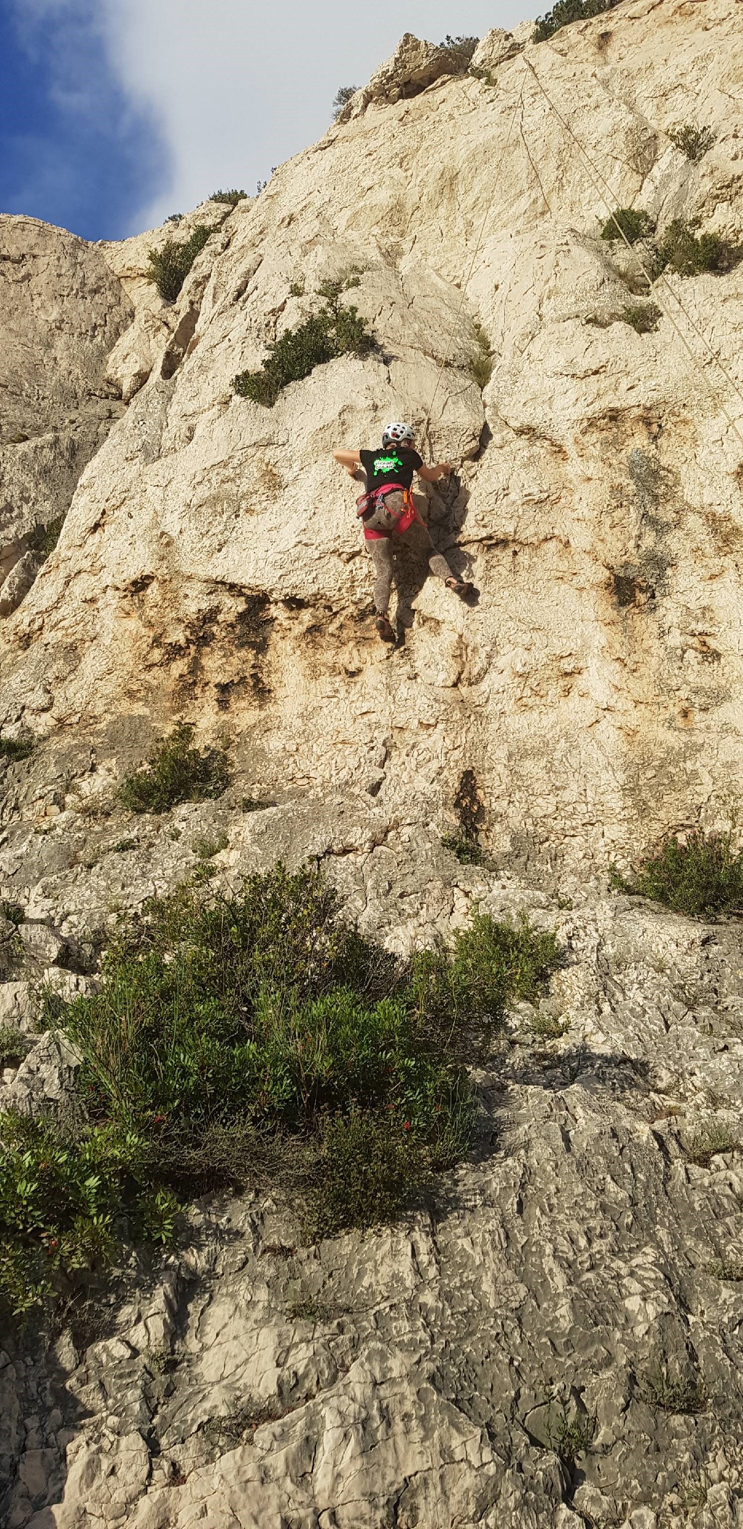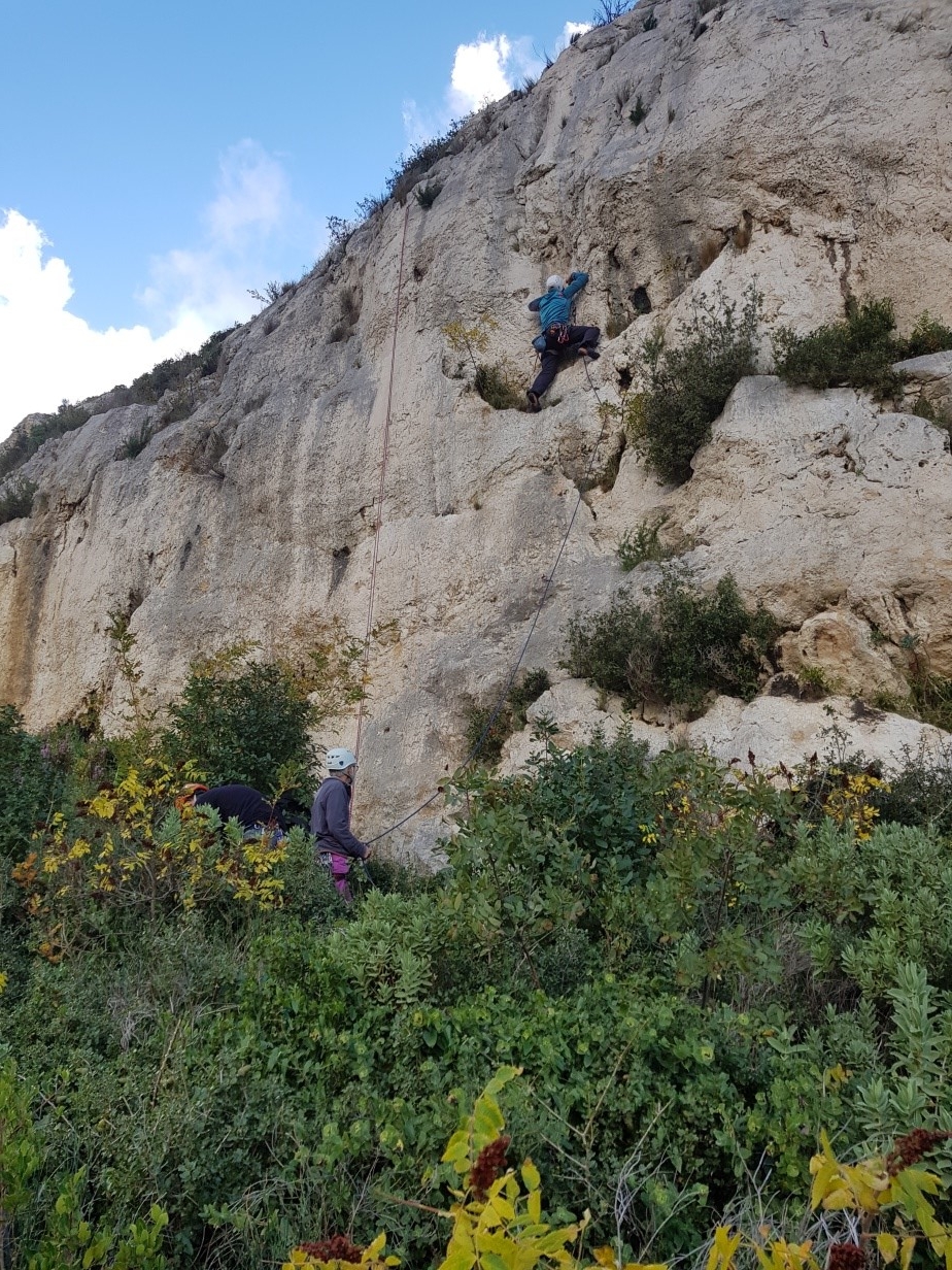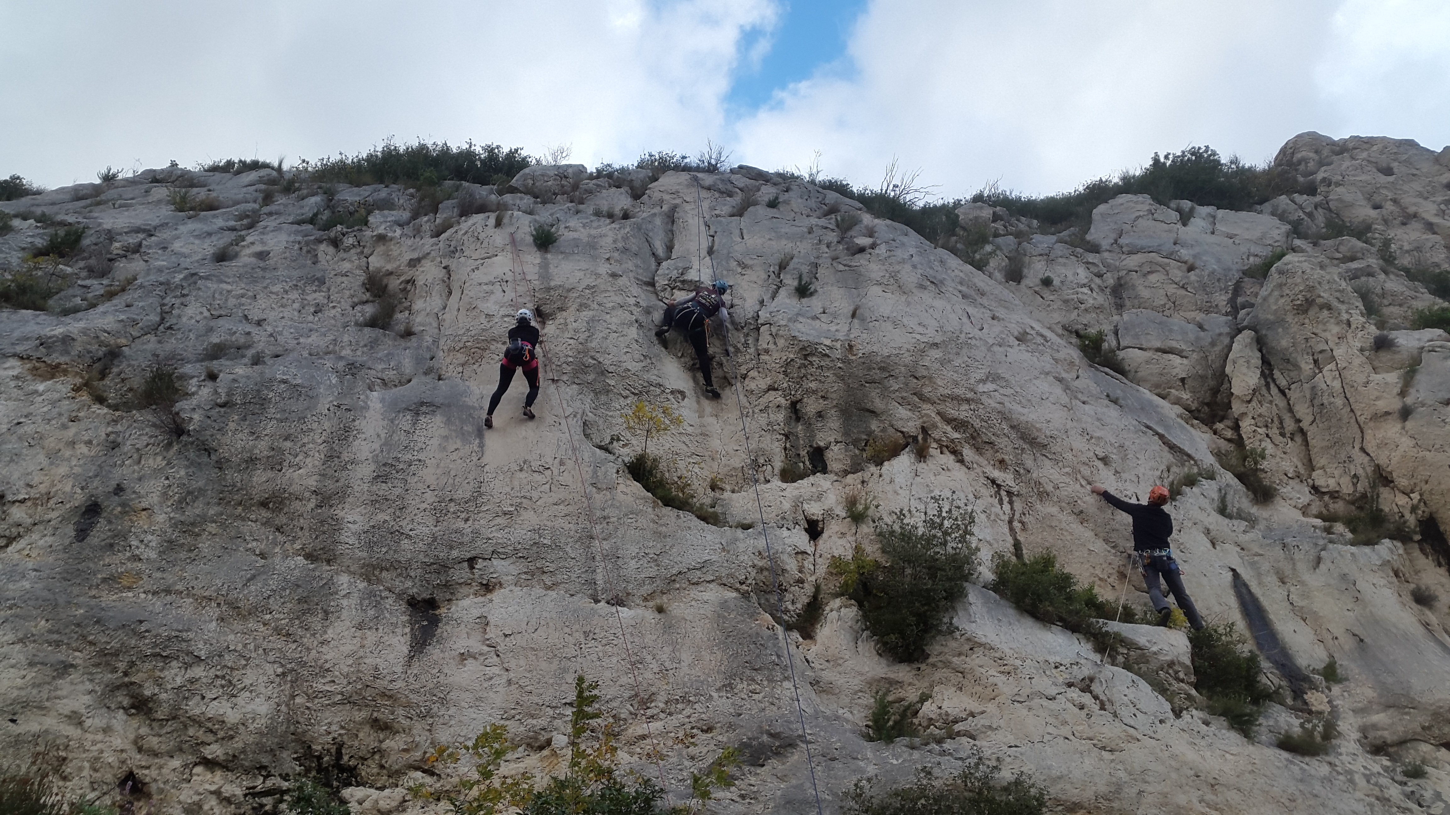 Après quelques consignes de sécurité et révisions de la manipulation de haut de voie, nous commençons à grimper. Les 1ères voies sont un peu dures mentalement, le vent se renforce donnant à certain(e)s de mauvaises sensations, le froid n’arrangeant pas les choses. Malgré cela, l’équipe est plus motivée que jamais. A gauche, des voies de 20m pour s’échauffer (légèrement mouillées à certains endroits). Doubles longueurs pour Hélène et Jérémy profitant ainsi du panorama Marseillais à son sommet. Plus à droite des voies de 35m pour prendre de la verticalité avec des niveaux abordables à tous et une tenue de prises très bonne (de 5a à 5c). La voie classique du secteur est réalisée « Les SNIP ». Heureusement, l’intensité du vent diminue  après une heure de grimpe.