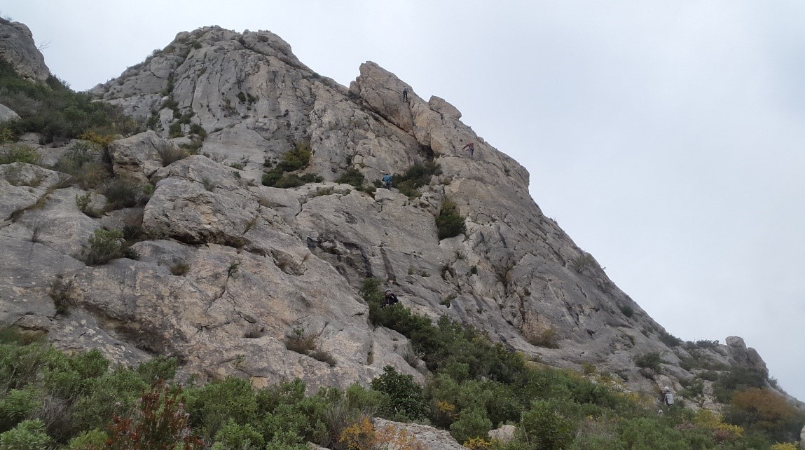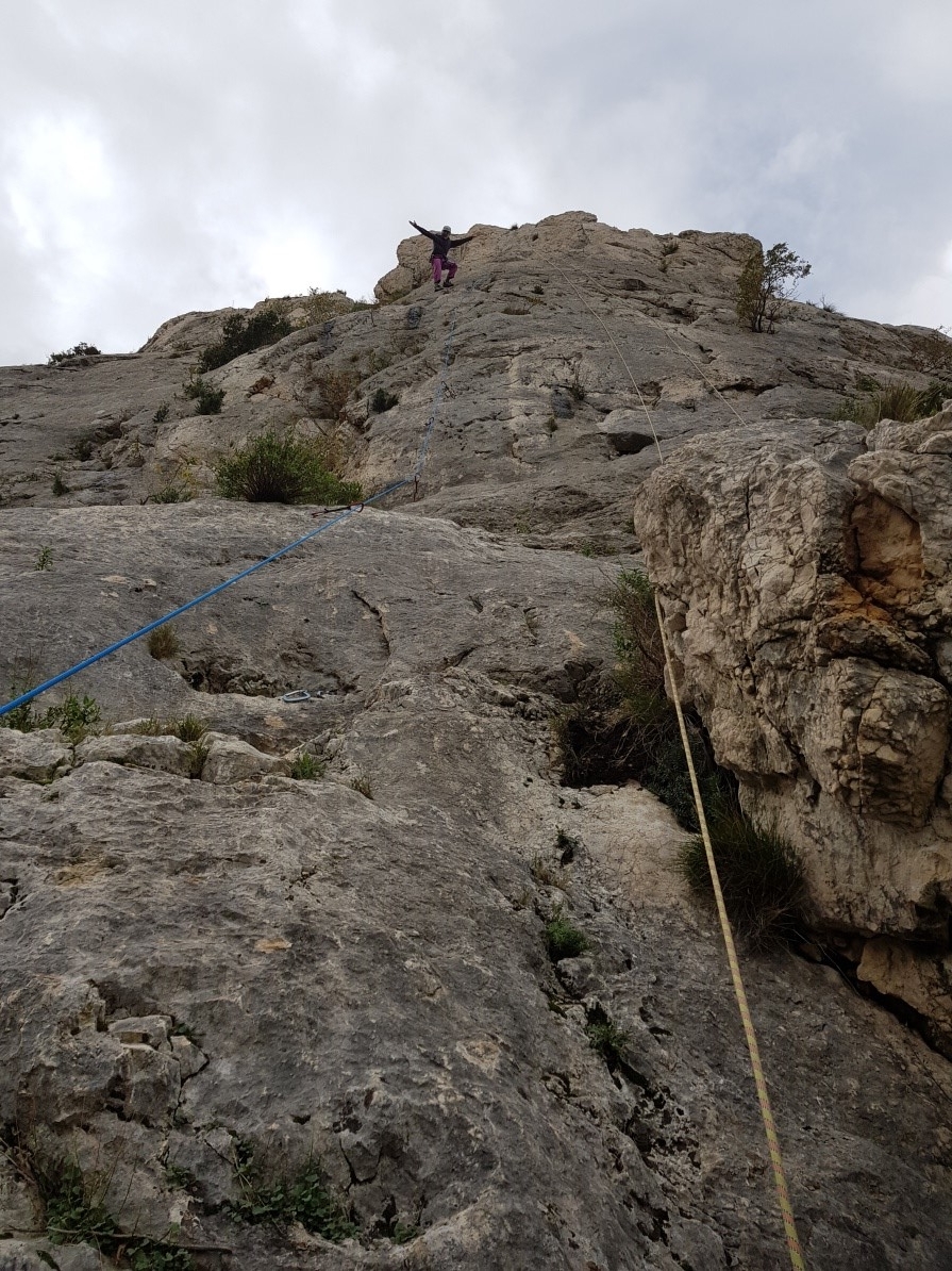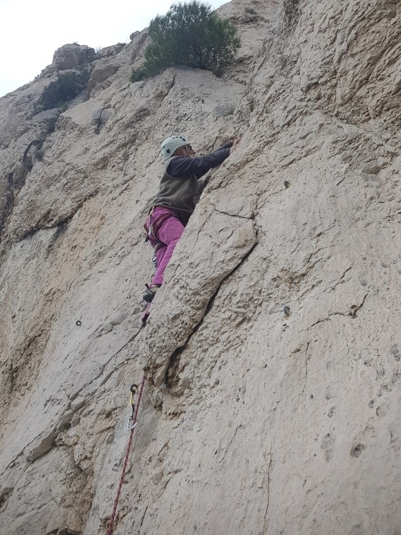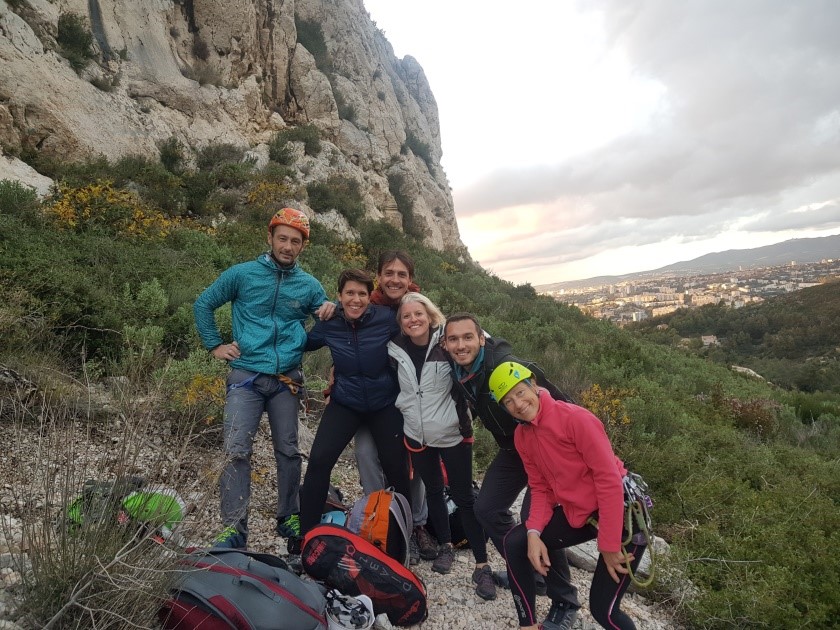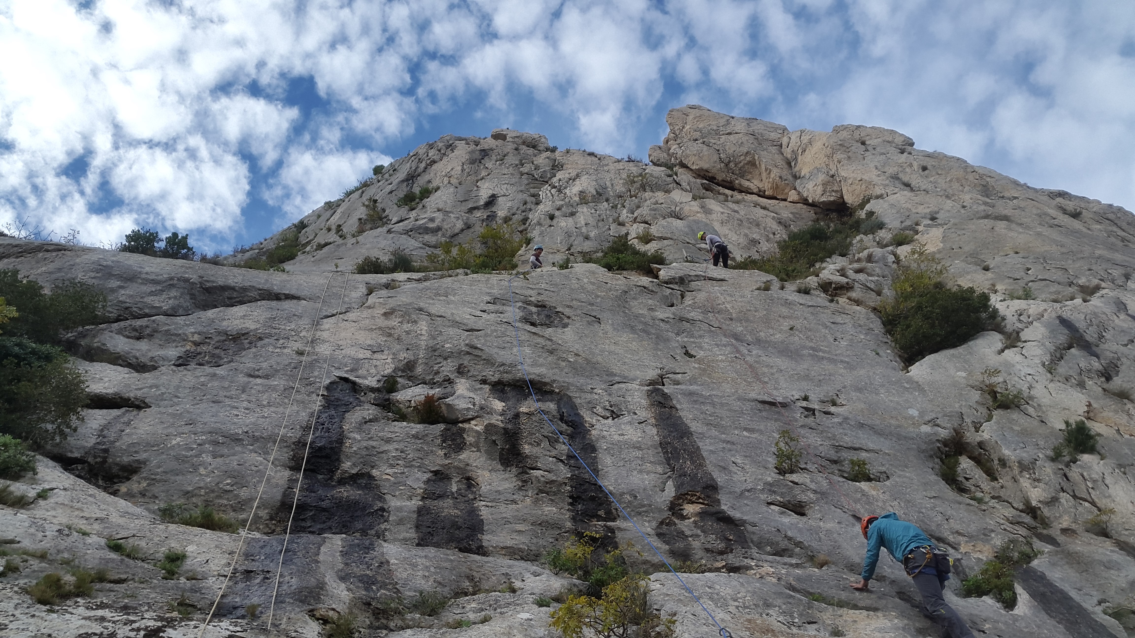 Après quelques consignes de sécurité et révisions de la manipulation de haut de voie, nous commençons à grimper. Les 1ères voies sont un peu dures mentalement, le vent se renforce donnant à certain(e)s de mauvaises sensations, le froid n’arrangeant pas les choses. Malgré cela, l’équipe est plus motivée que jamais. A gauche, des voies de 20m pour s’échauffer (légèrement mouillées à certains endroits). Doubles longueurs pour Hélène et Jérémy profitant ainsi du panorama Marseillais à son sommet. Plus à droite des voies de 35m pour prendre de la verticalité avec des niveaux abordables à tous et une tenue de prises très bonne (de 5a à 5c). La voie classique du secteur est réalisée « Les SNIP ». Heureusement, l’intensité du vent diminue  après une heure de grimpe.