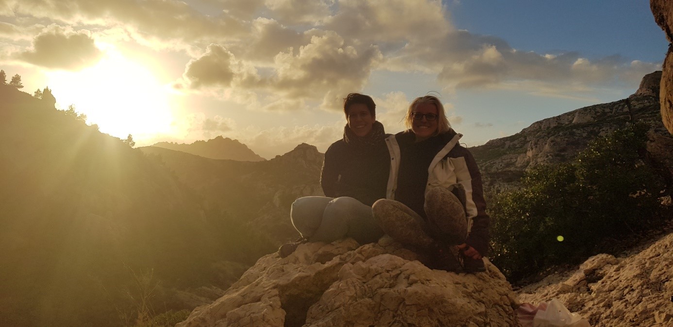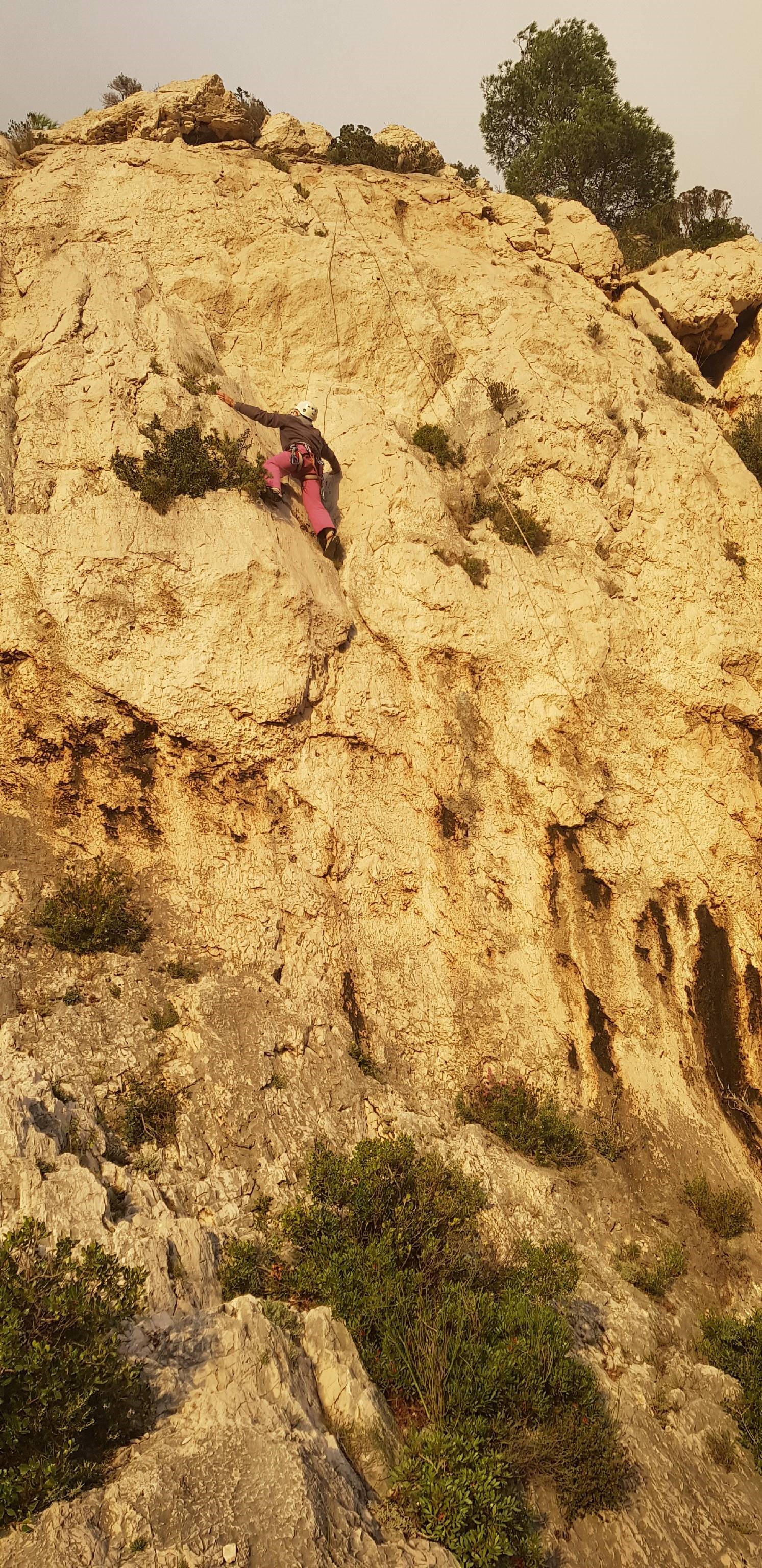 2e jour : Le réveil est pour certain(e)s difficile et d’autres un peu moins. Le physique endolori par le 1er jour de grimpe, nous nous dirigeons vers les Goudes et plus exactement à l’escalier des géants, un site cette fois-ci à l’abri du vent d’Est et ensoleillé au gré de la journée. Les voies sont un peu plus patinées sur les départs mais restent tout de même de bonne qualité pour se faire plaisir.