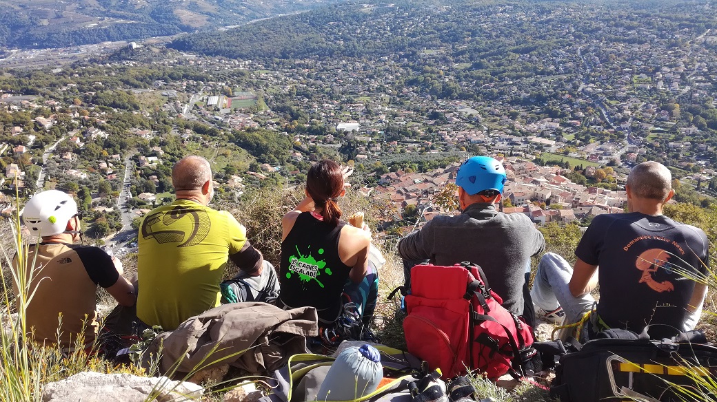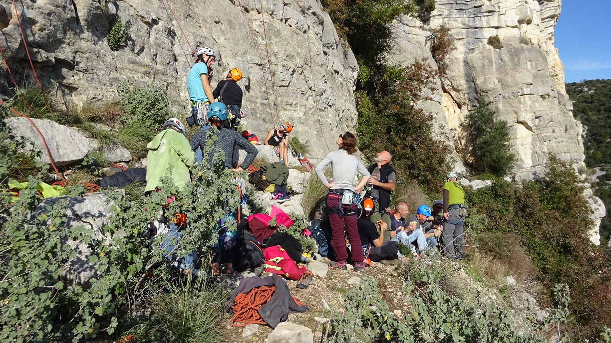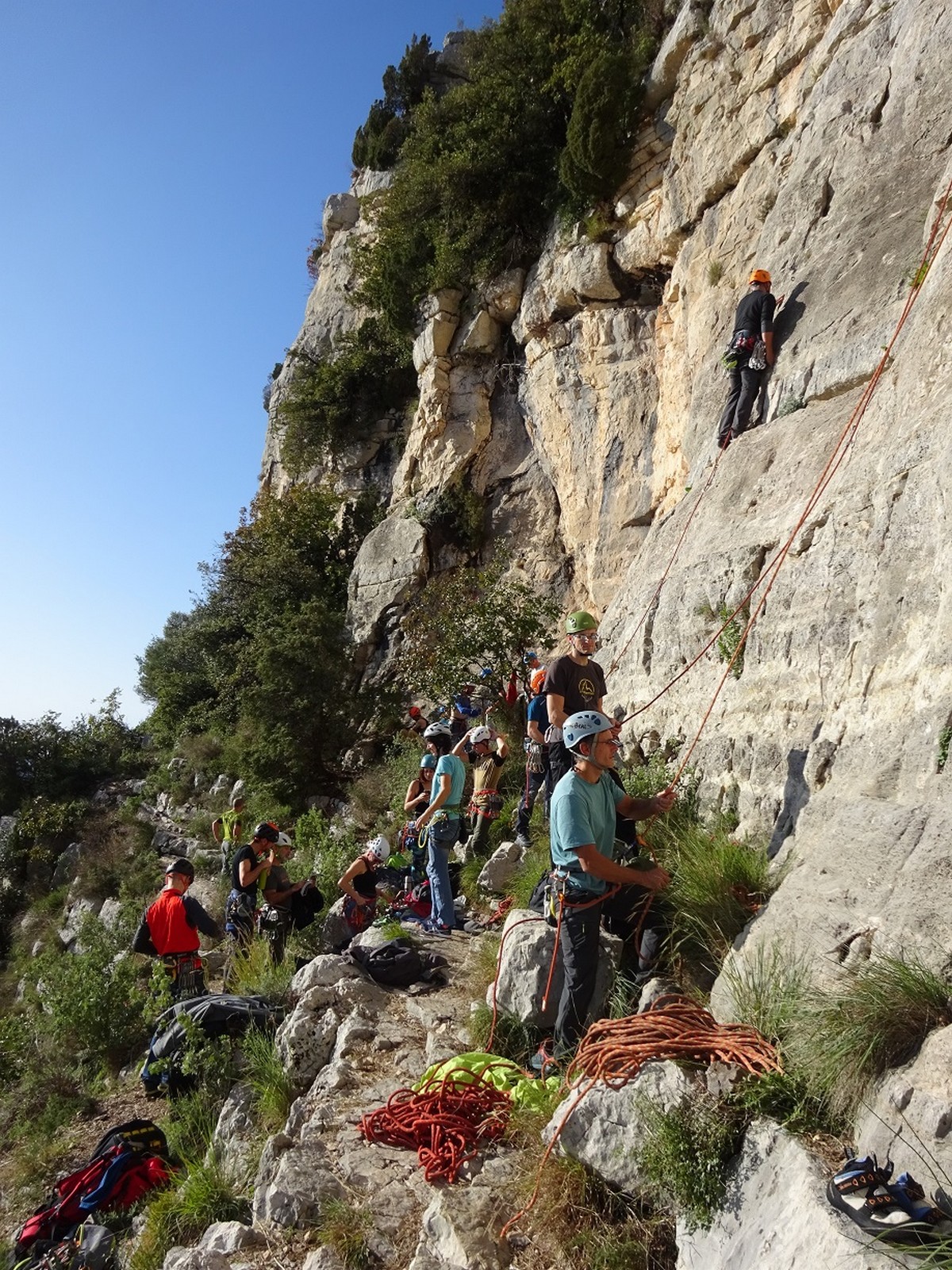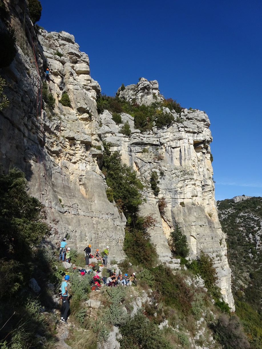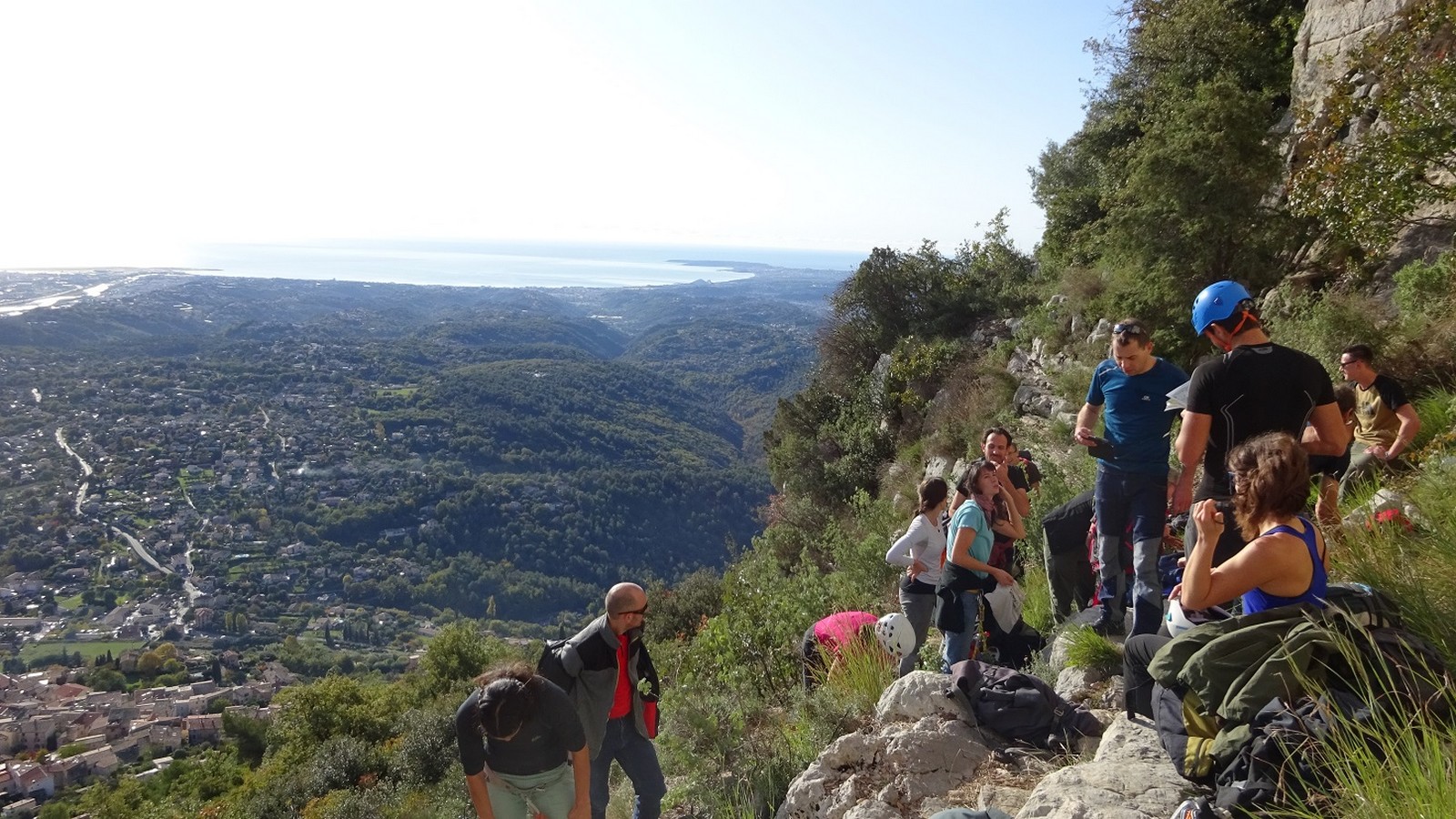 Ils sont donc 23 (!) à avoir répondu présent. Et si ça continue comme ça, ça va devenir compliqué de trouver des sites assez grands ! Après distribution du matériel  au parking, c’est parti pour la marche d’approche bien raide qui étirera le groupe sur une bonne distance. Mais à chacun son rythme et tout le monde finit par arriver en sueur mais radieux au pied du premier ressaut, secteur de la salle à manger. Évidemment, nous sommes seuls, il n’y a pas souvent légion ici. La vue sur St Jeannet et la côte est imprenable et il ne manque qu’une vision de la Corse pour parfaire le panorama. Il fait beau, il fait bon, nous sommes en t-shirt !