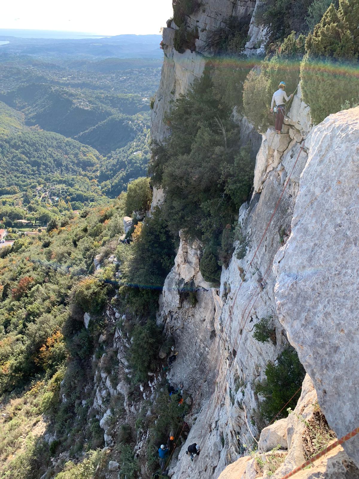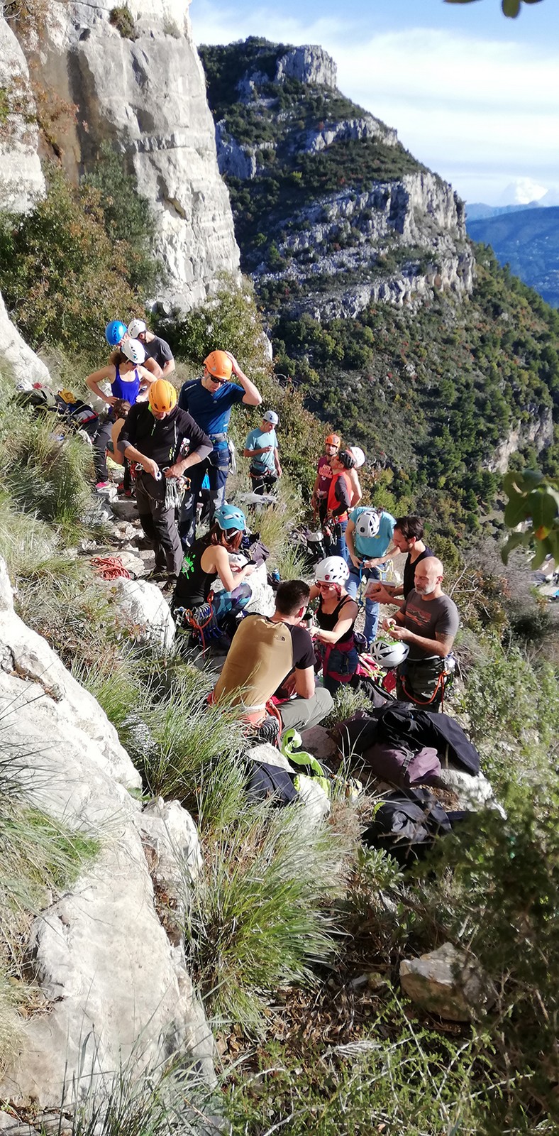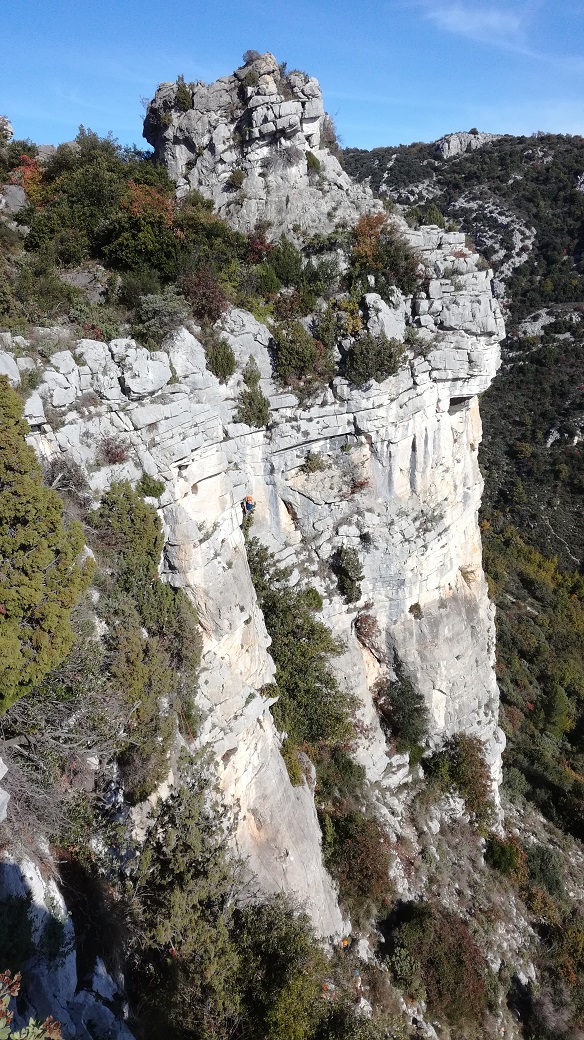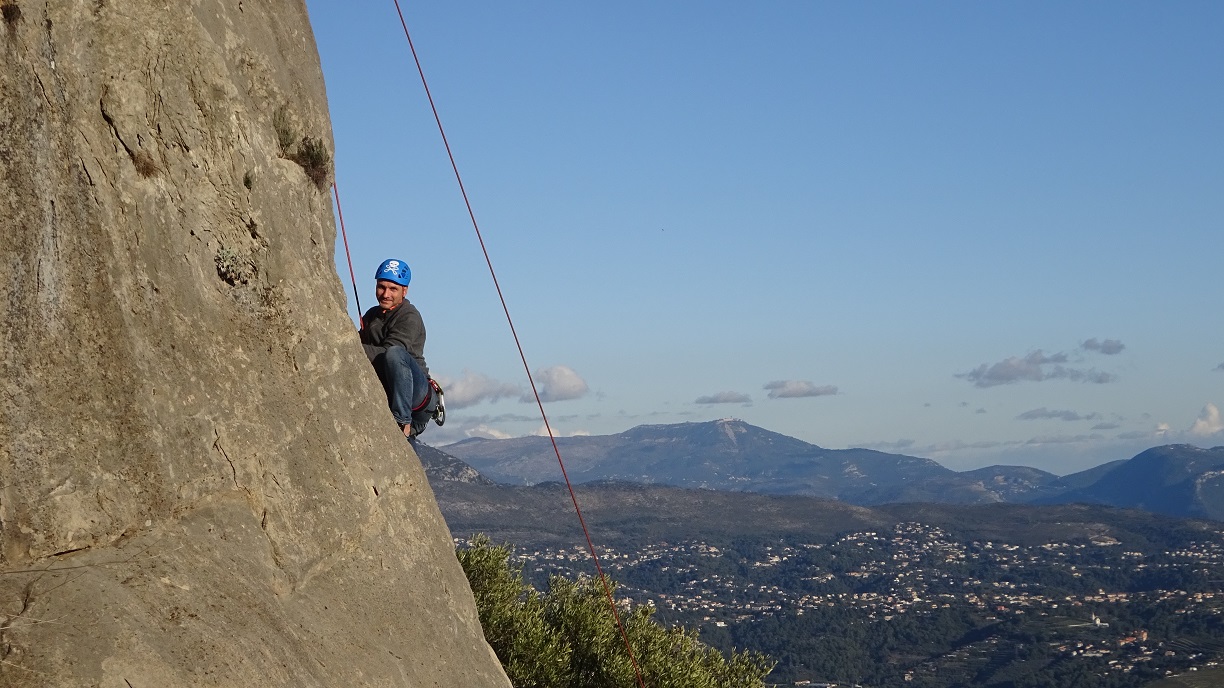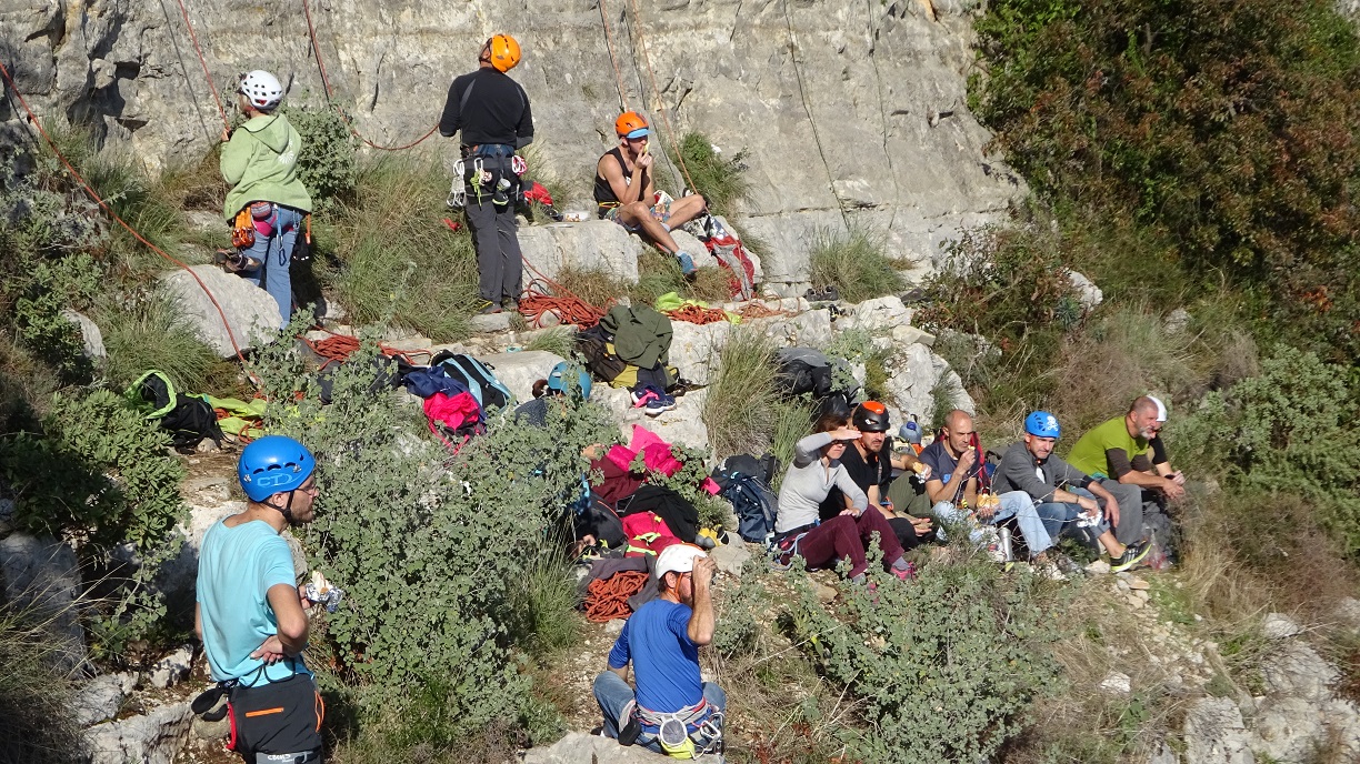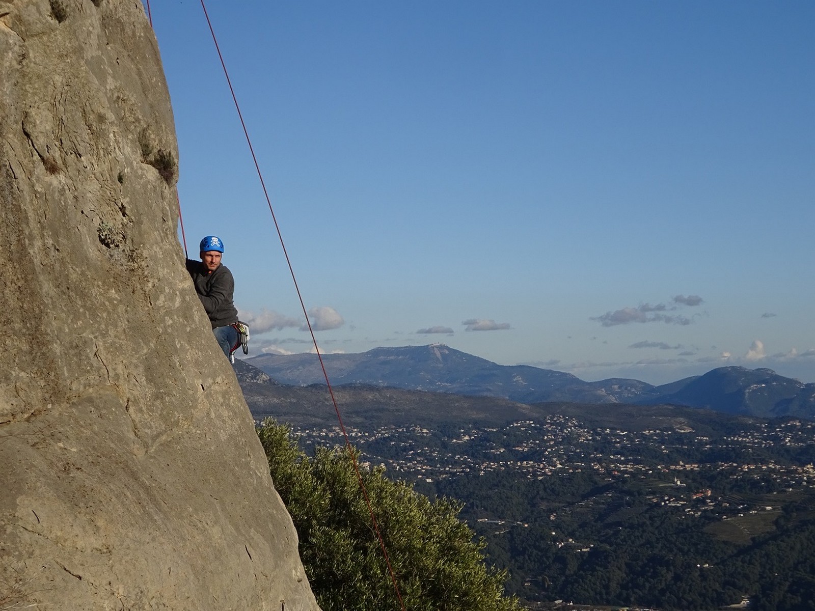 Ils sont donc 23 (!) à avoir répondu présent. Et si ça continue comme ça, ça va devenir compliqué de trouver des sites assez grands ! Après distribution du matériel  au parking, c’est parti pour la marche d’approche bien raide qui étirera le groupe sur une bonne distance. Mais à chacun son rythme et tout le monde finit par arriver en sueur mais radieux au pied du premier ressaut, secteur de la salle à manger. Évidemment, nous sommes seuls, il n’y a pas souvent légion ici. La vue sur St Jeannet et la côte est imprenable et il ne manque qu’une vision de la Corse pour parfaire le panorama. Il fait beau, il fait bon, nous sommes en t-shirt !