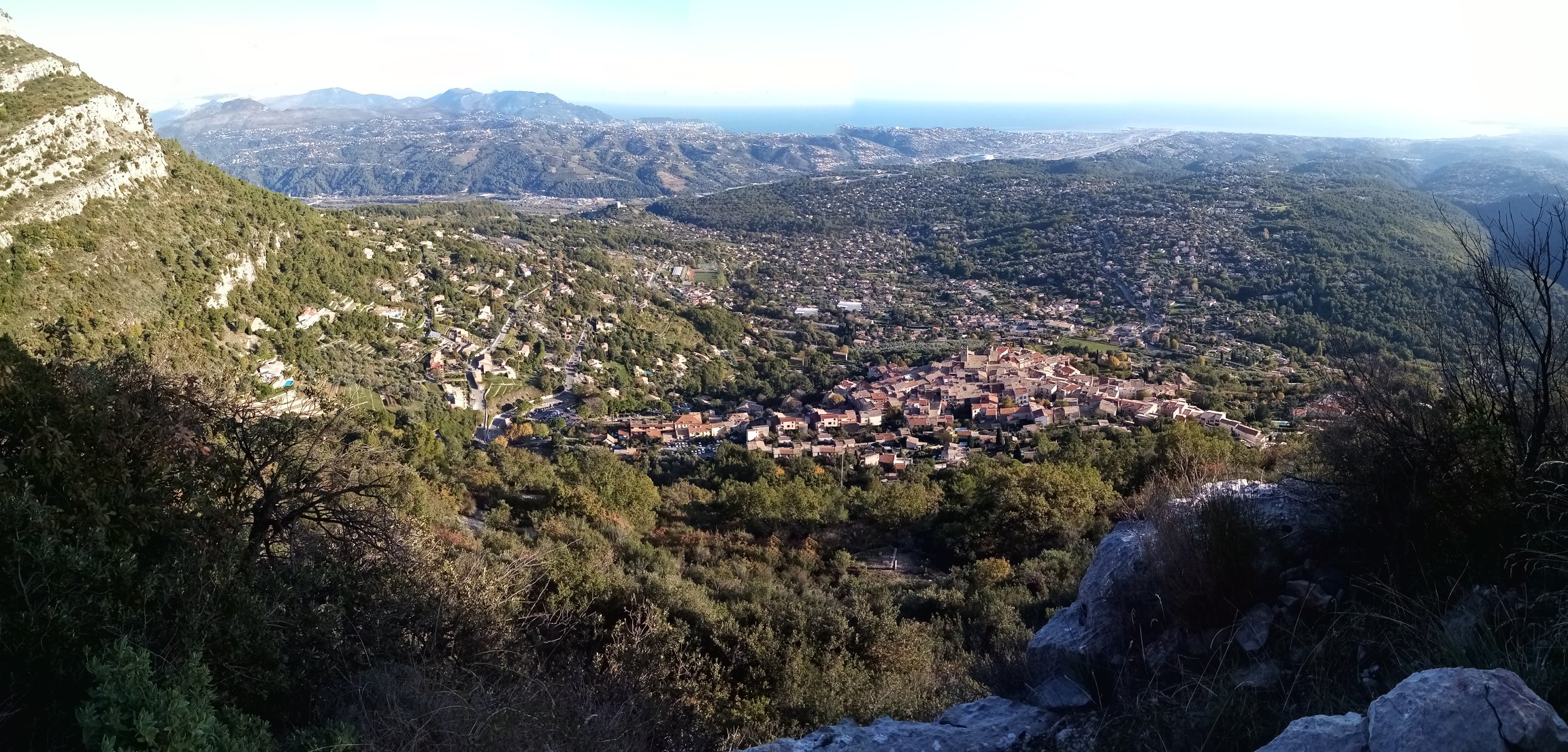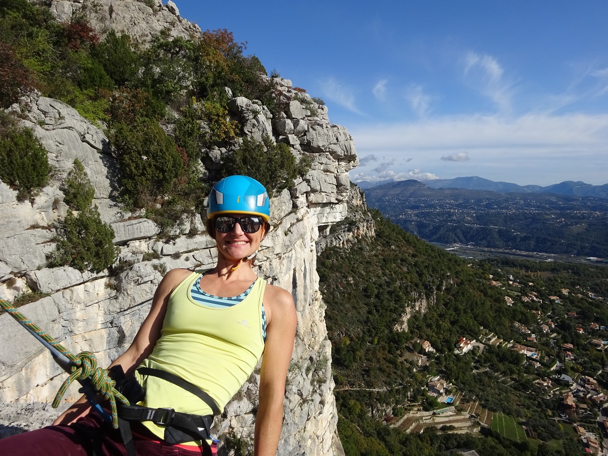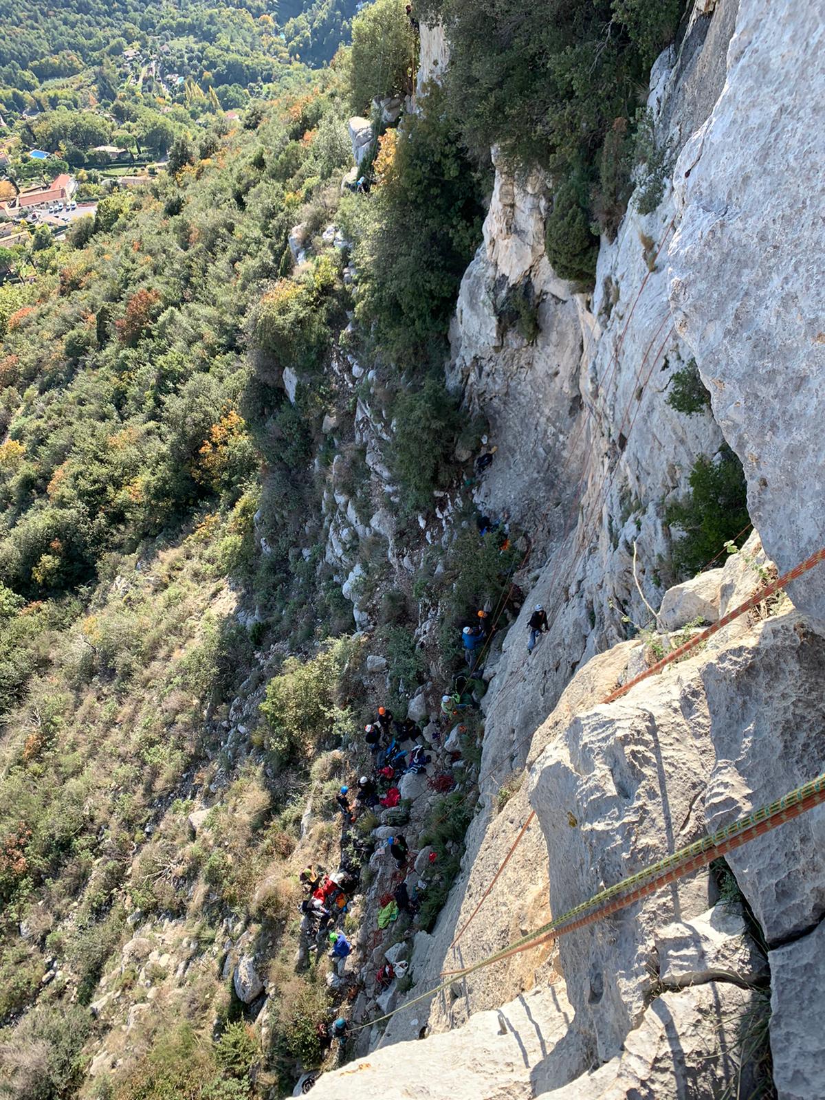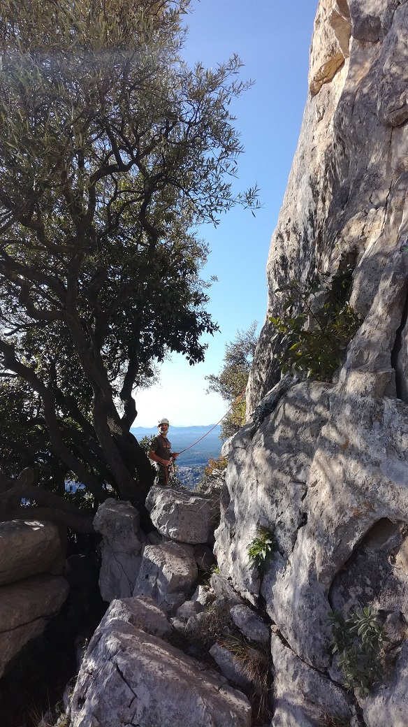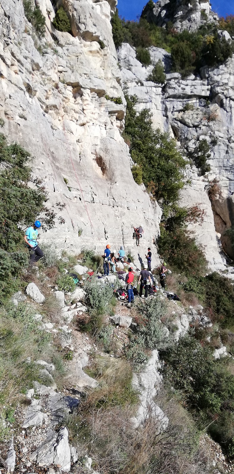 Ils sont donc 23 (!) à avoir répondu présent. Et si ça continue comme ça, ça va devenir compliqué de trouver des sites assez grands ! Après distribution du matériel  au parking, c’est parti pour la marche d’approche bien raide qui étirera le groupe sur une bonne distance. Mais à chacun son rythme et tout le monde finit par arriver en sueur mais radieux au pied du premier ressaut, secteur de la salle à manger. Évidemment, nous sommes seuls, il n’y a pas souvent légion ici. La vue sur St Jeannet et la côte est imprenable et il ne manque qu’une vision de la Corse pour parfaire le panorama. Il fait beau, il fait bon, nous sommes en t-shirt !