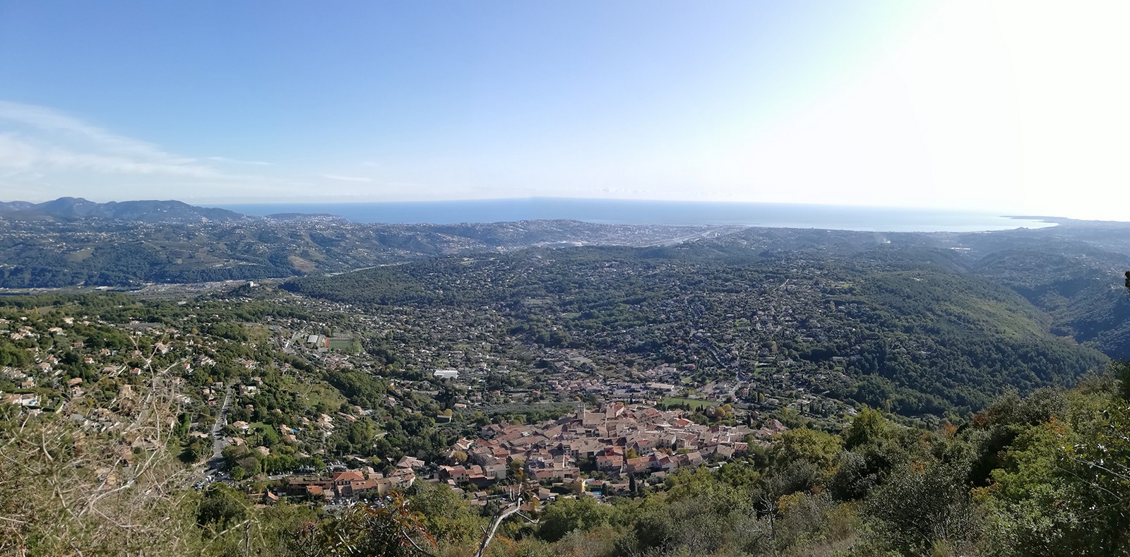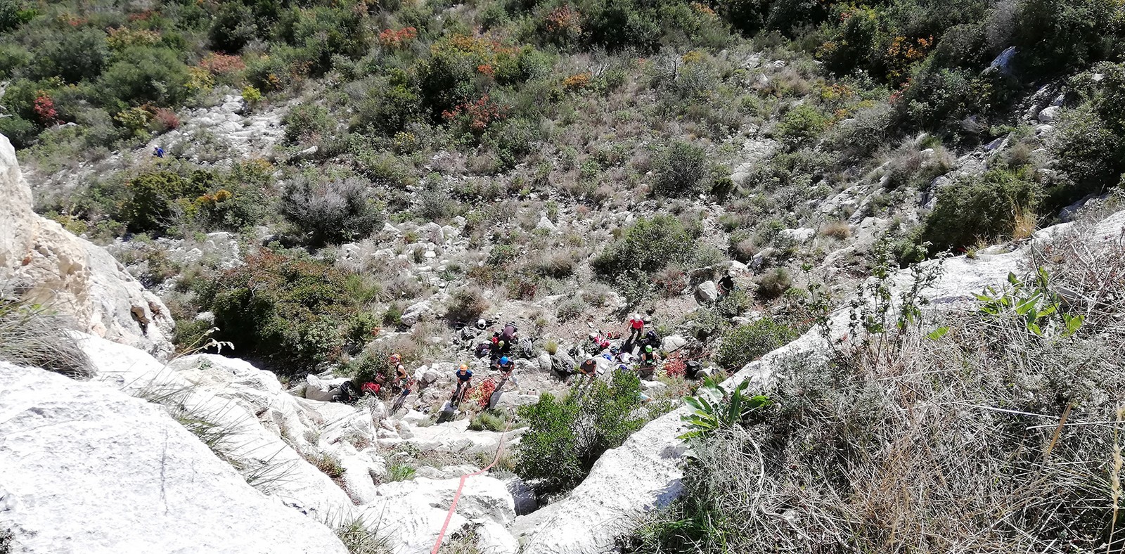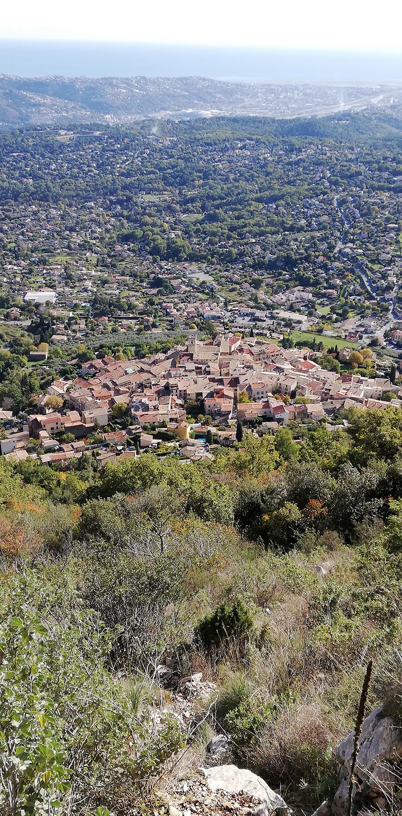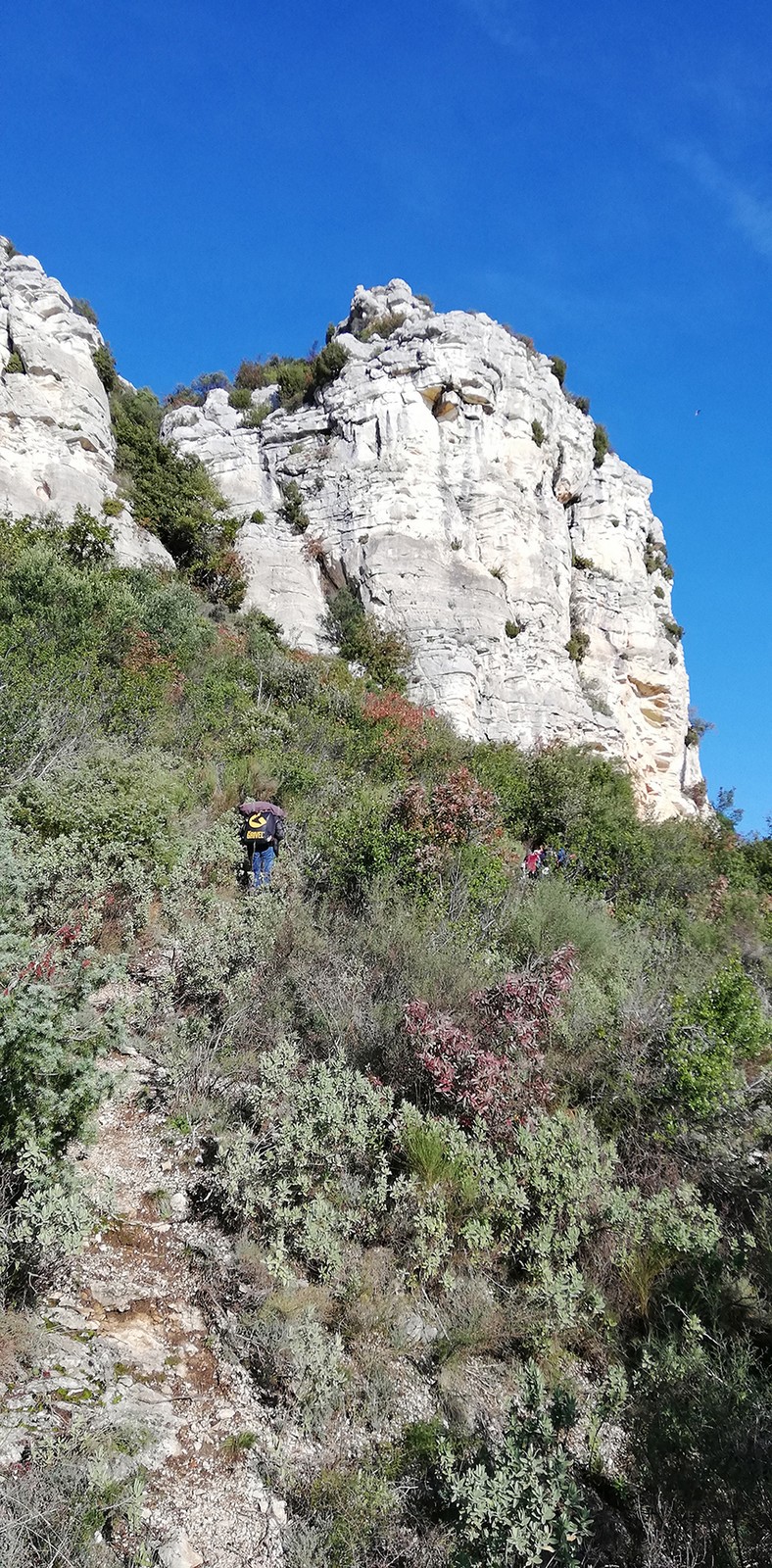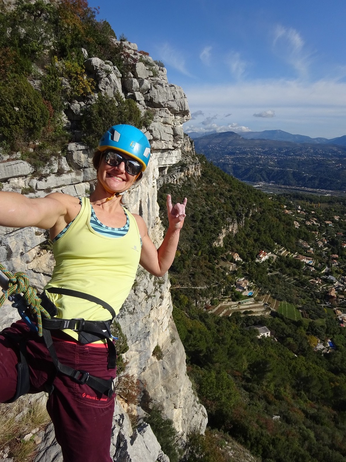 Ils sont donc 23 (!) à avoir répondu présent. Et si ça continue comme ça, ça va devenir compliqué de trouver des sites assez grands ! Après distribution du matériel  au parking, c’est parti pour la marche d’approche bien raide qui étirera le groupe sur une bonne distance. Mais à chacun son rythme et tout le monde finit par arriver en sueur mais radieux au pied du premier ressaut, secteur de la salle à manger. Évidemment, nous sommes seuls, il n’y a pas souvent légion ici. La vue sur St Jeannet et la côte est imprenable et il ne manque qu’une vision de la Corse pour parfaire le panorama. Il fait beau, il fait bon, nous sommes en t-shirt !