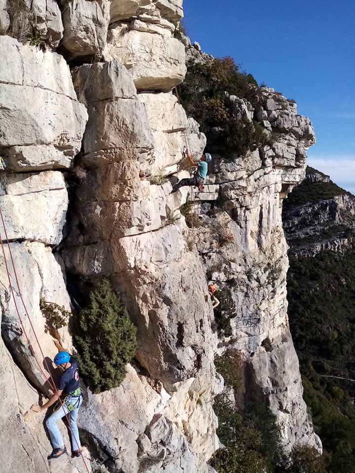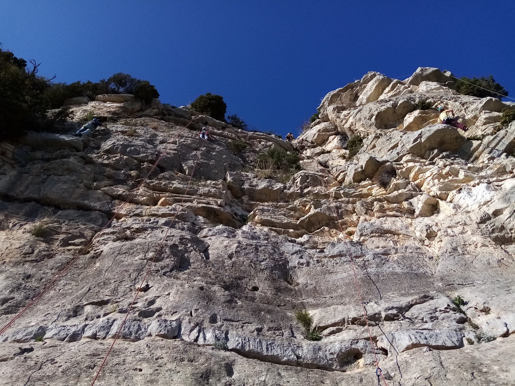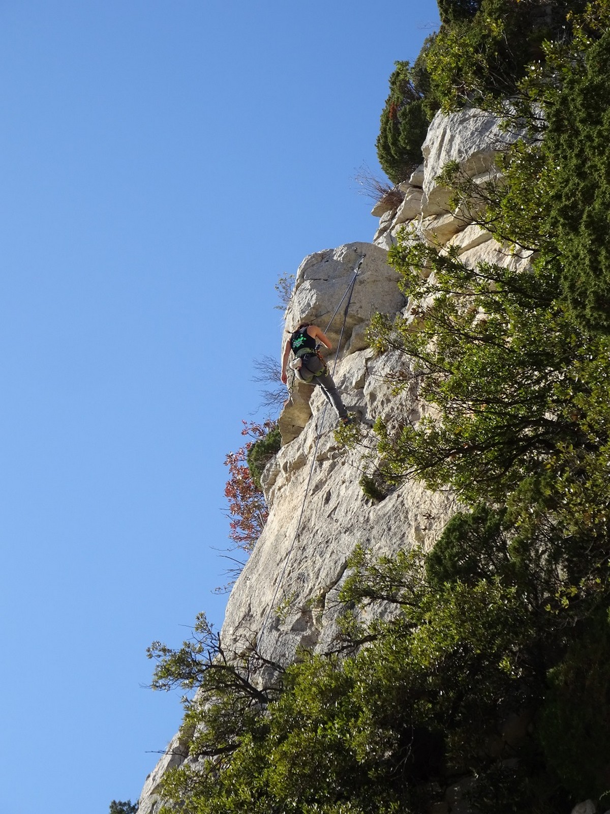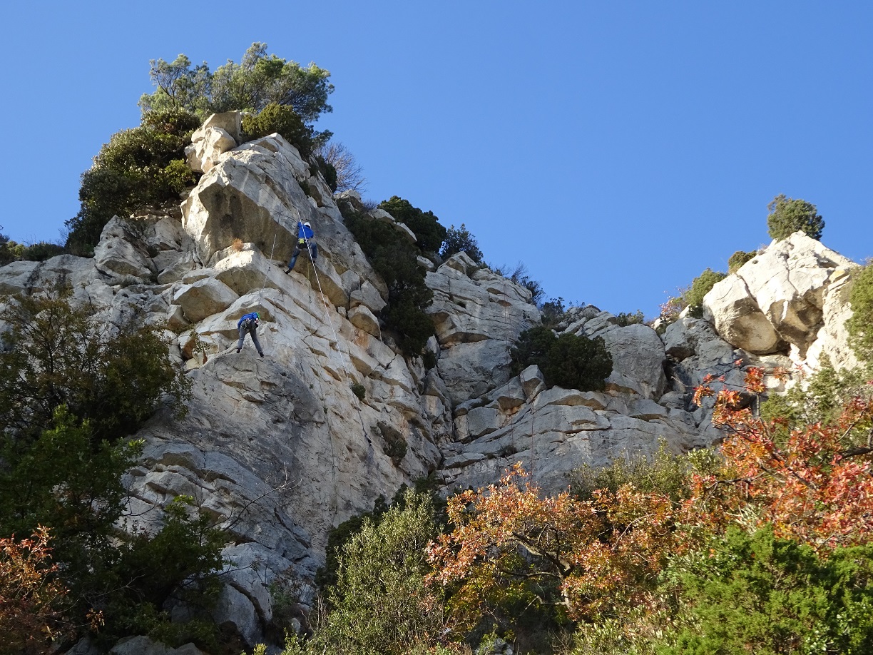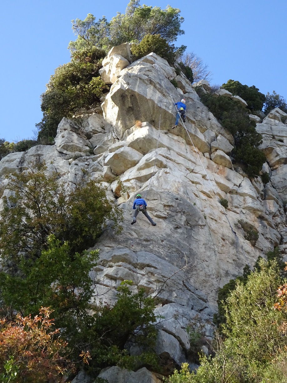 Et c’est reparti de plus belle en après-midi, avec un petit groupe qui se détache pour aller s’essayer dans quelques 6c/+ avec plus ou moins de succès, jusqu’à ce que le soleil nous lâche et que les doudounes sortent des sacs. Mais ce ne sera pas suffisant pour nous arrêter et c’est bien longtemps après que le froid se soit installé que nous quittons la falaise pour la redescente vers les derniers instants conviviaux au bar du village, où pressions et chocolats/cointreau achèvent sur un délice cette fantastique journée.