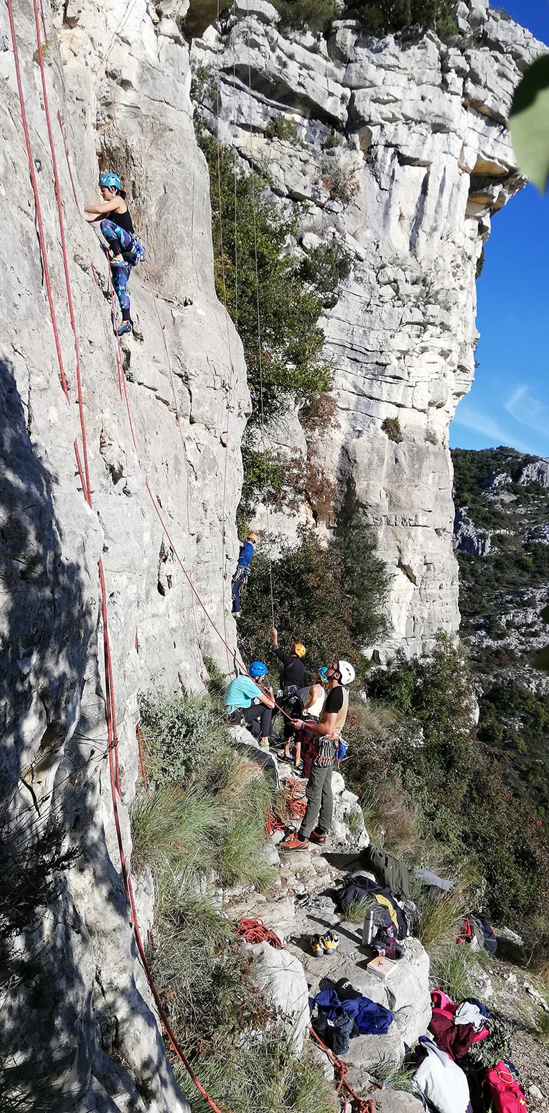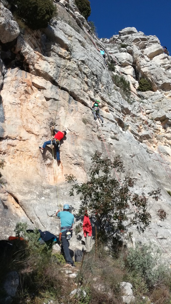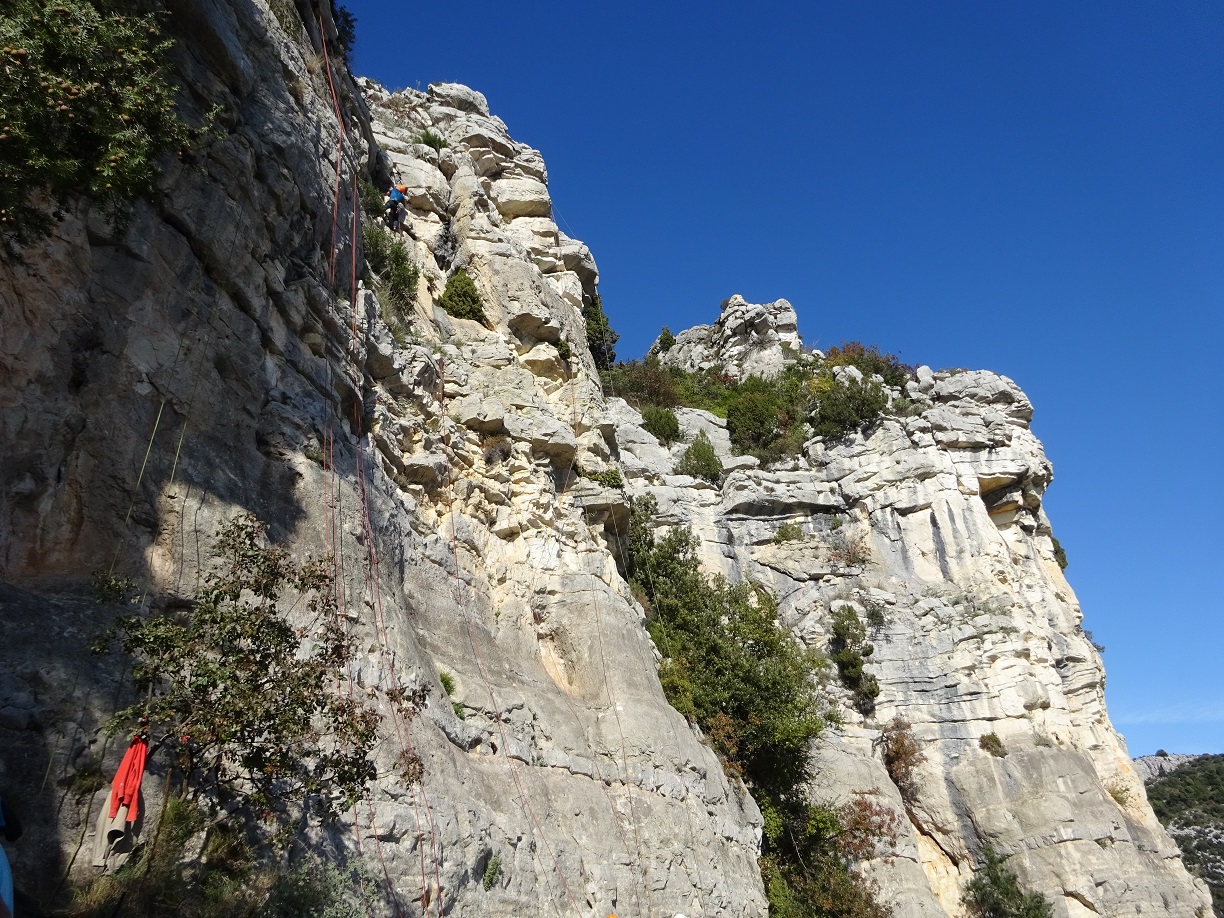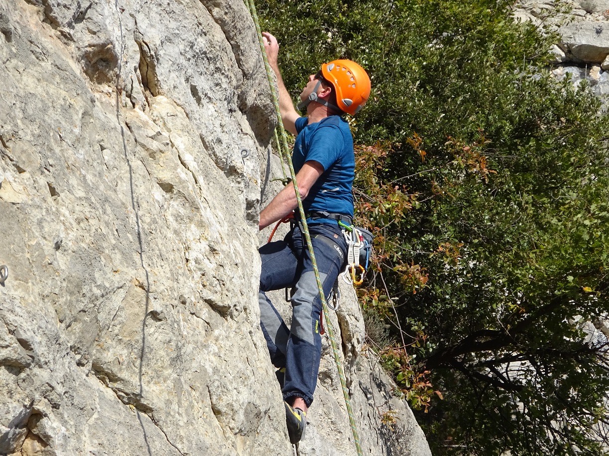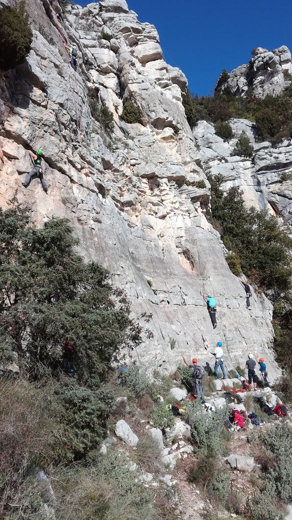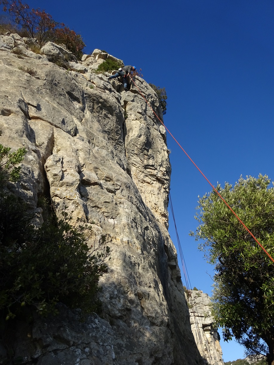 Et c’est reparti de plus belle en après-midi, avec un petit groupe qui se détache pour aller s’essayer dans quelques 6c/+ avec plus ou moins de succès, jusqu’à ce que le soleil nous lâche et que les doudounes sortent des sacs. Mais ce ne sera pas suffisant pour nous arrêter et c’est bien longtemps après que le froid se soit installé que nous quittons la falaise pour la redescente vers les derniers instants conviviaux au bar du village, où pressions et chocolats/cointreau achèvent sur un délice cette fantastique journée.