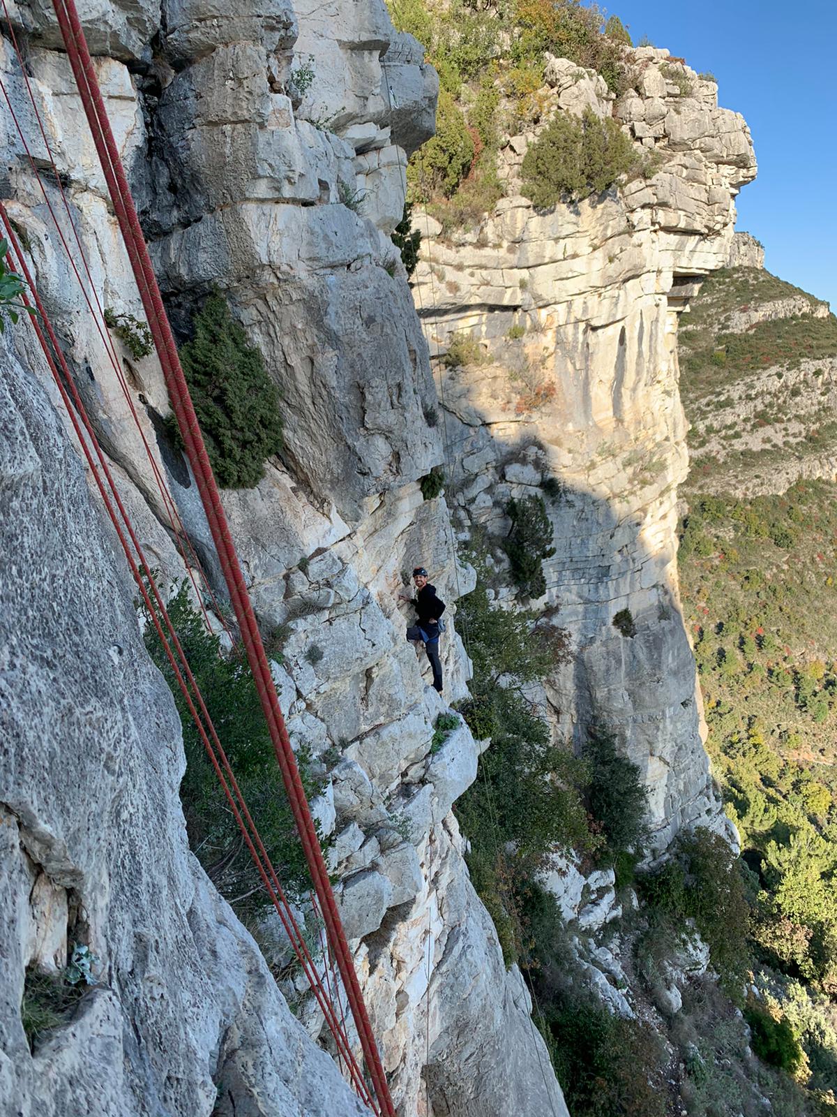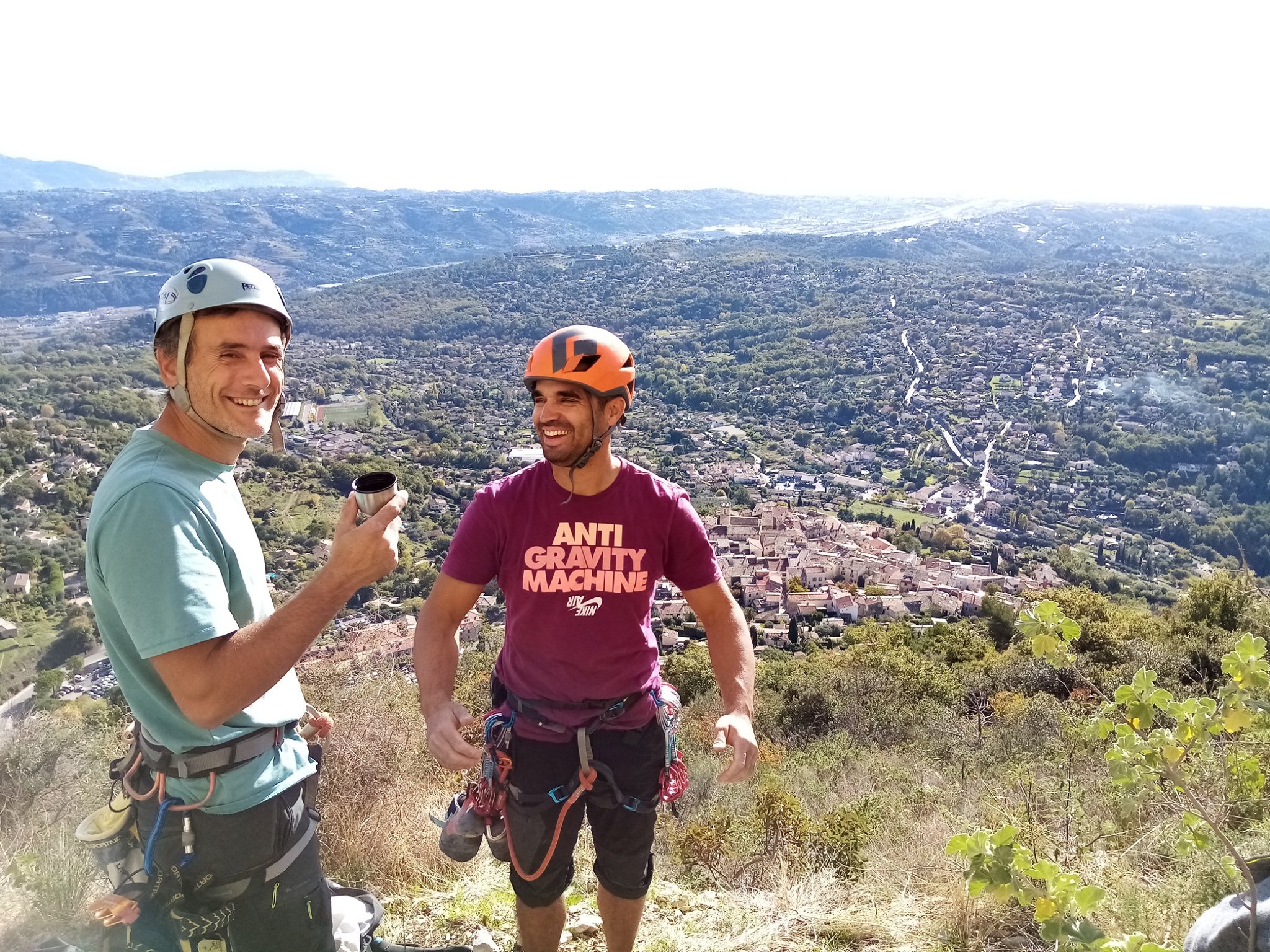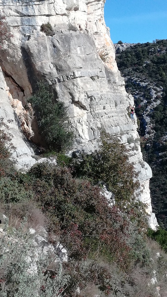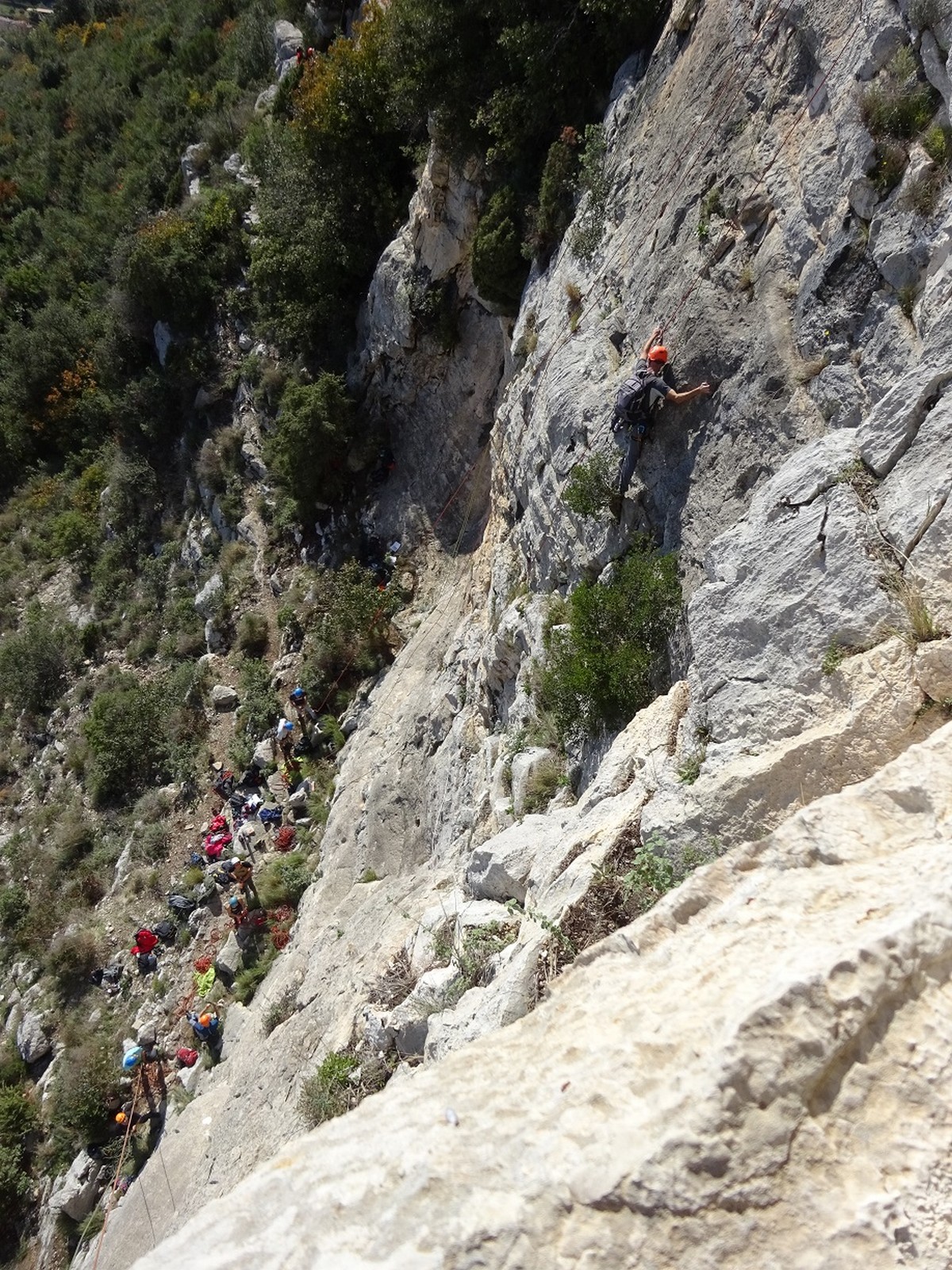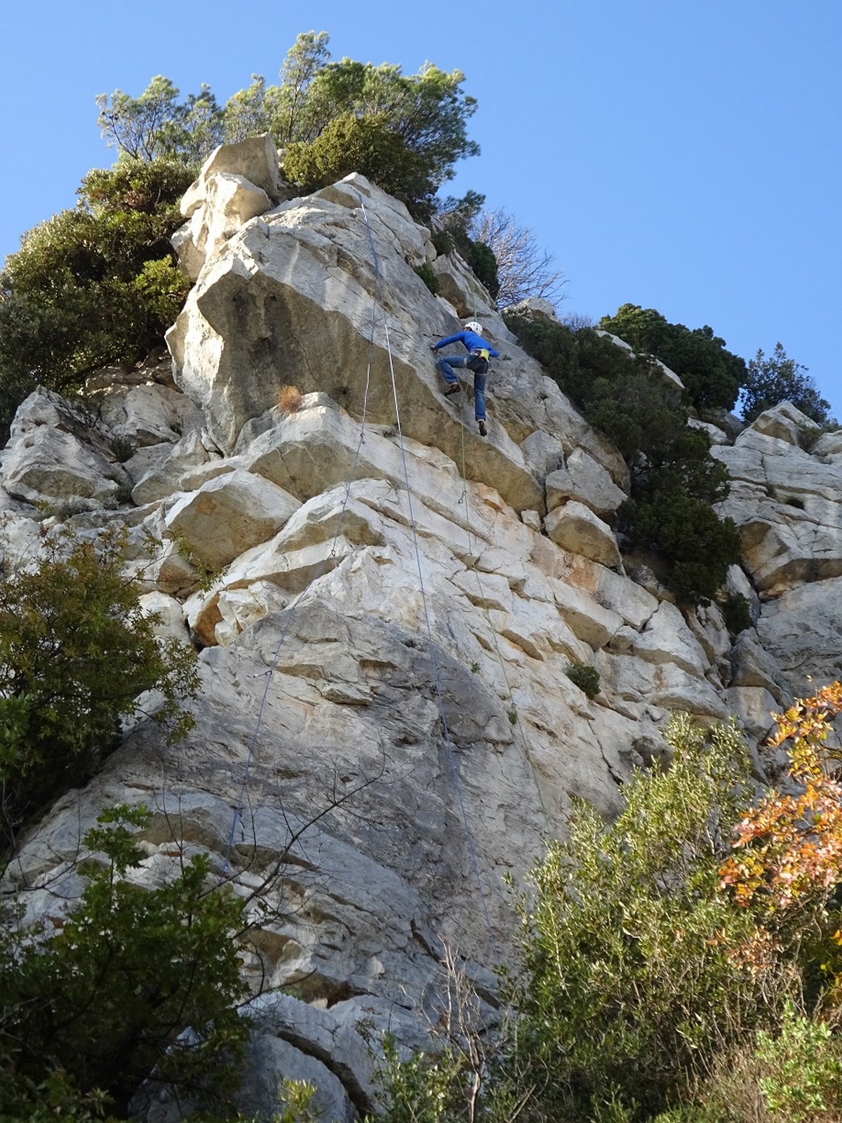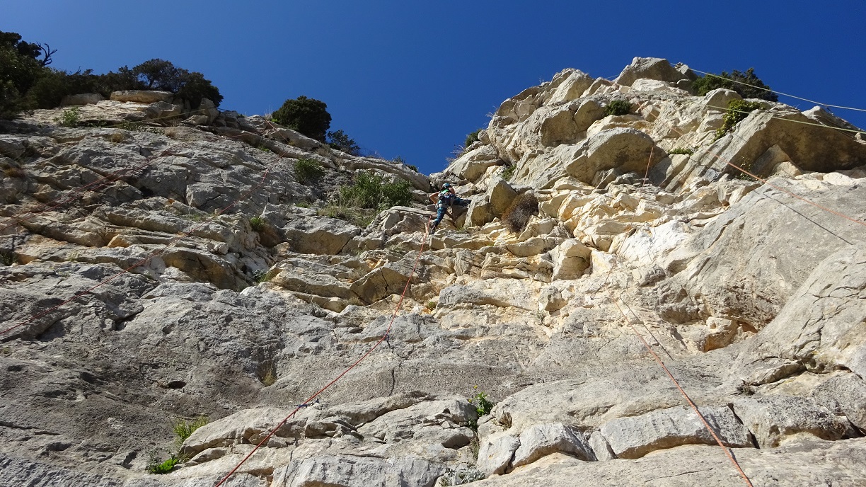 Et c’est reparti de plus belle en après-midi, avec un petit groupe qui se détache pour aller s’essayer dans quelques 6c/+ avec plus ou moins de succès, jusqu’à ce que le soleil nous lâche et que les doudounes sortent des sacs. Mais ce ne sera pas suffisant pour nous arrêter et c’est bien longtemps après que le froid se soit installé que nous quittons la falaise pour la redescente vers les derniers instants conviviaux au bar du village, où pressions et chocolats/cointreau achèvent sur un délice cette fantastique journée.
