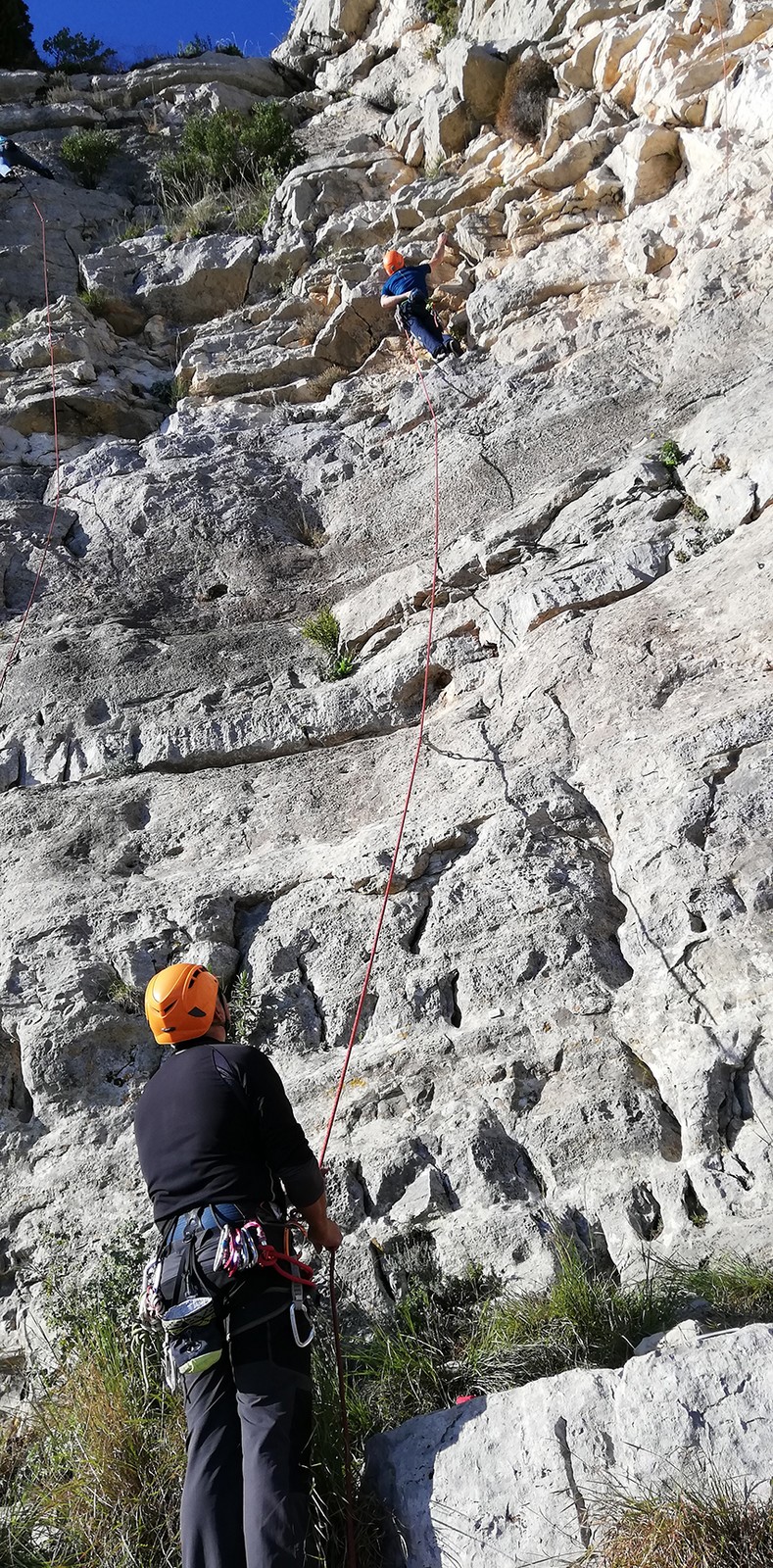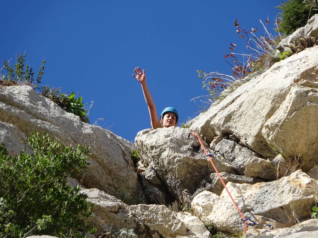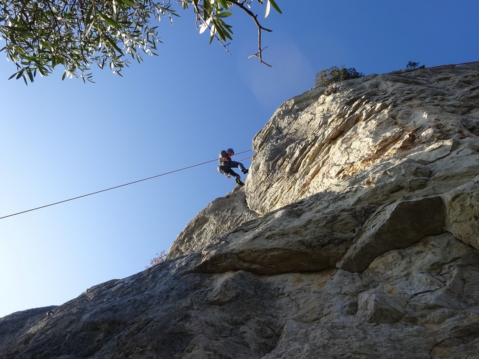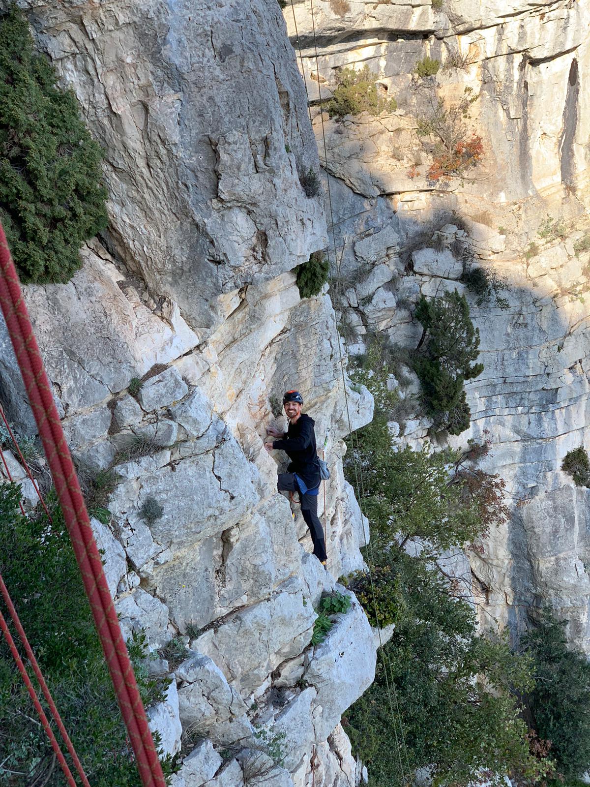 Et c’est reparti de plus belle en après-midi, avec un petit groupe qui se détache pour aller s’essayer dans quelques 6c/+ avec plus ou moins de succès, jusqu’à ce que le soleil nous lâche et que les doudounes sortent des sacs. Mais ce ne sera pas suffisant pour nous arrêter et c’est bien longtemps après que le froid se soit installé que nous quittons la falaise pour la redescente vers les derniers instants conviviaux au bar du village, où pressions et chocolats/cointreau achèvent sur un délice cette fantastique journée.