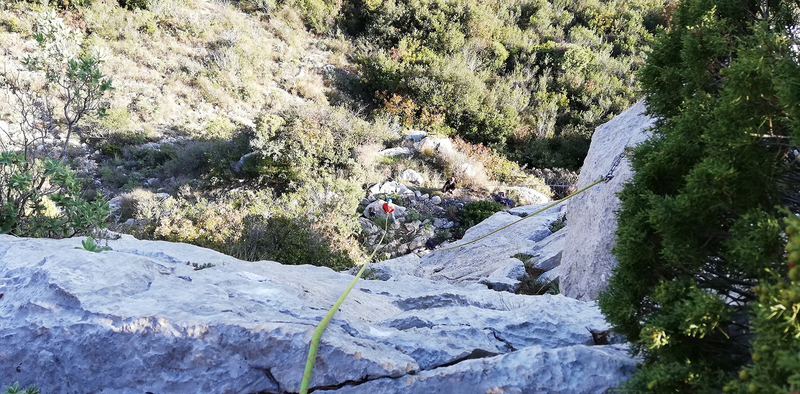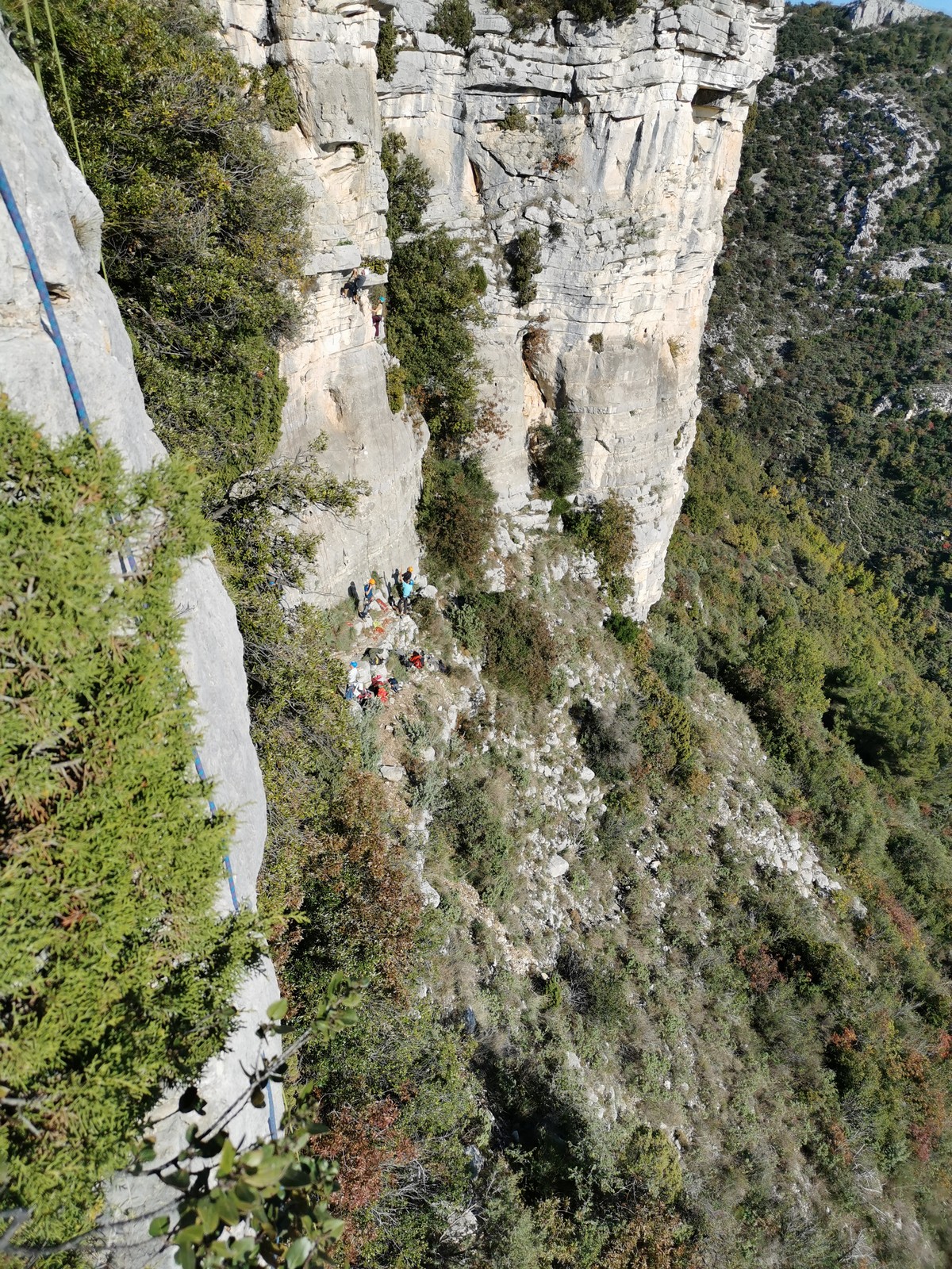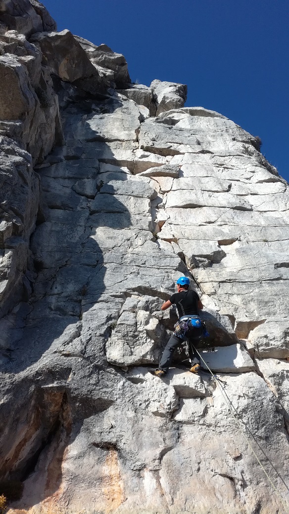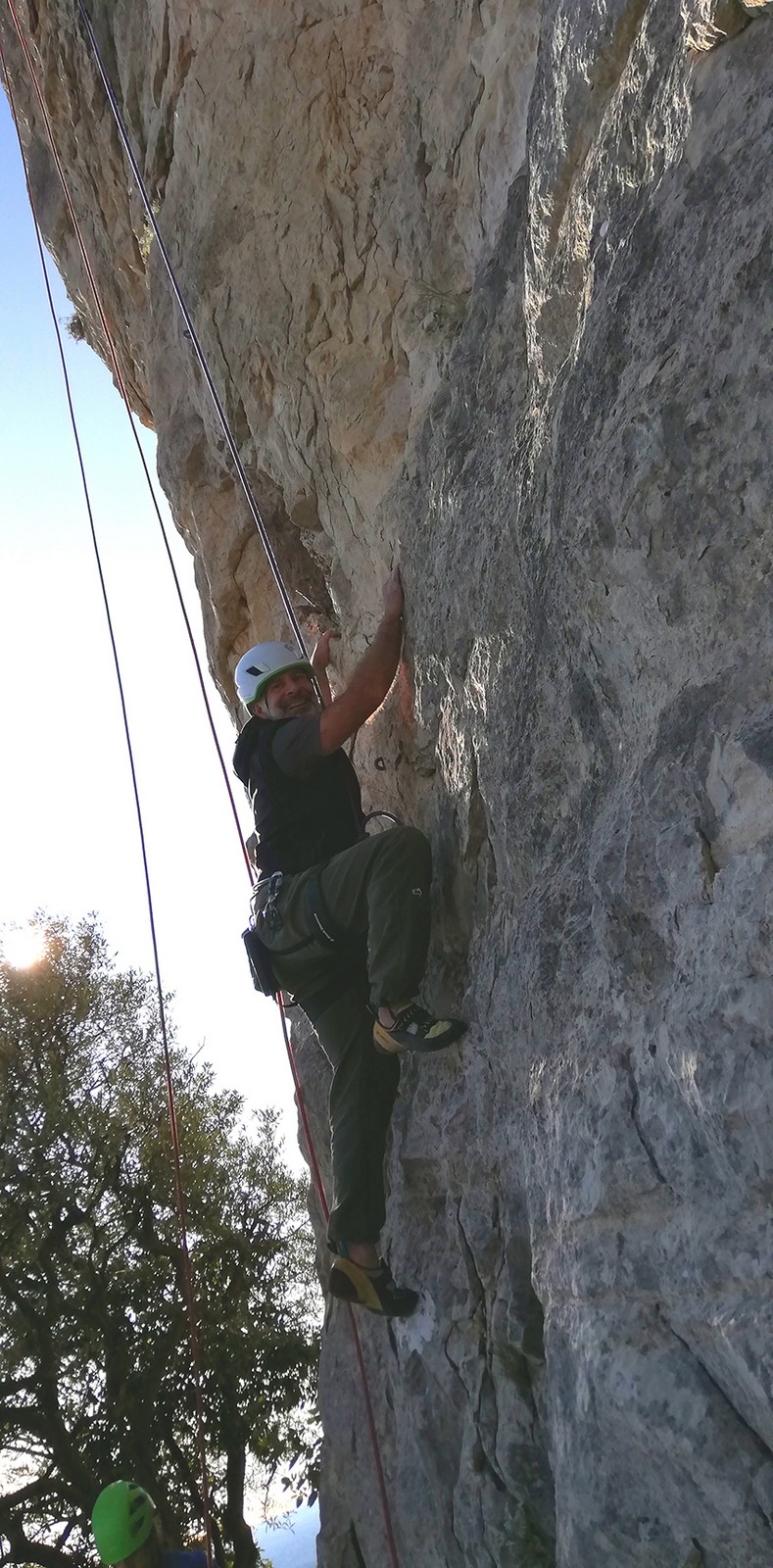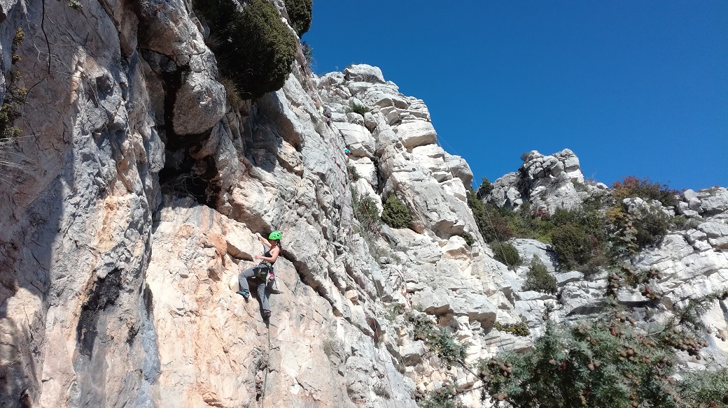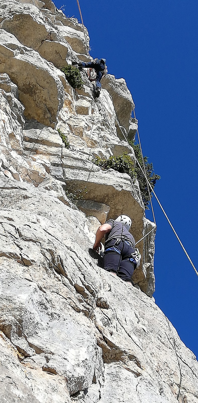 Et c’est reparti de plus belle en après-midi, avec un petit groupe qui se détache pour aller s’essayer dans quelques 6c/+ avec plus ou moins de succès, jusqu’à ce que le soleil nous lâche et que les doudounes sortent des sacs. Mais ce ne sera pas suffisant pour nous arrêter et c’est bien longtemps après que le froid se soit installé que nous quittons la falaise pour la redescente vers les derniers instants conviviaux au bar du village, où pressions et chocolats/cointreau achèvent sur un délice cette fantastique journée.