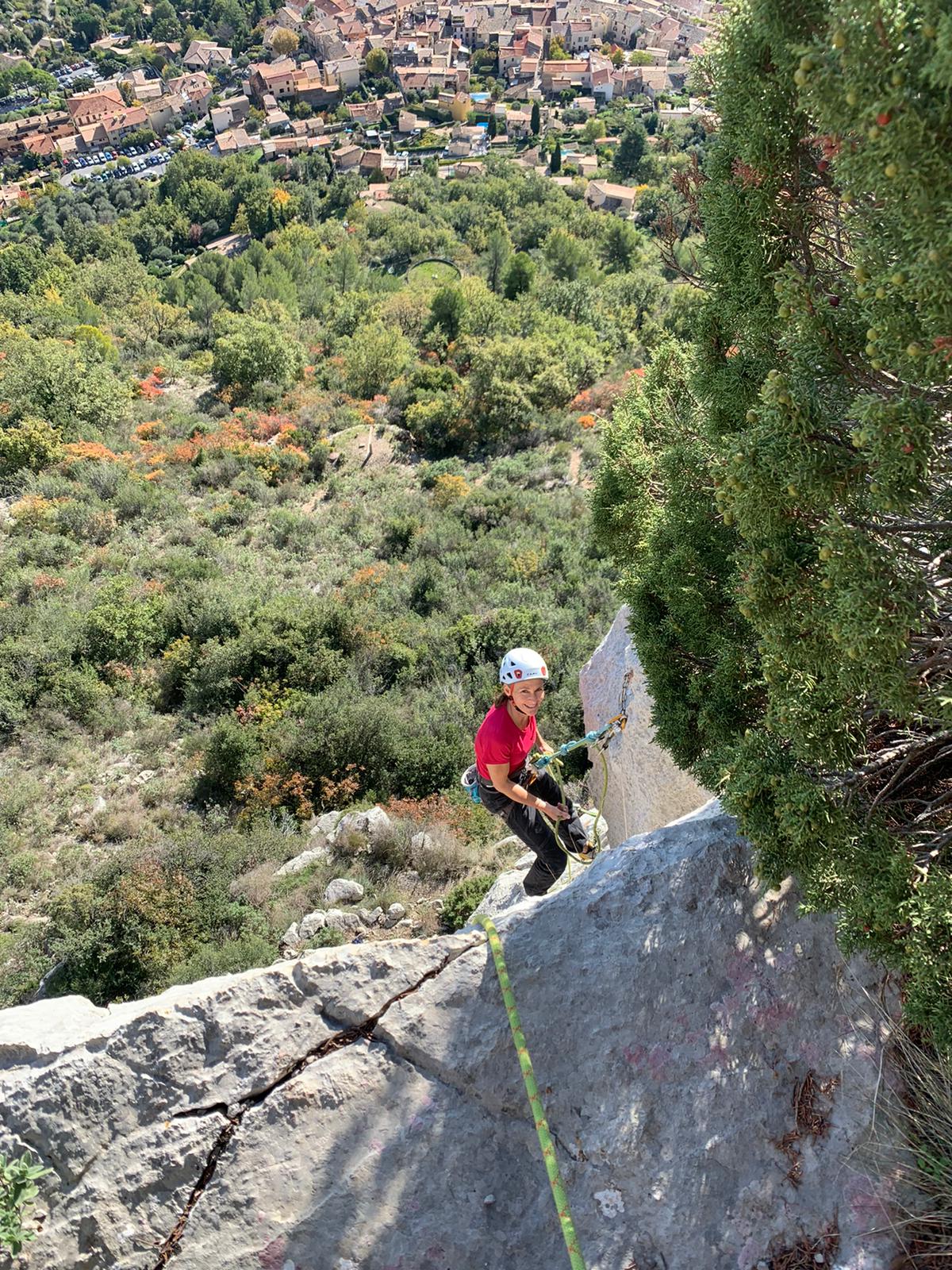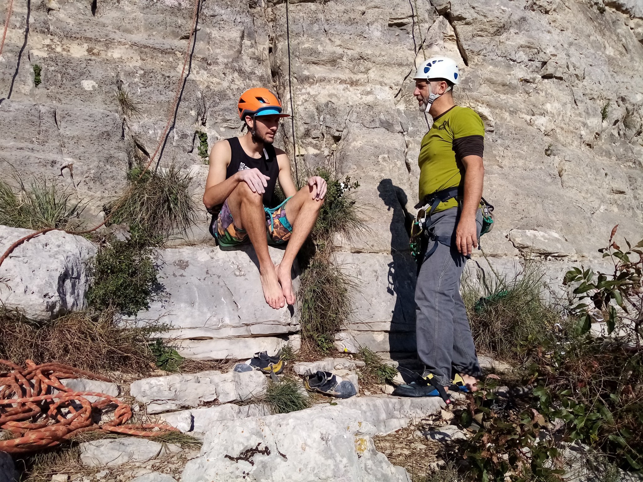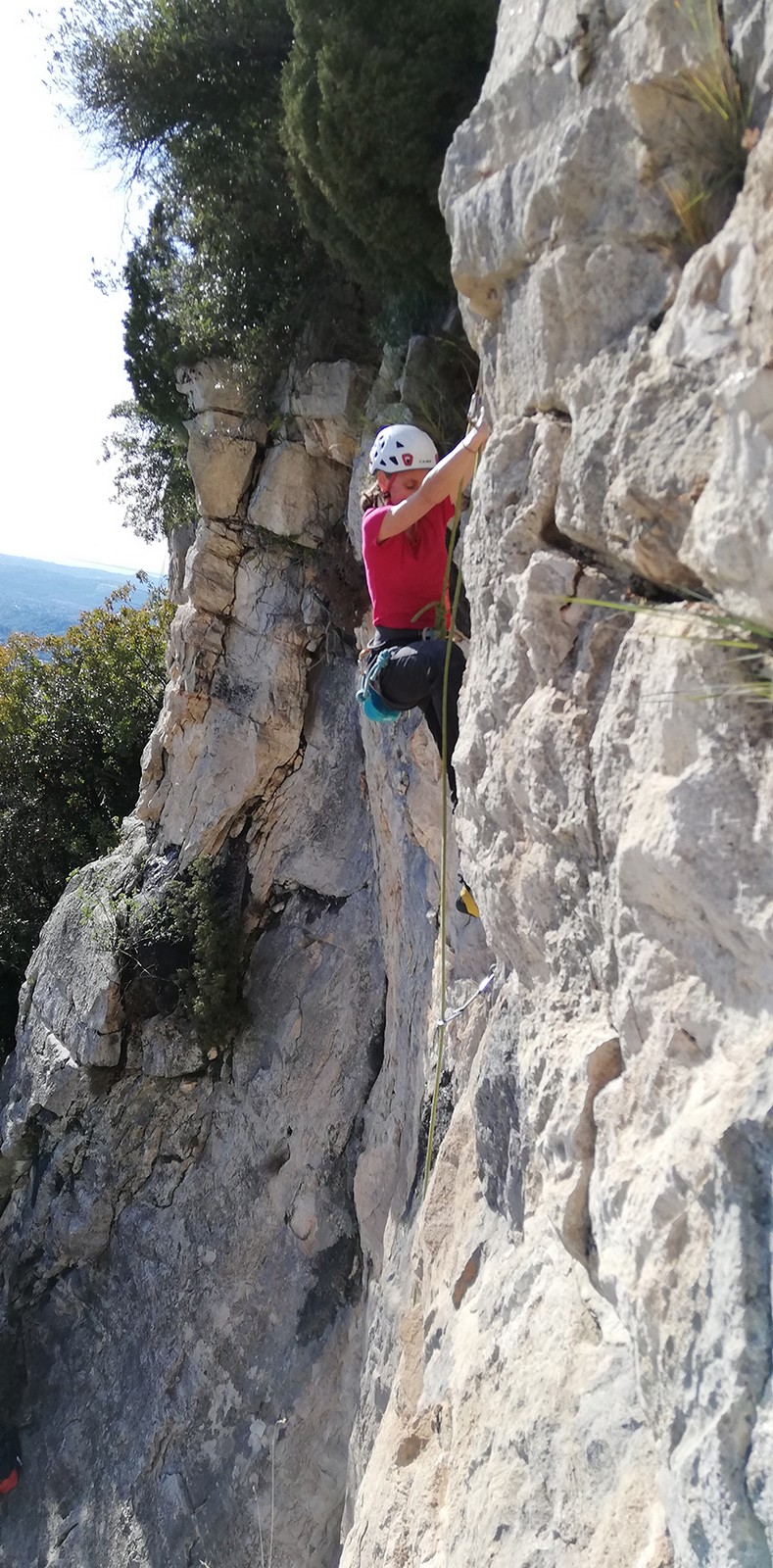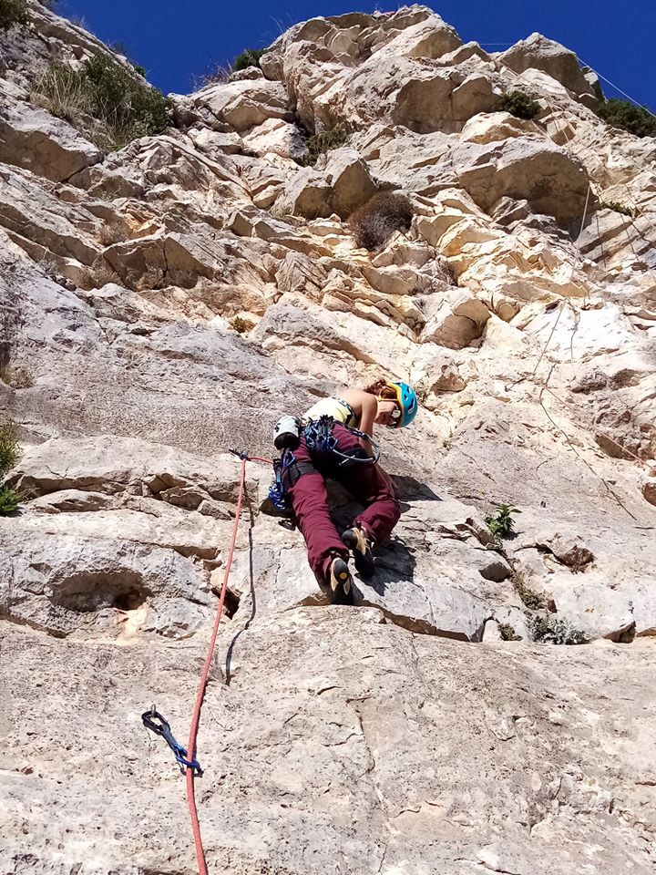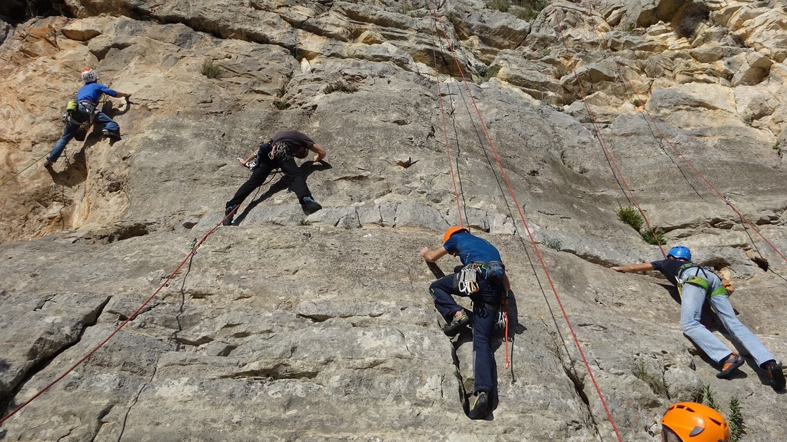 Et c’est reparti de plus belle en après-midi, avec un petit groupe qui se détache pour aller s’essayer dans quelques 6c/+ avec plus ou moins de succès, jusqu’à ce que le soleil nous lâche et que les doudounes sortent des sacs. Mais ce ne sera pas suffisant pour nous arrêter et c’est bien longtemps après que le froid se soit installé que nous quittons la falaise pour la redescente vers les derniers instants conviviaux au bar du village, où pressions et chocolats/cointreau achèvent sur un délice cette fantastique journée.