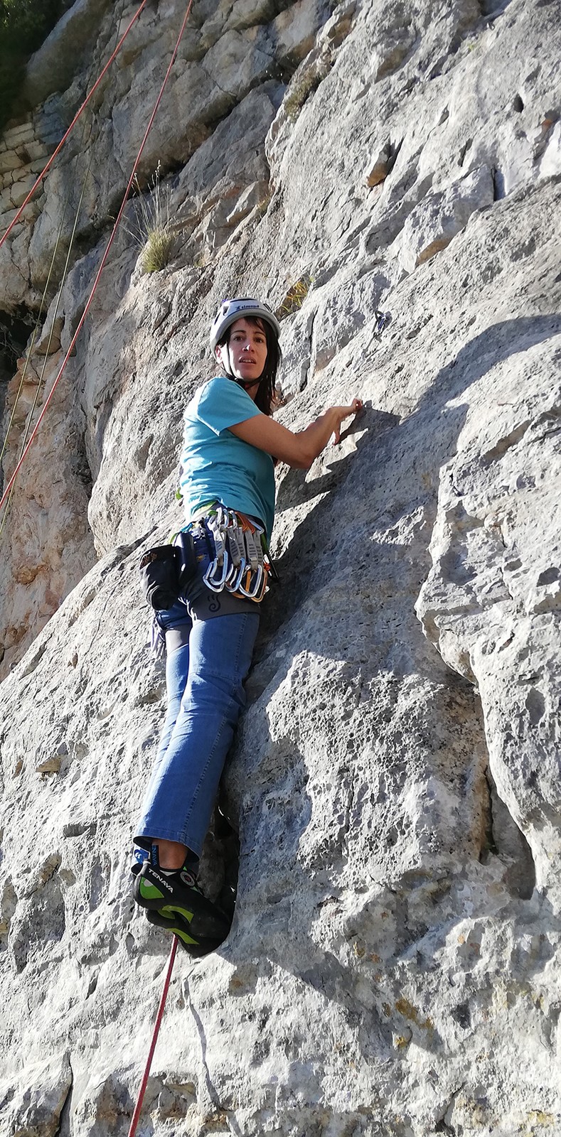 Cécile ne déroge pas à la règle et se lance dans la première voie, ouverture du bal qui ne cessera pas jusqu’à tard dans l’après-midi. Nous sommes vraiment nombreux et il est même difficile pour tout le monde de trouver une voie à son niveau. Certains s’expatrient à l’extrême droite du secteur, comme Sandra et Justine qui batailleront une bonne partie de la matinée sans parvenir à clipper le deuxième point des miches à l’air, d’autres à l’extrême gauche dans la Una, voie qui borde la voie rouge.