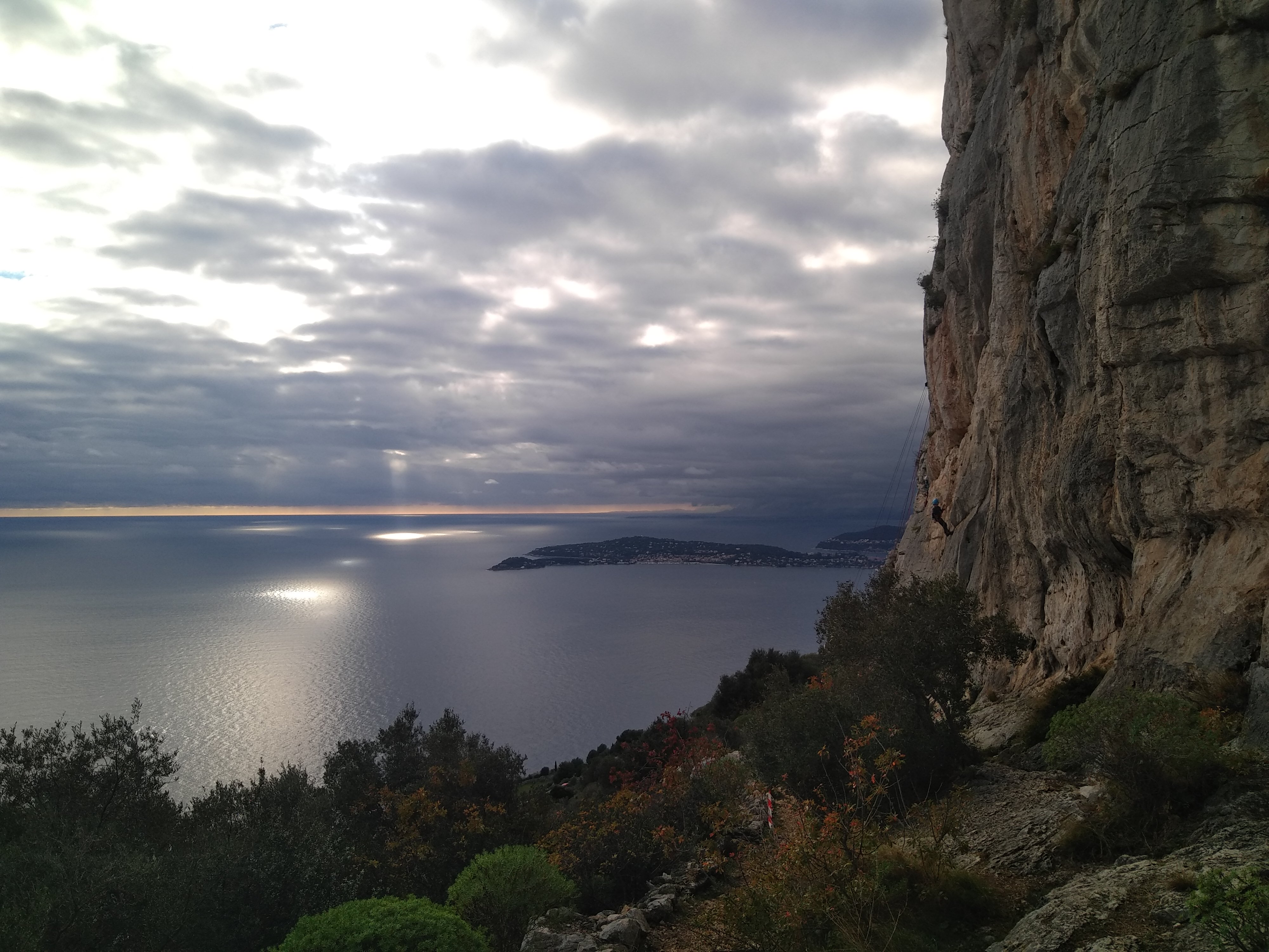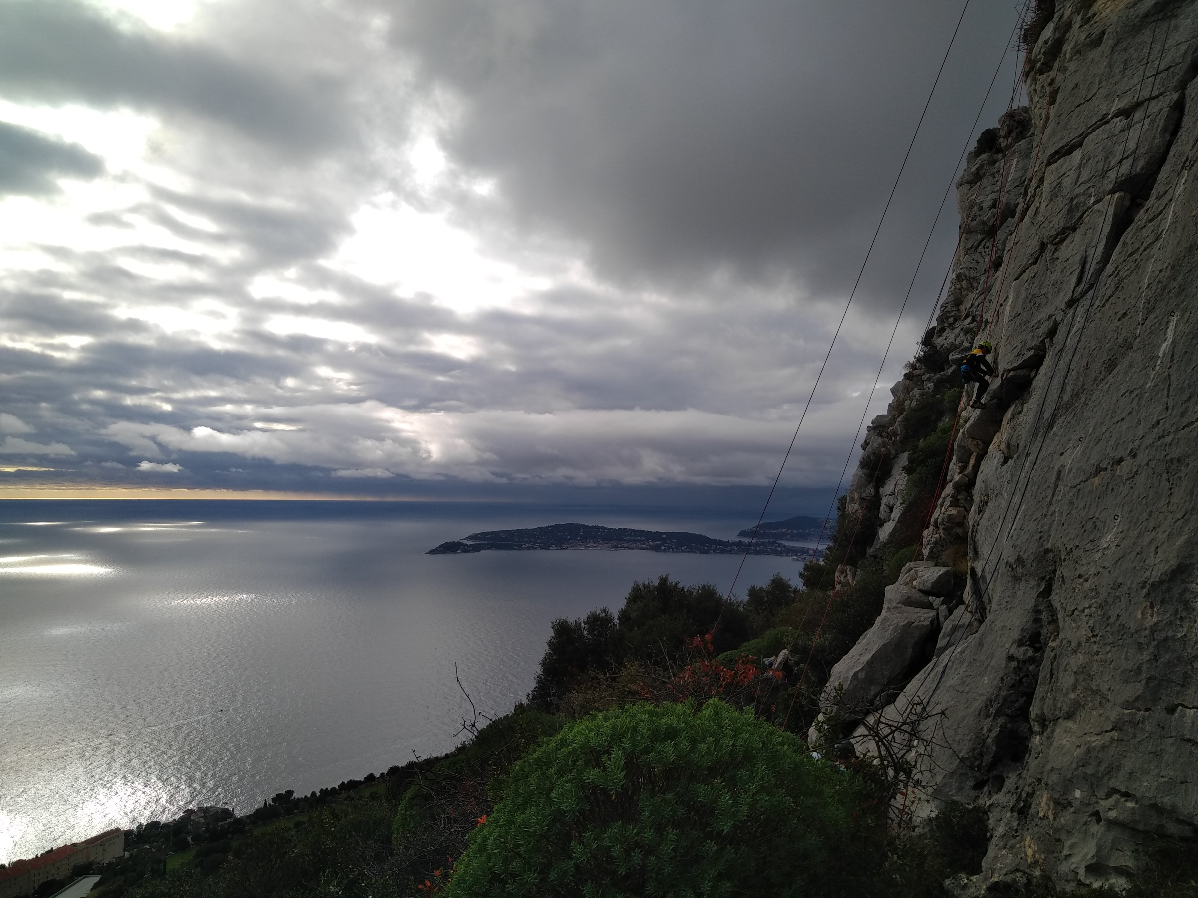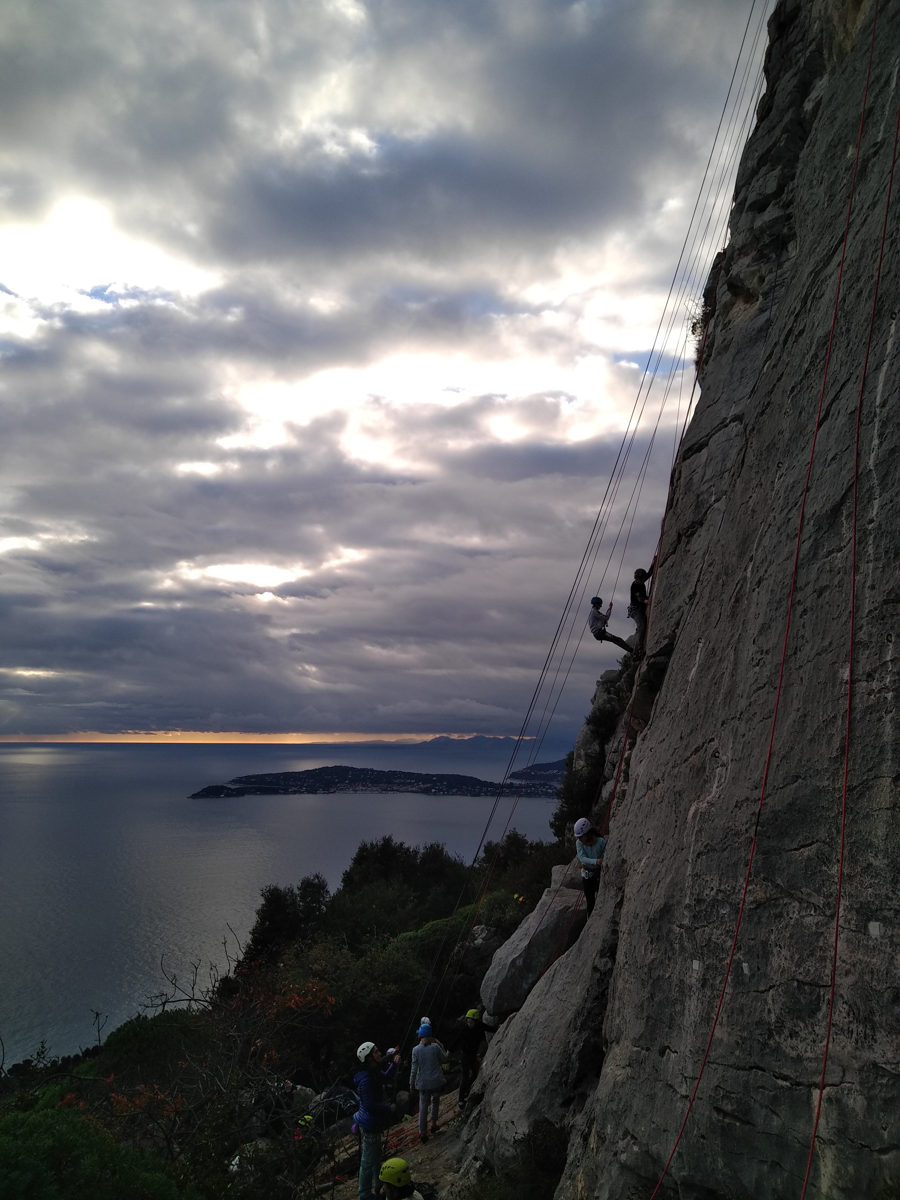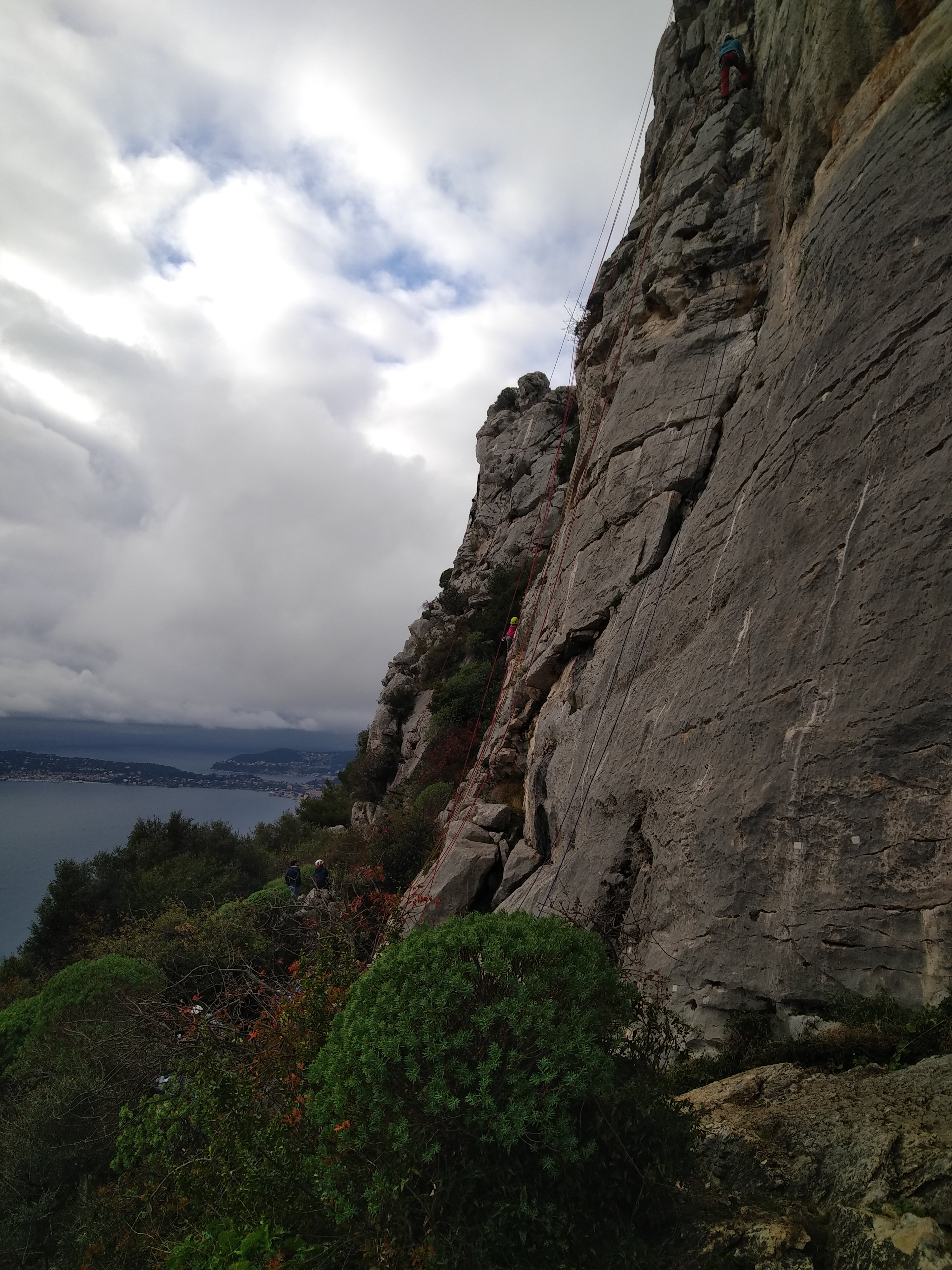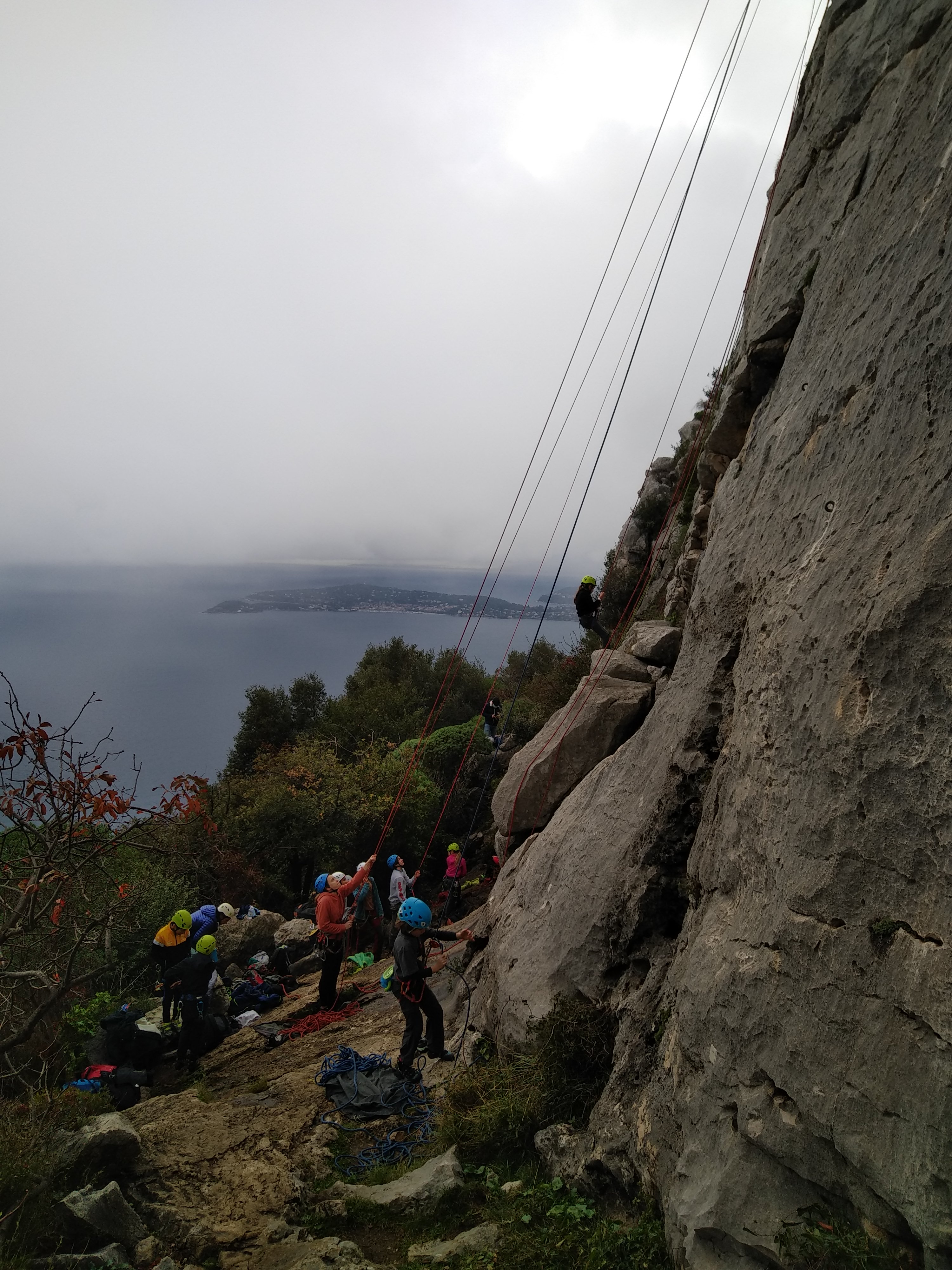 Hier, c’est avec une bande de 15 jeunes courageux que nous avons affronté une météo pas franchement réjouissante pour une reprise d’activité en falaise. Pourtant, quand nous nous sommes rejoints à Cagnes, c’est sous le soleil que nous avons organisé le transport des troupes. Sur le trajet, plus on se rapprochait de la Turbie, plus le ciel devenait gris.