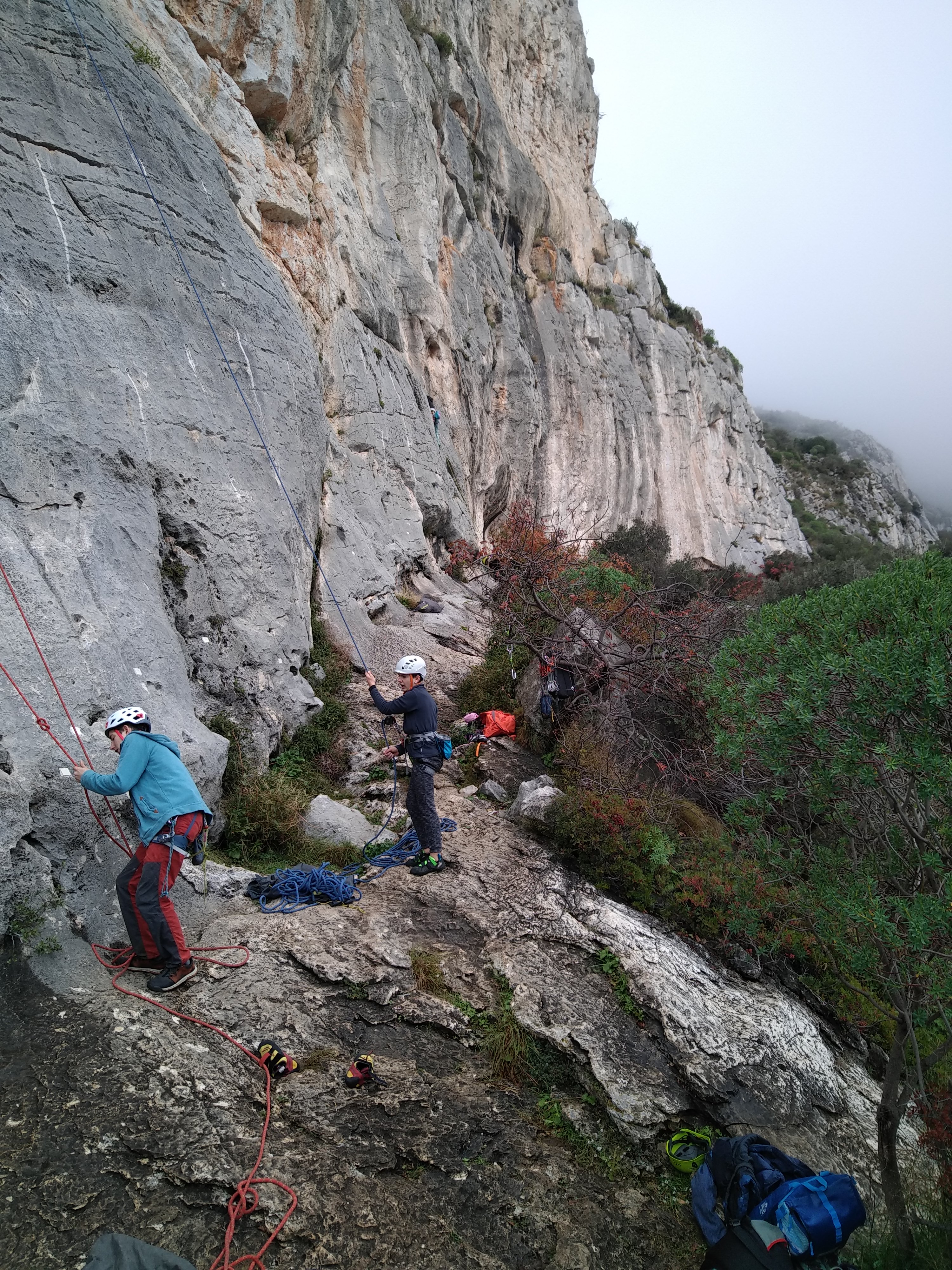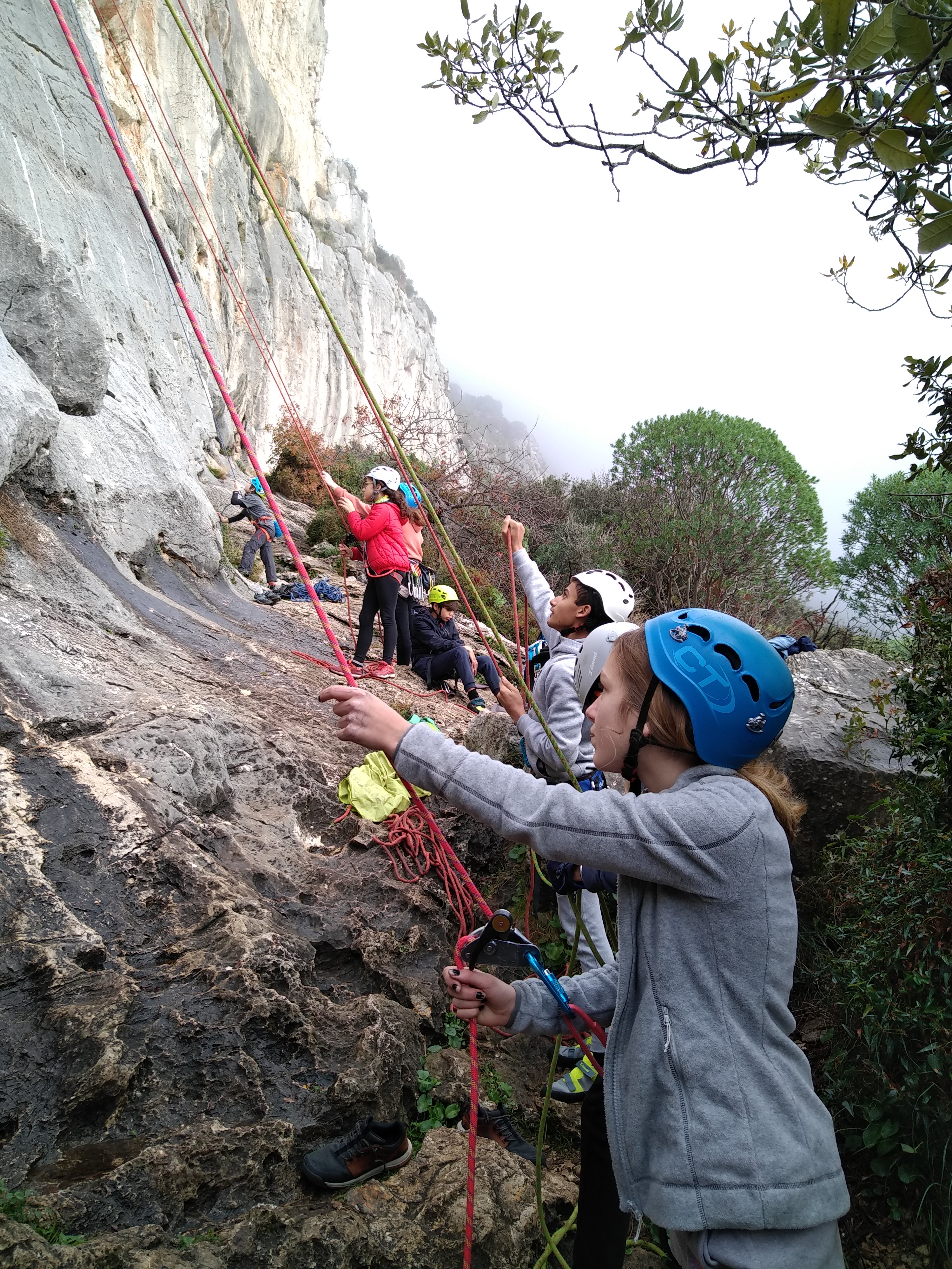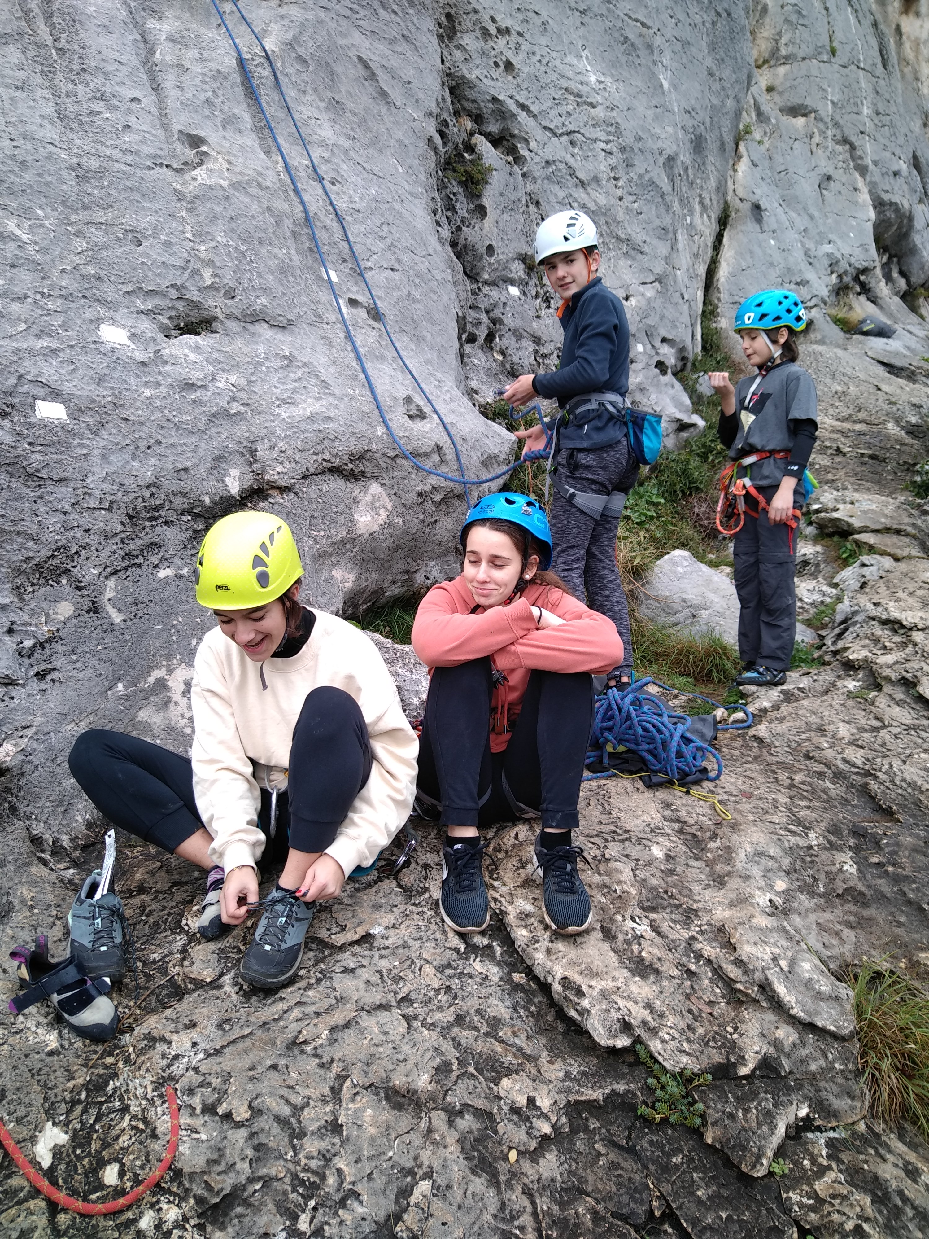 Finalement, c’est sous un plafond bouché que nous attaquons la marche d’approche, direction les nuages ! Mais il en faut plus que ça pour démotiver nos jeunes. Les plus aguerris partent en tête installer les premières moulinettes, les doigts assez vite insensibilisés par le froid mordant et l’humidité ambiante…