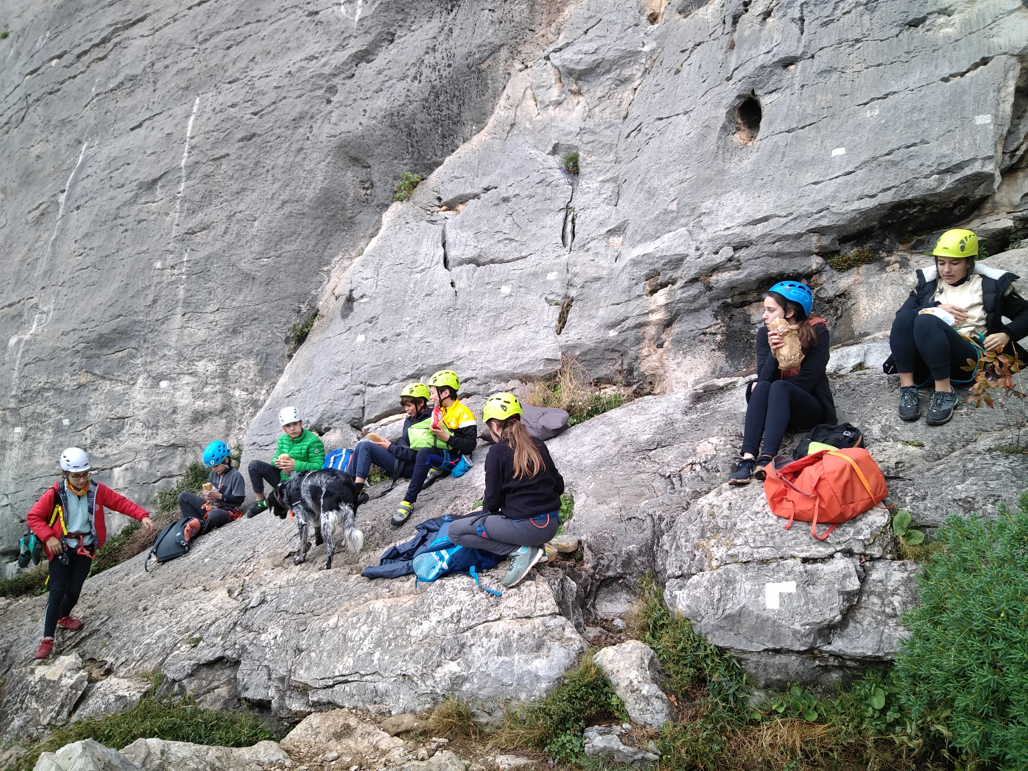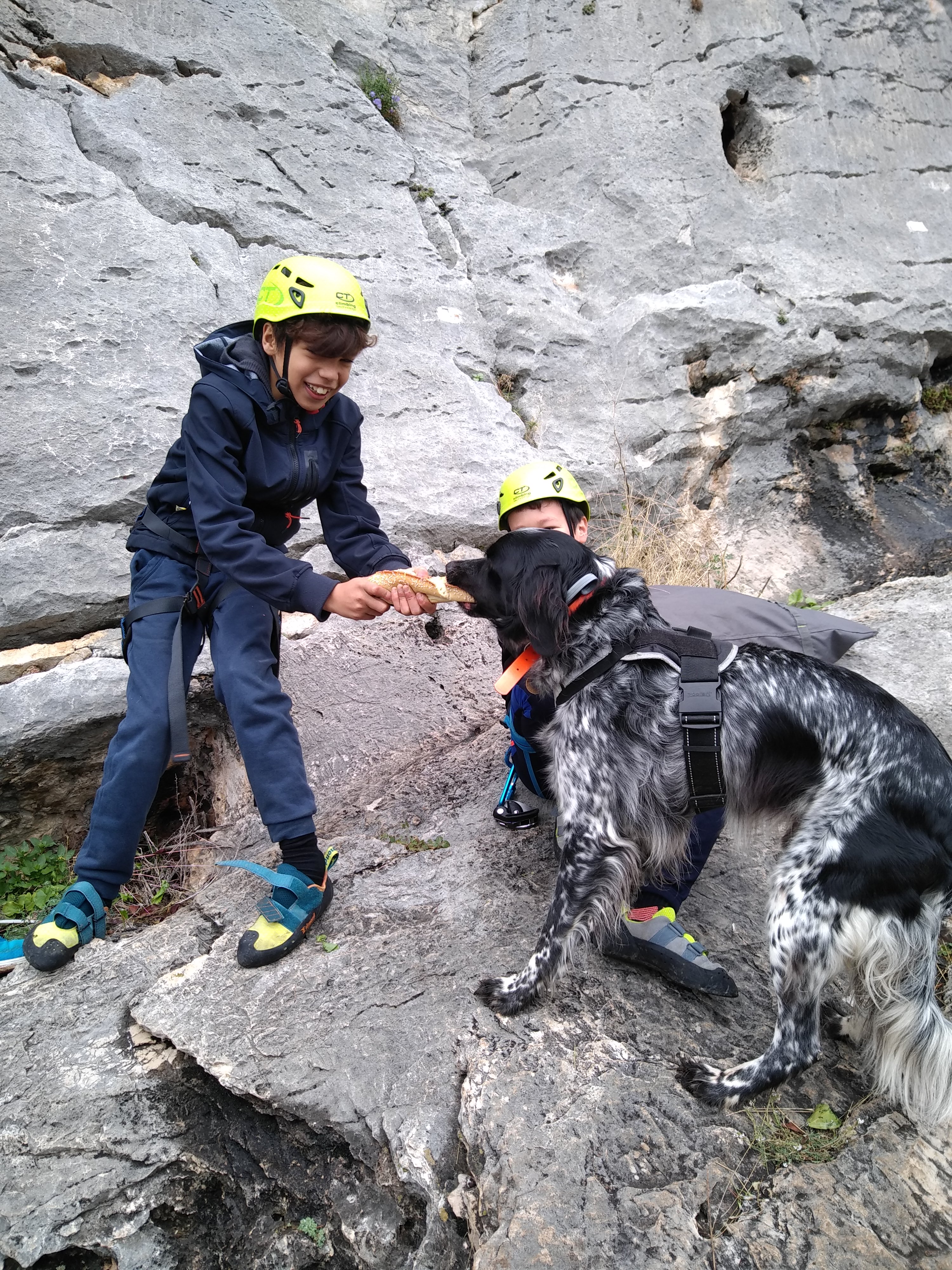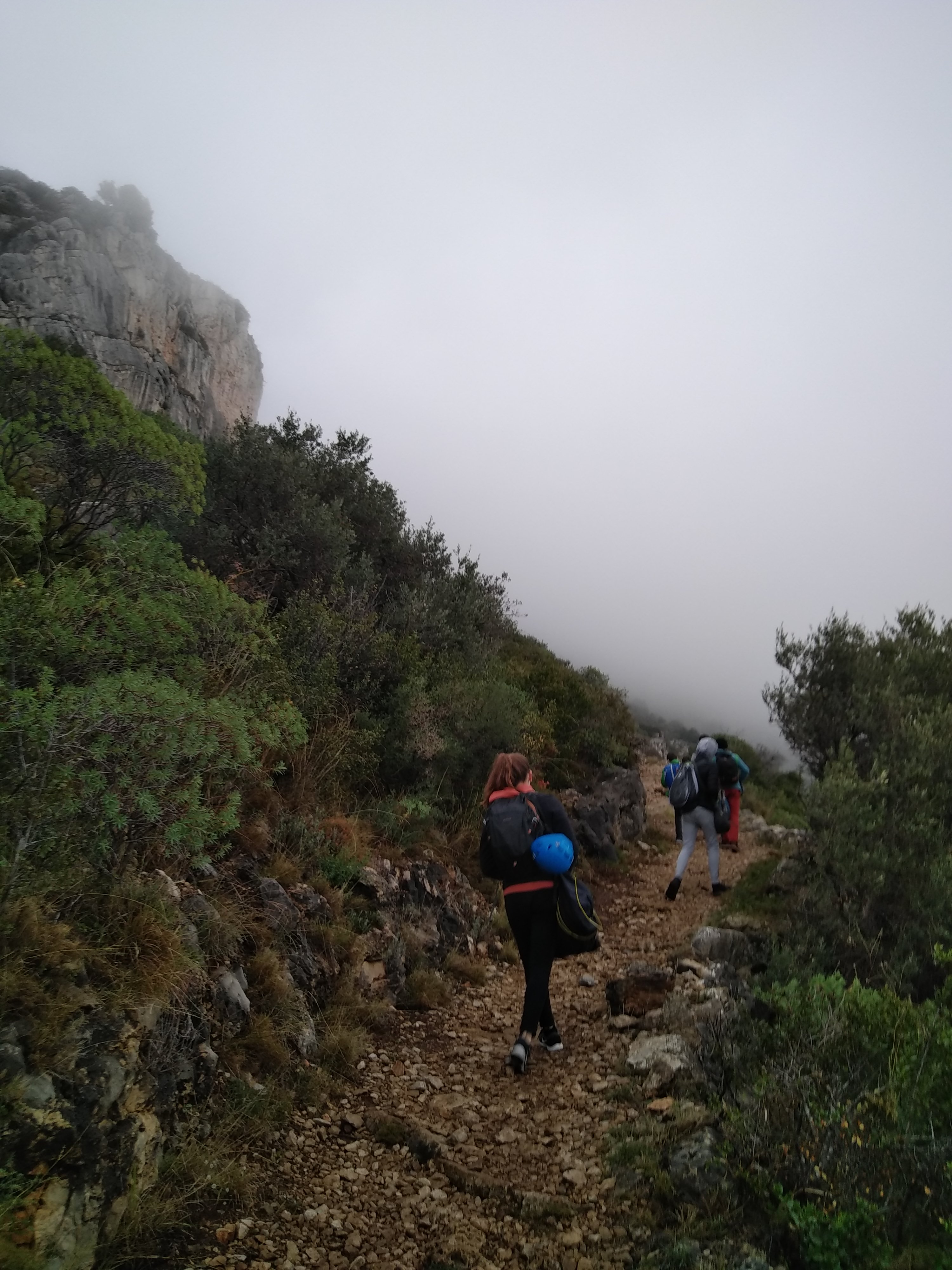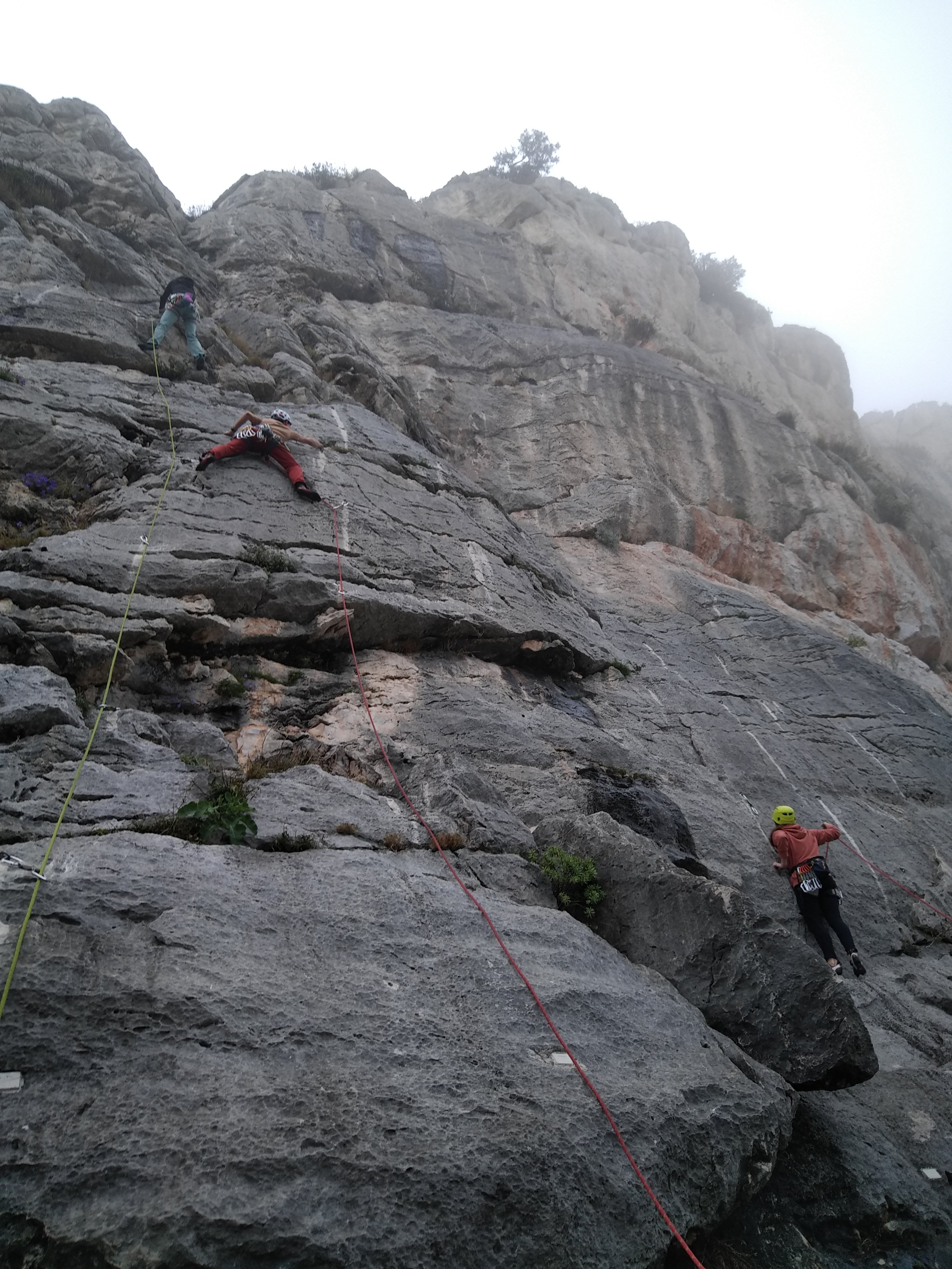 Finalement, c’est sous un plafond bouché que nous attaquons la marche d’approche, direction les nuages ! Mais il en faut plus que ça pour démotiver nos jeunes. Les plus aguerris partent en tête installer les premières moulinettes, les doigts assez vite insensibilisés par le froid mordant et l’humidité ambiante…