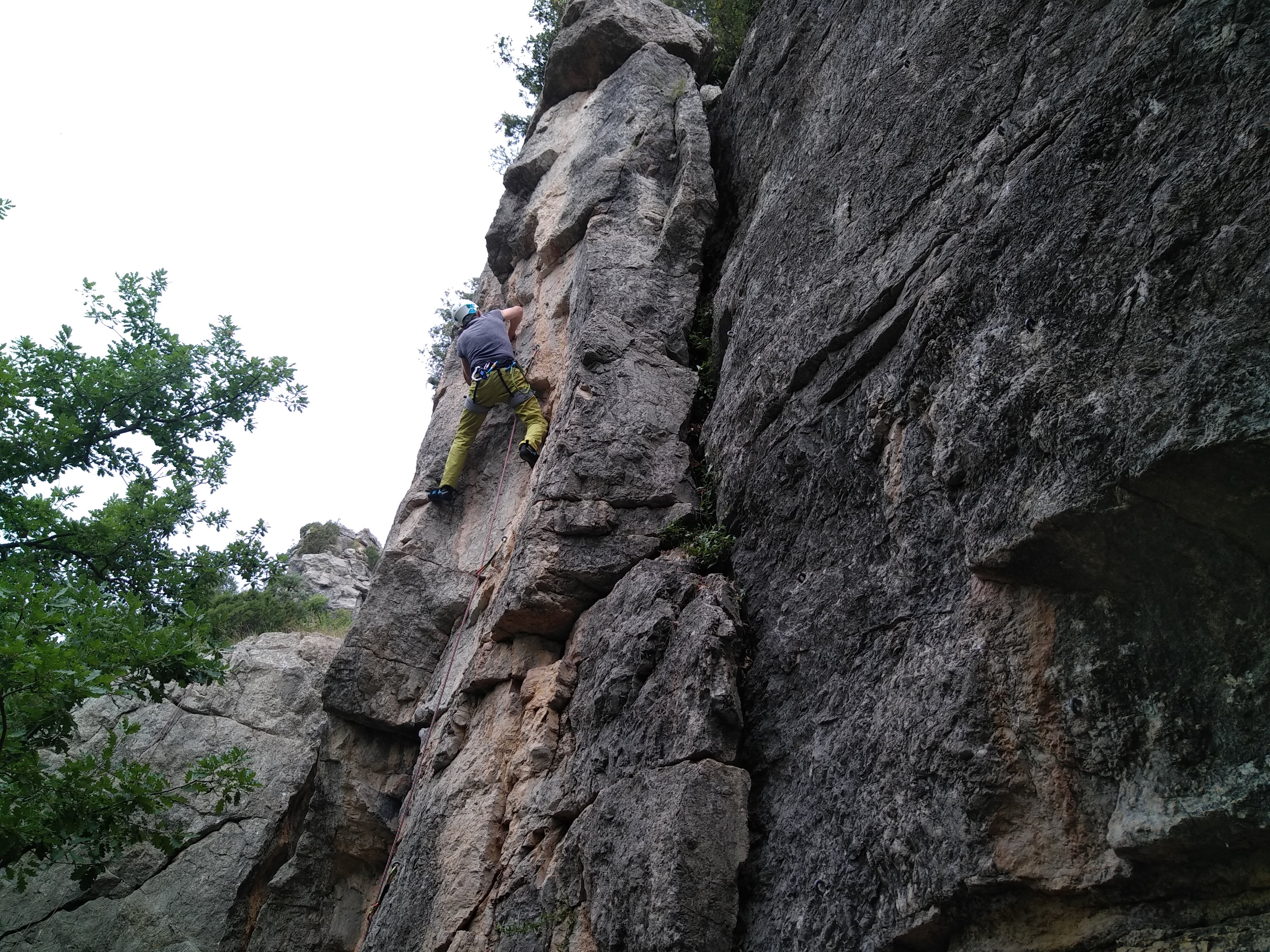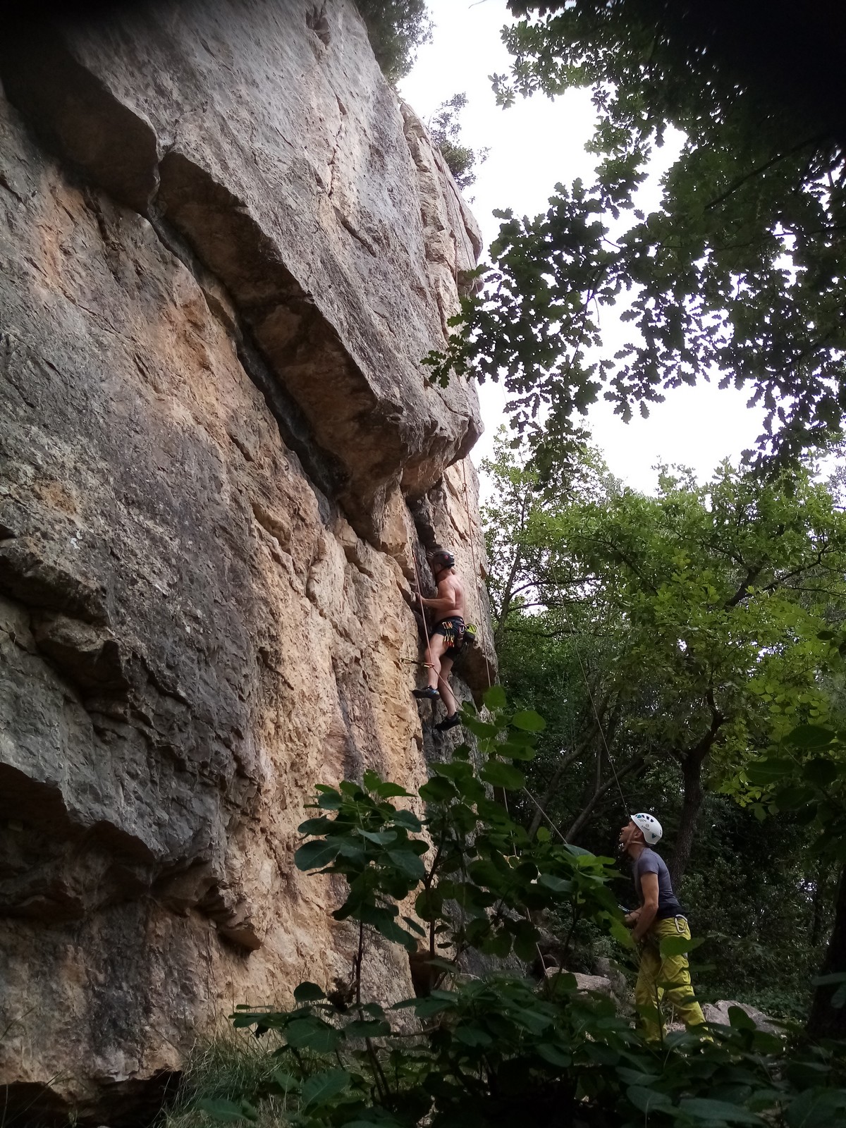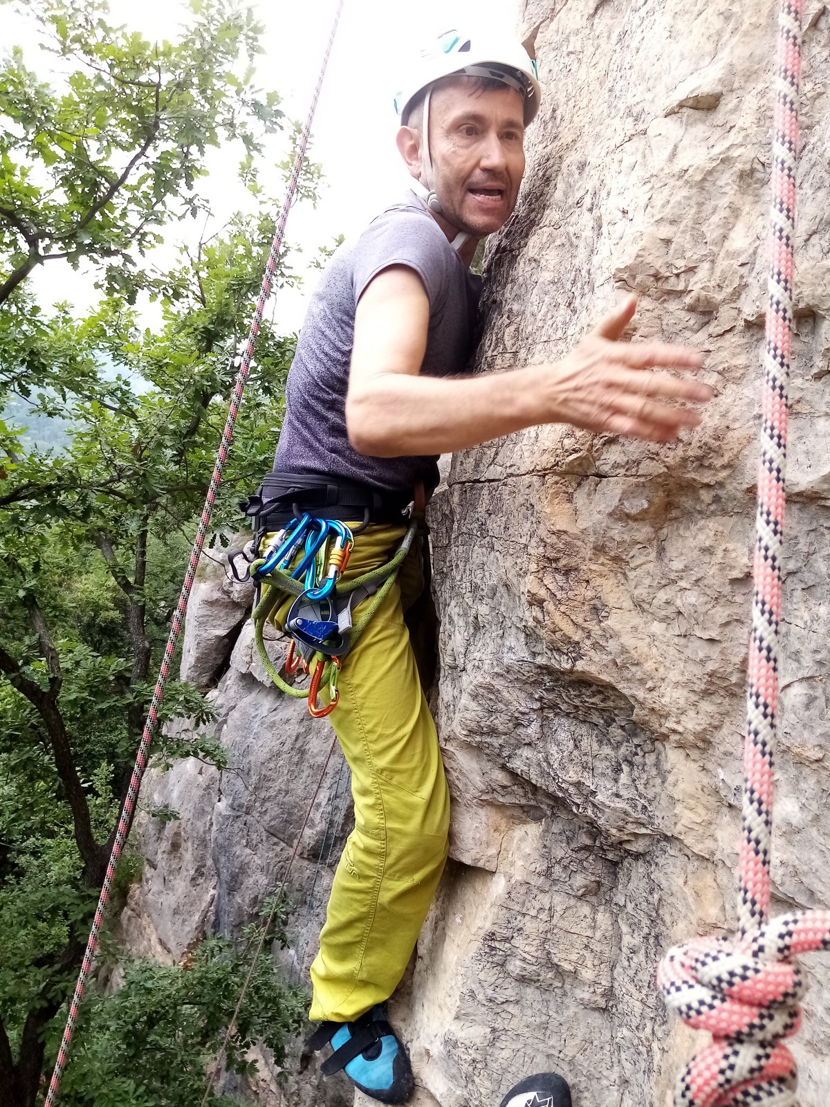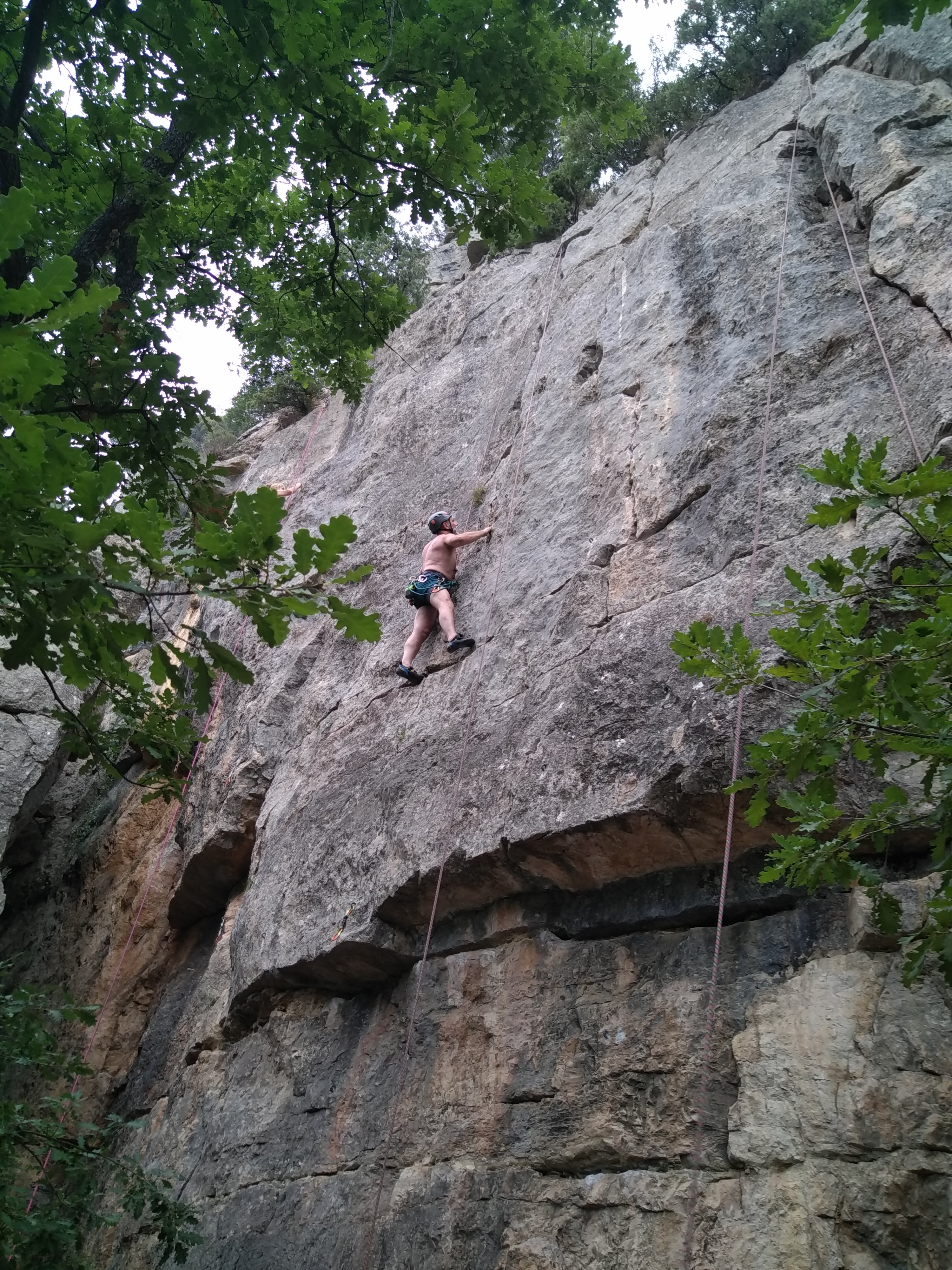 Jean et Philippe ainsi que Cédric et Xavier s’attaquent à leurs voies de chauffe, pas si faciles que ça. Il fait lourd, et le caillou de St Jeannet, déjà bien glissant à la base, semble être tartiné de beurre demi-sel. Mais qu’à cela ne tienne, comme l’a dit une grande philosophe, c’est éprouvant mais gratifiant que d’arriver au sommet.