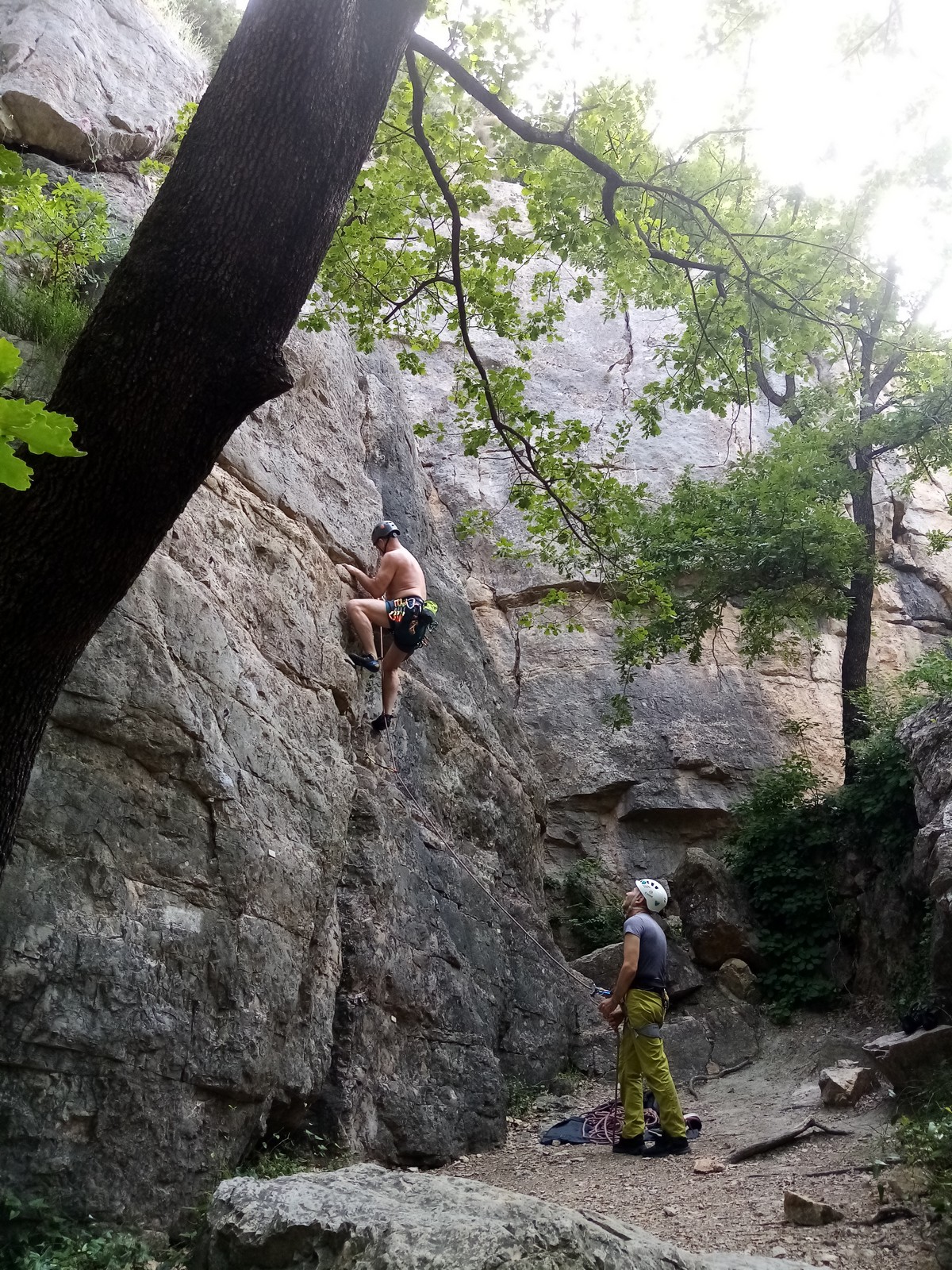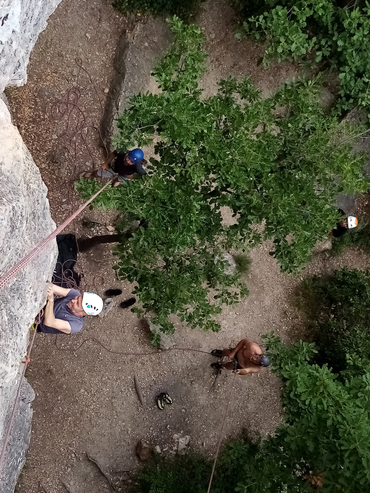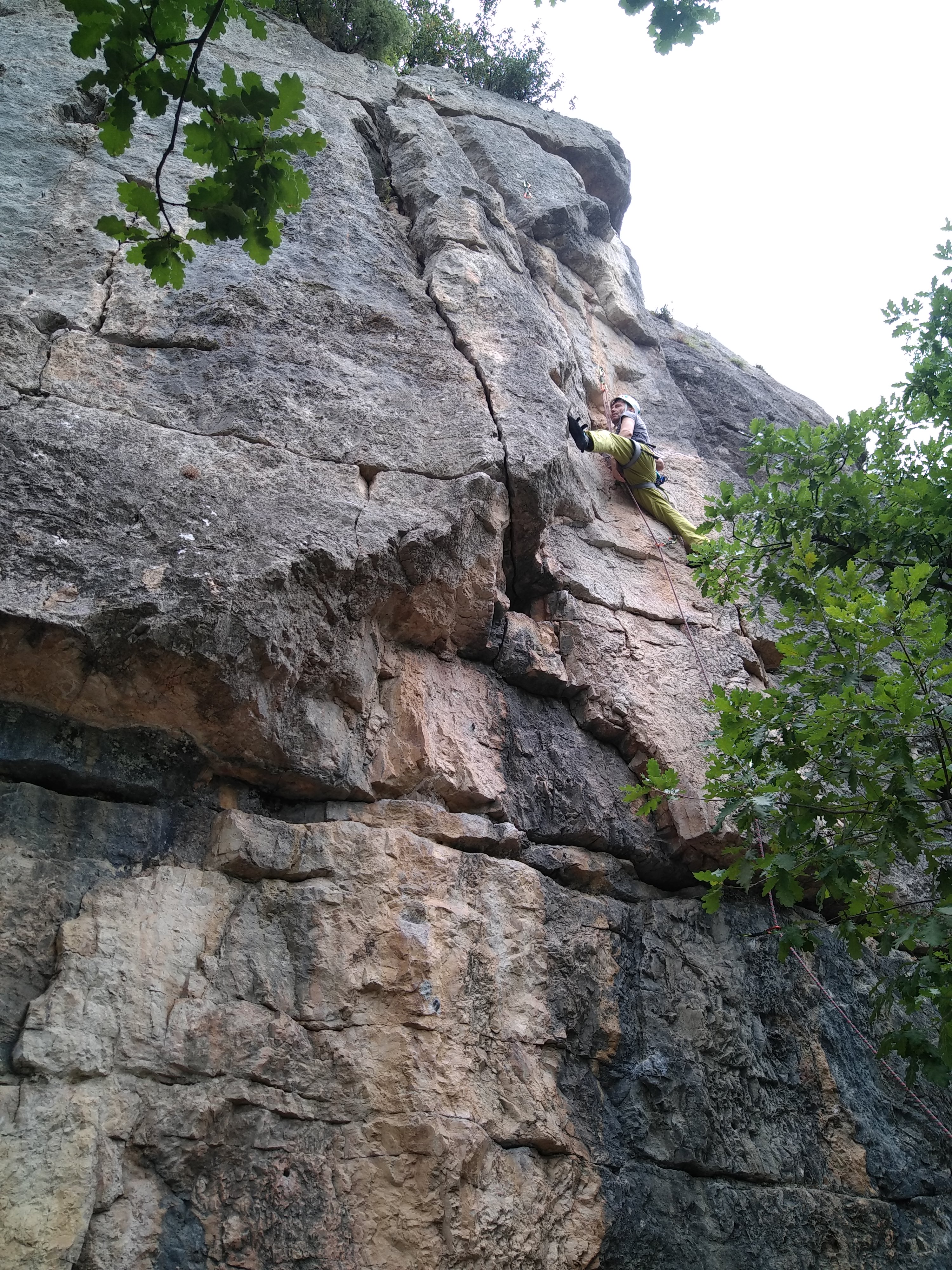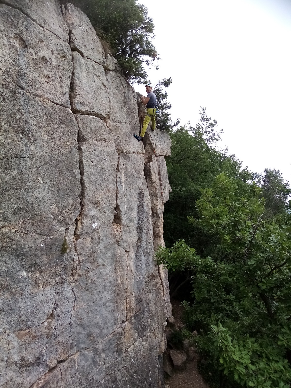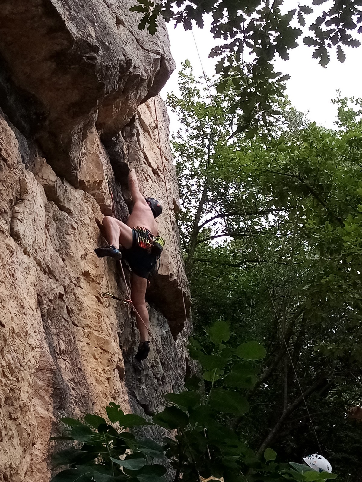 Jean et Philippe ainsi que Cédric et Xavier s’attaquent à leurs voies de chauffe, pas si faciles que ça. Il fait lourd, et le caillou de St Jeannet, déjà bien glissant à la base, semble être tartiné de beurre demi-sel. Mais qu’à cela ne tienne, comme l’a dit une grande philosophe, c’est éprouvant mais gratifiant que d’arriver au sommet.
