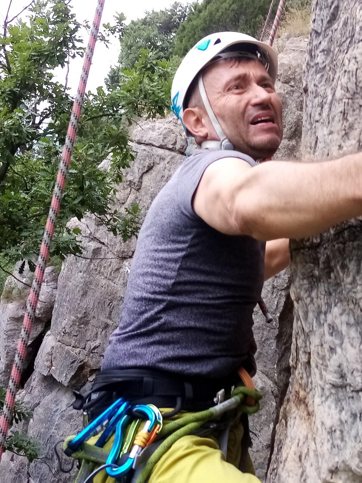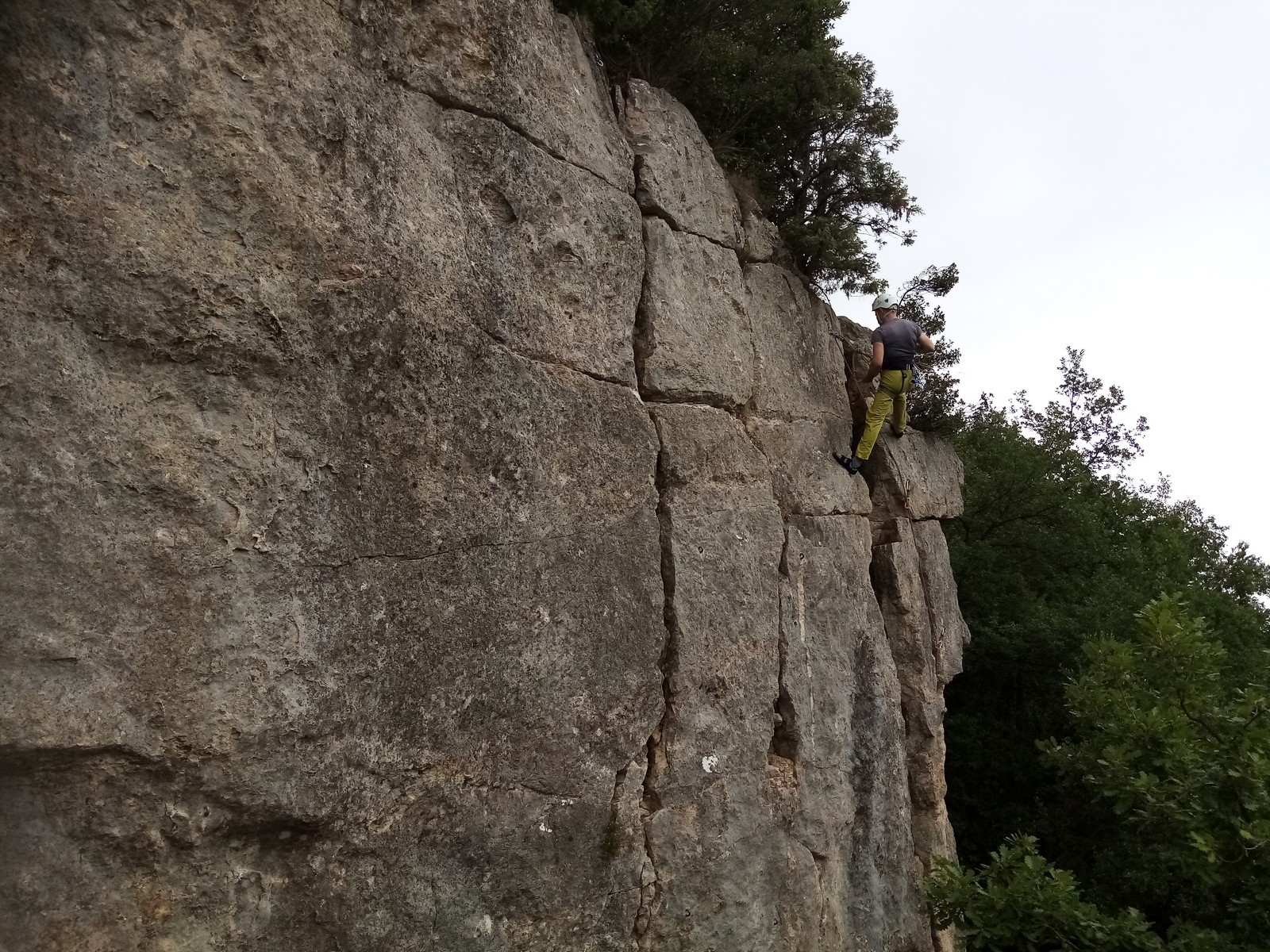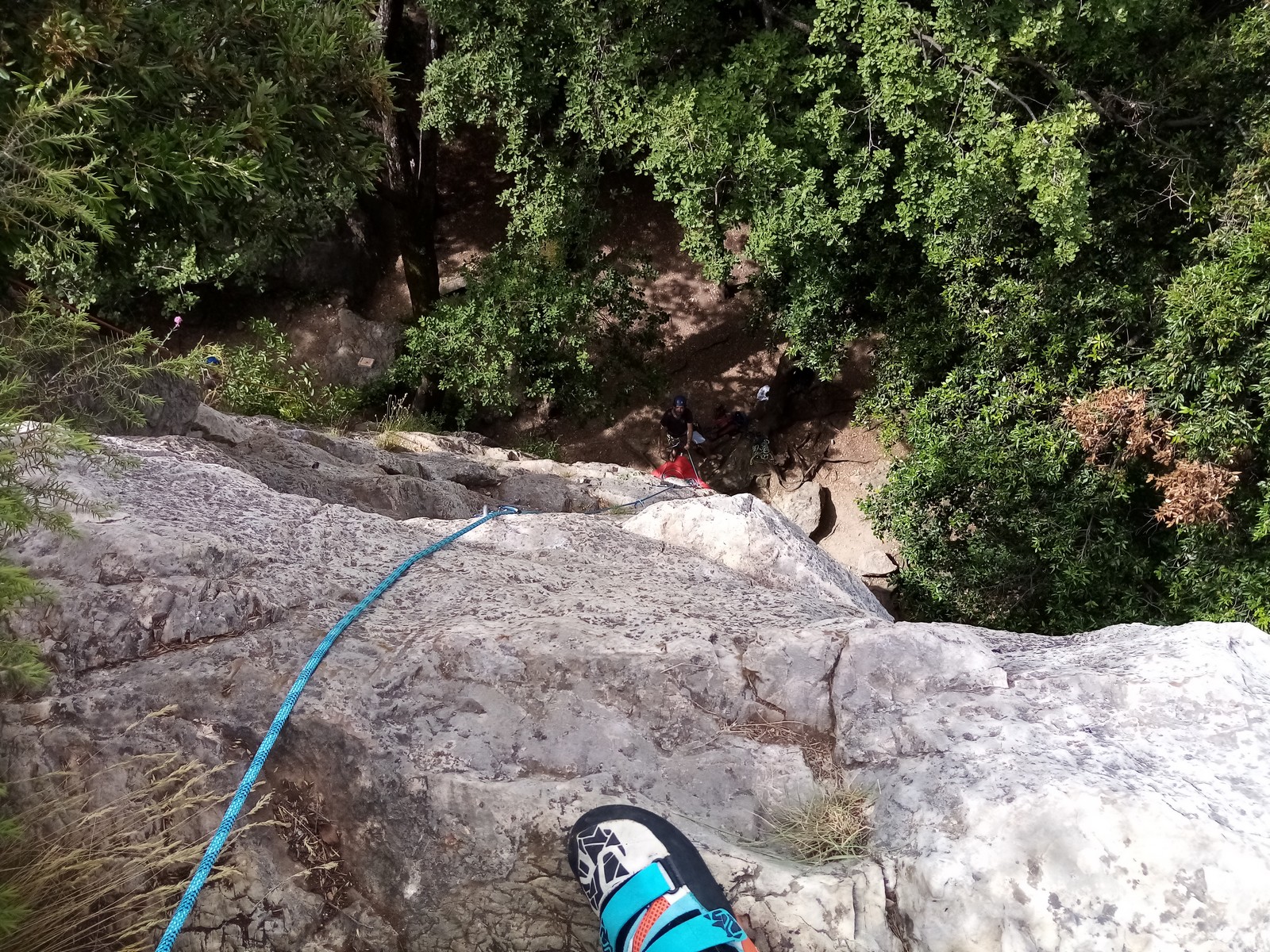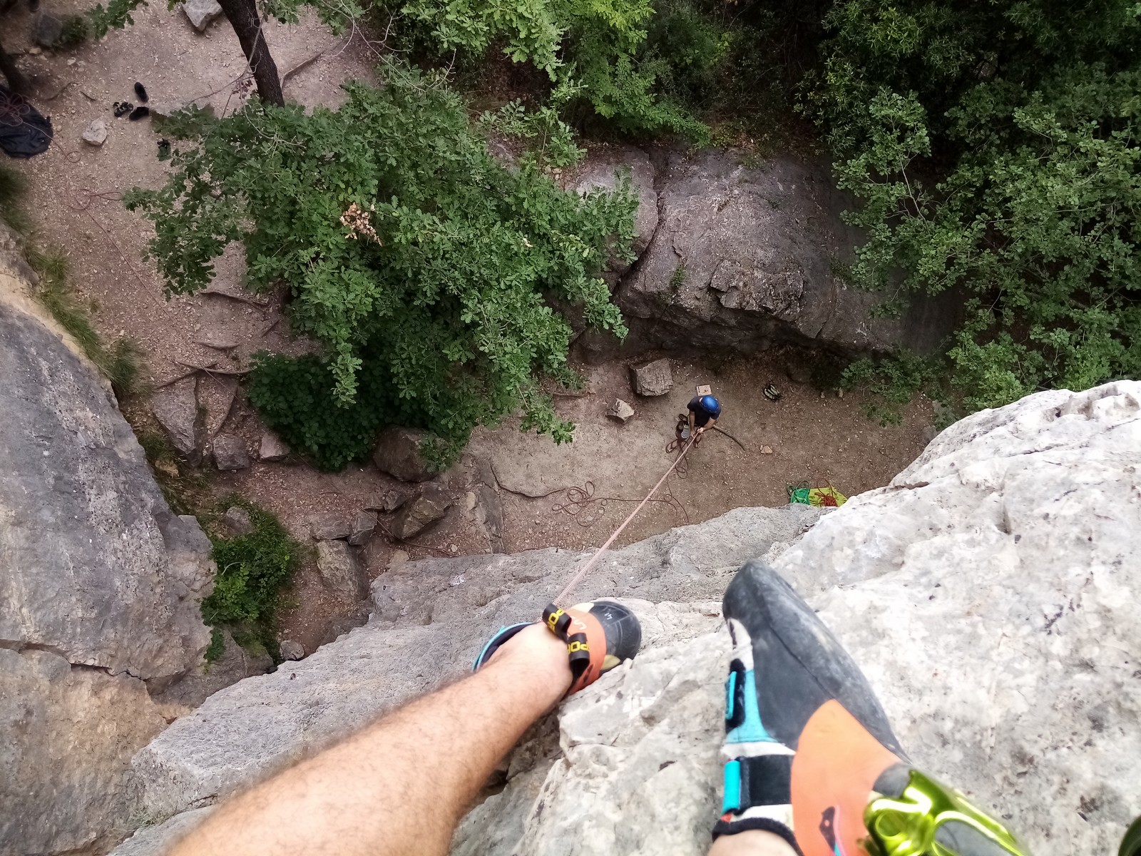 Jean et Philippe ainsi que Cédric et Xavier s’attaquent à leurs voies de chauffe, pas si faciles que ça. Il fait lourd, et le caillou de St Jeannet, déjà bien glissant à la base, semble être tartiné de beurre demi-sel. Mais qu’à cela ne tienne, comme l’a dit une grande philosophe, c’est éprouvant mais gratifiant que d’arriver au sommet.