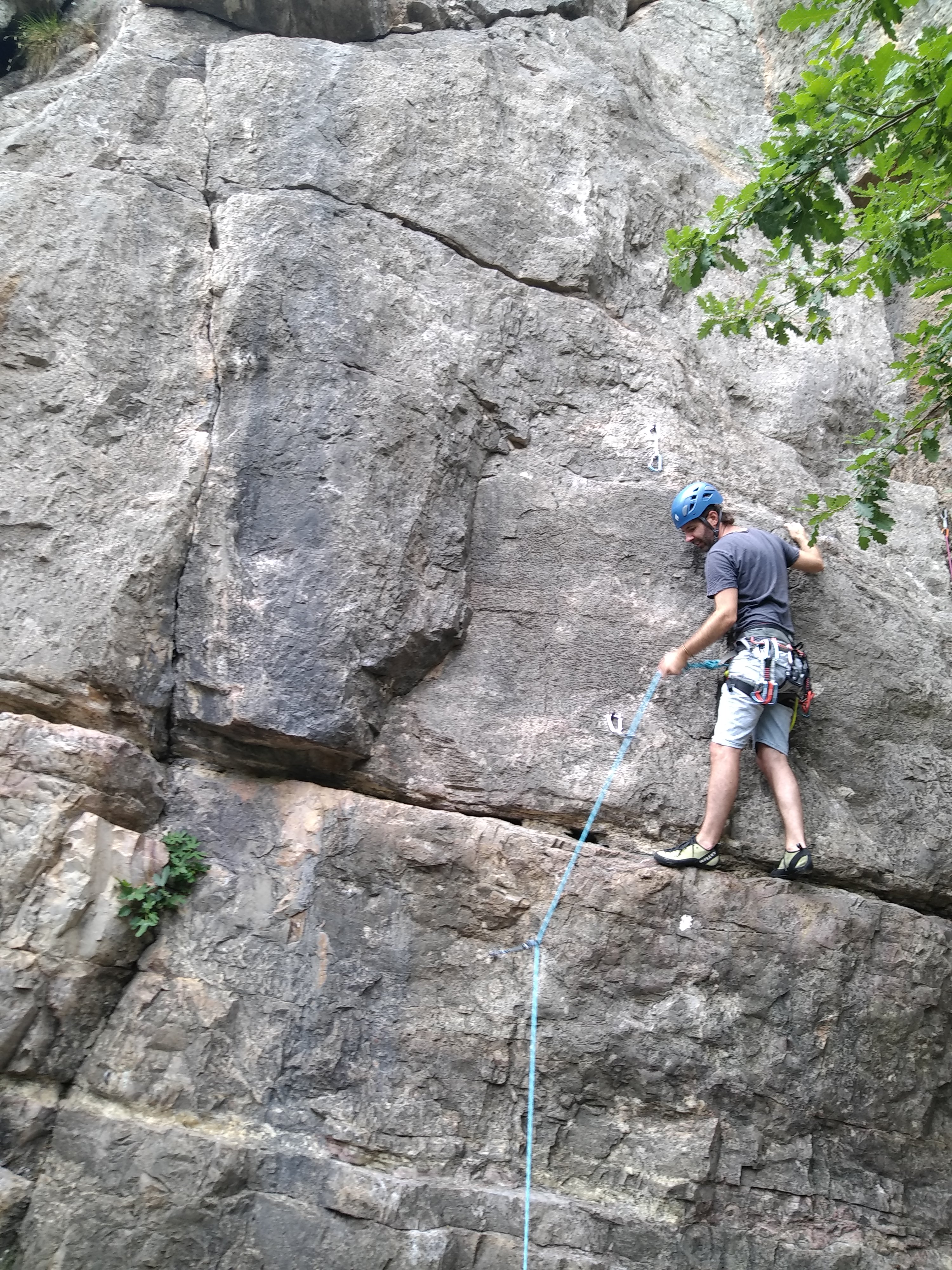 Le temps tourne mais se maintient, et nous passons aux choses plus sérieuses. Philippe nous ouvre la voie en équipant « La branleuse » ainsi que sa voisine « Le long de la fente », deux voies en fissure en 6a et 6a+, avant de s’essayer dans « L’hyper », 6b bien teigneux. Et les autres hommes suivent le chef qui a montré l’exemple avec brio. Ça essaie, ça échange sur les méthodes, c’est chouette.