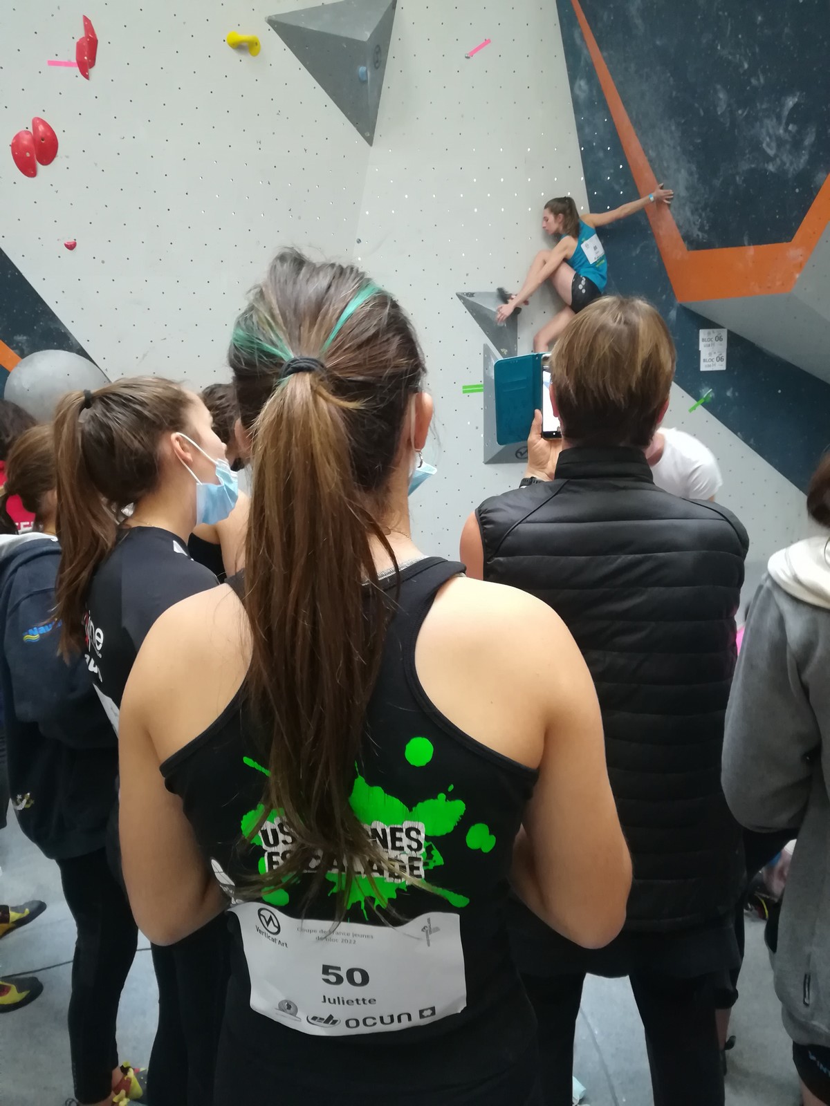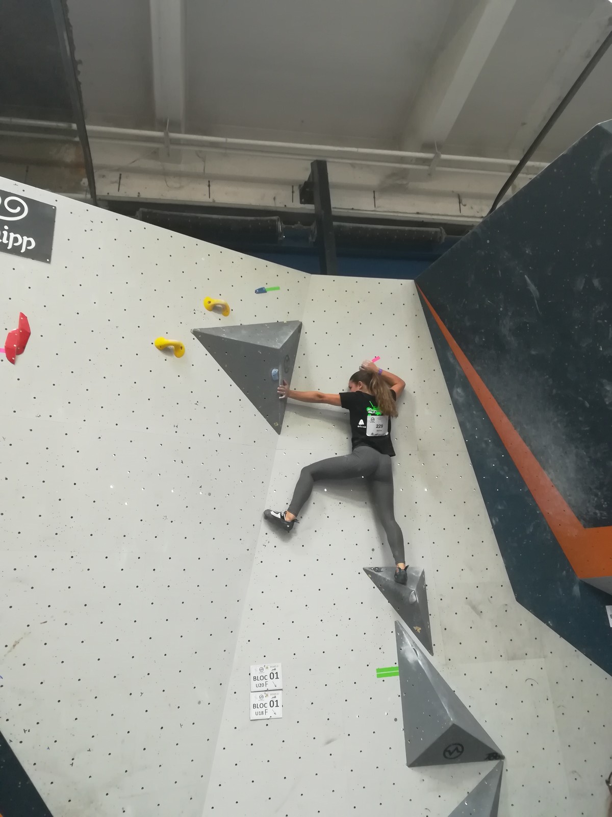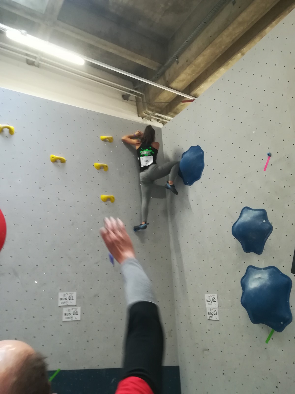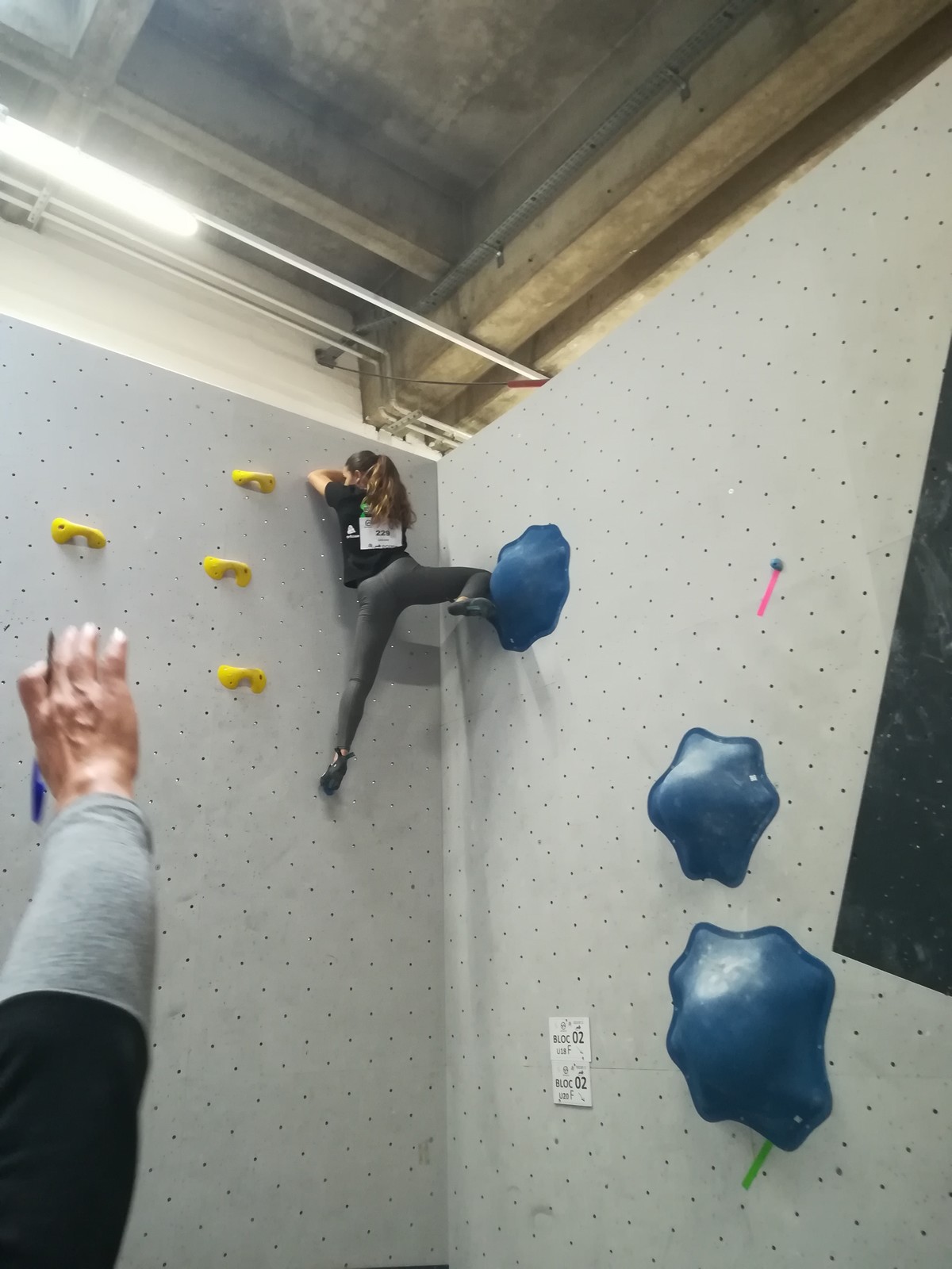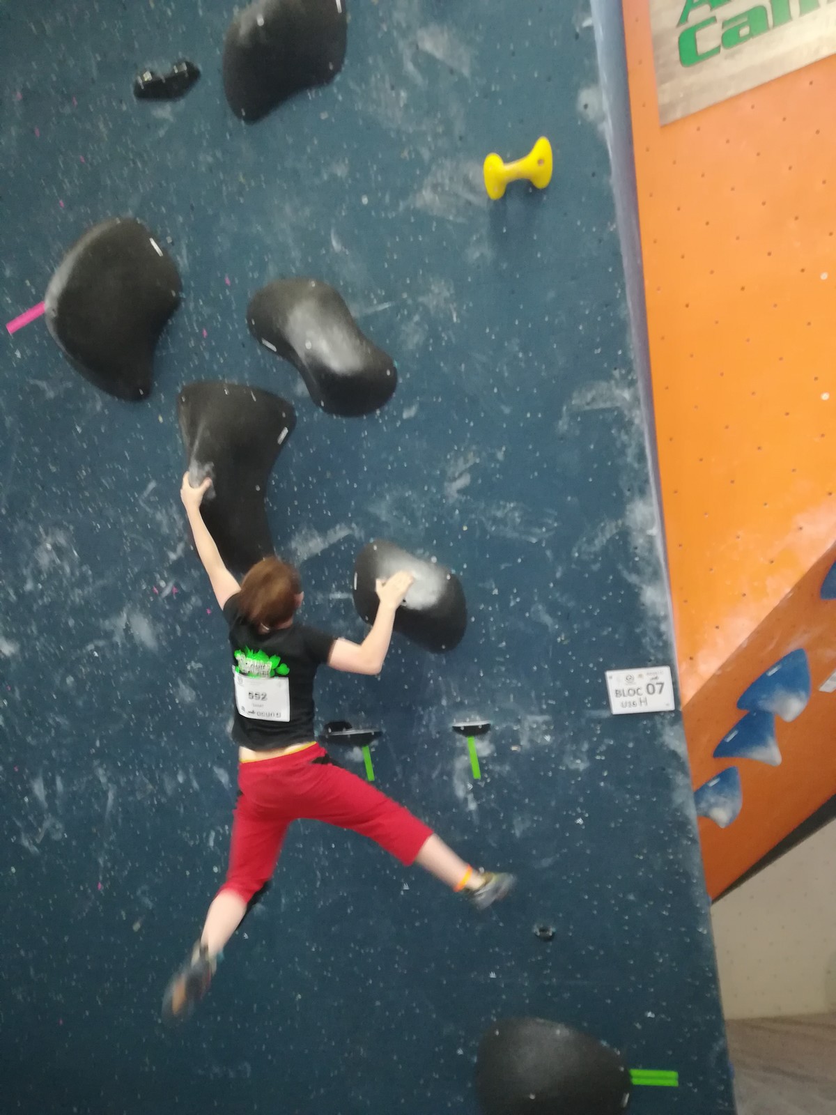 C’est Juliette qui démarre samedi matin (on a de la chance, elle n’est pas dans la 1ère vague aux aurores) et qui découvre les blocs avec un peu d’appréhension. Le niveau semble très relevé, et chez les filles les blocs les plus abordables sont tous typés équilibre sur modules. Pas vraiment son profil de prédilection, et il va falloir aller puiser dans d’autres ressources que celles des séances de développé / couché à Val de Grimpe 😉. Elle part tout de même motivée, mais des premiers essais infructueux entament peu à peu sa confiance. Elle parviendra à toper le bloc 3… où il faut jouer sur les équilibres sur gros modules et débrancher le cerveau pour atteindre le top car ça donne vraiment pas envie de zipper ! Avec 2 zones de plus, elle termine 46ème dans cette catégorie U18 où il y avait plus de 70 concurrentes. Elle manque de réussite sur cette compétition, mais a les moyens de faire beaucoup mieux, on l’attend sur les prochains rendez-vous.