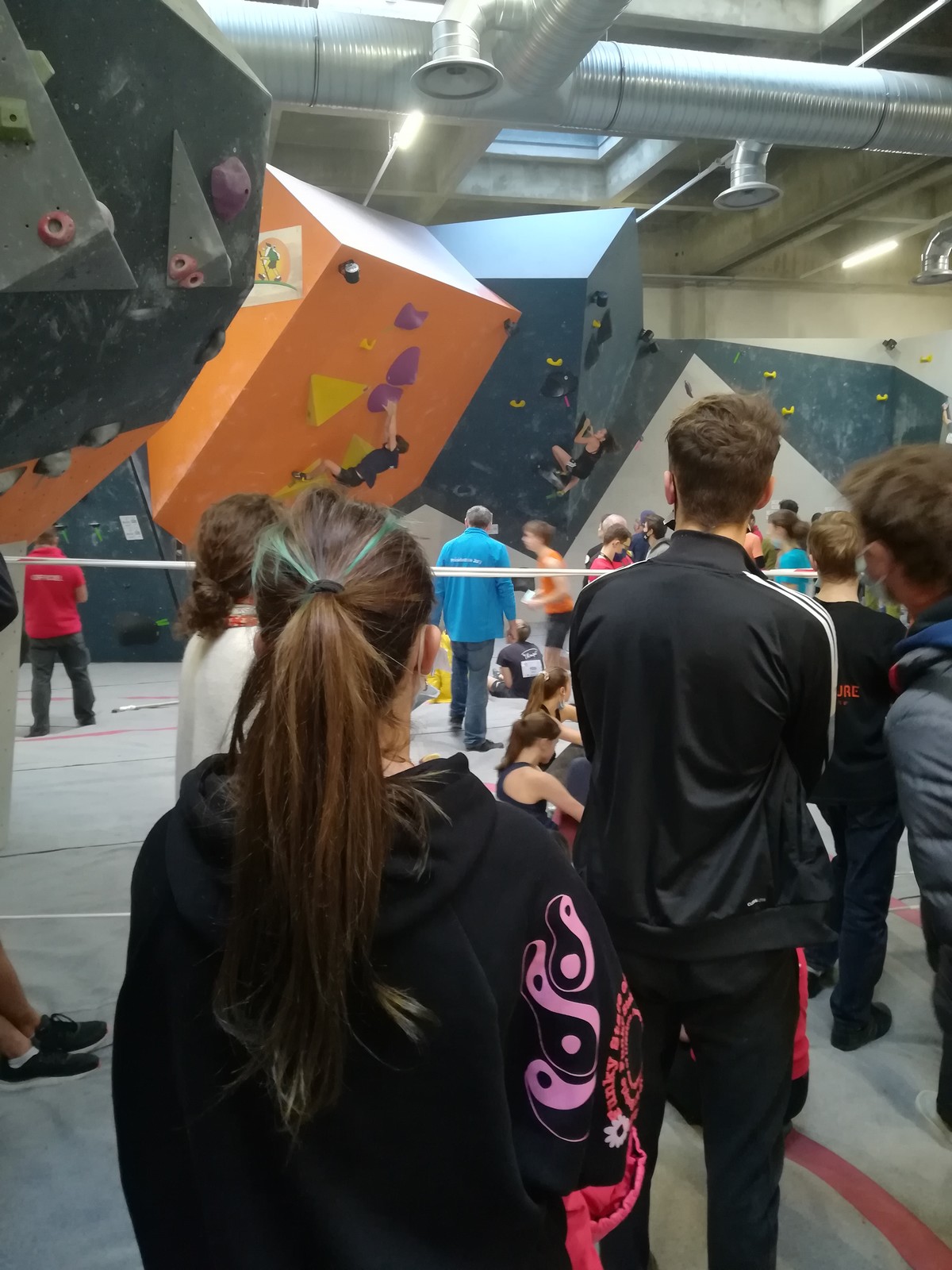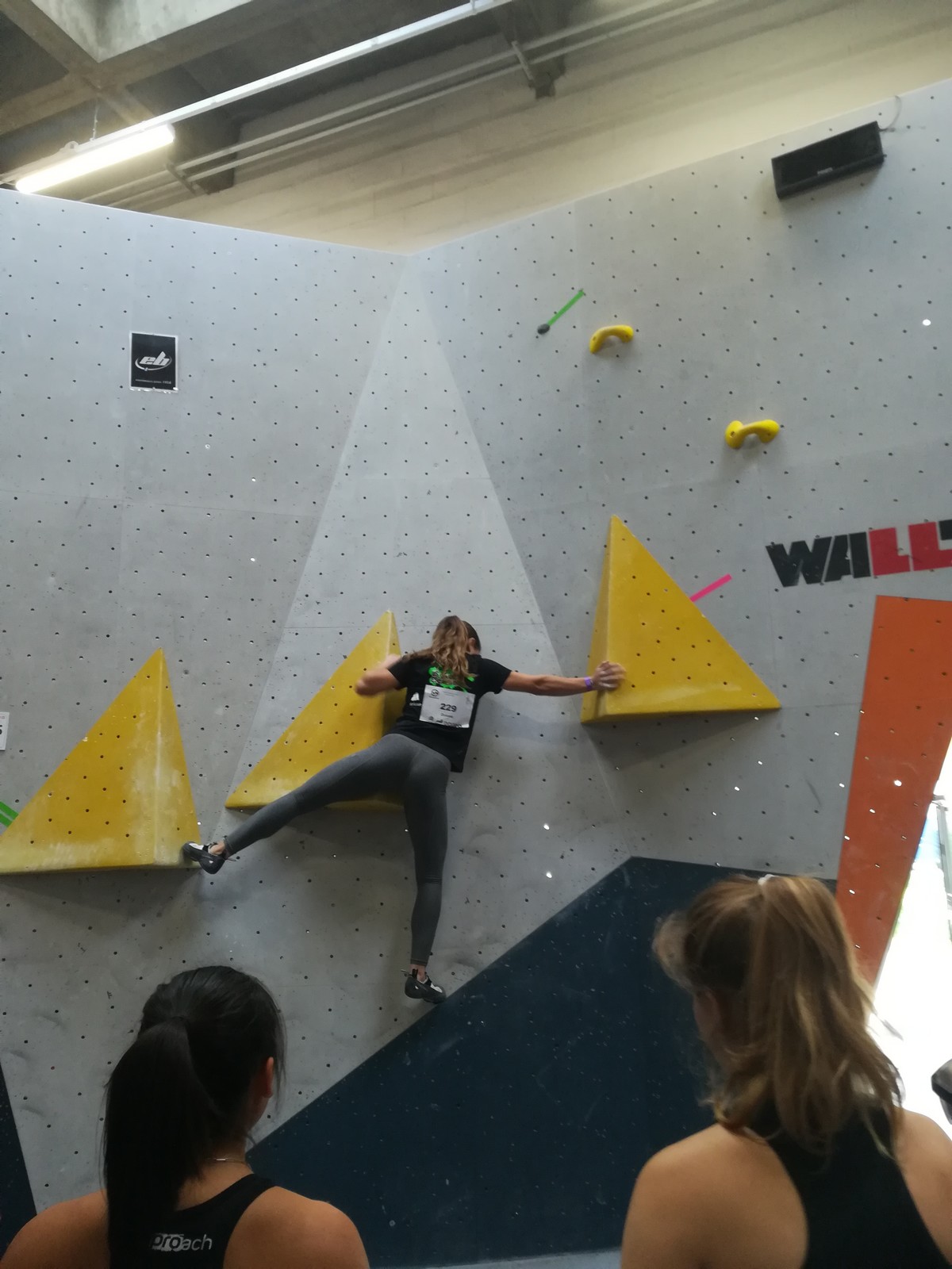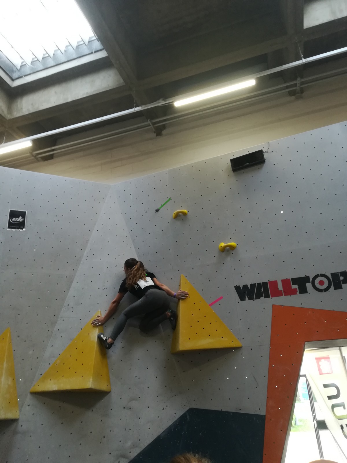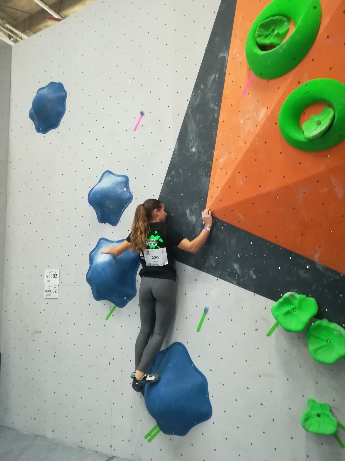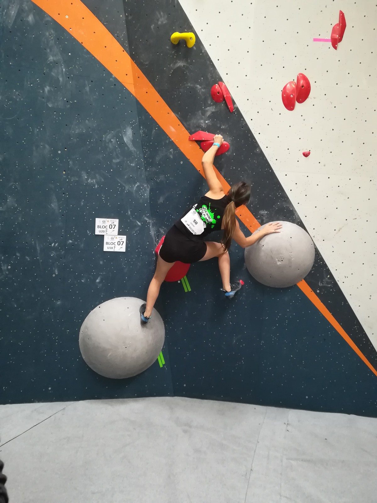 C’est Juliette qui démarre samedi matin (on a de la chance, elle n’est pas dans la 1ère vague aux aurores) et qui découvre les blocs avec un peu d’appréhension. Le niveau semble très relevé, et chez les filles les blocs les plus abordables sont tous typés équilibre sur modules. Pas vraiment son profil de prédilection, et il va falloir aller puiser dans d’autres ressources que celles des séances de développé / couché à Val de Grimpe 😉. Elle part tout de même motivée, mais des premiers essais infructueux entament peu à peu sa confiance. Elle parviendra à toper le bloc 3… où il faut jouer sur les équilibres sur gros modules et débrancher le cerveau pour atteindre le top car ça donne vraiment pas envie de zipper ! Avec 2 zones de plus, elle termine 46ème dans cette catégorie U18 où il y avait plus de 70 concurrentes. Elle manque de réussite sur cette compétition, mais a les moyens de faire beaucoup mieux, on l’attend sur les prochains rendez-vous.