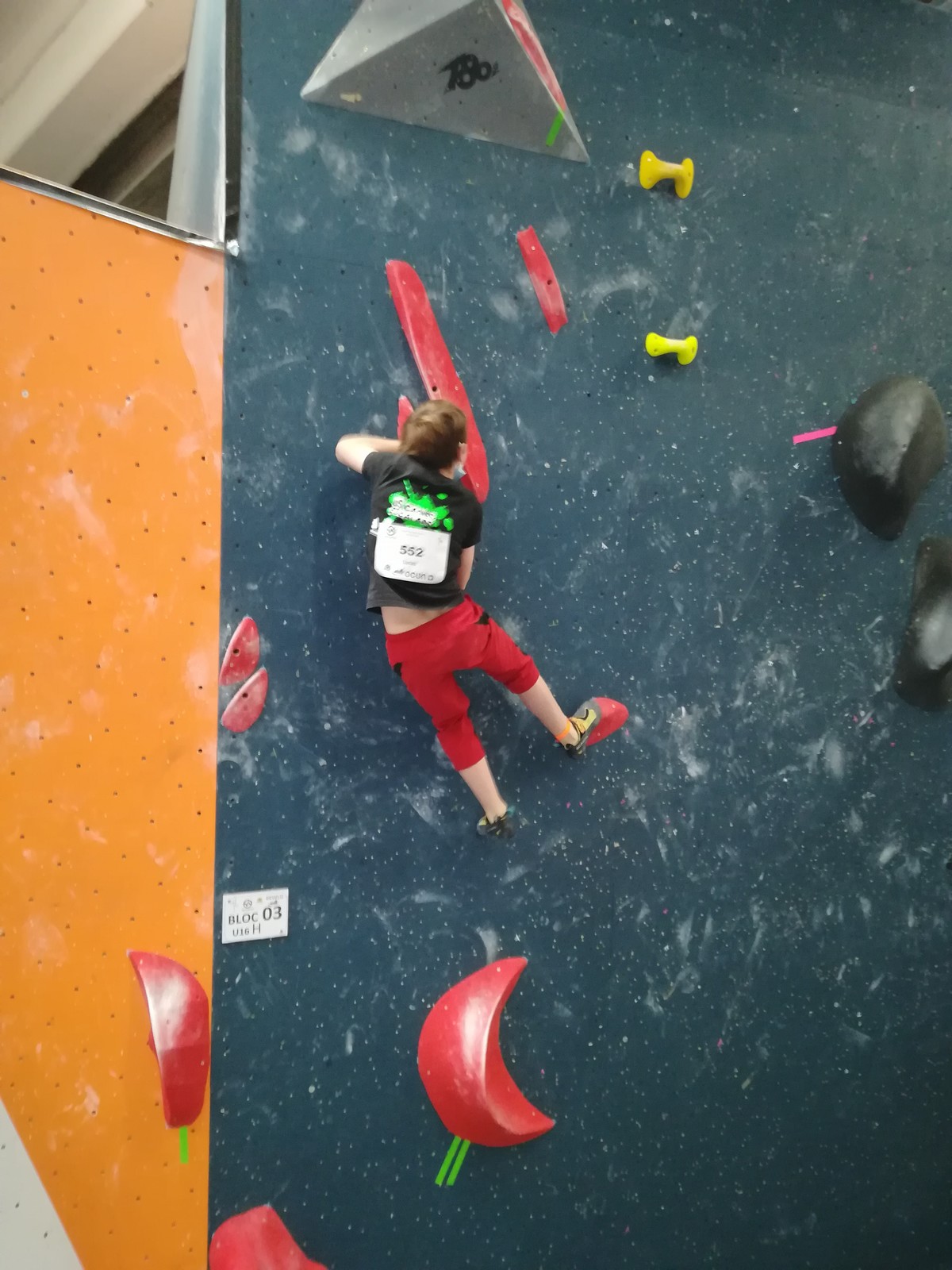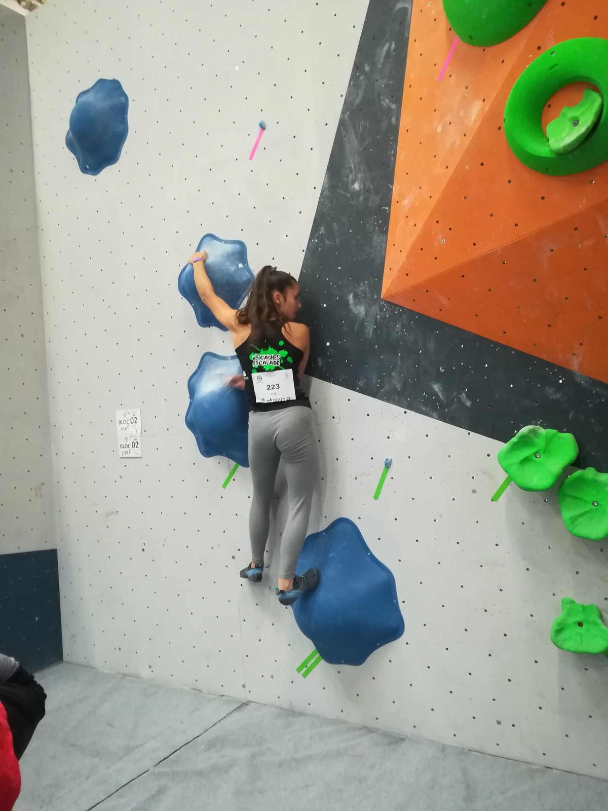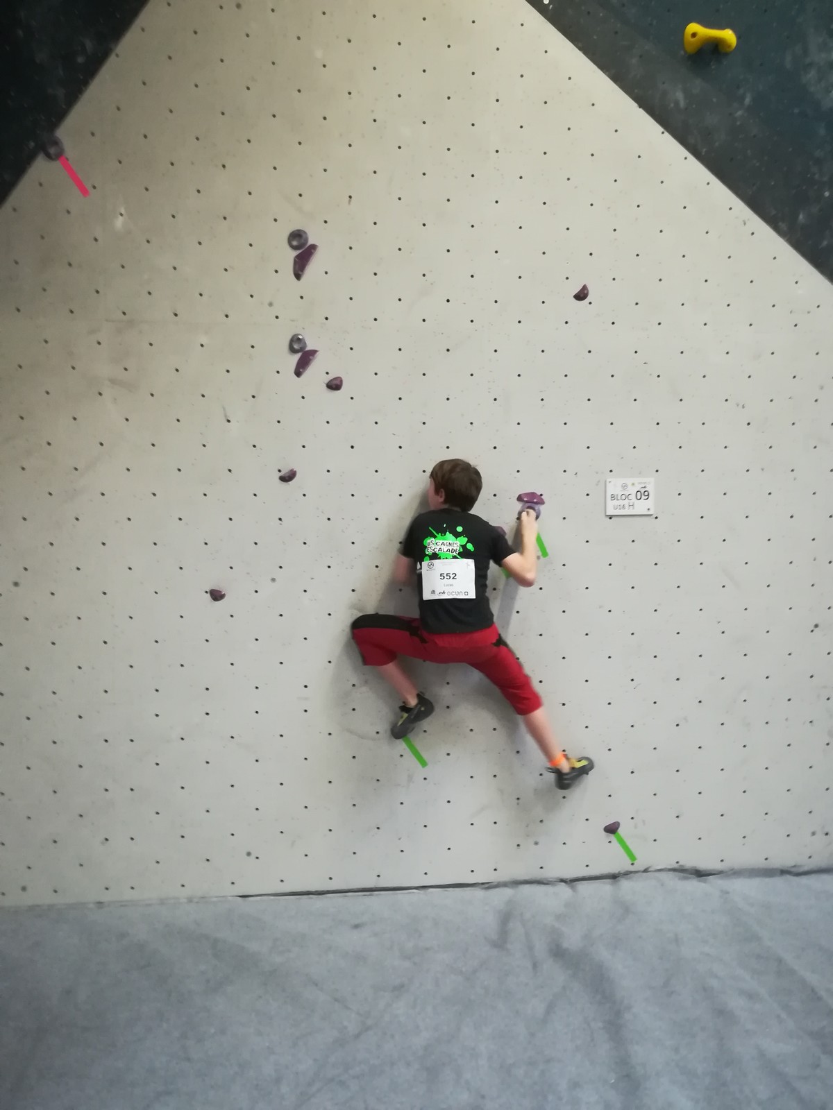 Lucas fait partie de la 2ème vague, et a eu le temps d’apprendre tous les blocs par cœur ! C’est sa 1ère coupe de France jeunes officielle, il sait que ça s’annonce dur mais il part motivé à bloc après un échauffement appliqué. Il est solide et flashe les 3 premiers blocs. Ce sera plus compliqué pour le reste du circuit, le niveau des blocs est élevé et sa taille n’est pas un avantage. Il garde le sourire et la motivation et aura le temps de faire des essais dans tous les blocs. Il termine 37ème, super expérience pour lui !