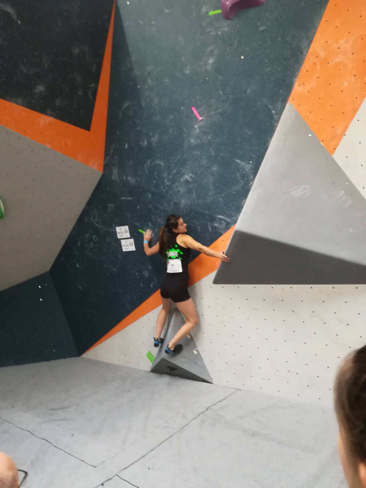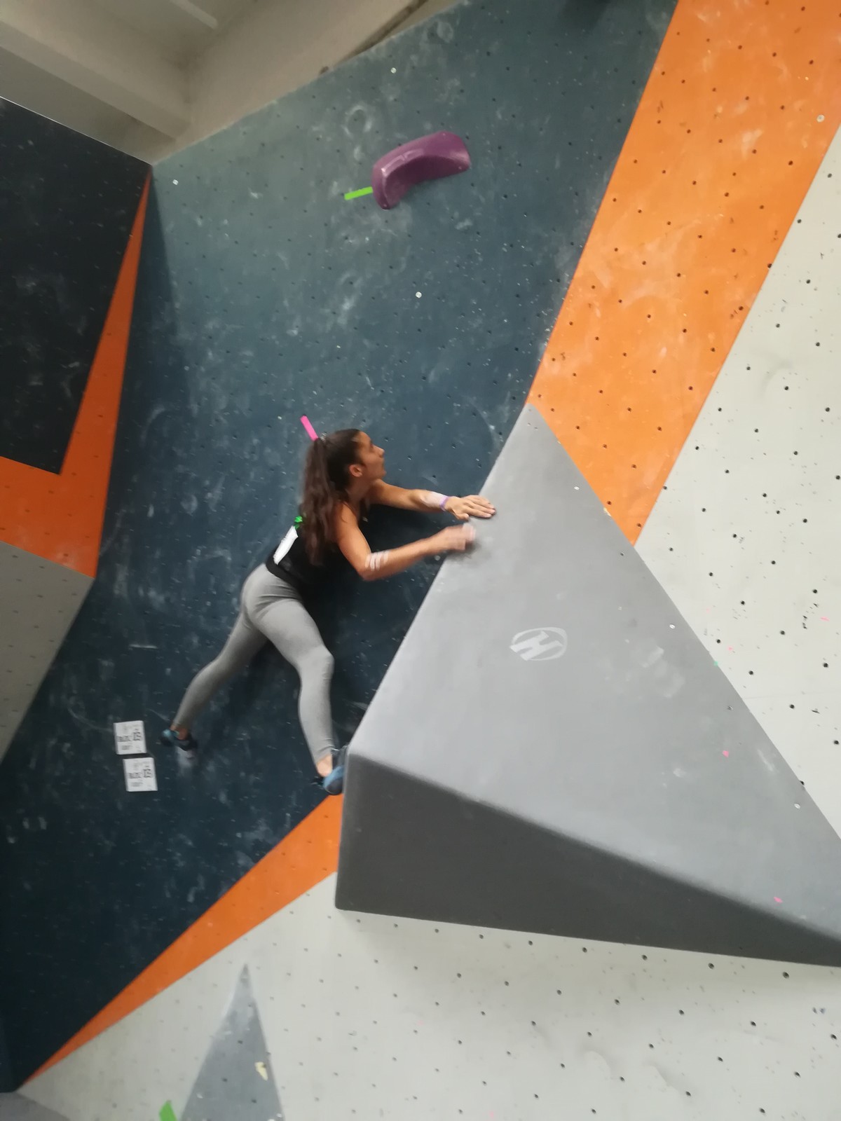 Lisa démarre très tendue (comme à son habitude aussi 😉) mais il faut dire que ce n’est pas évident de se relâcher sur ces blocs tout en équilibre… Après un petit passage à vide côté mental en milieu de compétition, elle retrouve le moral en topant le bloc 6 au dernier essai avec une méthode inédite. En revanche le fameux bloc 3 qui a bien réussi aux copines lui résiste. Elle finit à une belle 13ème place, avec 4 blocs et 5 zones au compteur.