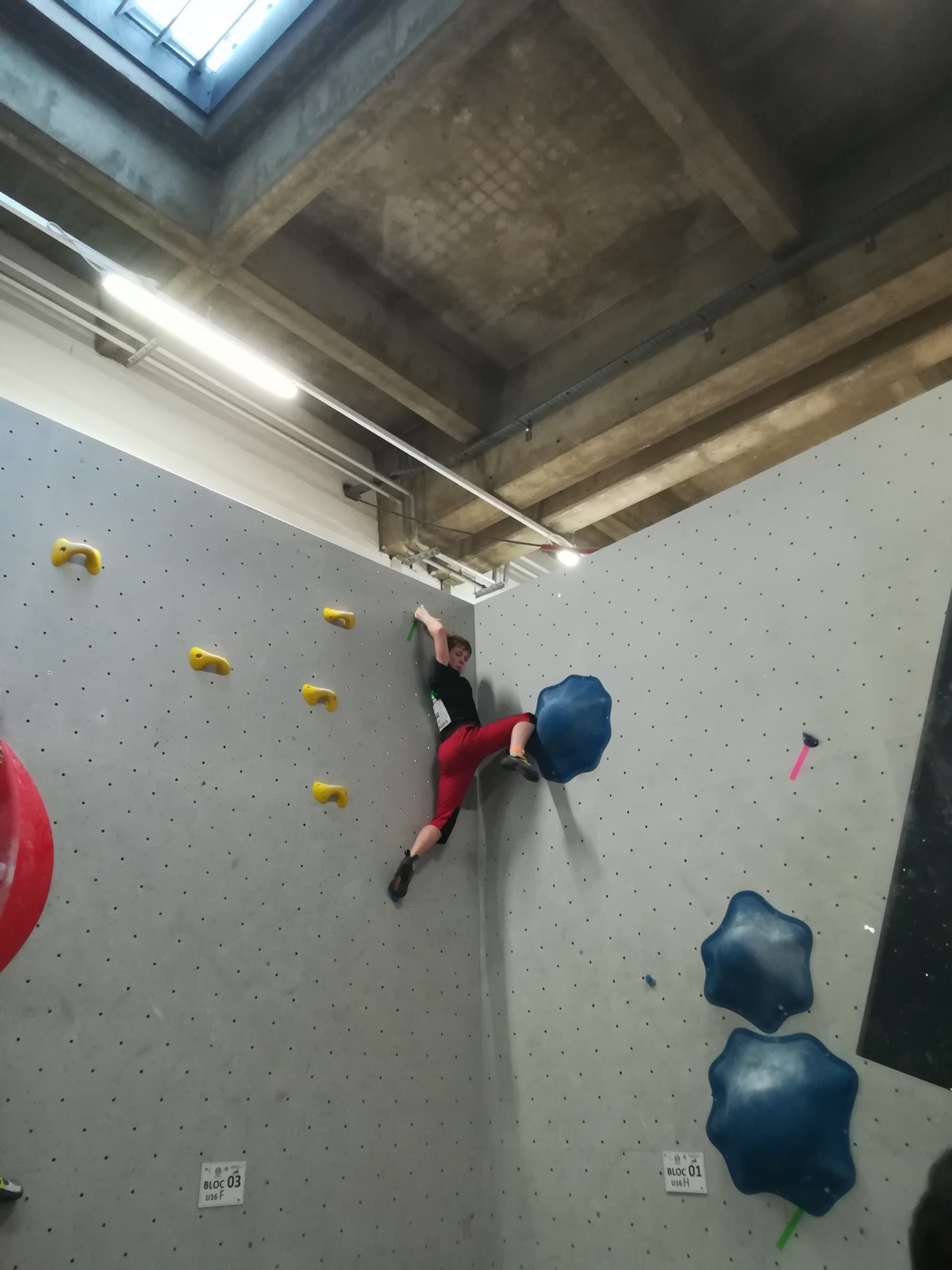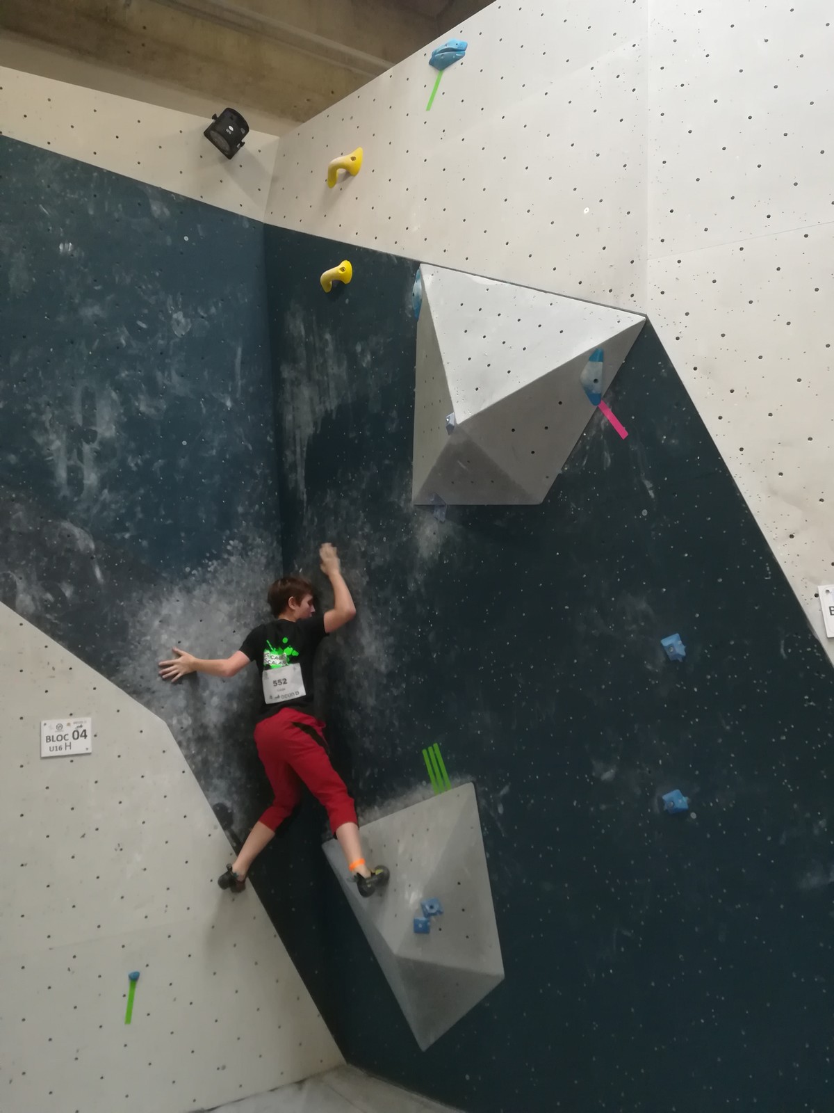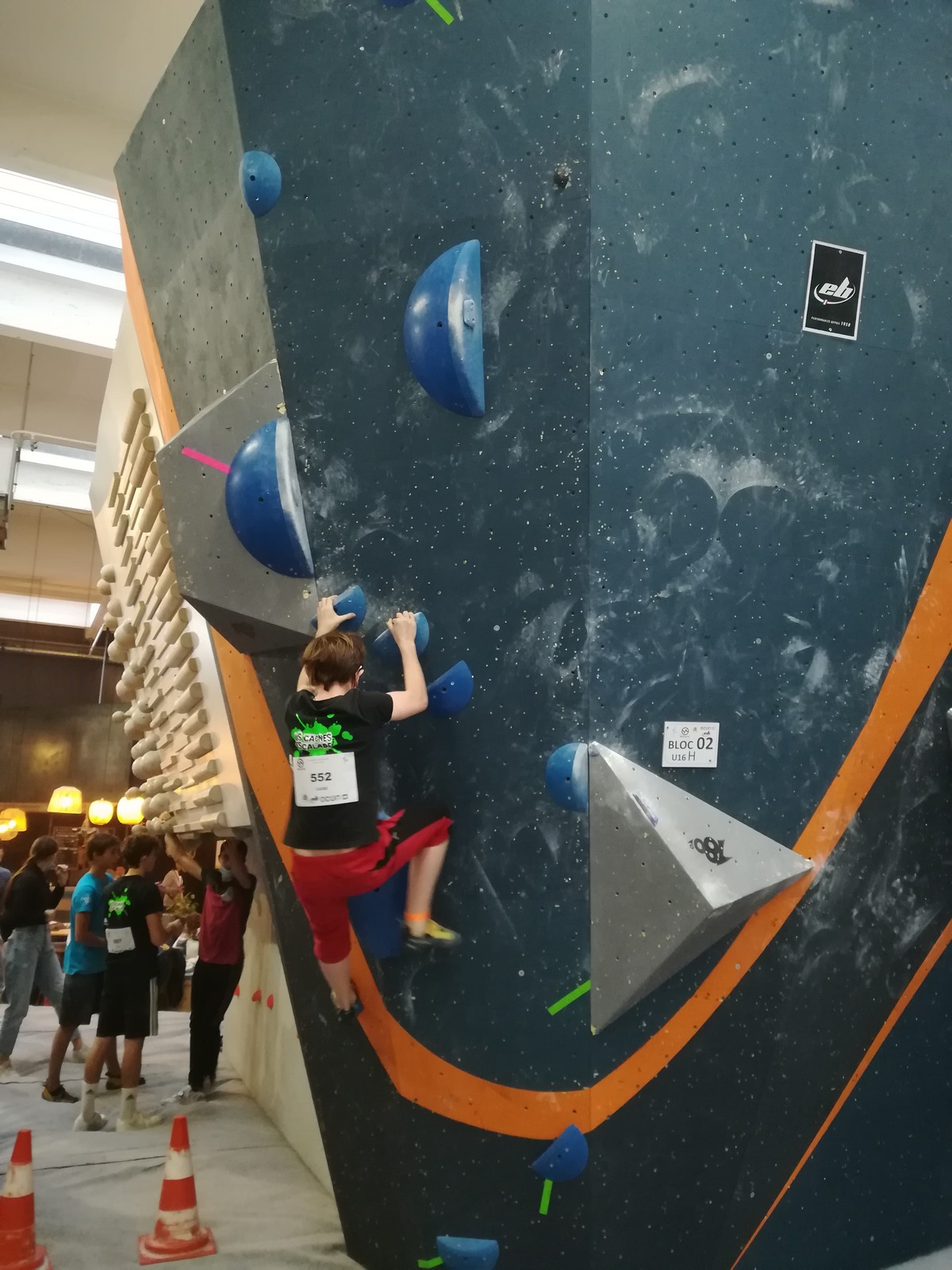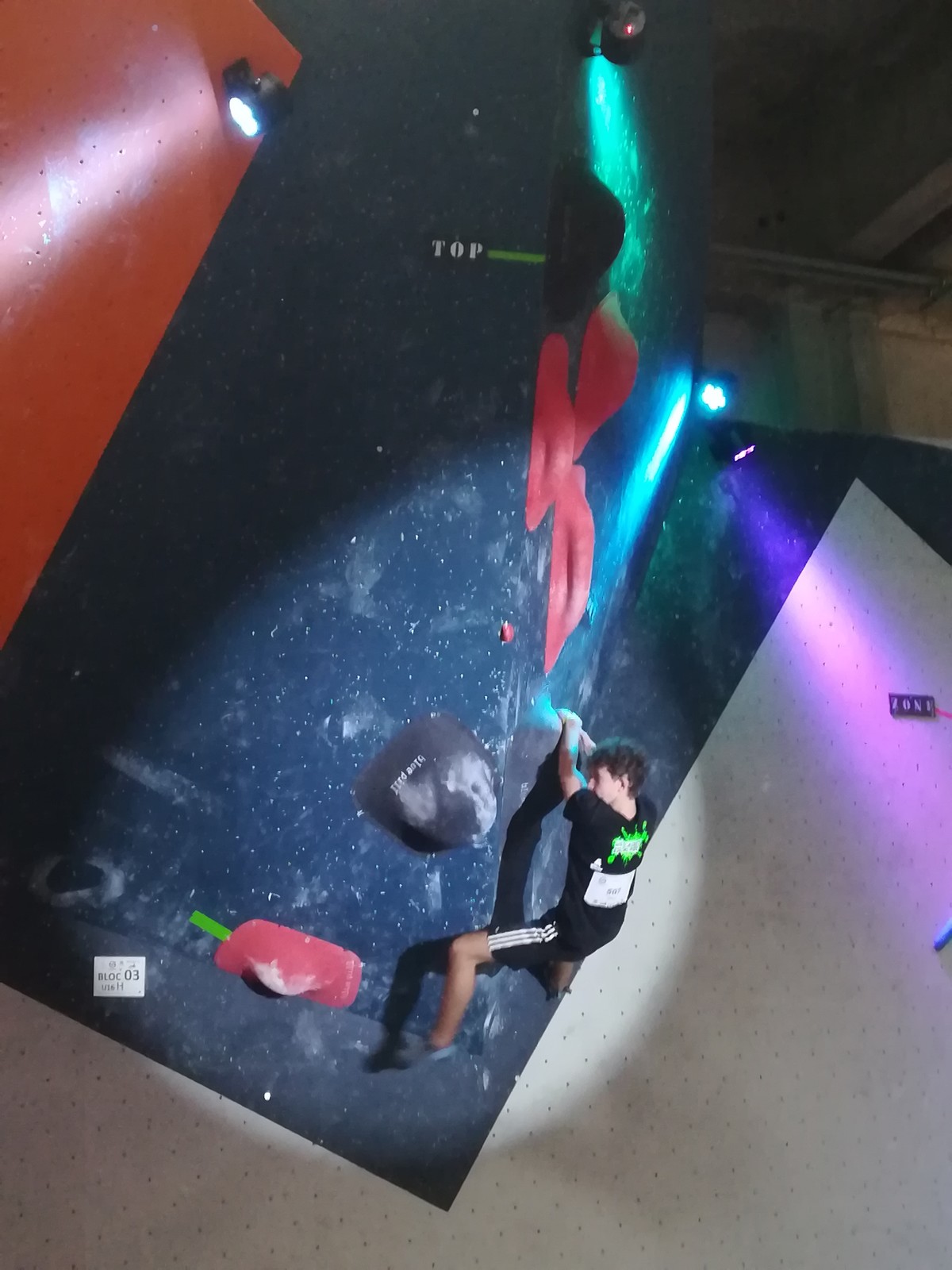 Place aux U16 (ex minimes) donc le dimanche matin, et Ethan joue dans la 1ère vague du matin. Il démarre fort en flashant tous ses premiers blocs. Il viendra à bout du bloc 8 bien physique mais tout à fait dans son style en quelques essais et parvient à toper le bloc 5 en skate au dernier essai, sous les encouragements de son frère Théo ! Seul le bloc 9 en dalle lui résiste, mais ce sera suffisant pour accéder aux finales puisqu’il termine 4ème au général des qualifications.