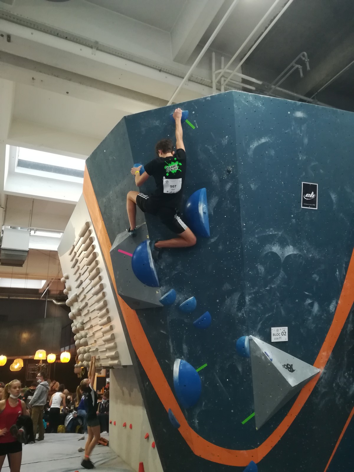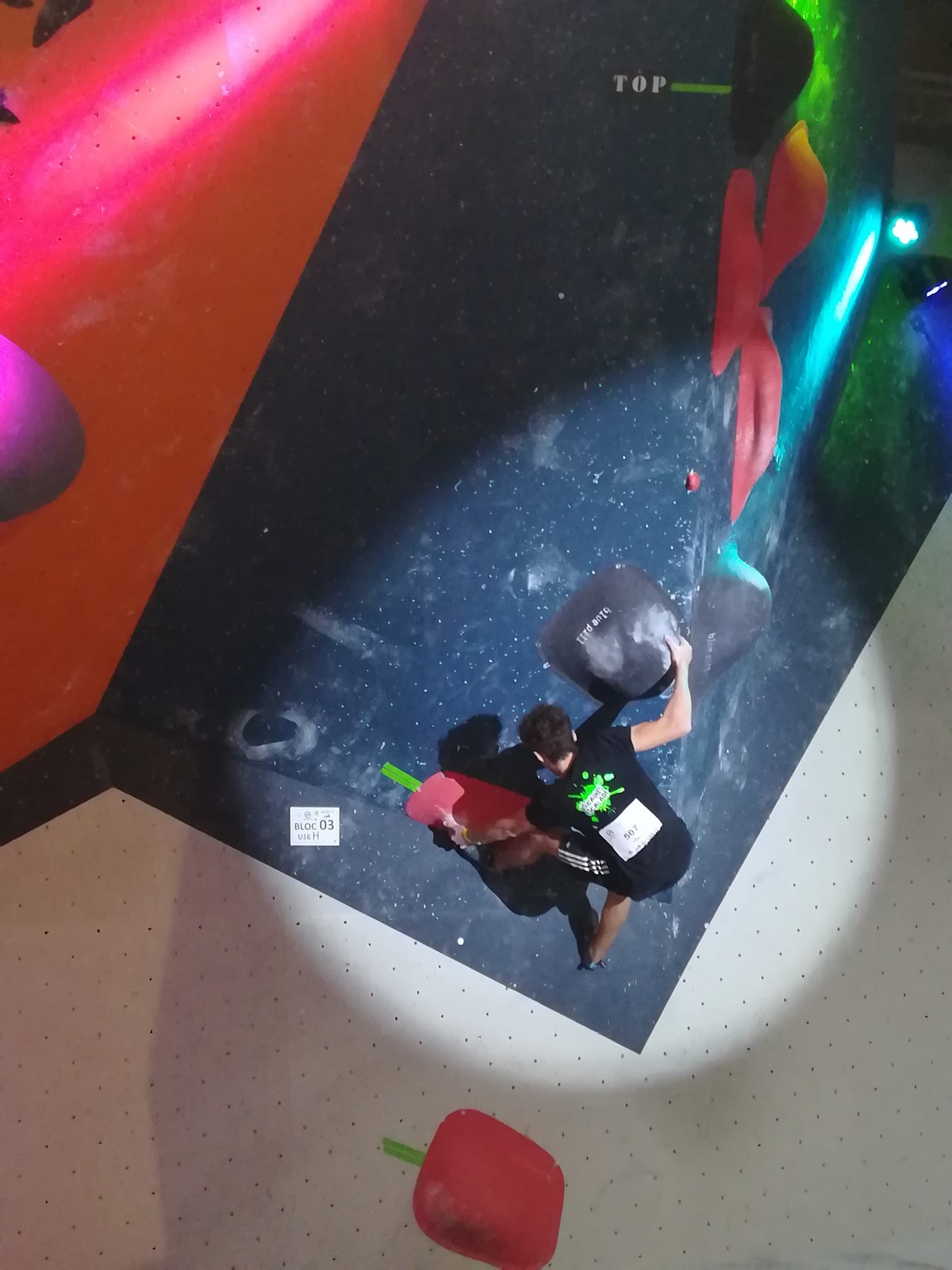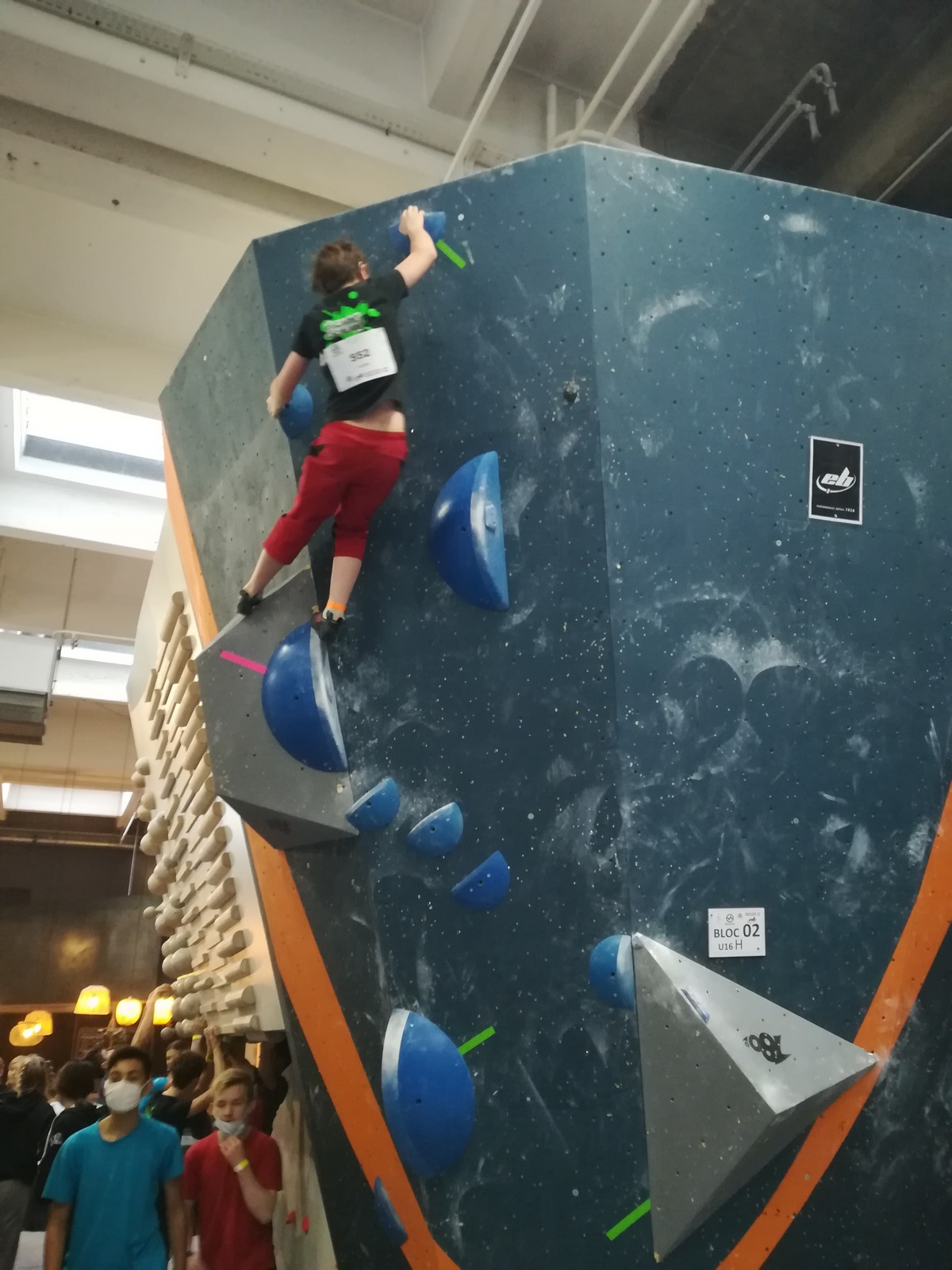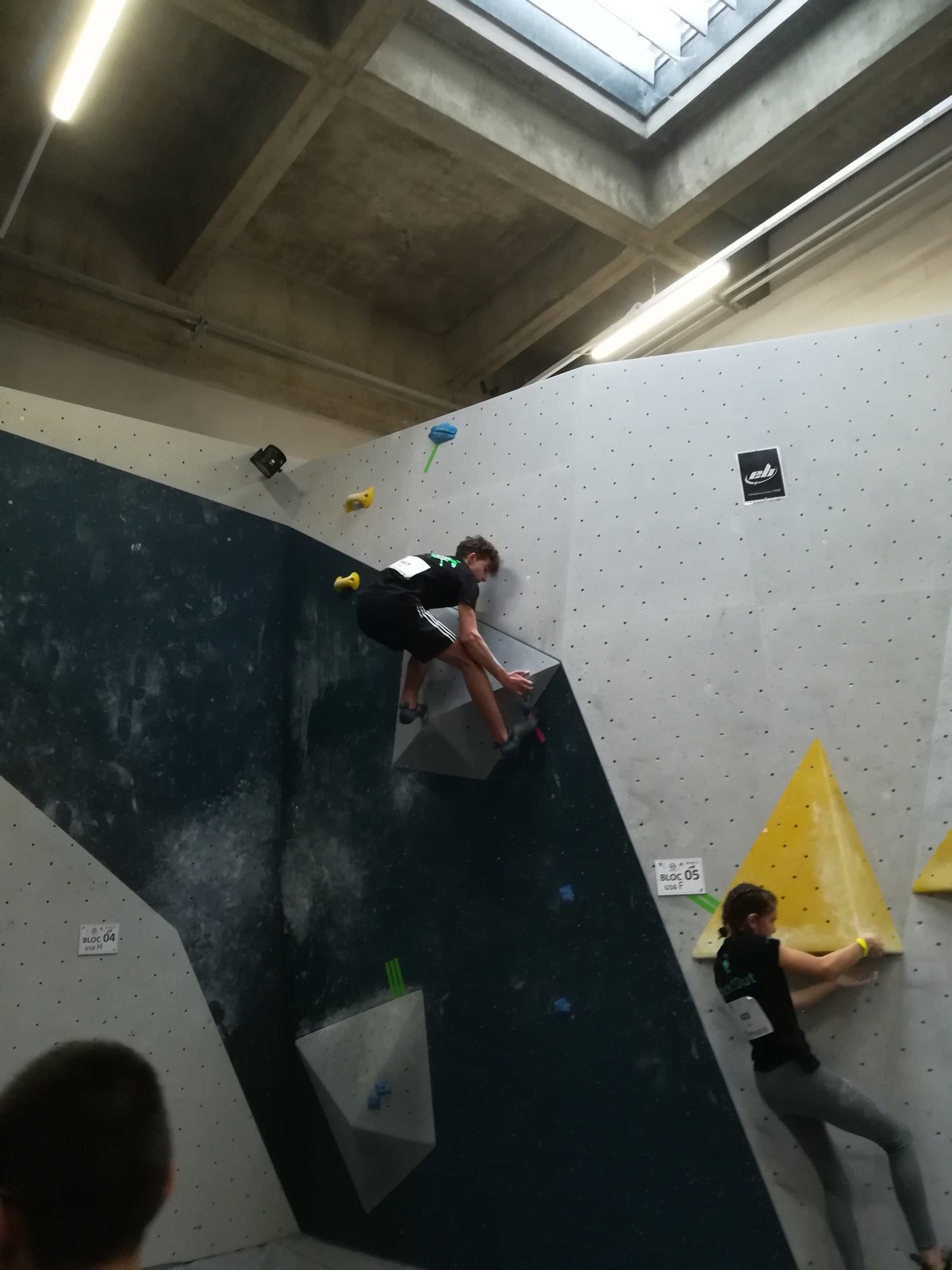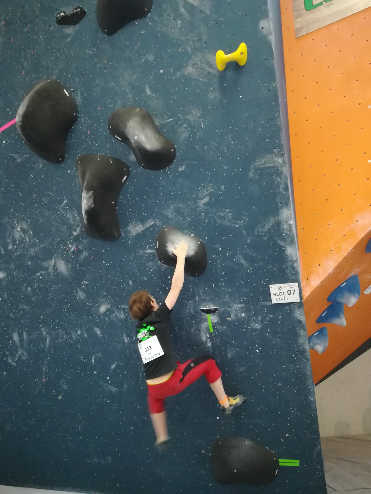 Place aux U16 (ex minimes) donc le dimanche matin, et Ethan joue dans la 1ère vague du matin. Il démarre fort en flashant tous ses premiers blocs. Il viendra à bout du bloc 8 bien physique mais tout à fait dans son style en quelques essais et parvient à toper le bloc 5 en skate au dernier essai, sous les encouragements de son frère Théo ! Seul le bloc 9 en dalle lui résiste, mais ce sera suffisant pour accéder aux finales puisqu’il termine 4ème au général des qualifications.