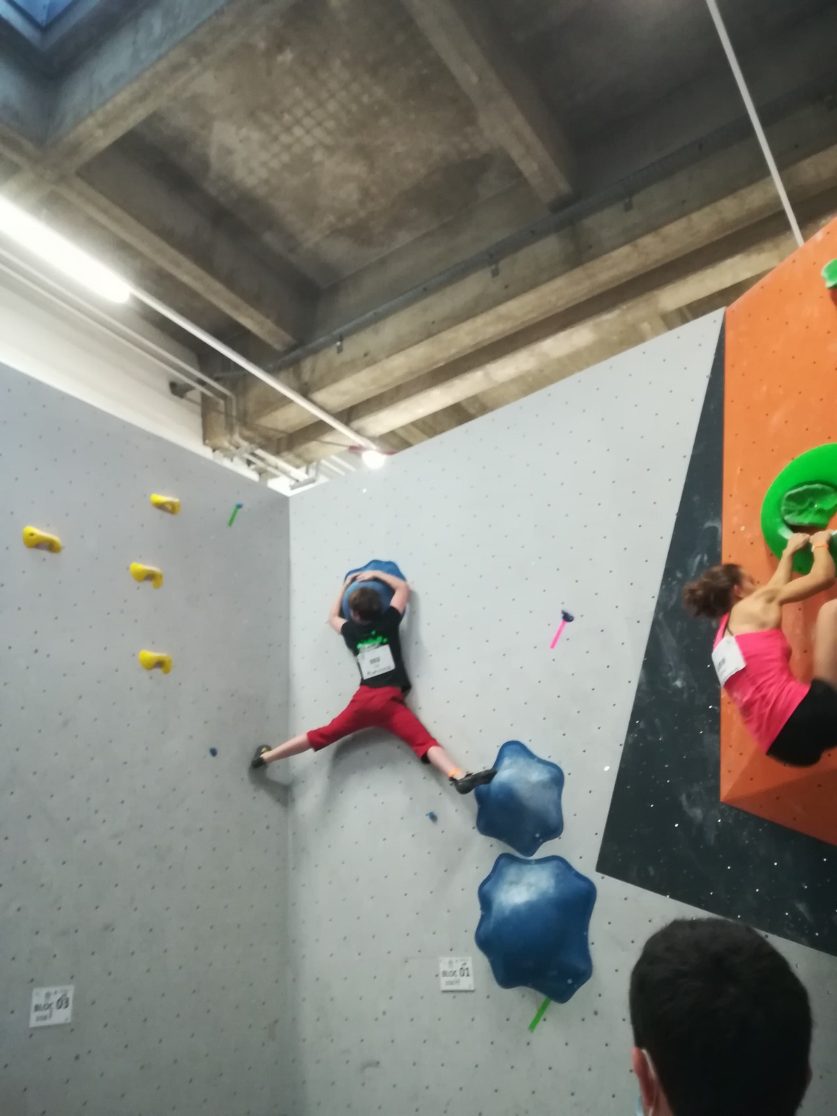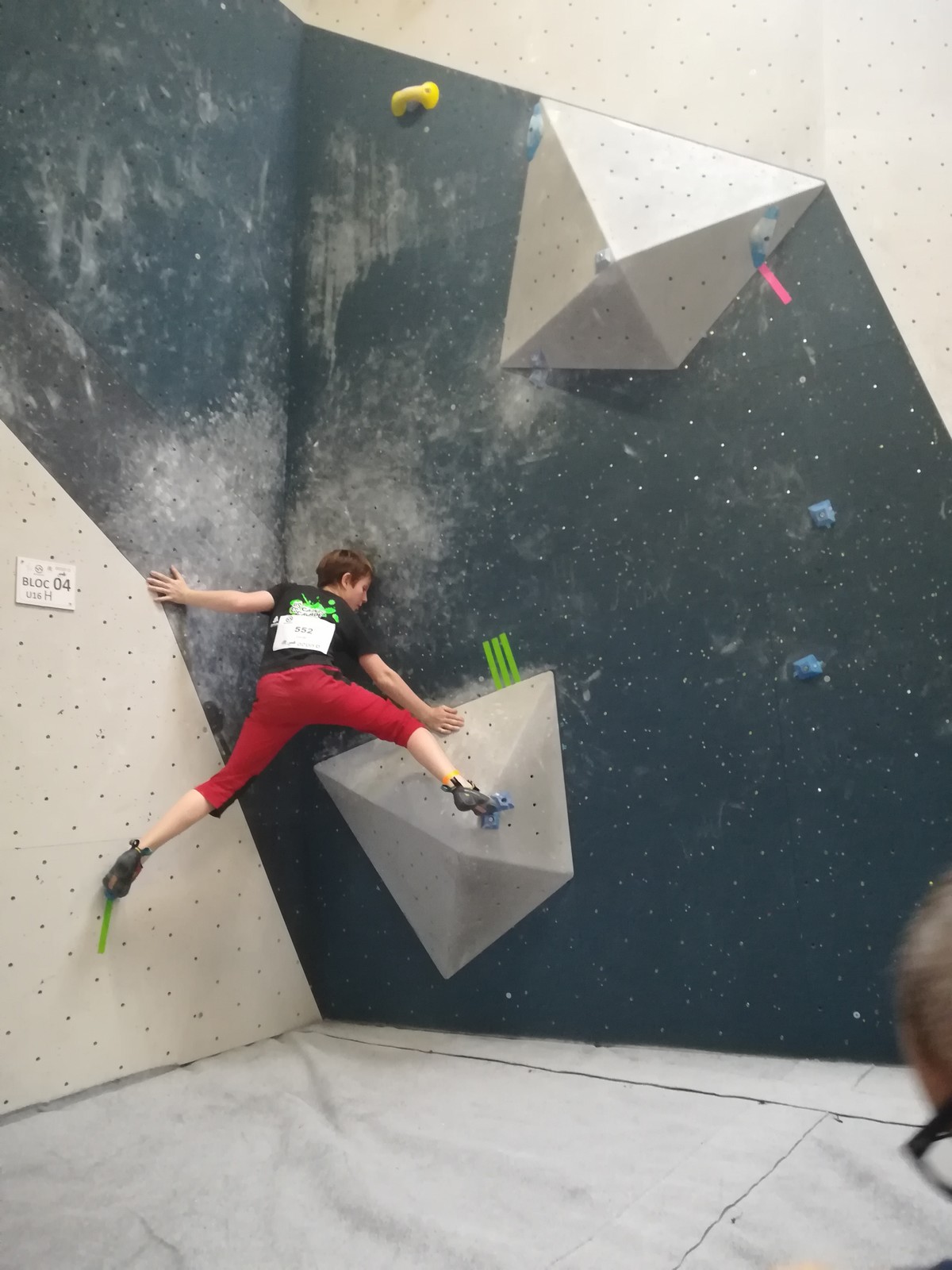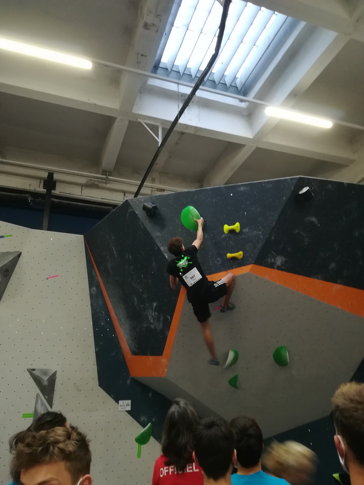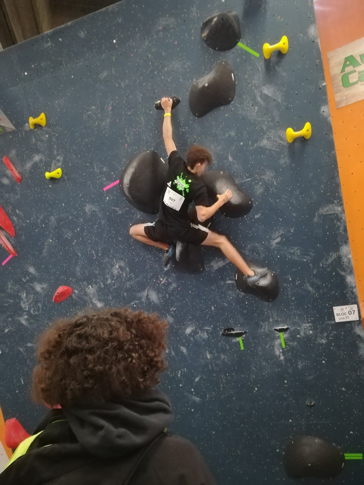 Place aux U16 (ex minimes) donc le dimanche matin, et Ethan joue dans la 1ère vague du matin. Il démarre fort en flashant tous ses premiers blocs. Il viendra à bout du bloc 8 bien physique mais tout à fait dans son style en quelques essais et parvient à toper le bloc 5 en skate au dernier essai, sous les encouragements de son frère Théo ! Seul le bloc 9 en dalle lui résiste, mais ce sera suffisant pour accéder aux finales puisqu’il termine 4ème au général des qualifications.