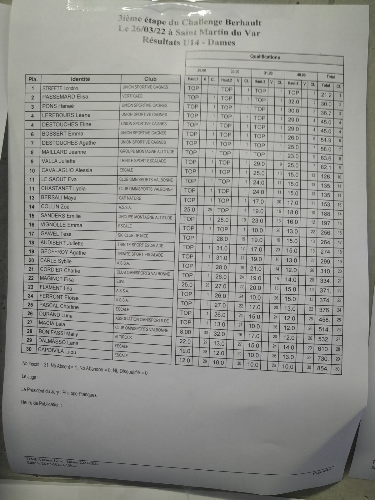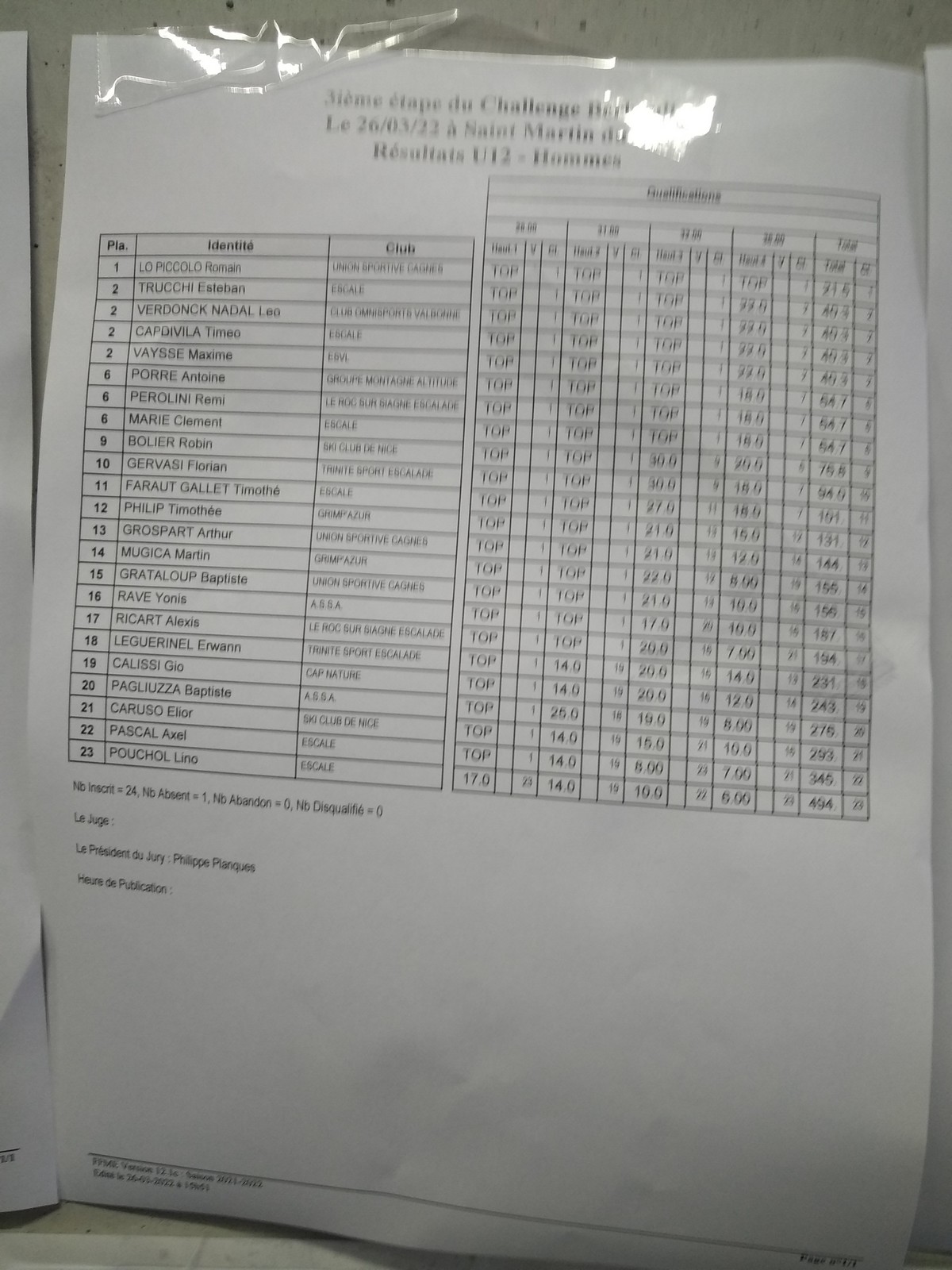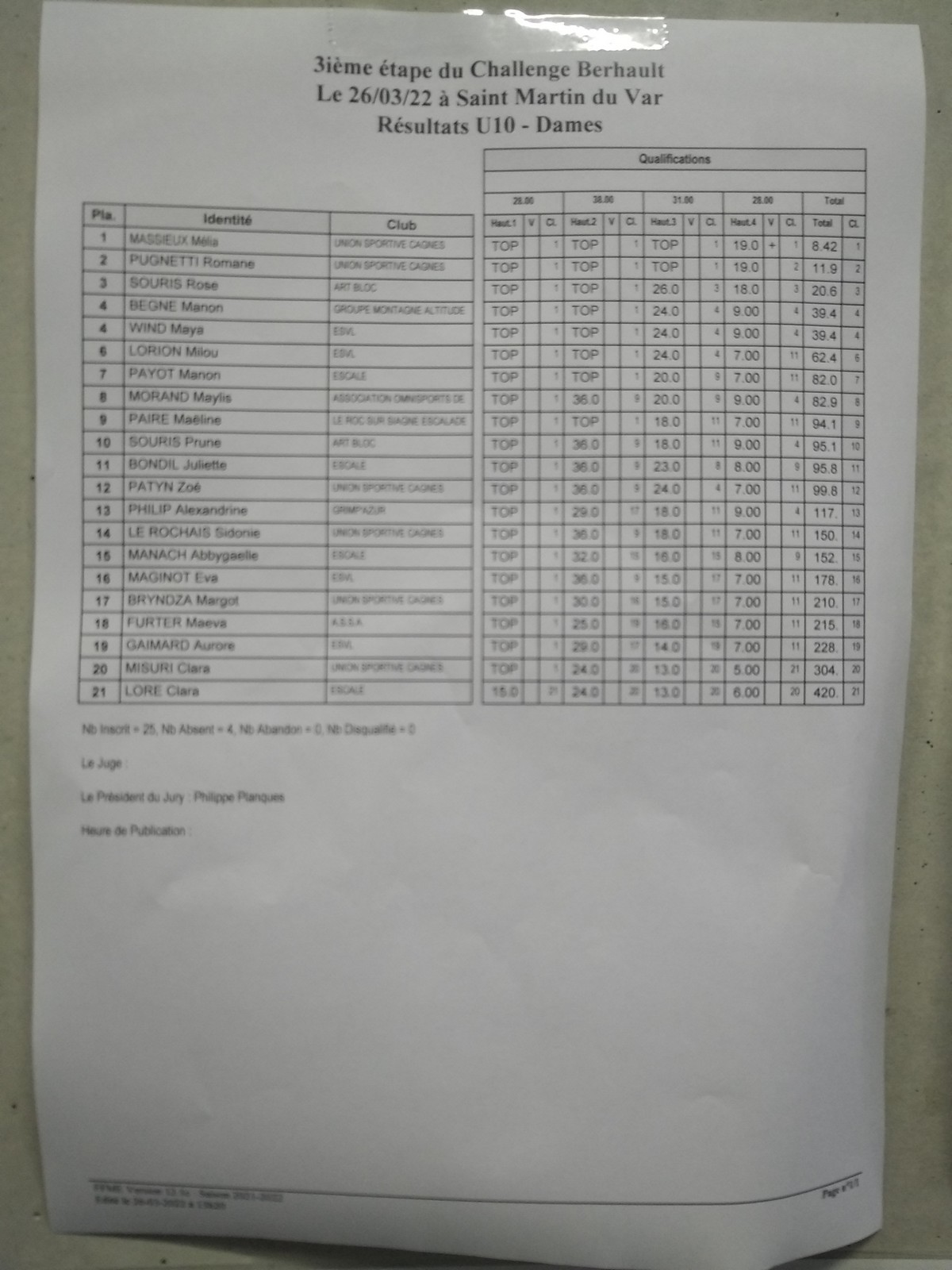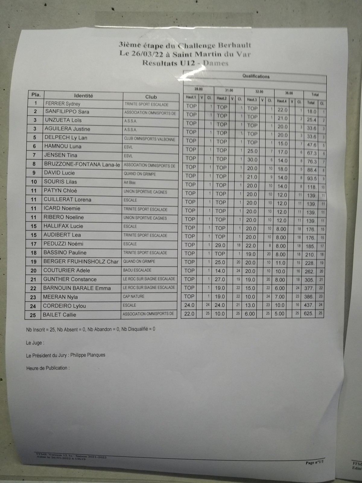 Chez les U12 filles, Eline étant surclassée en U14, nos meilleures et seules grimpeuses sont Chloé et Noéline à la 11ème place.