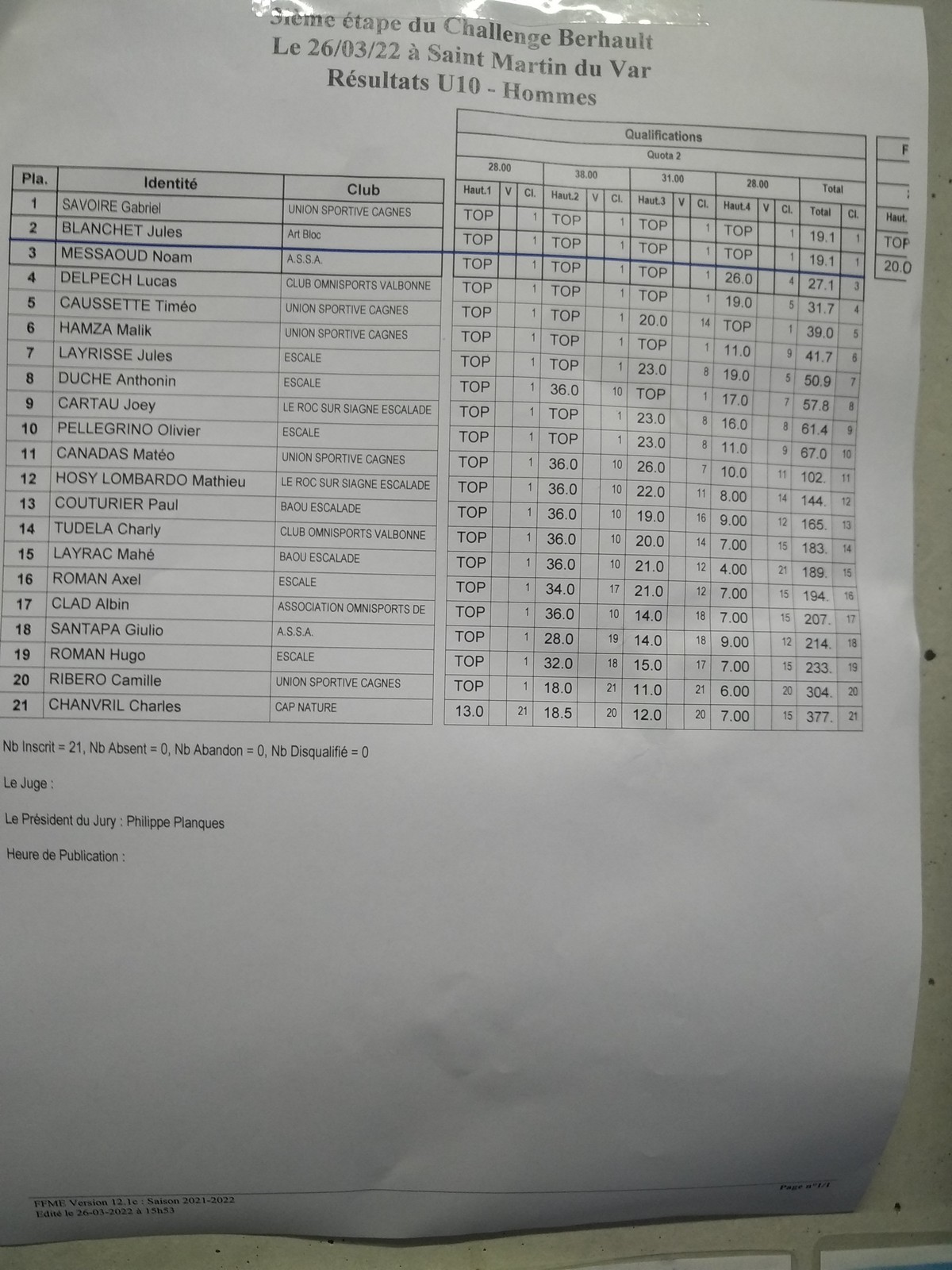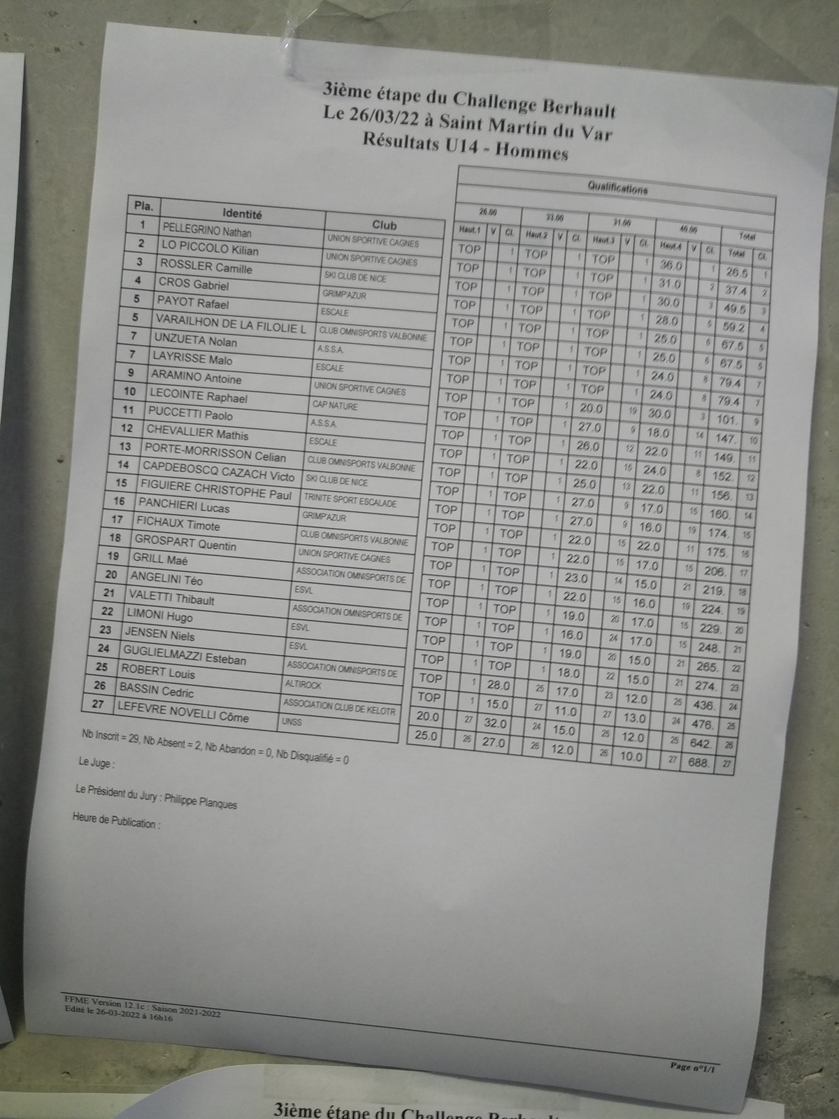 Chez les garçons, On s’attendait à ce que Romain rafle la mise et on n’a pas été déçu. C’est le seul à sortir les 4 voies avec une facilité déconcertante. Derrière, ils sont 4 à tomber au même mouvement mais aucun de chez nous. Il faut descendre à la 11ème place avec Arthur et 15ème pour Baptiste, victime d’une erreur de timing.